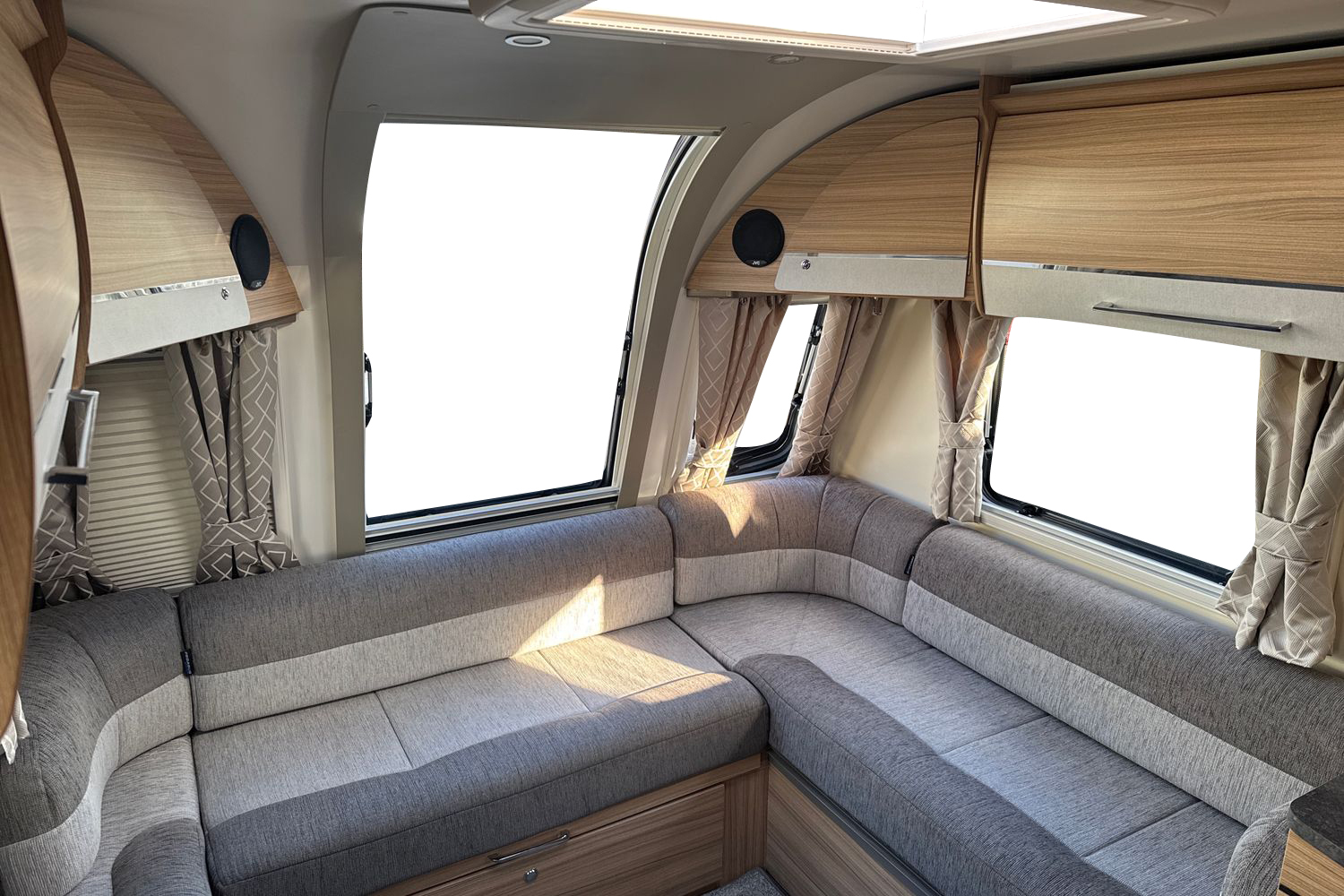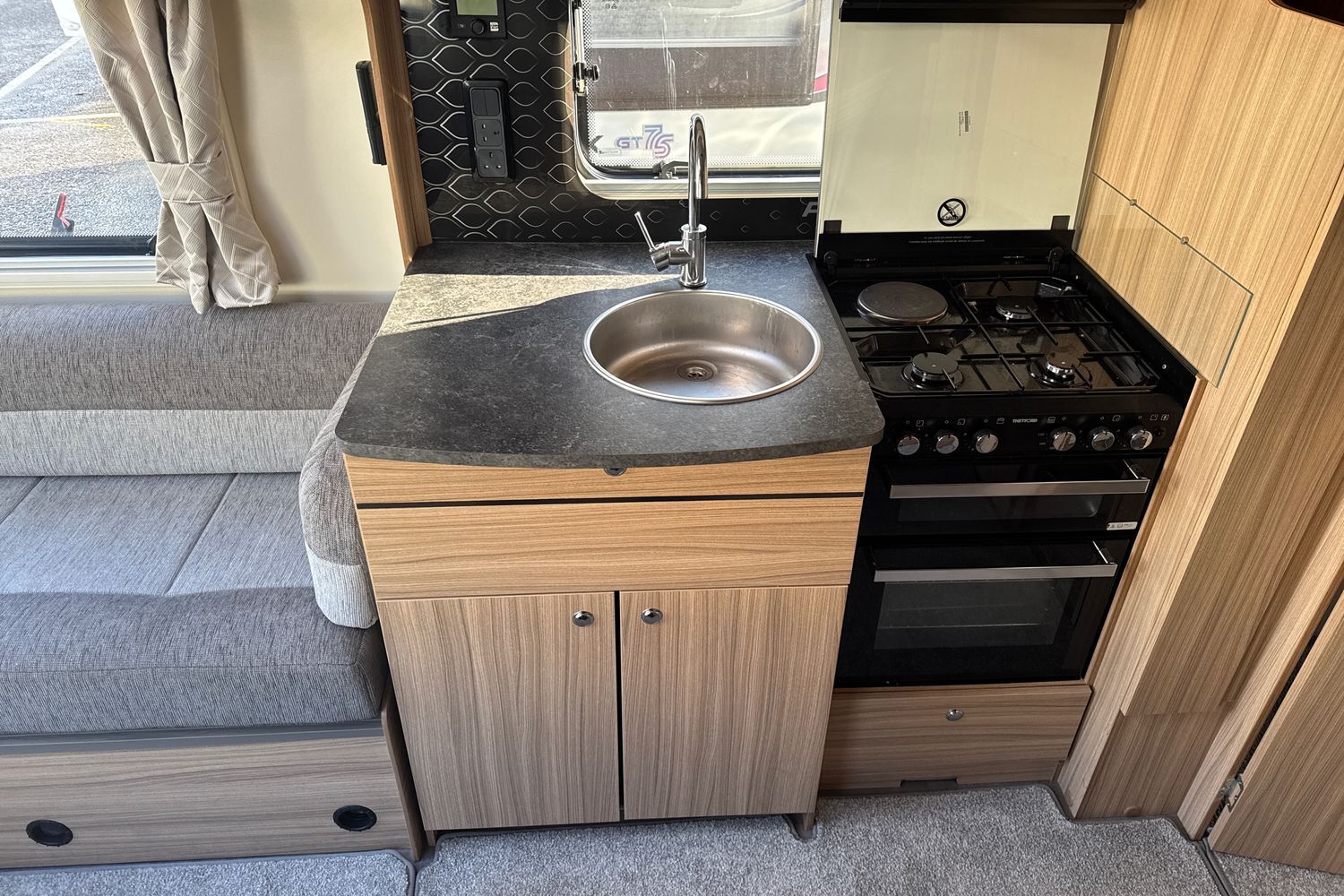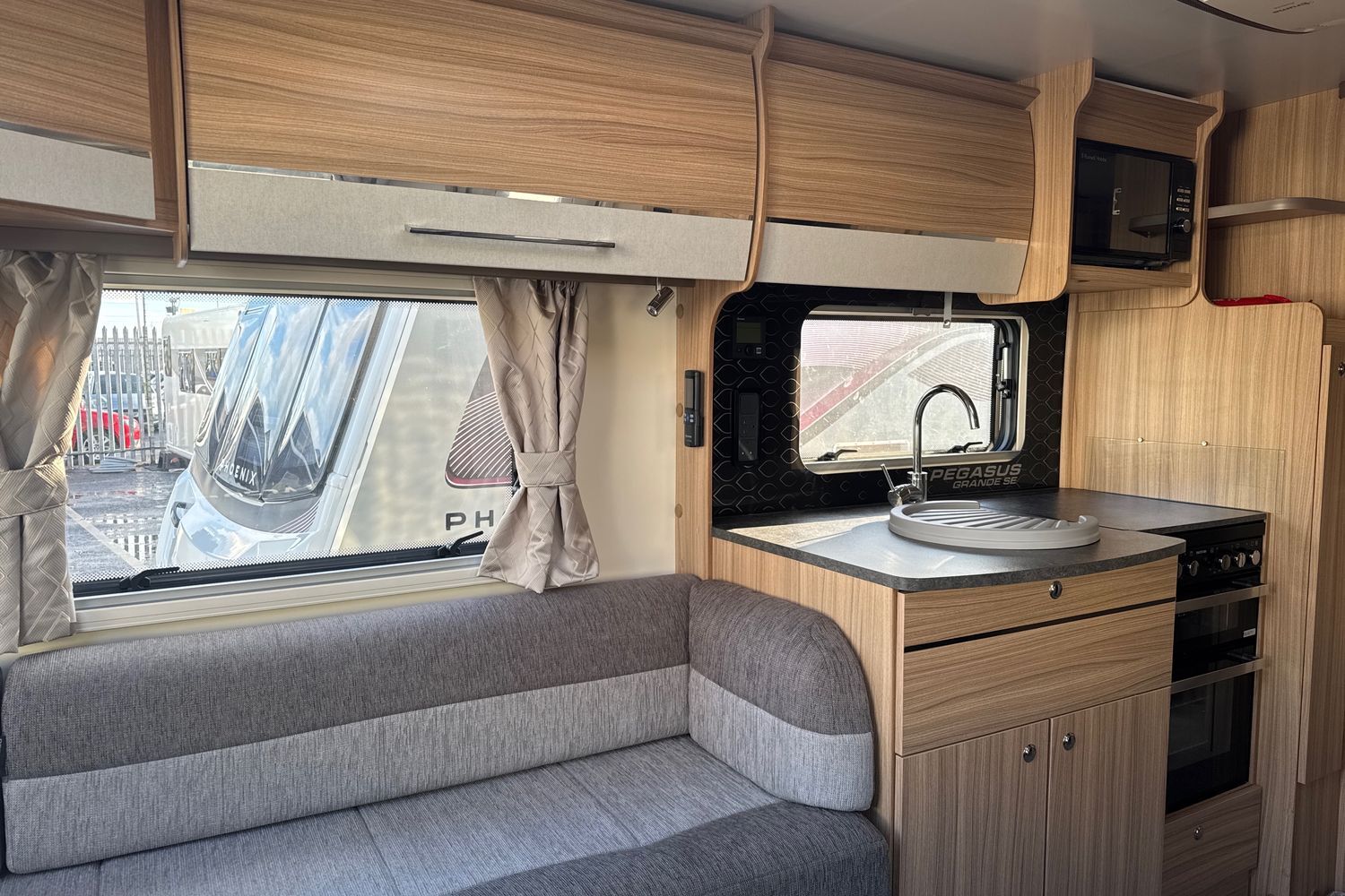 Inside the Pegasus Grande Messina, at the front, the huge lounge is light and airy, thanks to the vertical opening skylight and Heki roof-light in the ceiling. Double glazed poly-plastic windows throughout the caravan also feature Remis cassette fly-screens and blinds. G shaped-bench seats are upholstered in new ‘Kempton’ fabric and come complete with co-ordinated lined curtains, two bolster cushions, two large square and two scatter cushions. the G-shaped lounge converts into a huge double bed or can be used as singles. Storage is provided under the seats and in the overhead lockers which are finished, like all the furniture in the Pegasus Grande Messina, in 'Eucalyptus' with lockers doors finished in 'Brushed Champagne’, with chrome handles. There is a sliding, side mounted coffee table and a separate dining table for mealtimes. The flooring is hardwearing 'stone' vinyl with 'Soft truffle' loose fit carpets over the top.