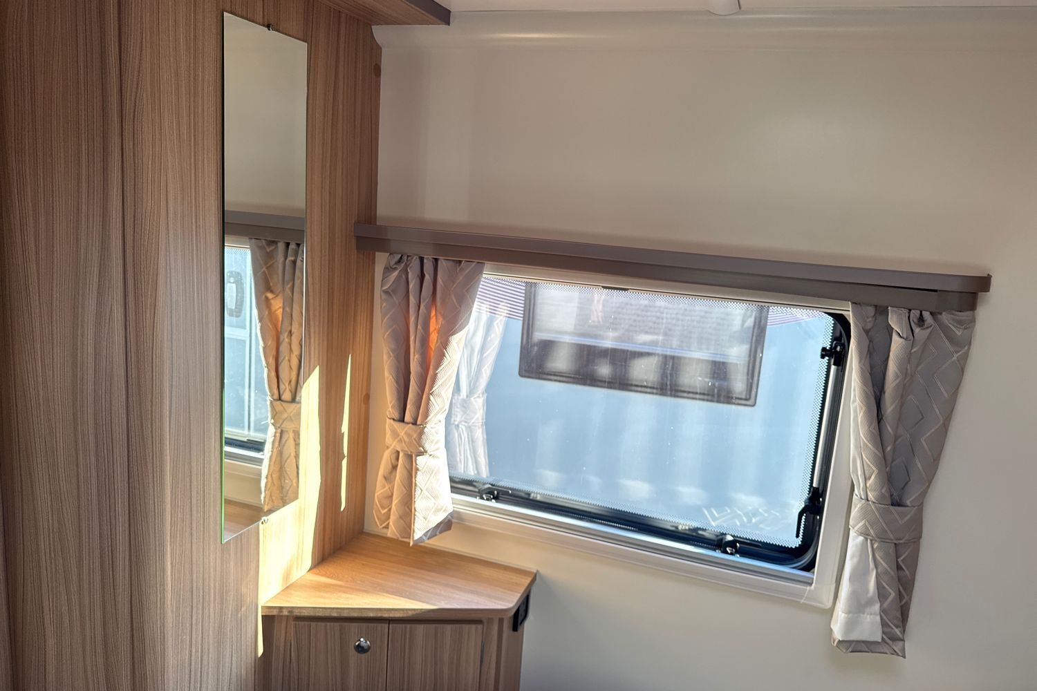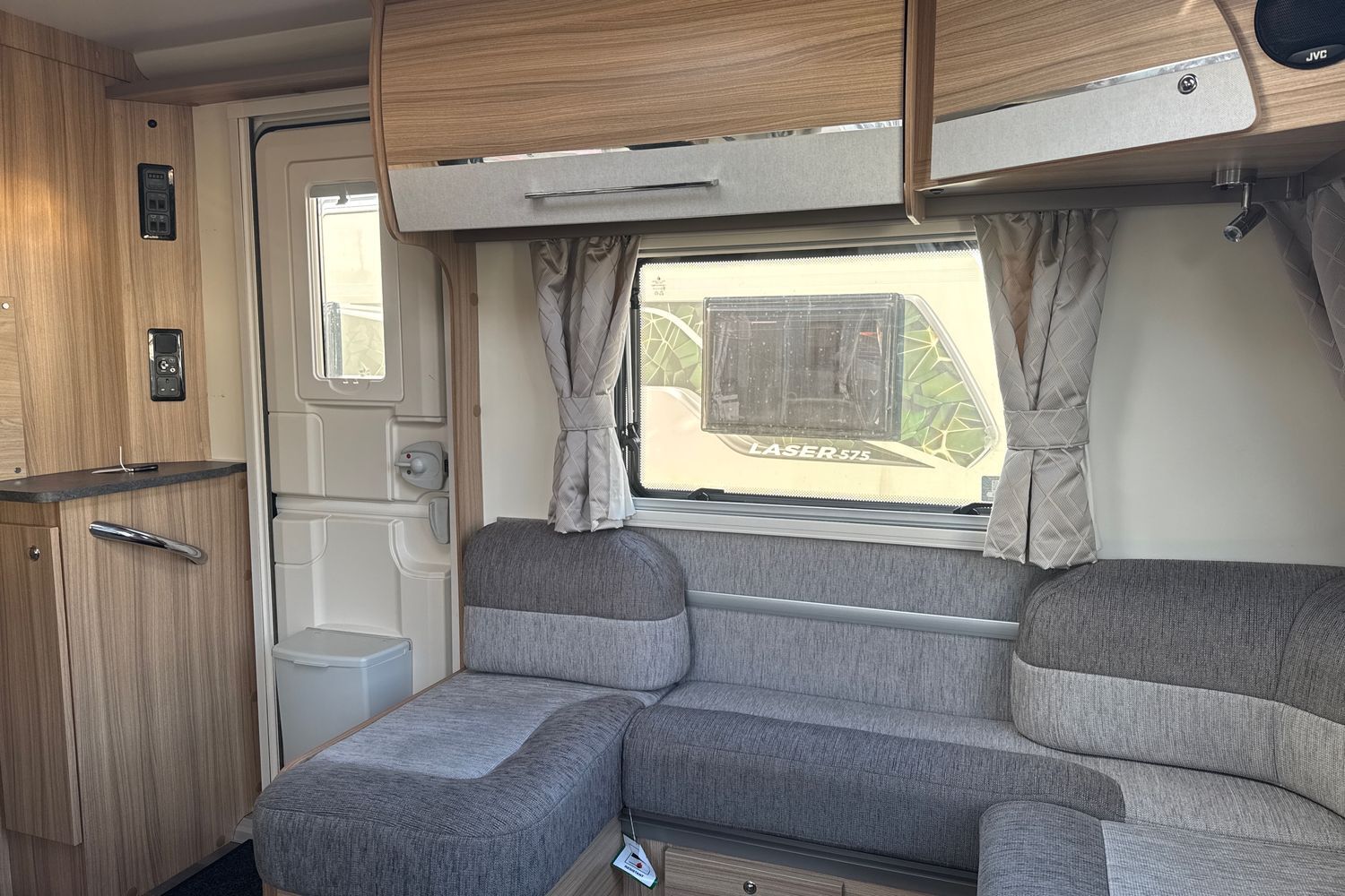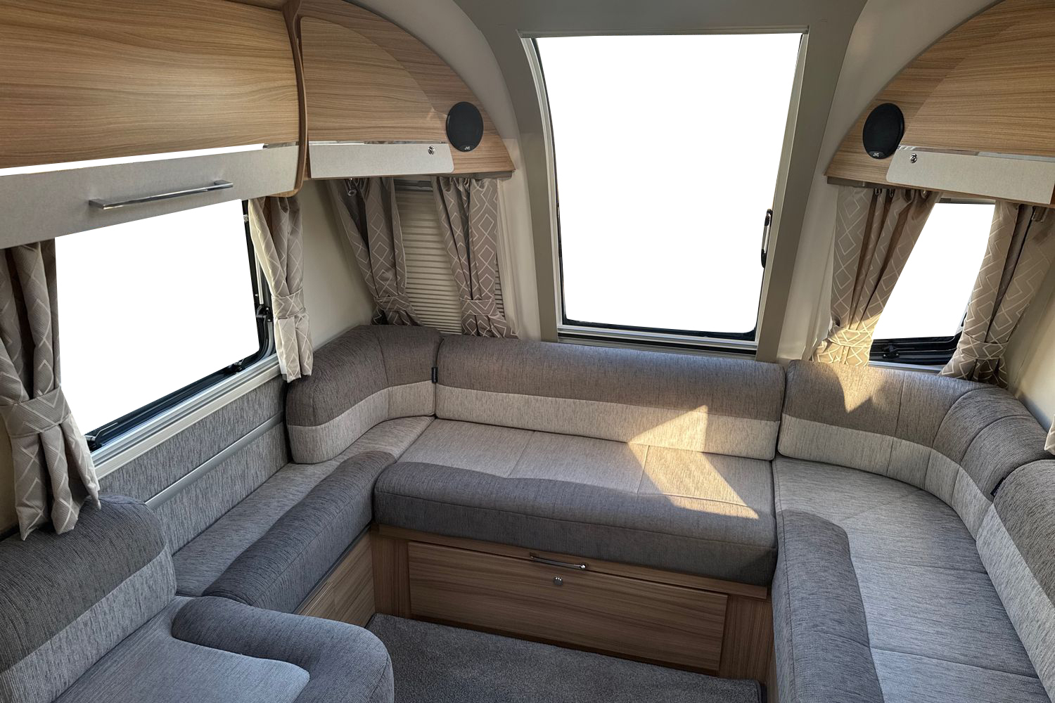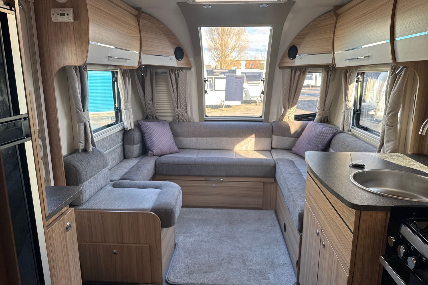 Inside the Pegasus Grande Messina, at the front, the huge lounge is light and airy, thanks to the vertical opening skylight and Heki roof-light in the ceiling. Double glazed poly-plastic windows throughout the caravan also feature Remis cassette fly-screens and blinds. G shaped-bench seats are upholstered in new ‘Kempton’ fabric and come complete with co-ordinated lined curtains, two bolster cushions, two large square and two scatter cushions. the G-shaped lounge converts into a huge double bed or can be used as singles. Storage is provided under the seats and in the overhead lockers which are finished, like all the furniture in the Pegasus Grande Messina, in 'Eucalyptus' with lockers doors finished in 'Brushed Champagne’, with chrome handles. There is a sliding, side mounted coffee table and a separate dining table for mealtimes. The flooring is hardwearing 'stone' vinyl with 'Soft truffle' loose fit carpets over the top.