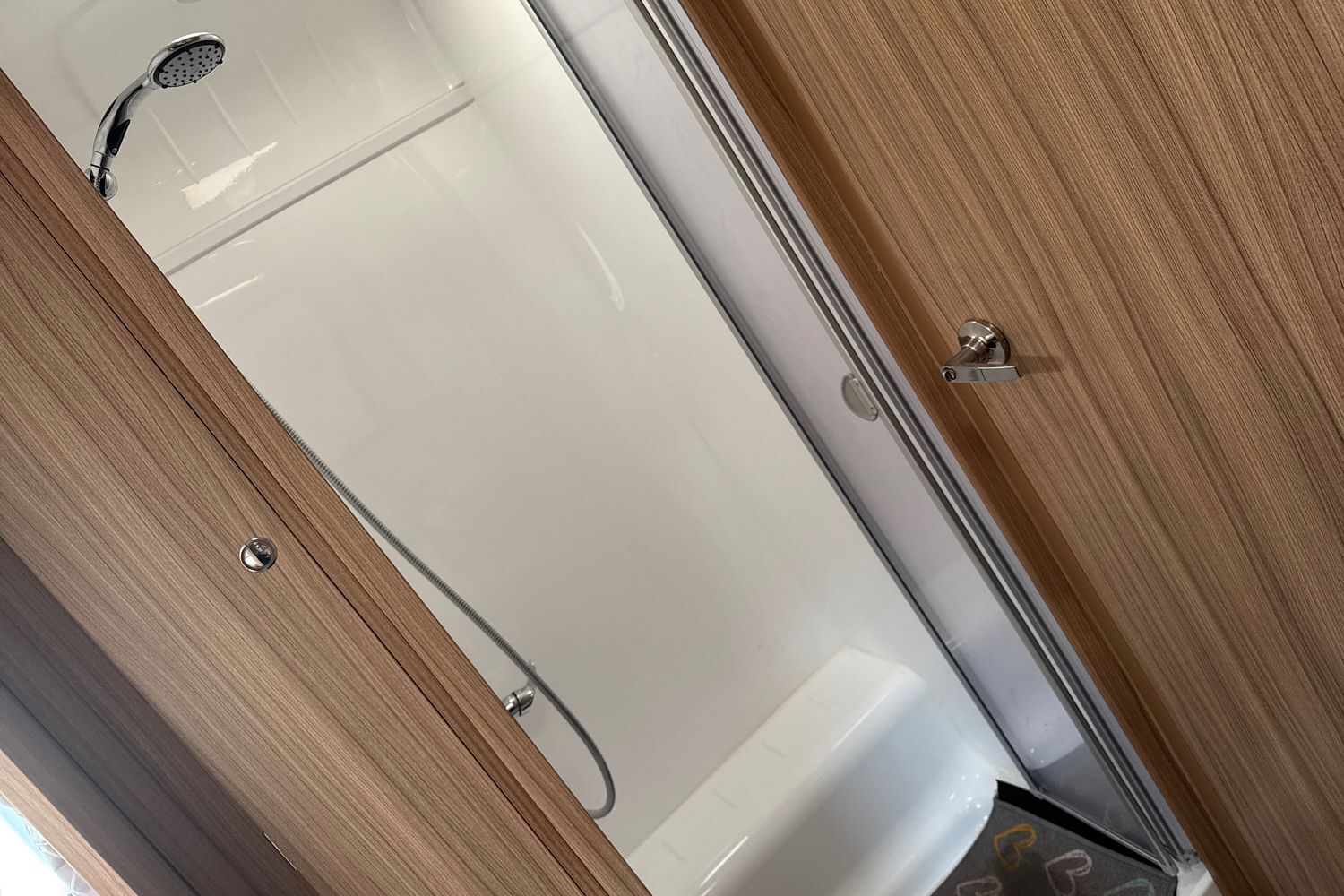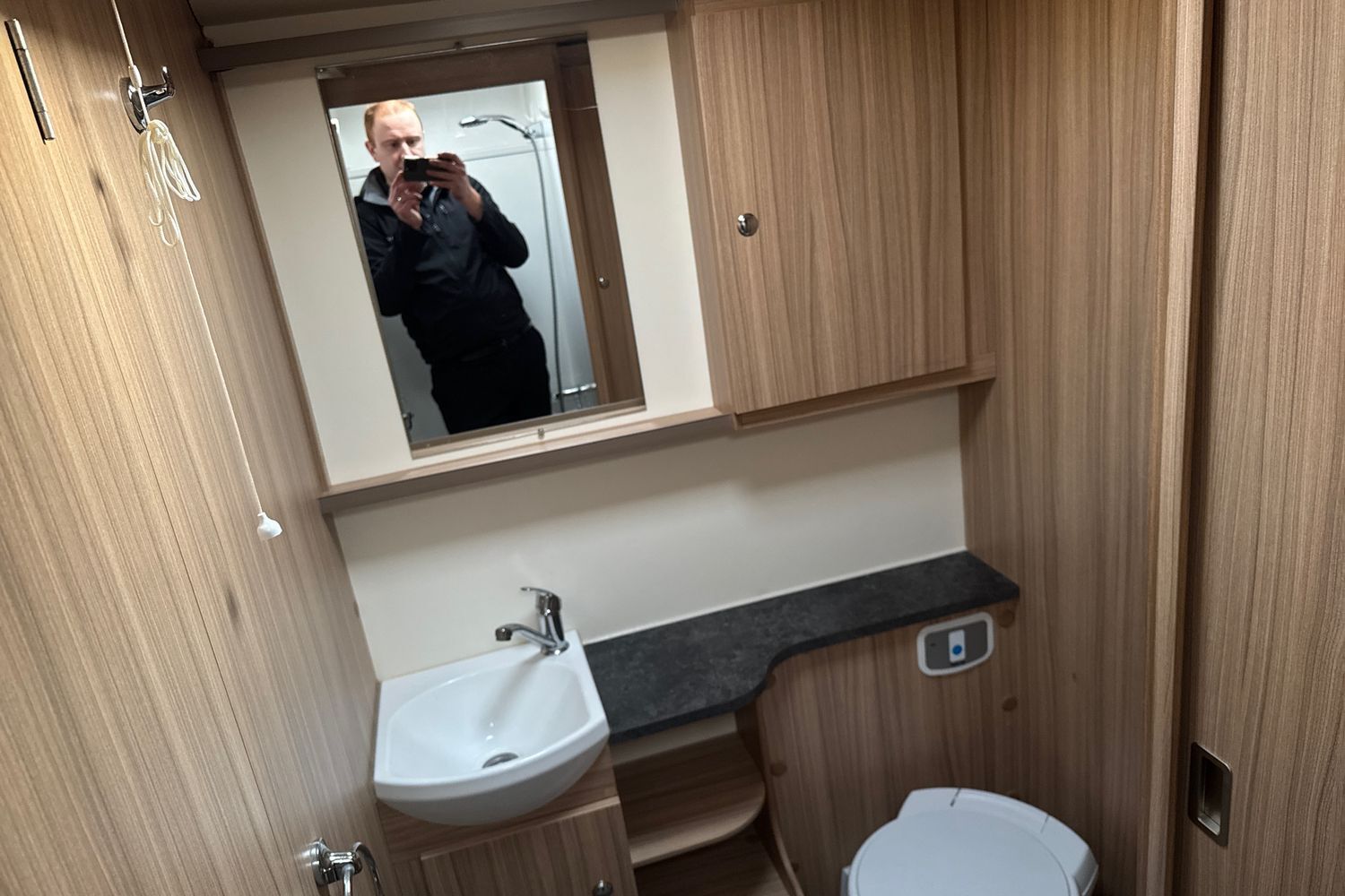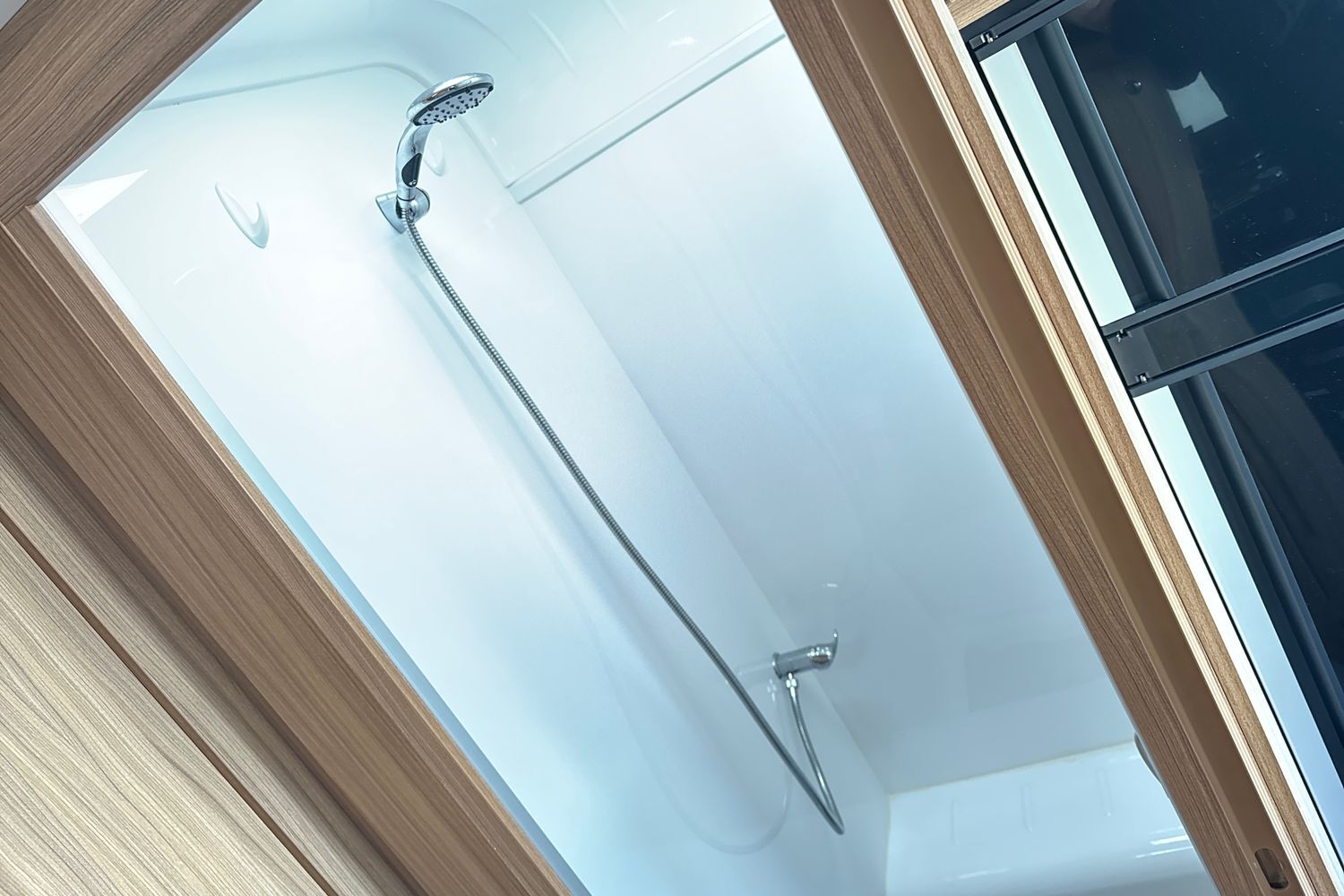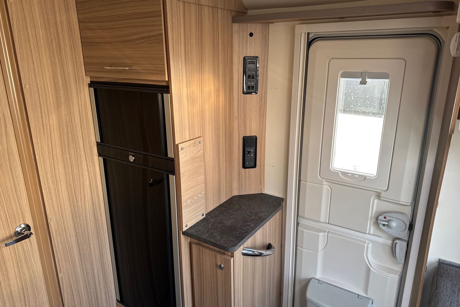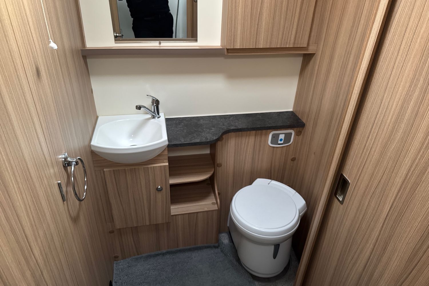 Aft of the kitchen area, the washroom is conveniently separated into a shower and toilet cubicle on either side of the caravan. On the left side is a fully lined 'Granite Stone' shower cubicle, with chrome mixer tap and 'Ecocamel' shower head. On the right, a Thetford c-260 electric flush toilet and washbasin with chrome mixer tap and vanity unit. This layout provides real space and privacy for occupants and allowing the washroom facilities to be accessed from either end of the caravan.