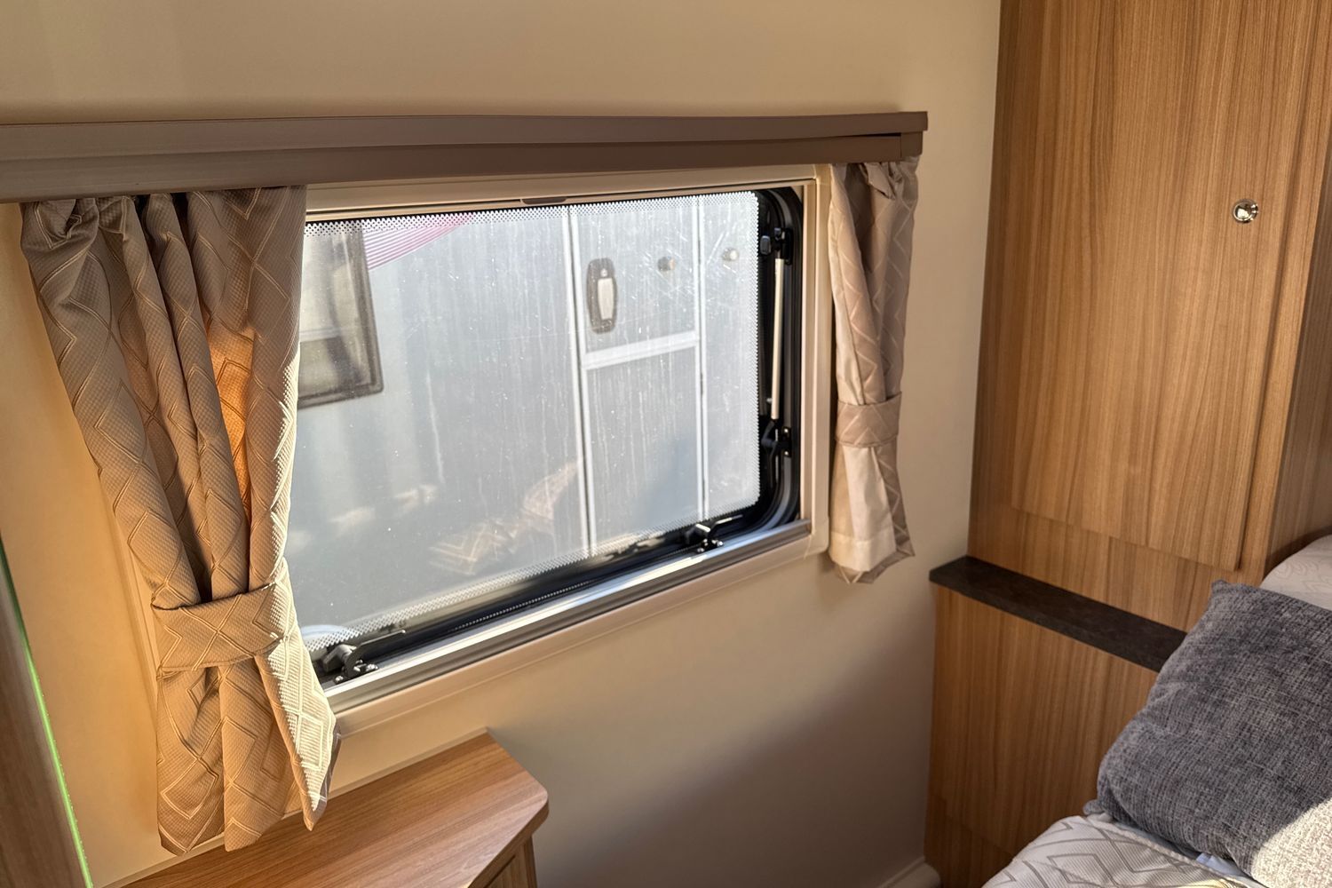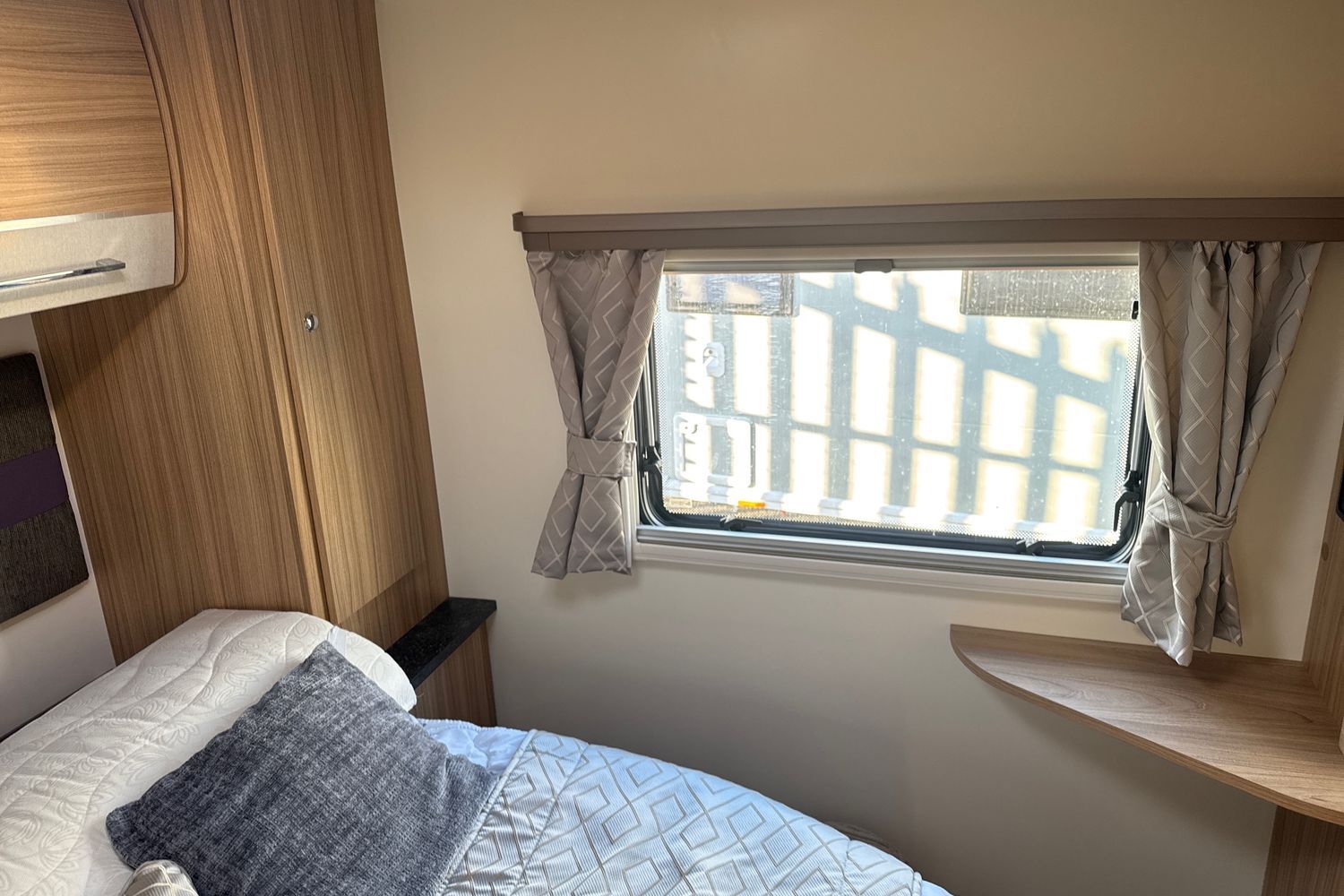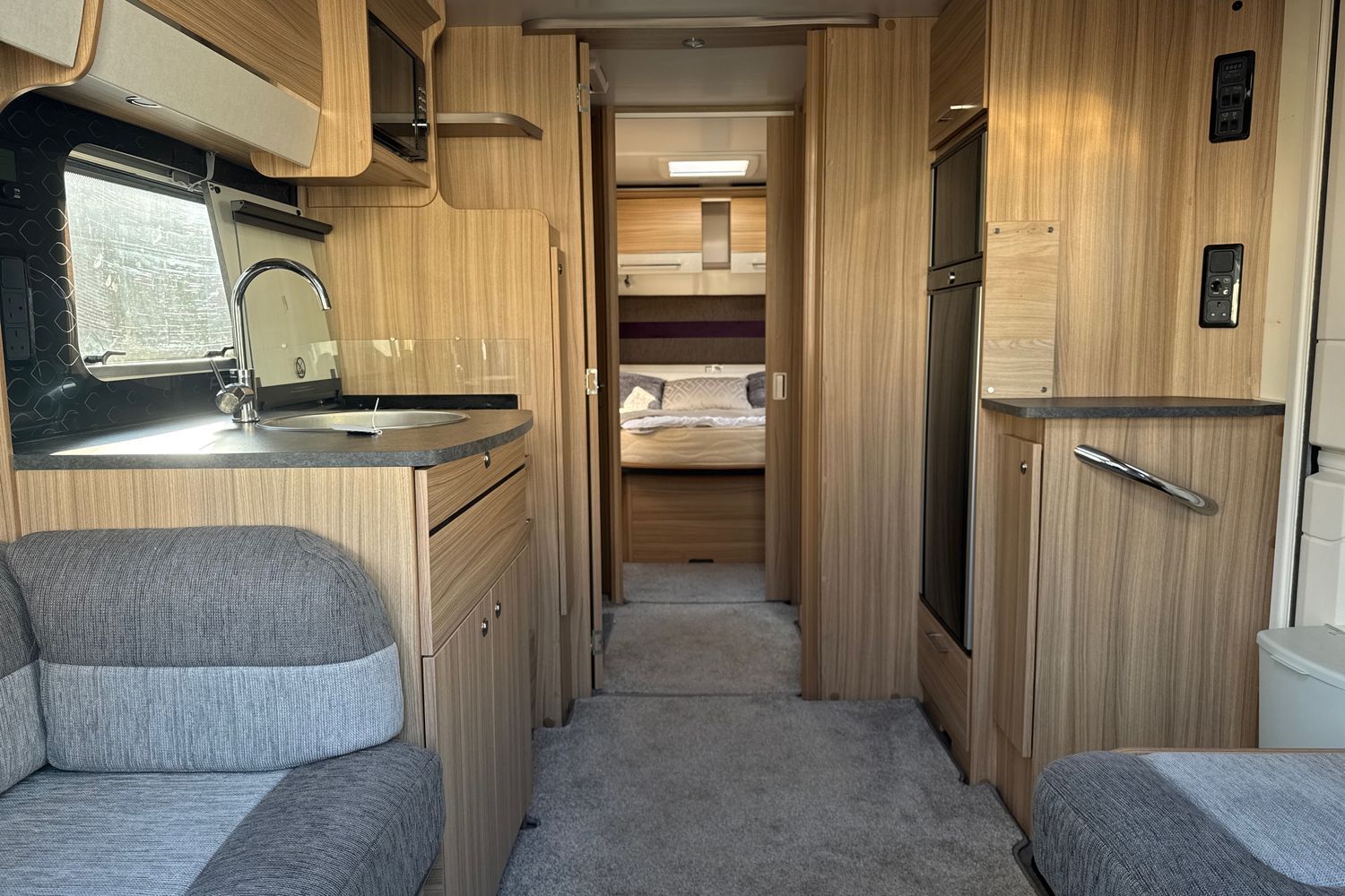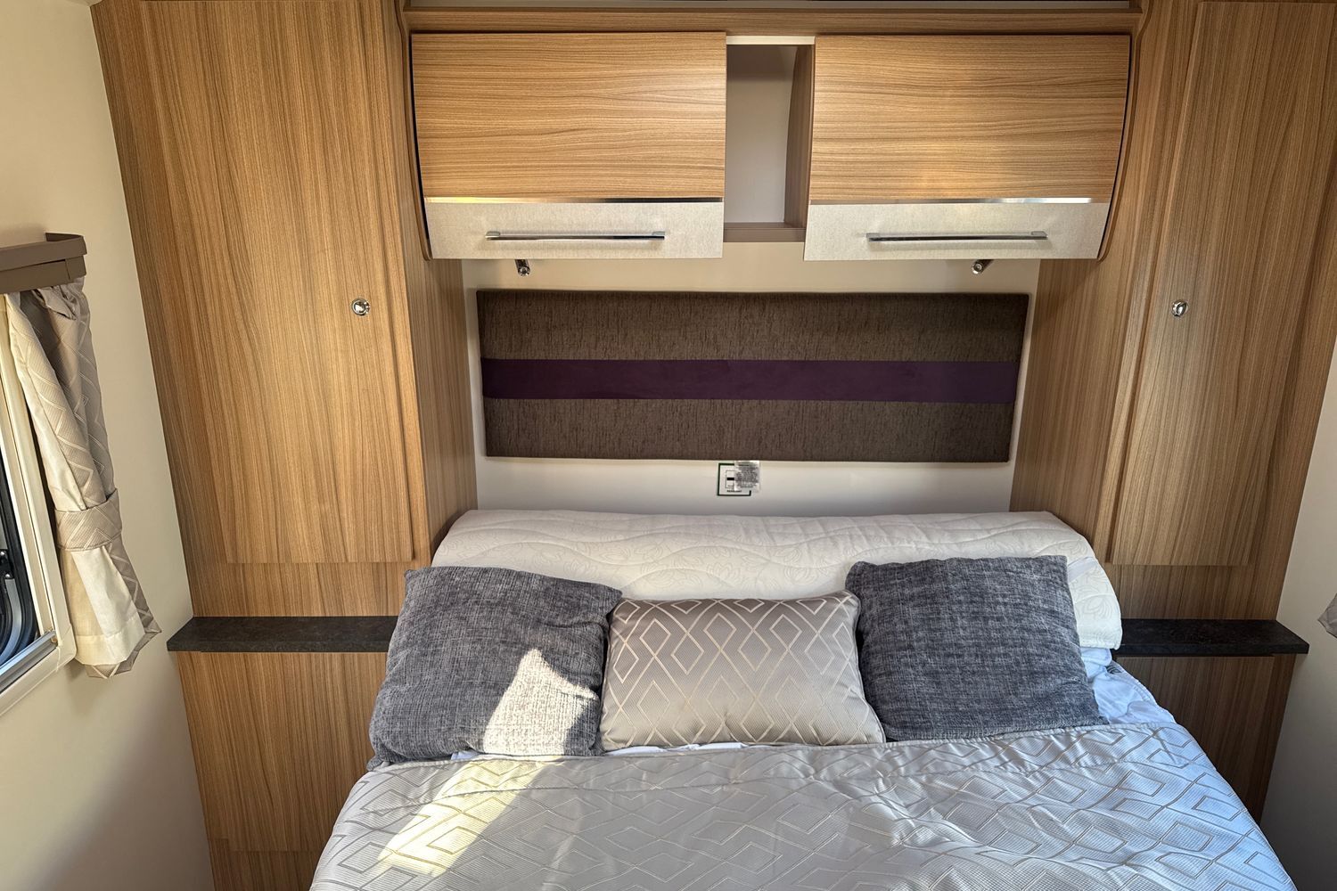 Aft of the washroom facilities, the bedroom is located right at the back and features a spacious island double bed. The beauty of this is that the bed is wide but still allows the occupants to get in and out without climbing over each other. The bed is mounted on an aluminium spaceframe, which lifts up on gas struts to enable access to the huge storage space underneath. The bedroom features wardrobes and storage on either side of the bed and the top quality Bailey mattress ensures a great night's sleep. Double glazed windows and a roof-light makes the bedroom light and airy, with good ventilation when required.