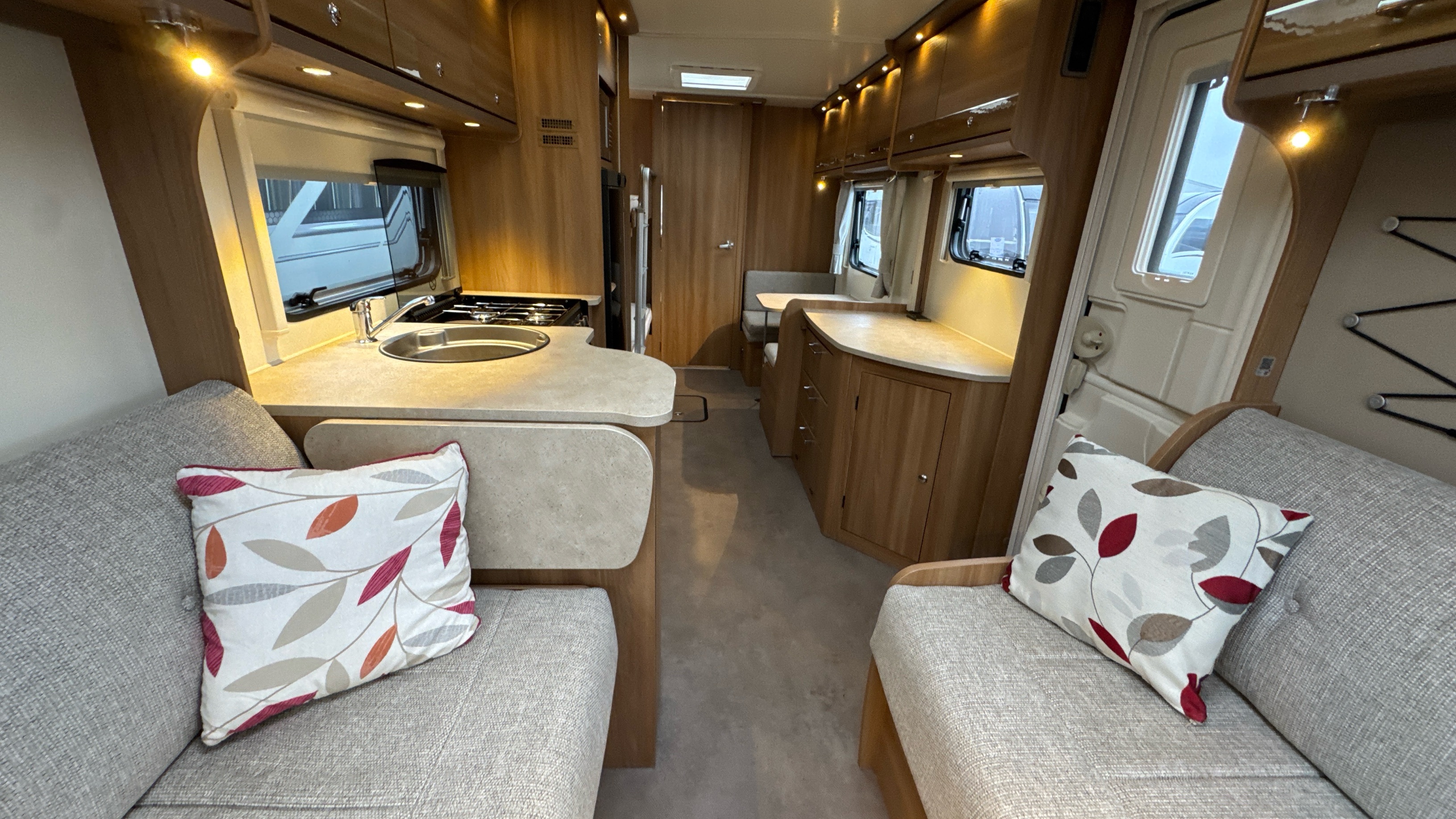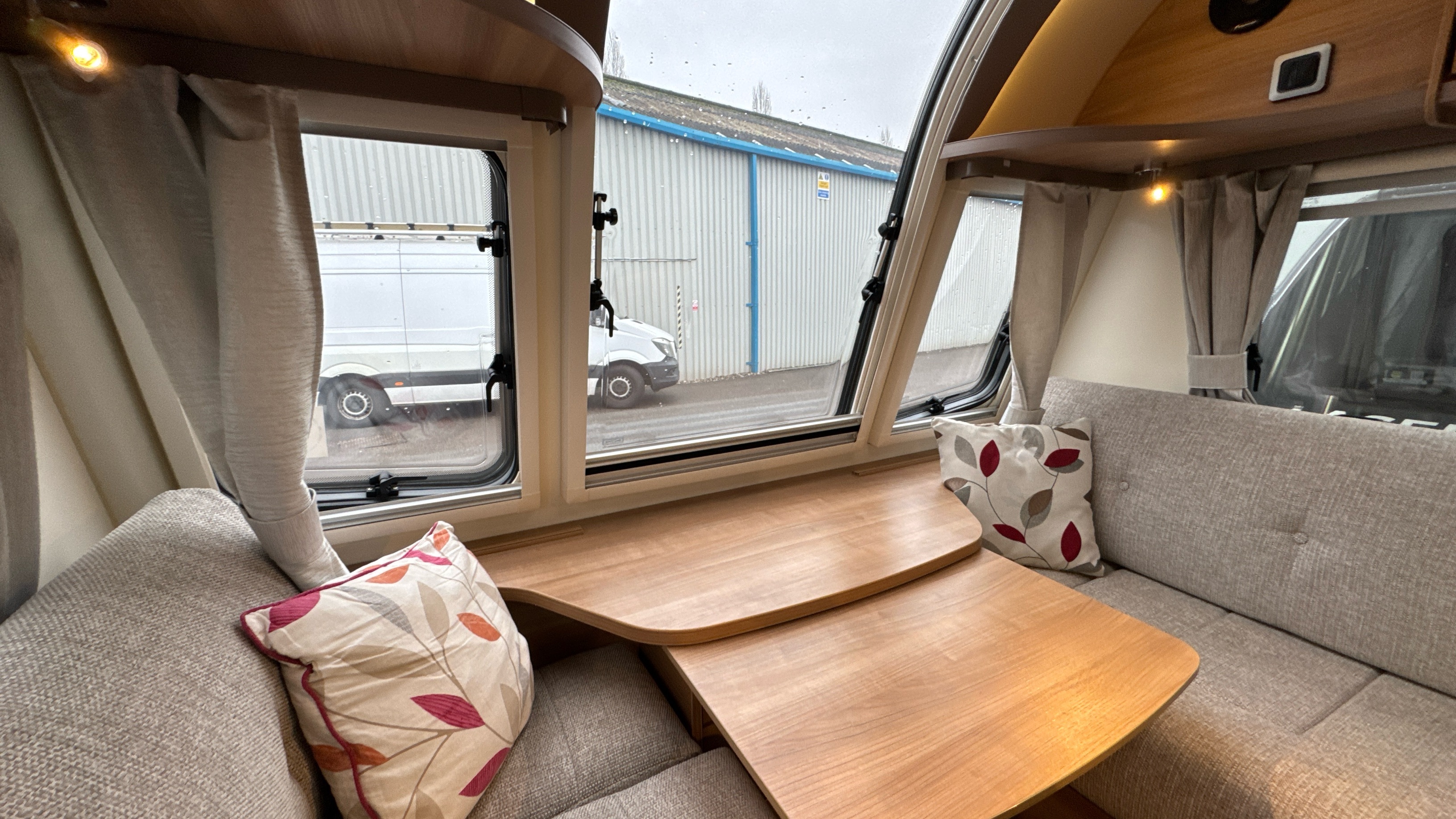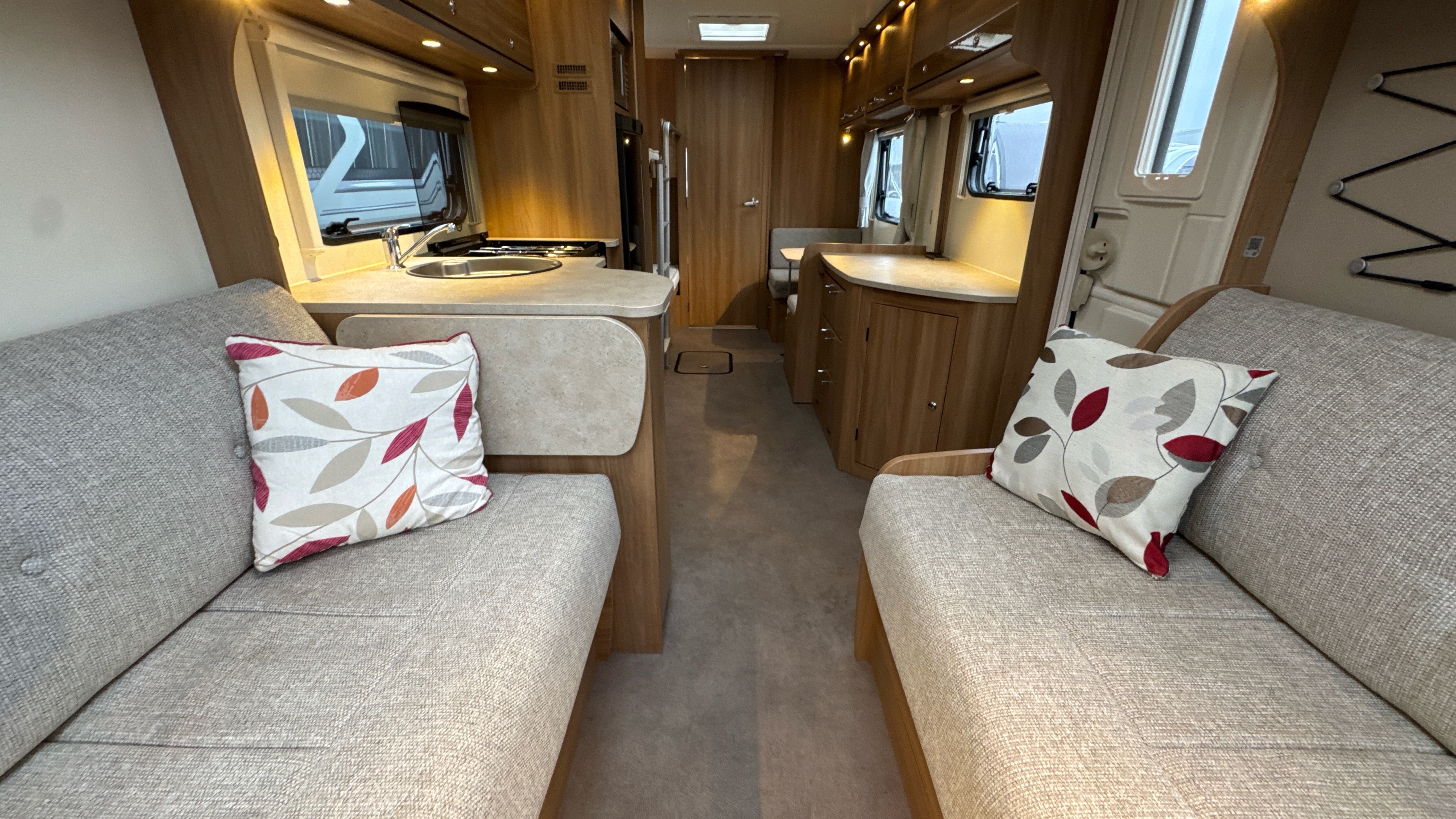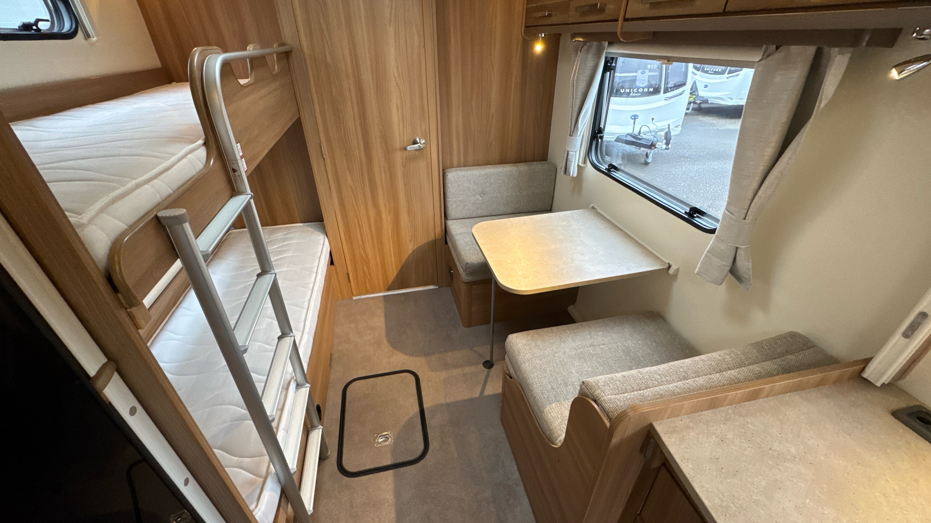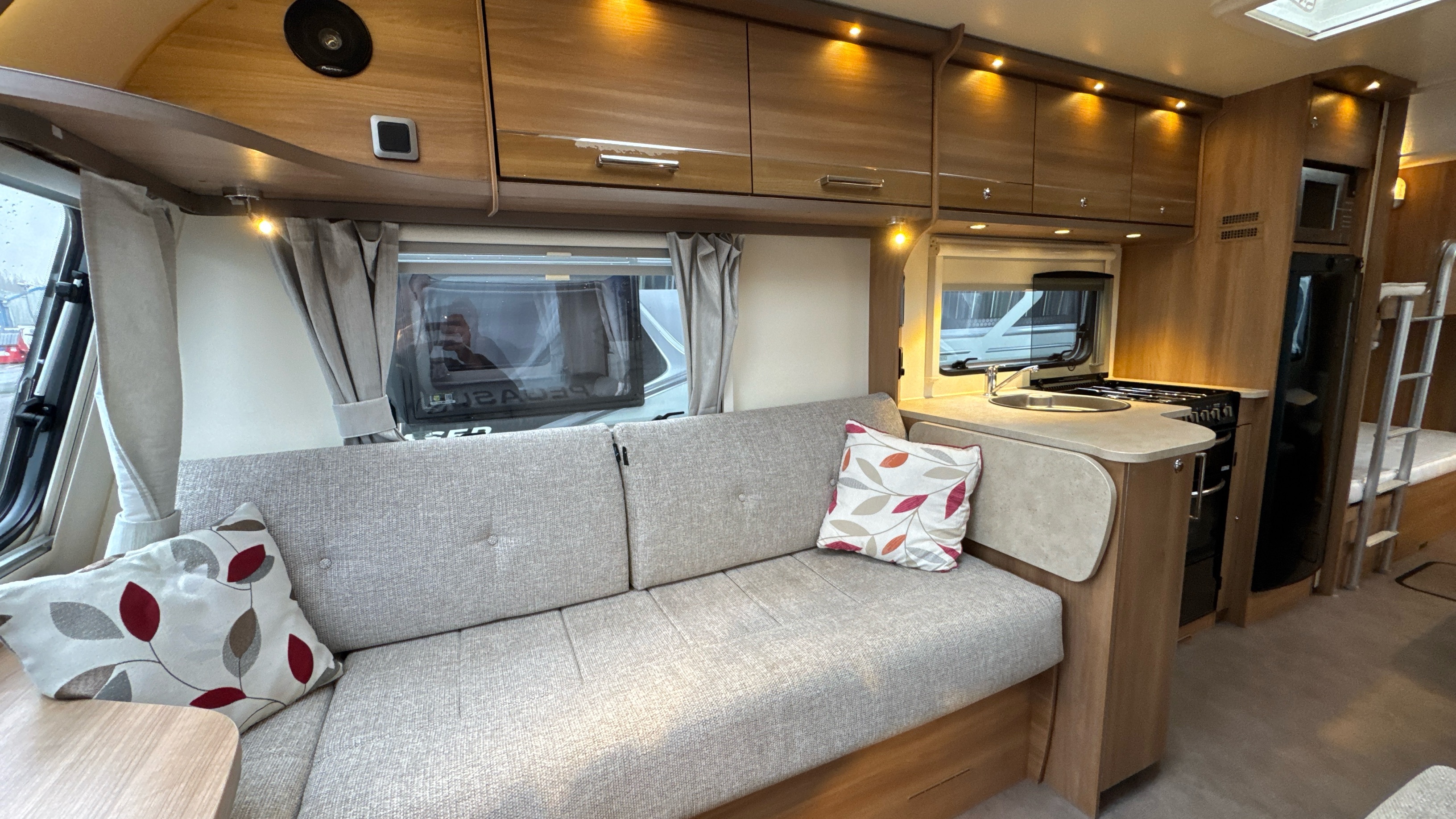It has a unique layout, introduced when Bailey launched the new Pegasus range for 2016, and with unique upholstery construction called DreamSleep. The settee bases are in two sections, one above the other. To make a bed, these fold out so that the under-sections lie one on top of the other, in the centre of the bed. The result is a perfectly flat mattress made up in just a minute or so.