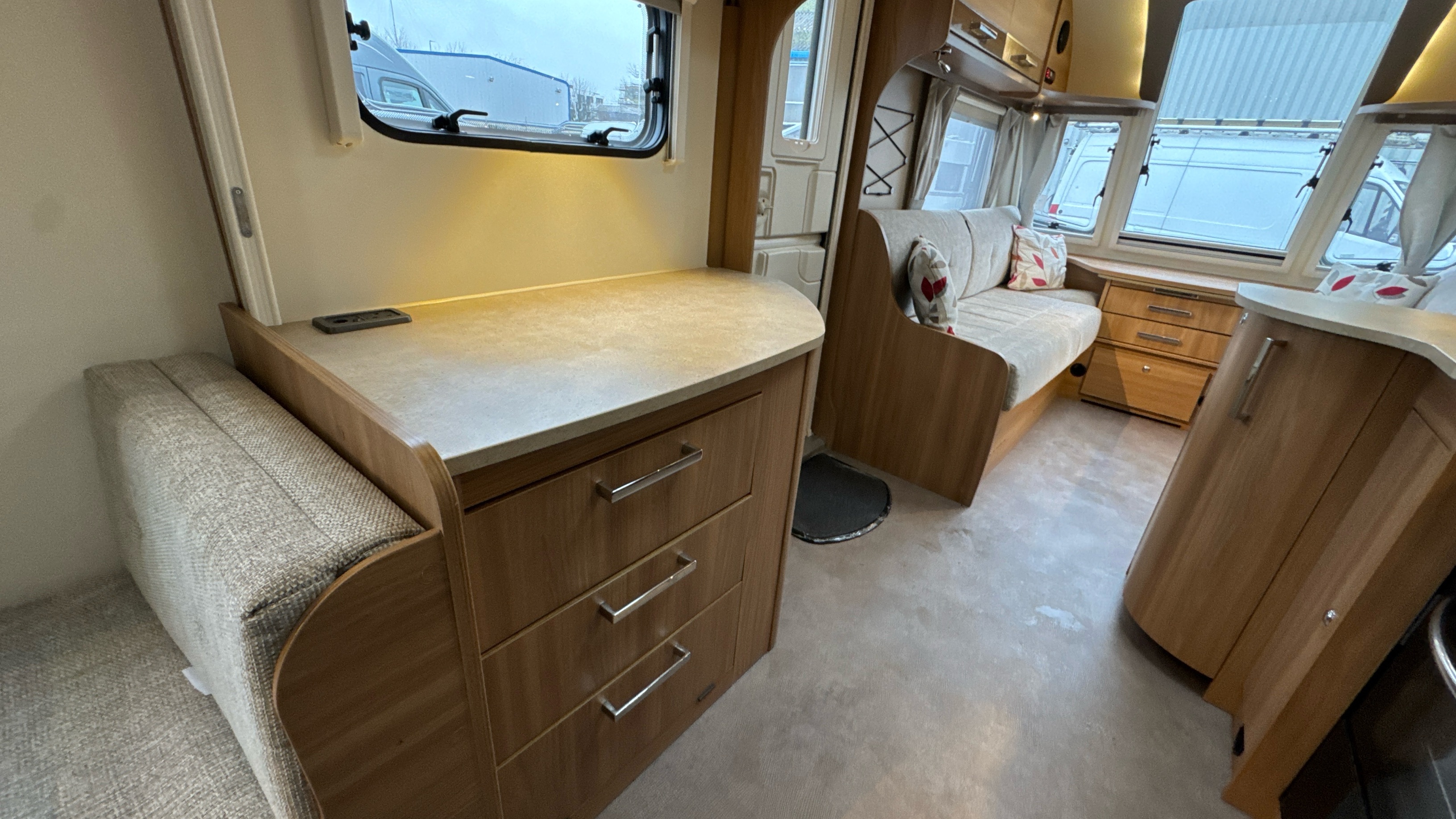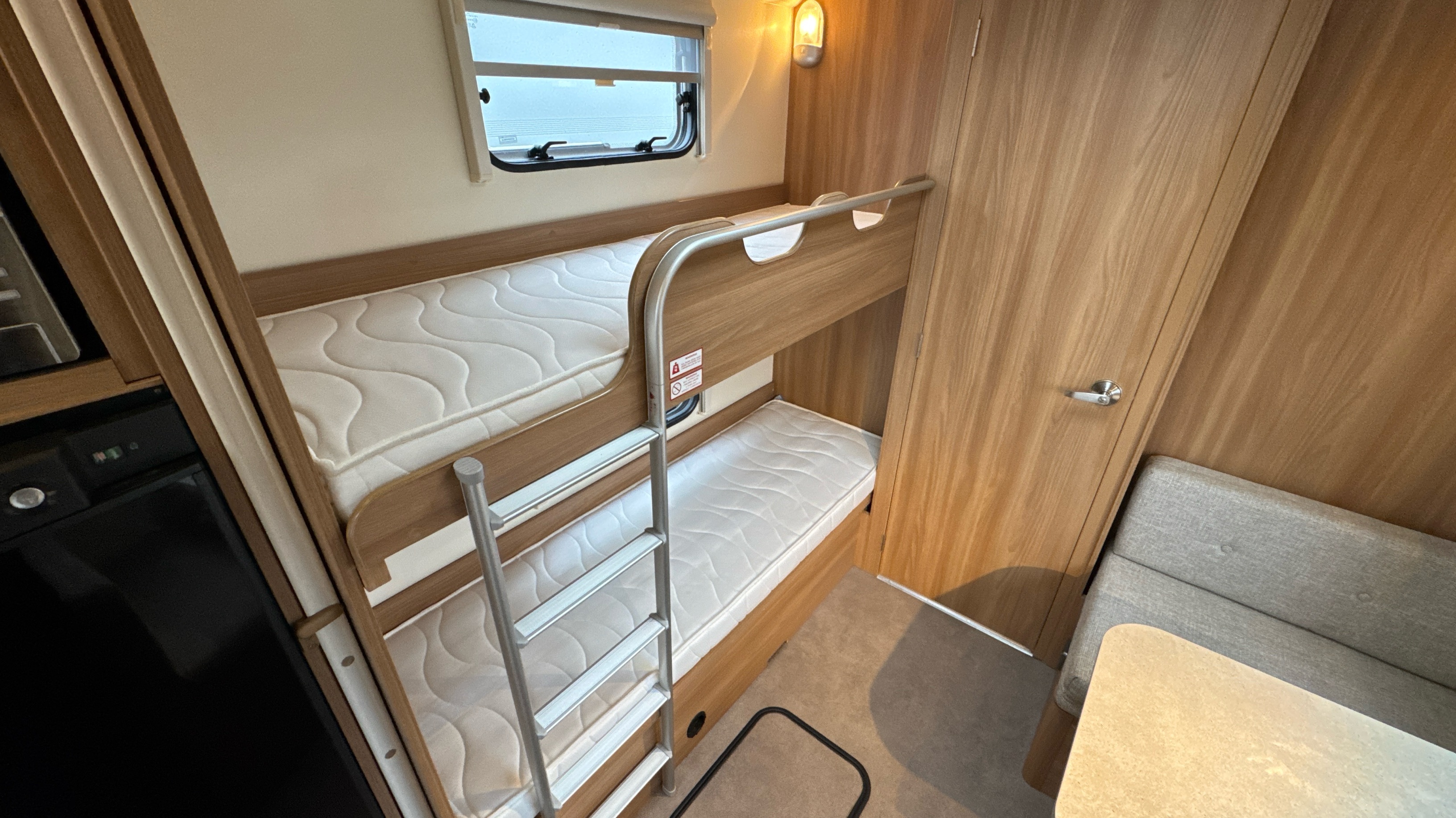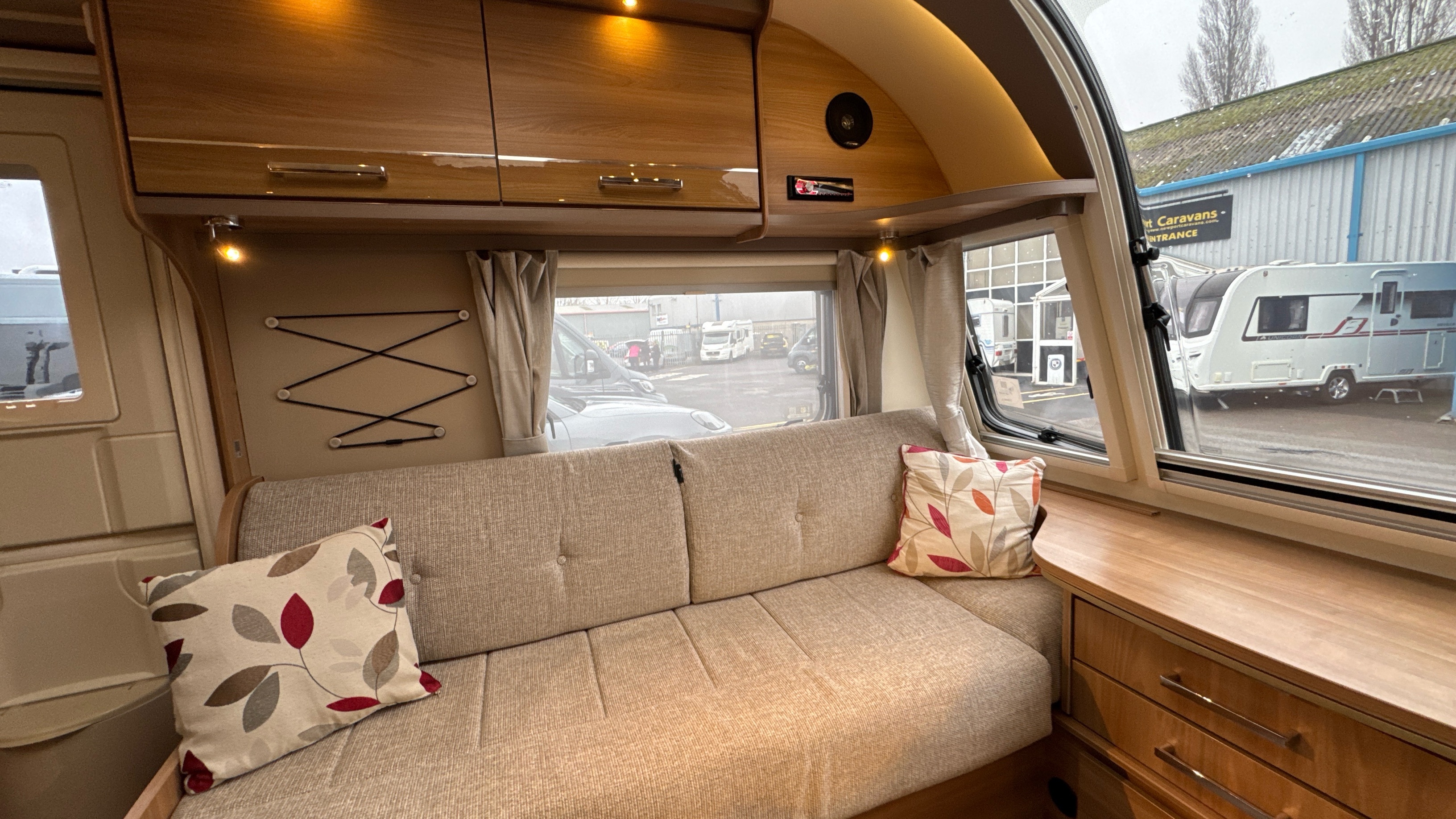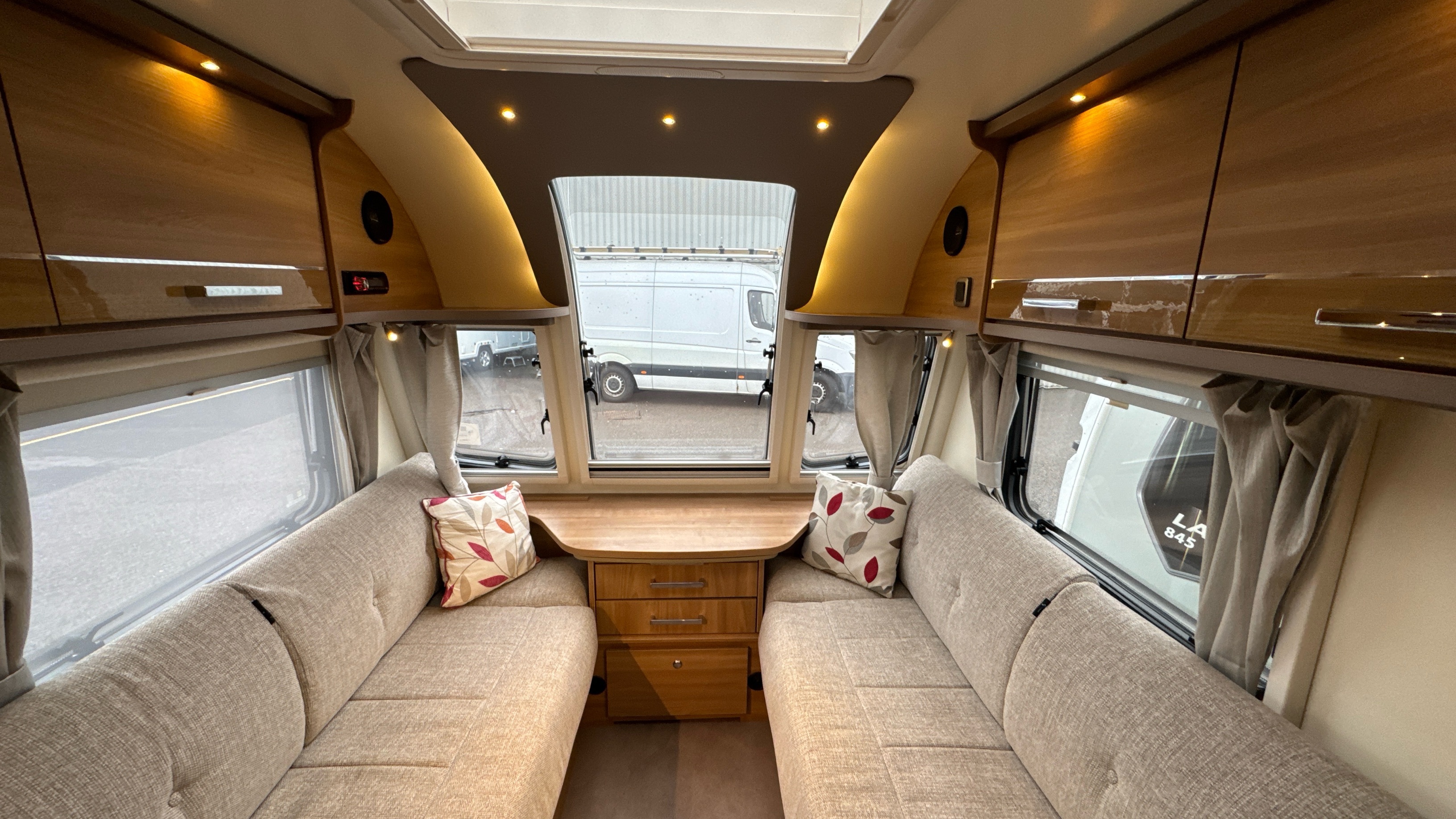 It has a unique layout, introduced when Bailey launched the new Pegasus range for 2016, and with unique upholstery construction called DreamSleep. The settee bases are in two sections, one above the other. To make a bed, these fold out so that the under-sections lie one on top of the other, in the centre of the bed. The result is a perfectly flat mattress made up in just a minute or so.