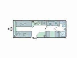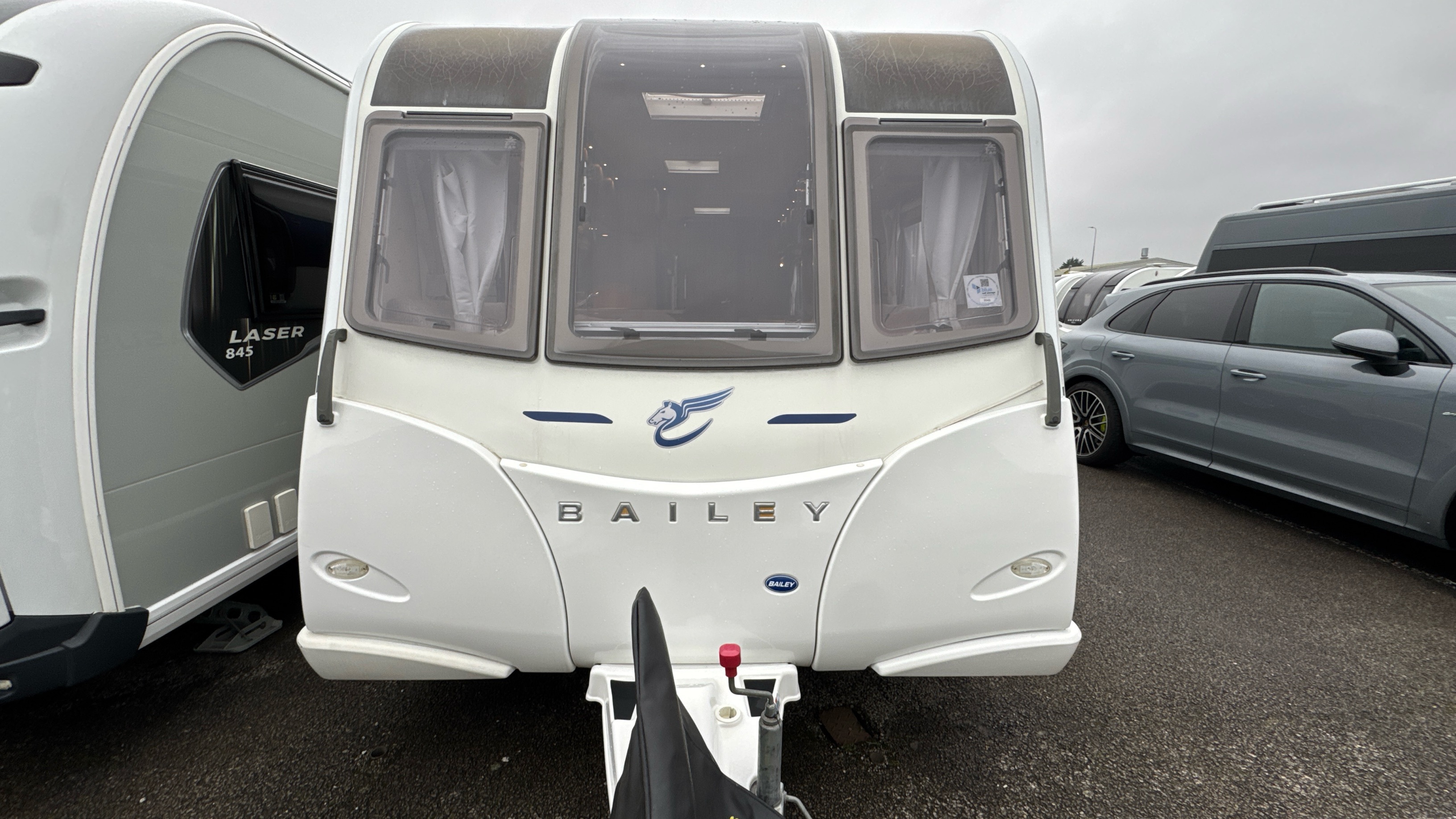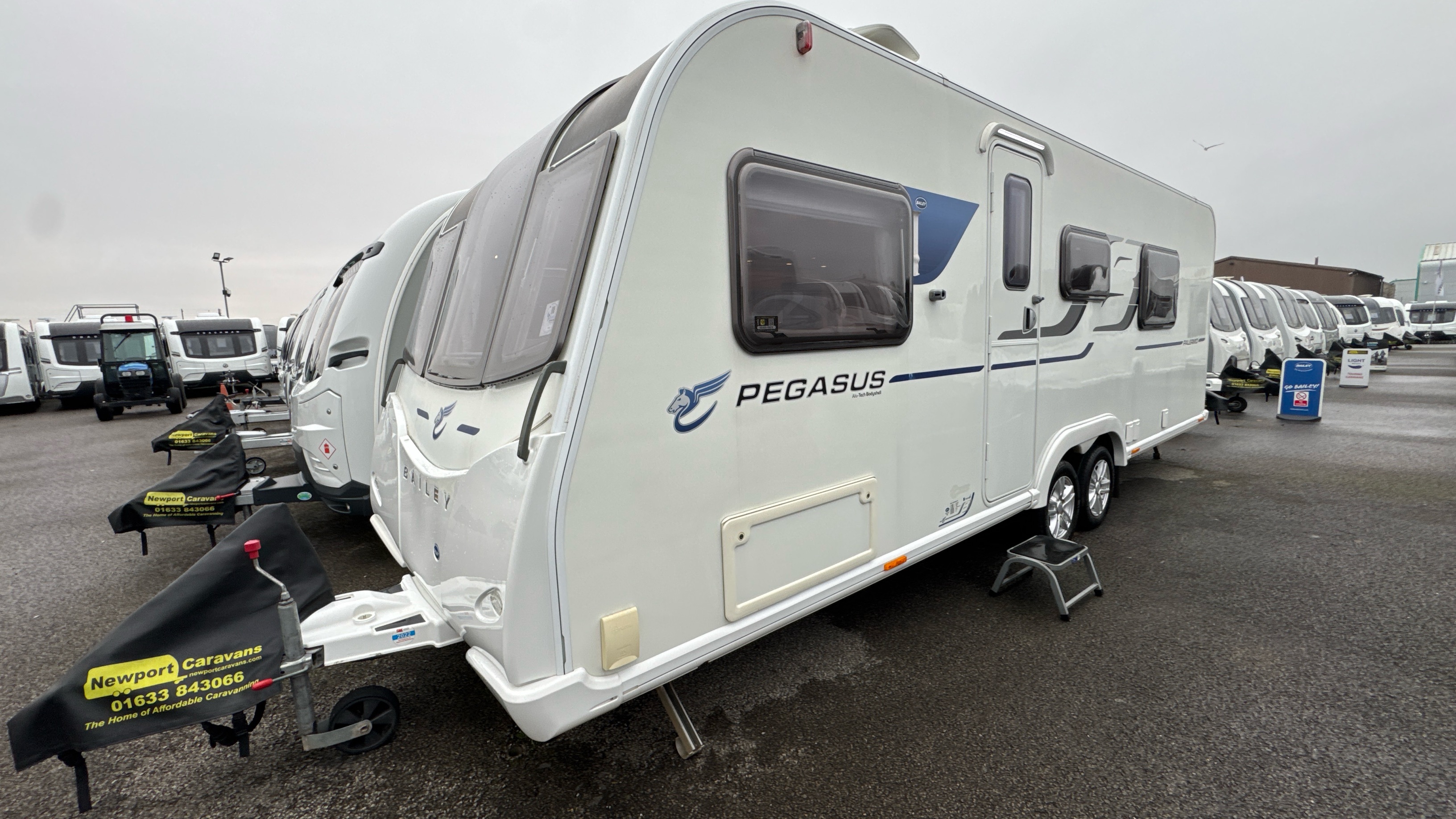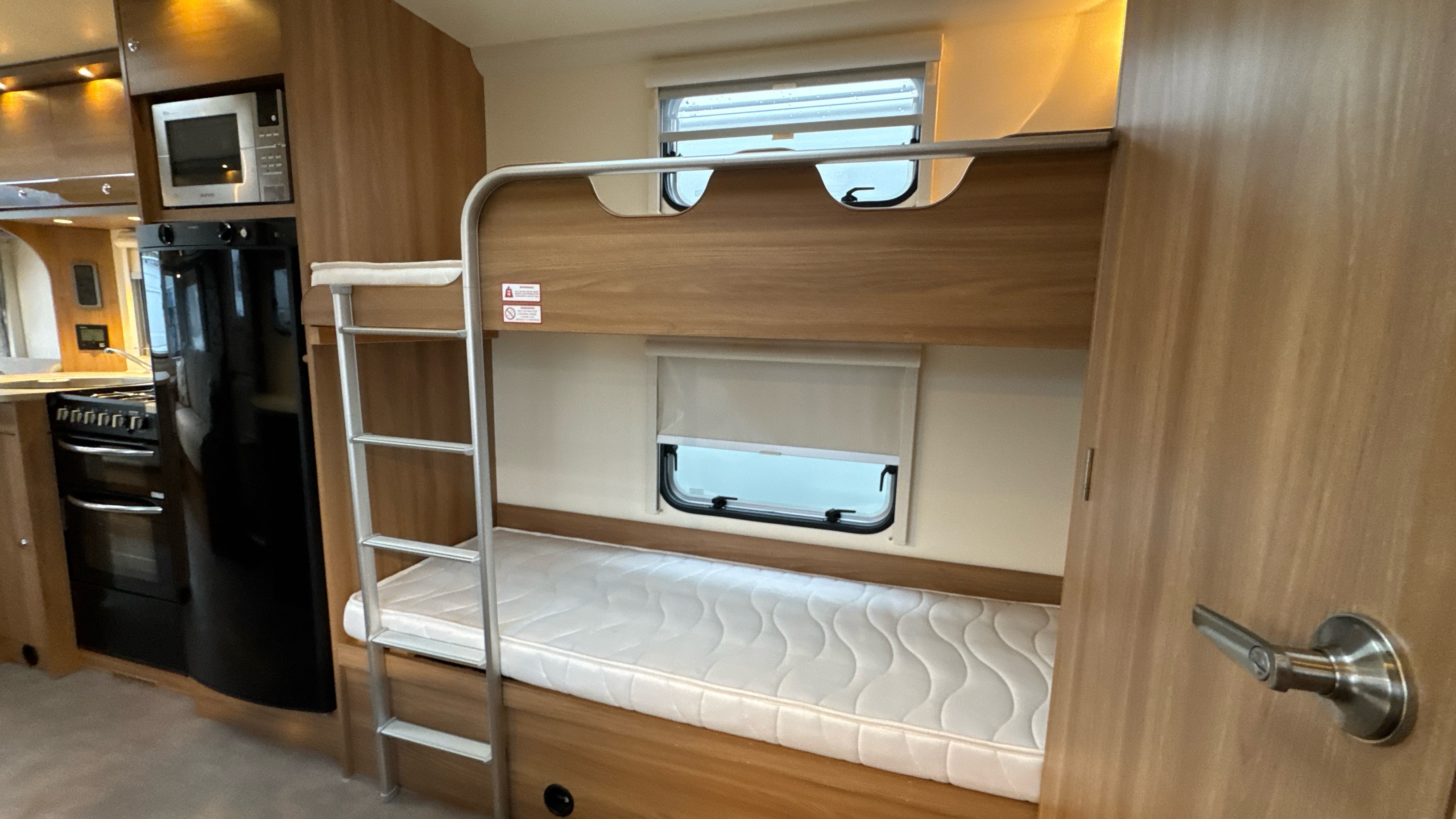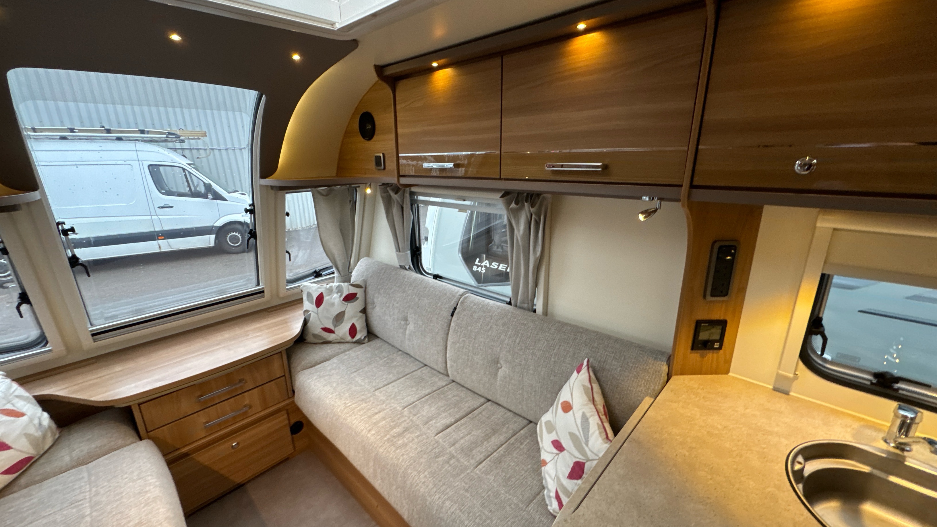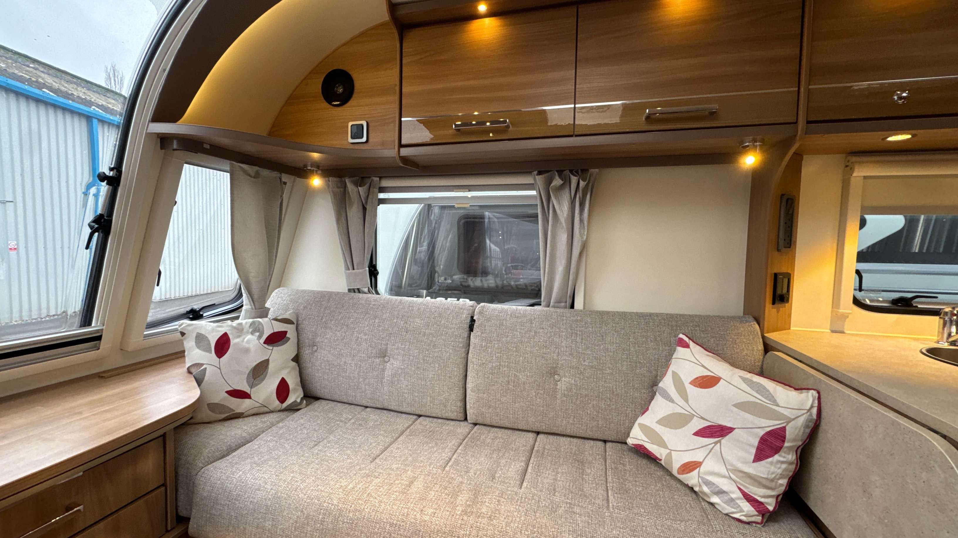 It has a unique layout, introduced when Bailey launched the new Pegasus range for 2016, and with unique upholstery construction called DreamSleep. The settee bases are in two sections, one above the other. To make a bed, these fold out so that the under-sections lie one on top of the other, in the centre of the bed. The result is a perfectly flat mattress made up in just a minute or so.