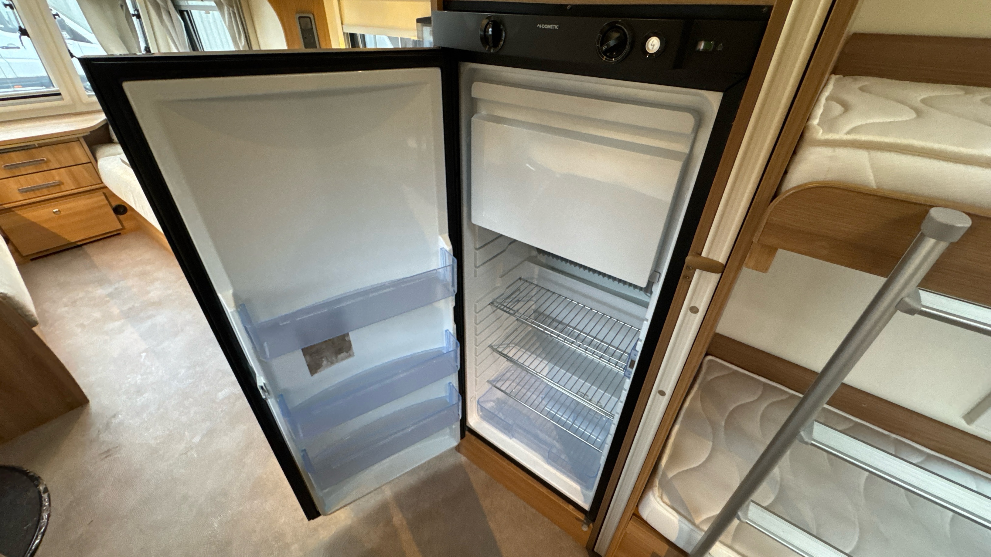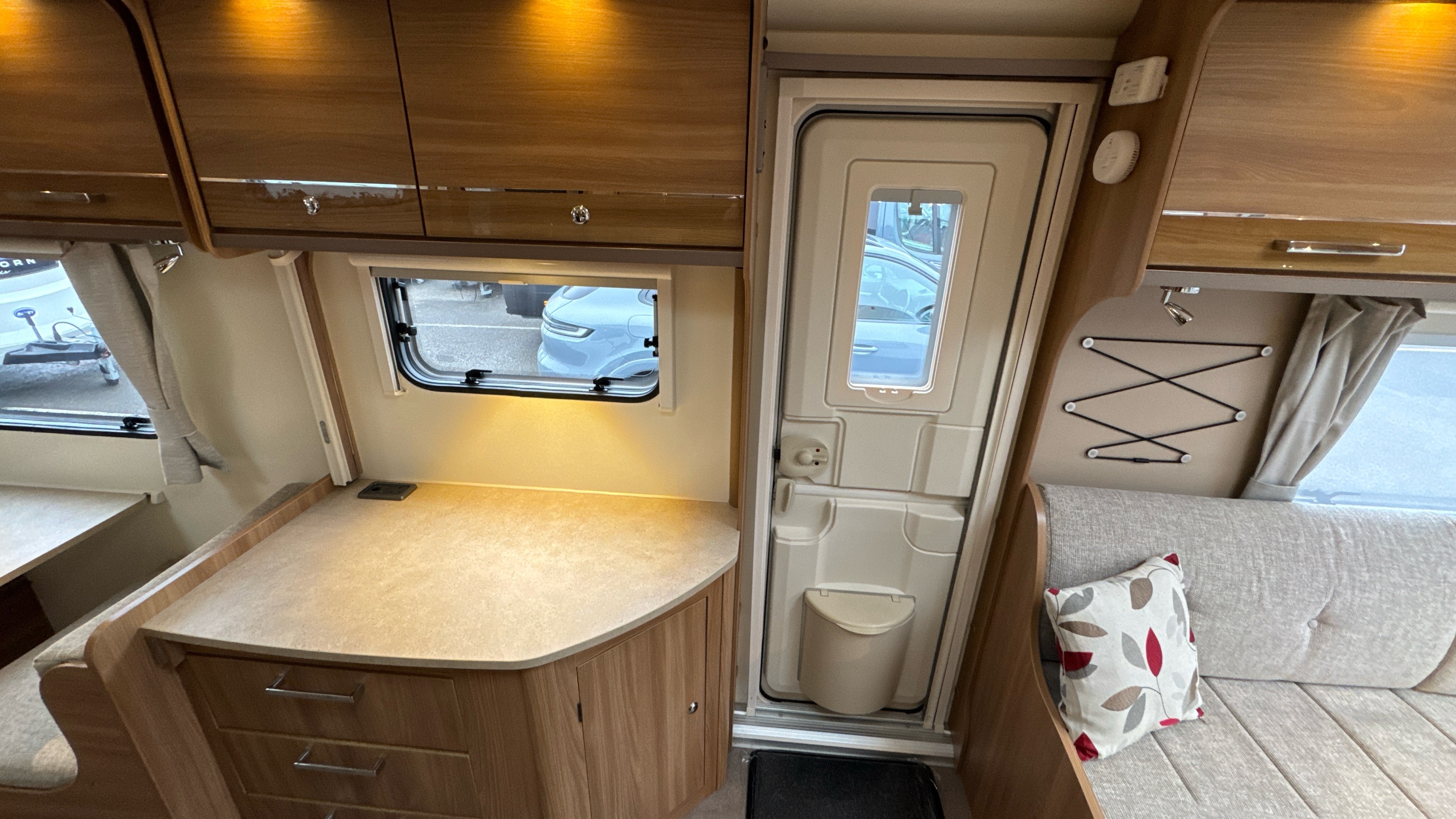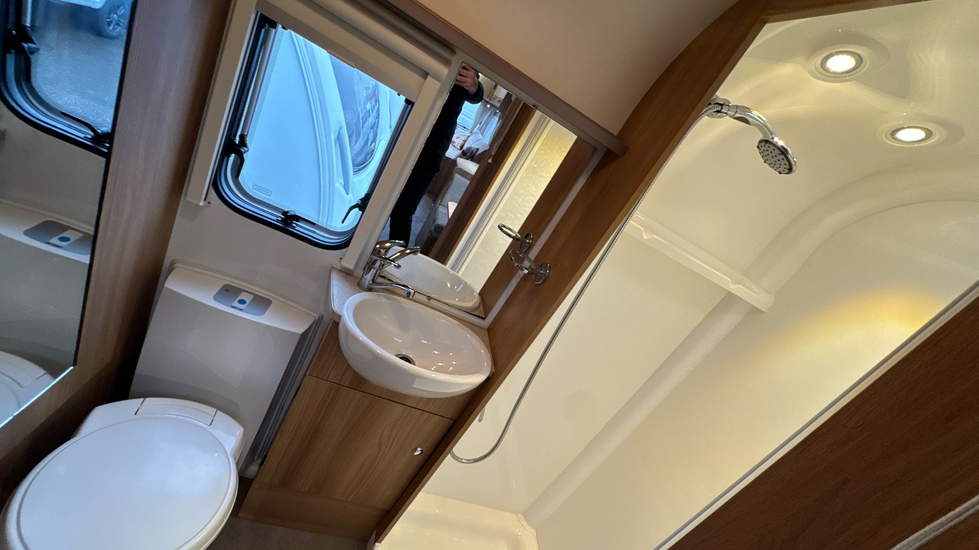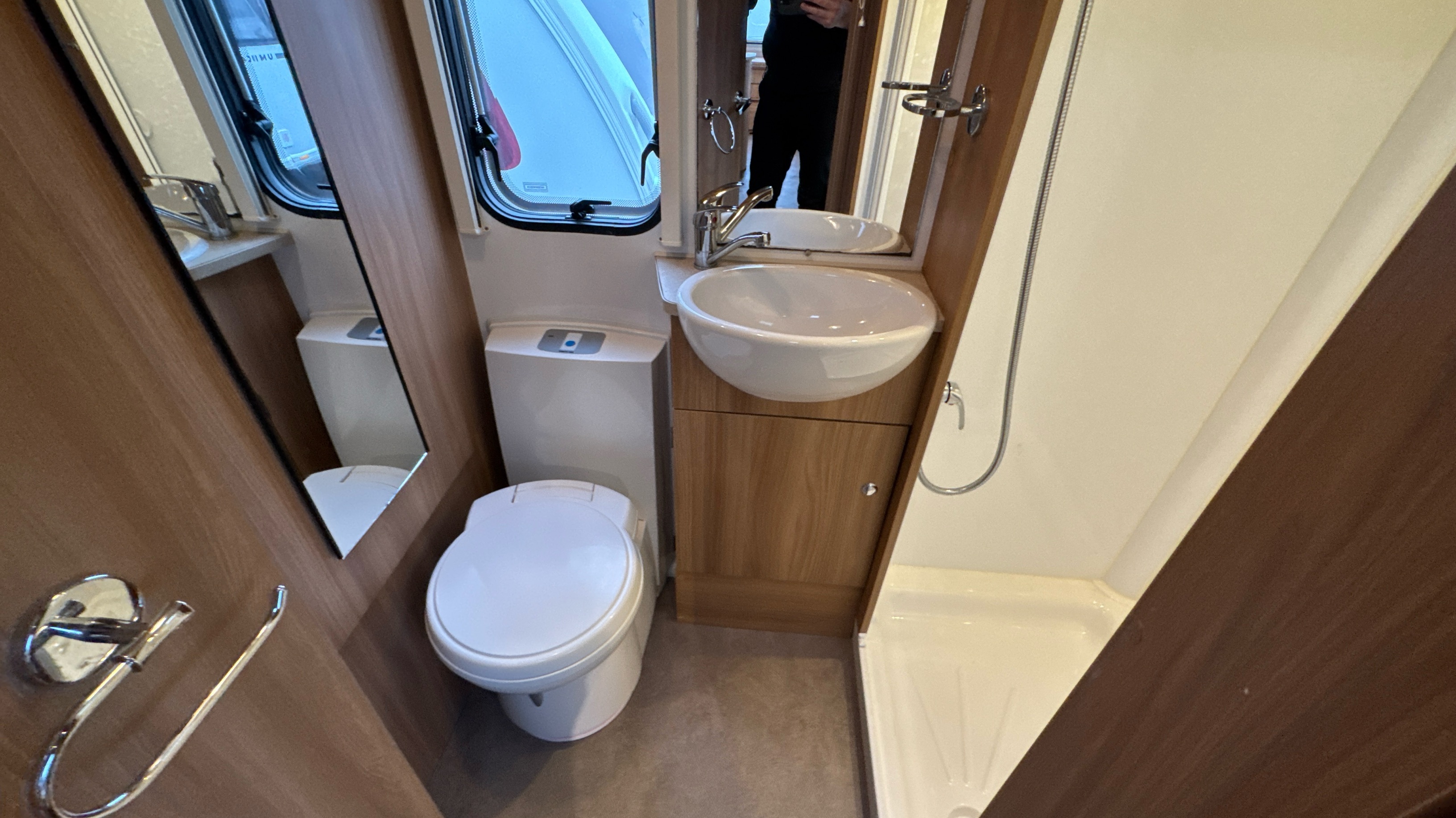 The toilet is mounted against the back wall, with the washbasin alongside it, and the shower on the nearside. It’s a neat layout and utilises the whole width across the rear of this fantastic caravan.