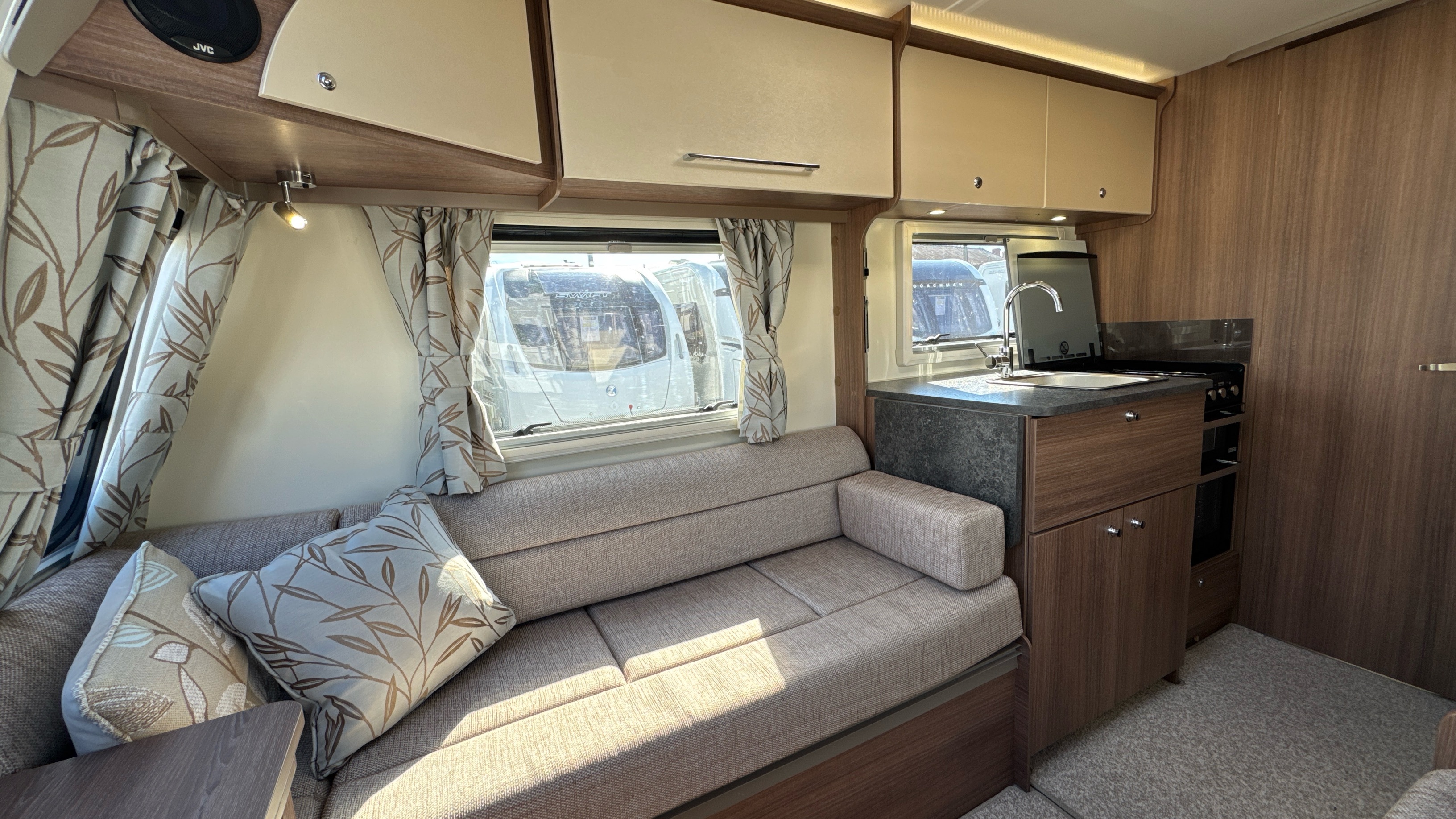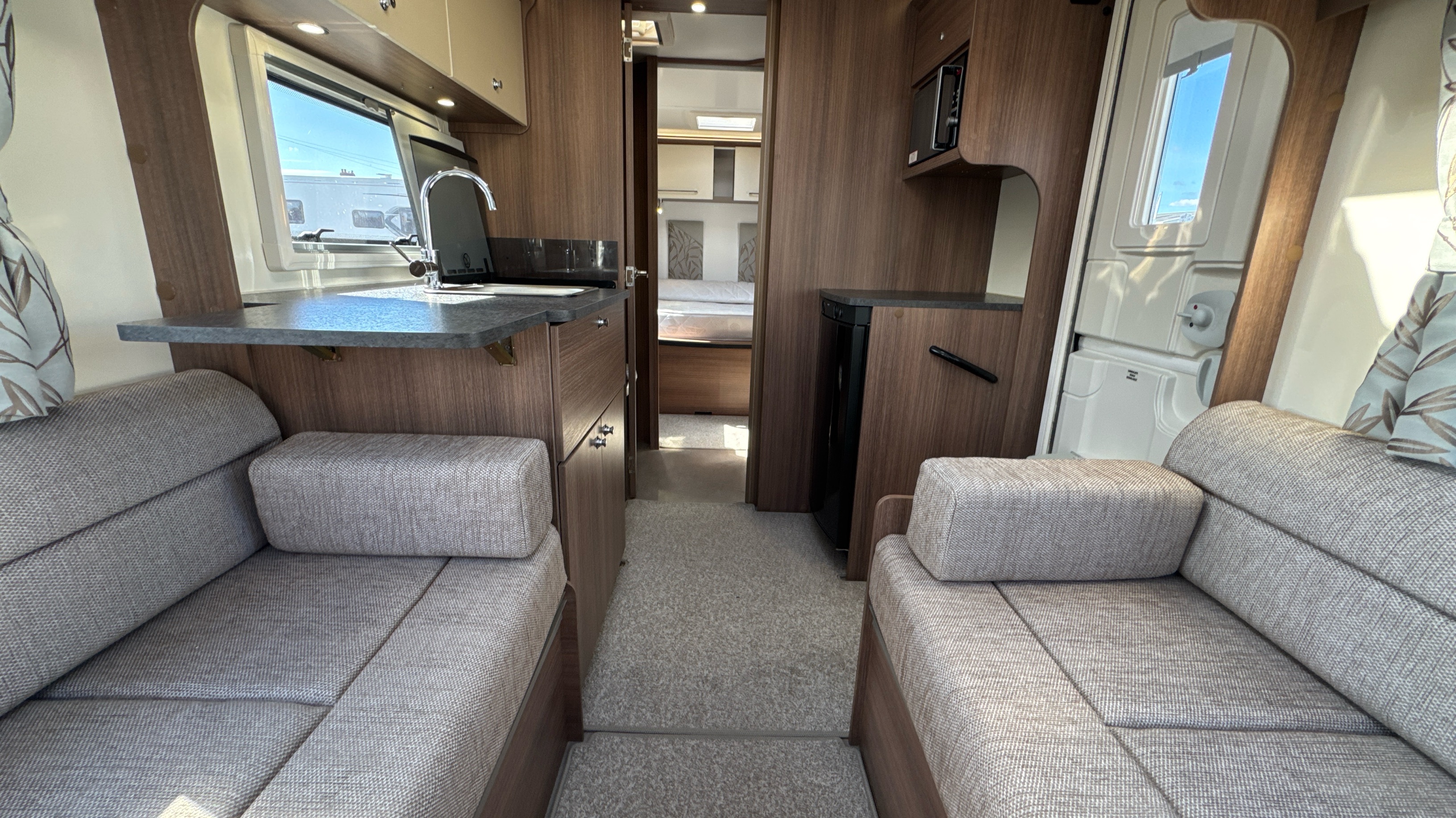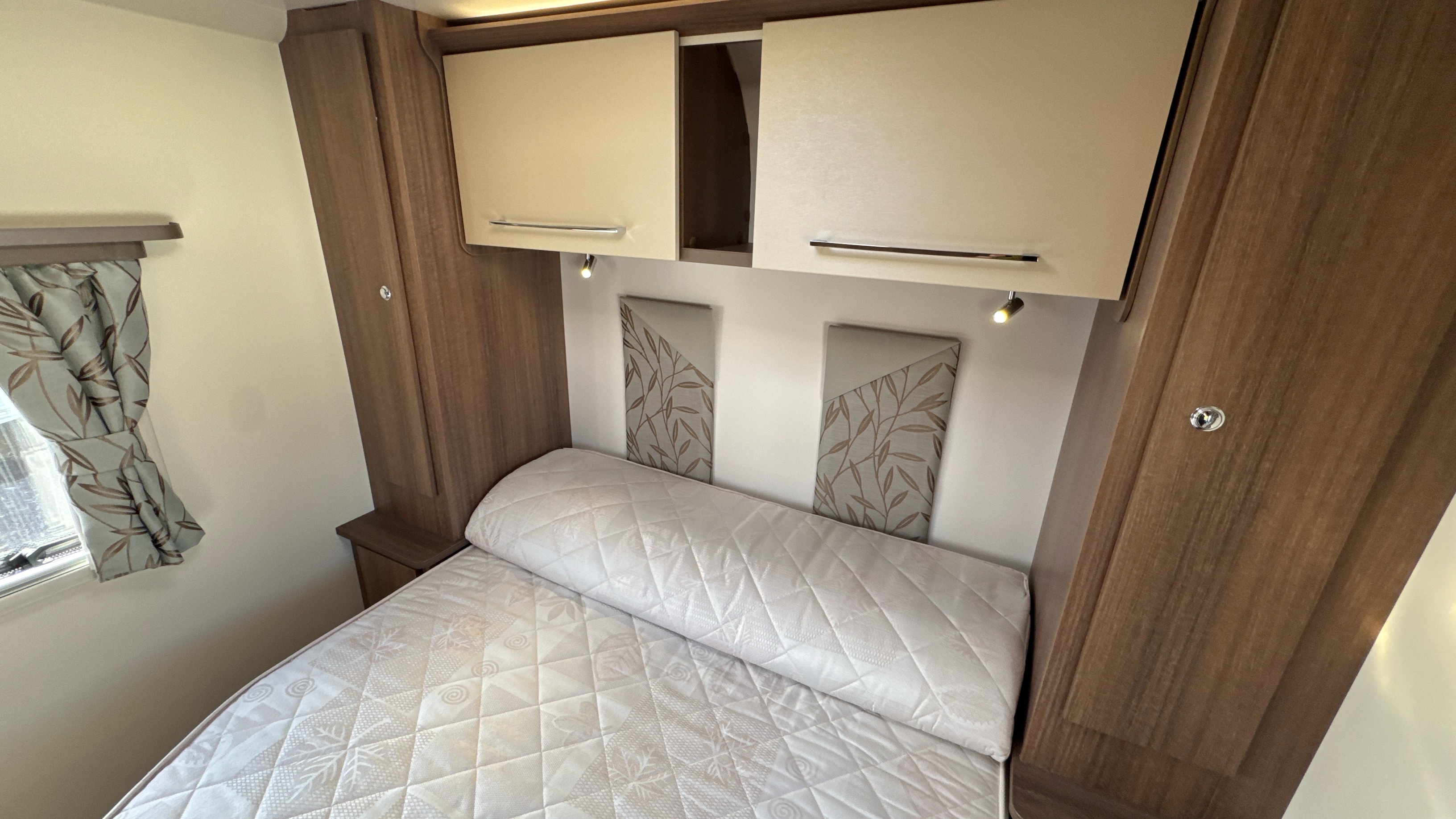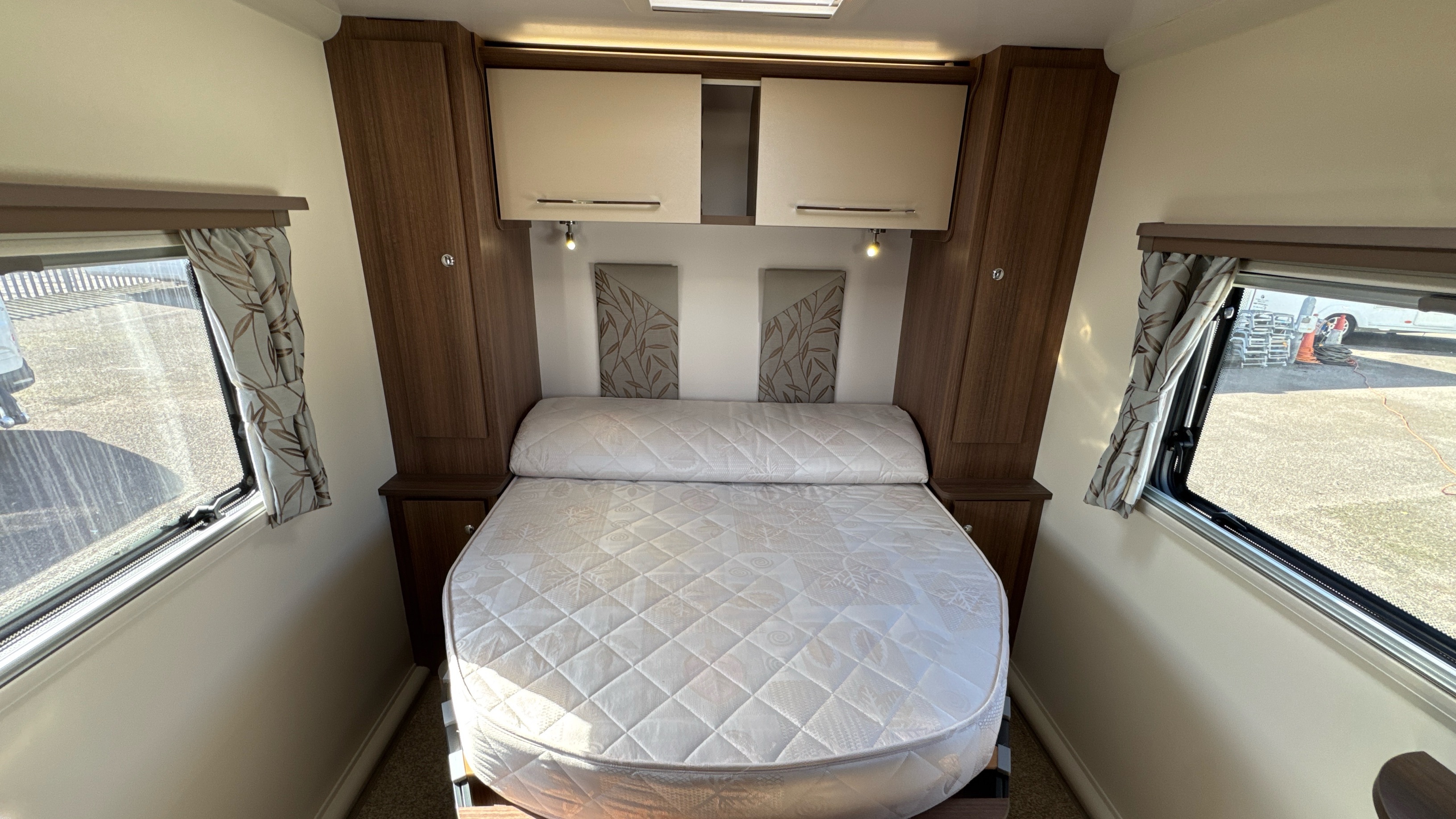 Layout consists of a dedictaed walk around rear island bed with domestic style mattress, acres of underbed storage, his 'n' hers wardrobe plus ample overhead overhead locker storage.