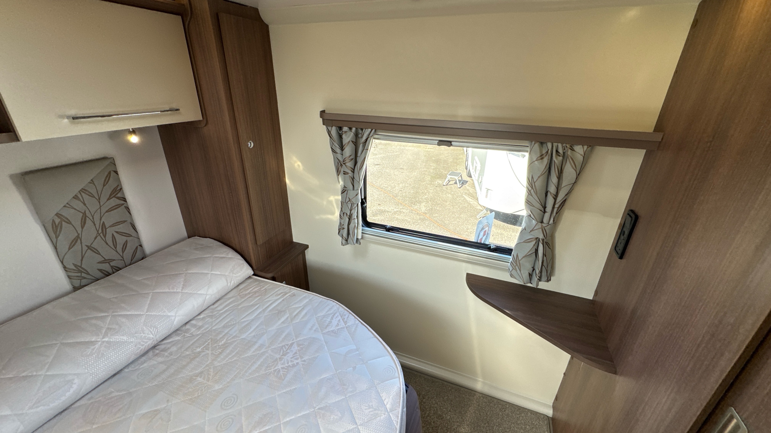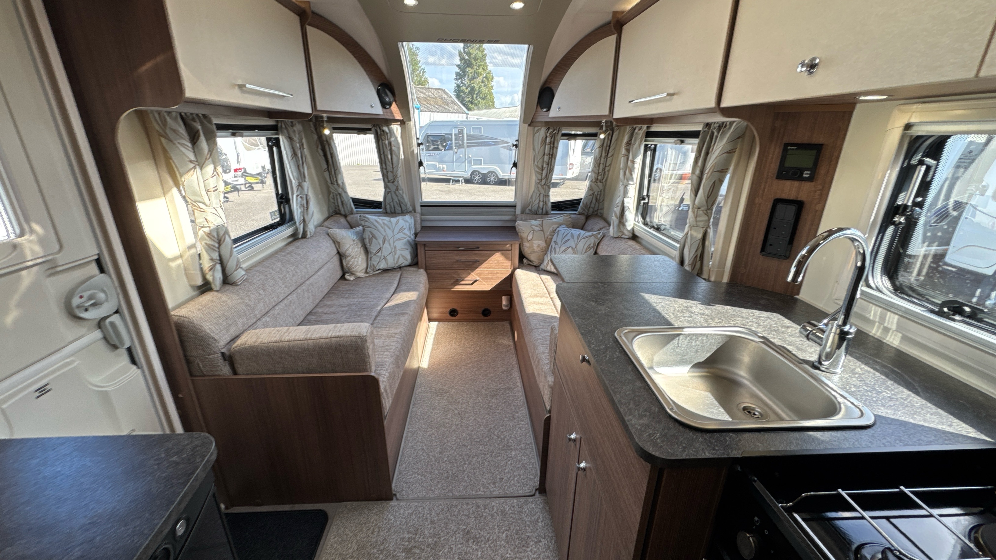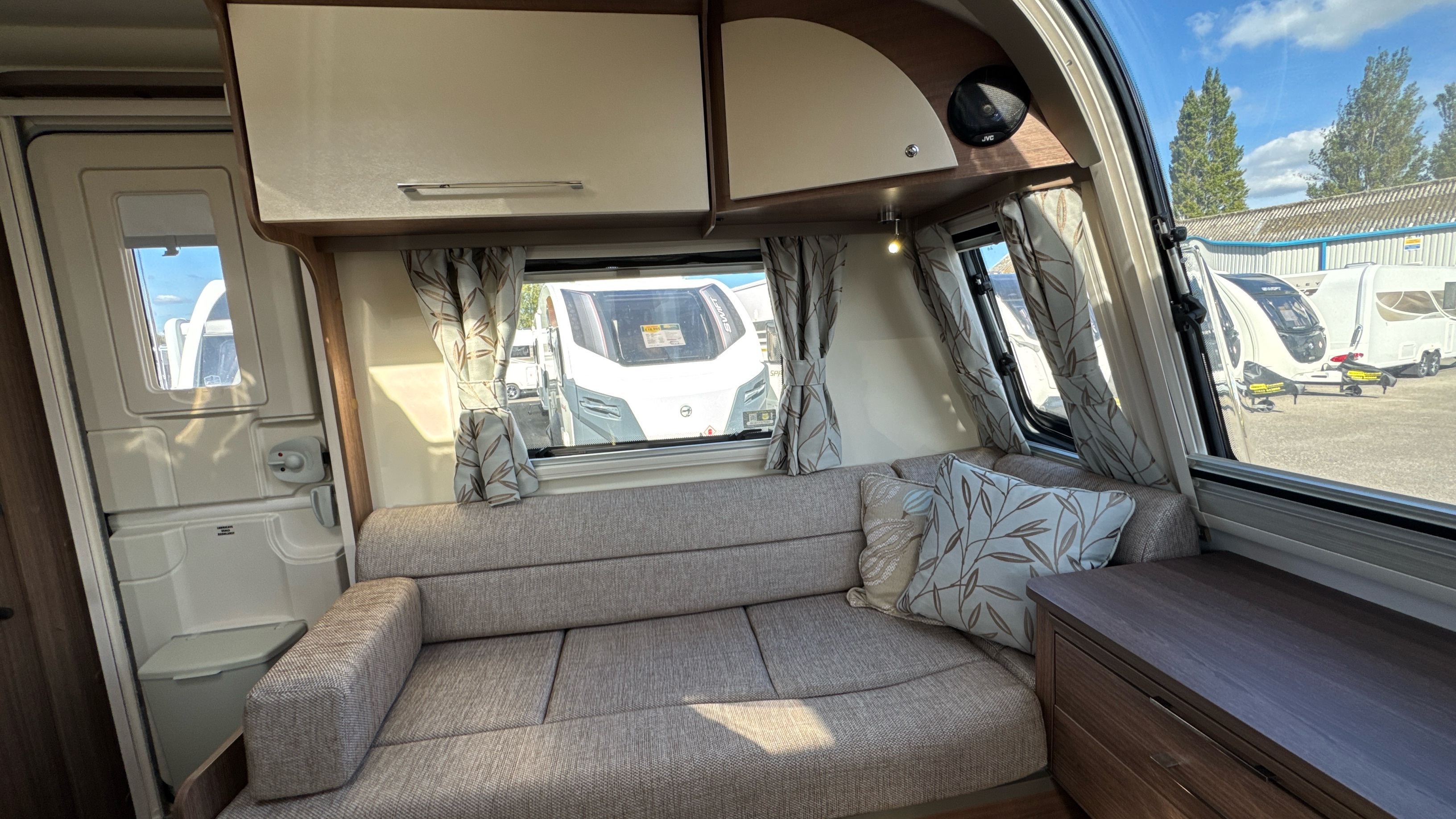 Layout consists of a dedictaed walk around rear island bed with domestic style mattress, acres of underbed storage, his 'n' hers wardrobe plus ample overhead overhead locker storage.