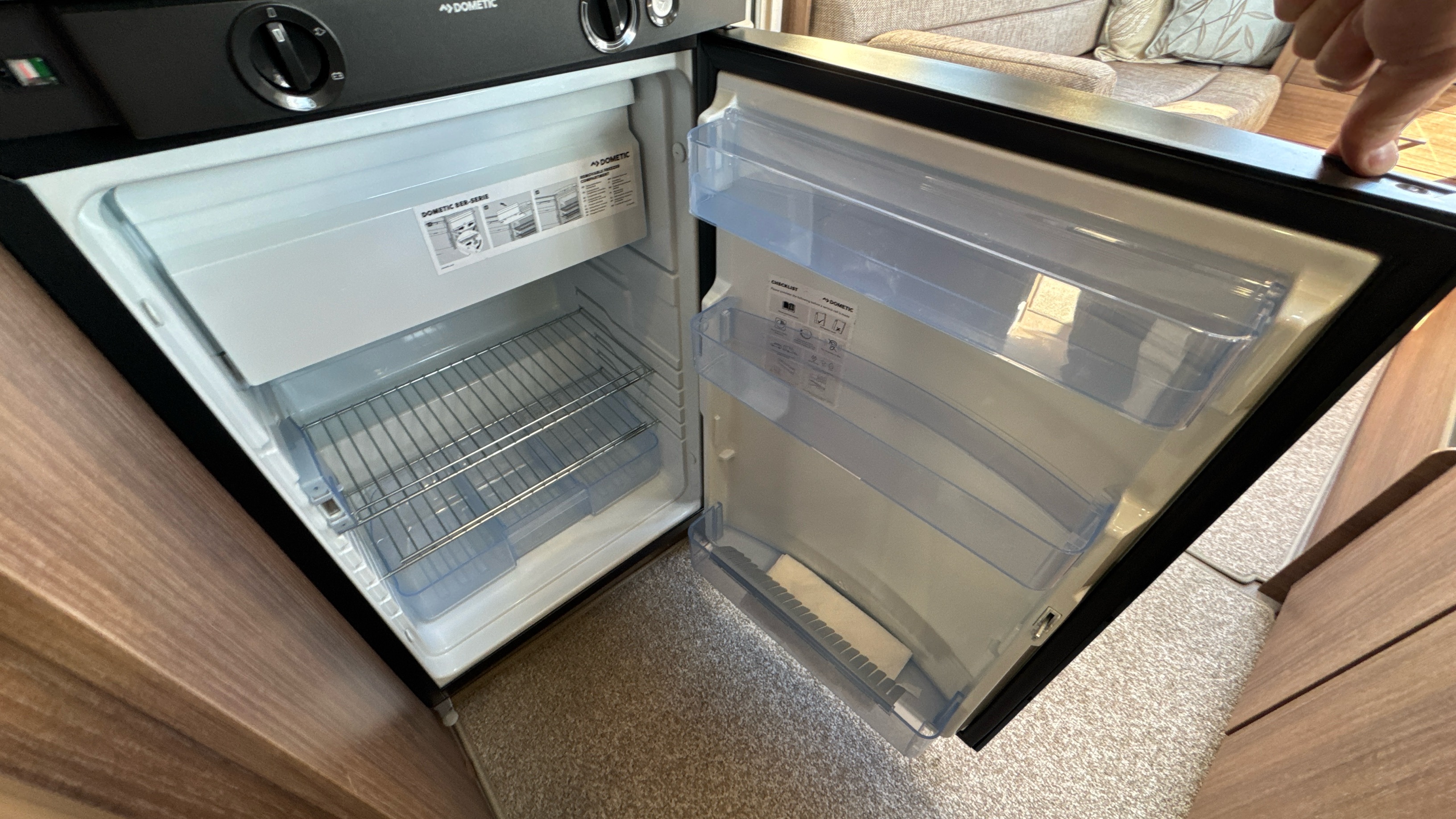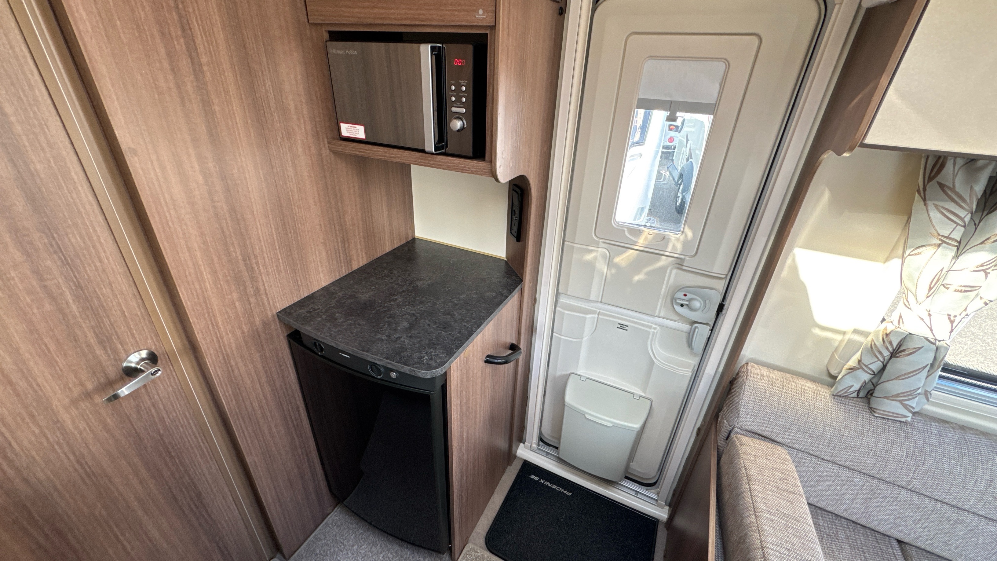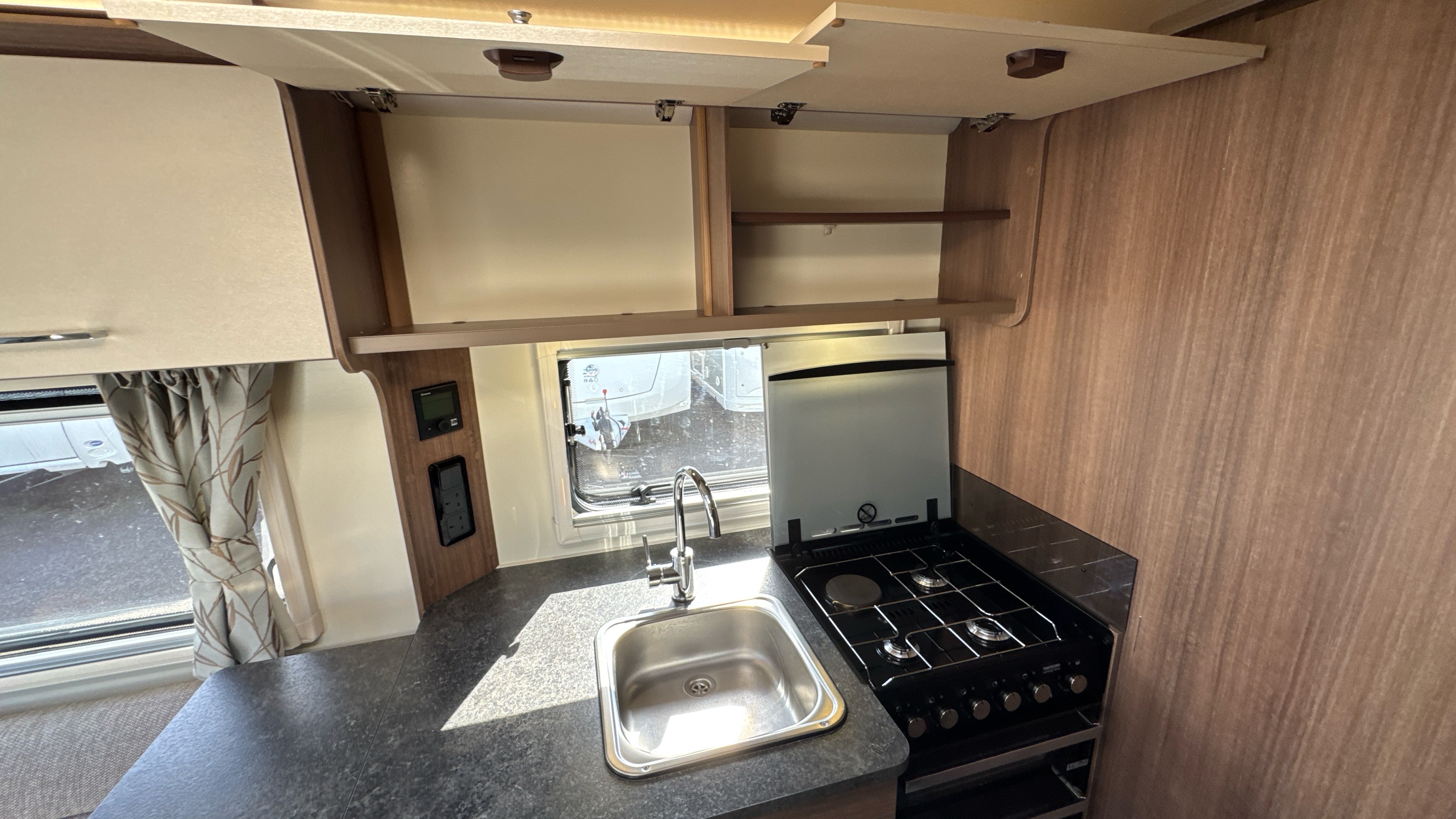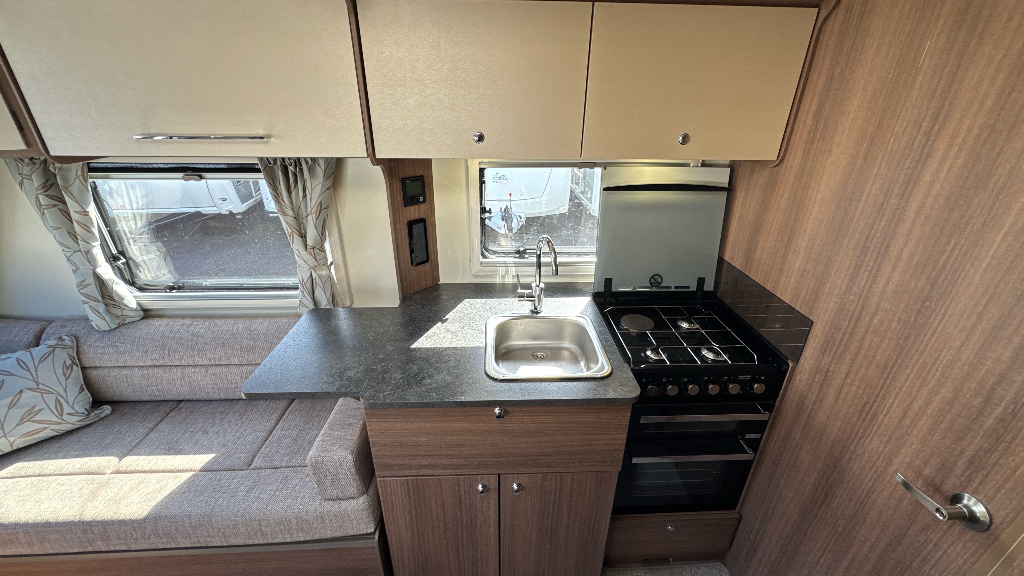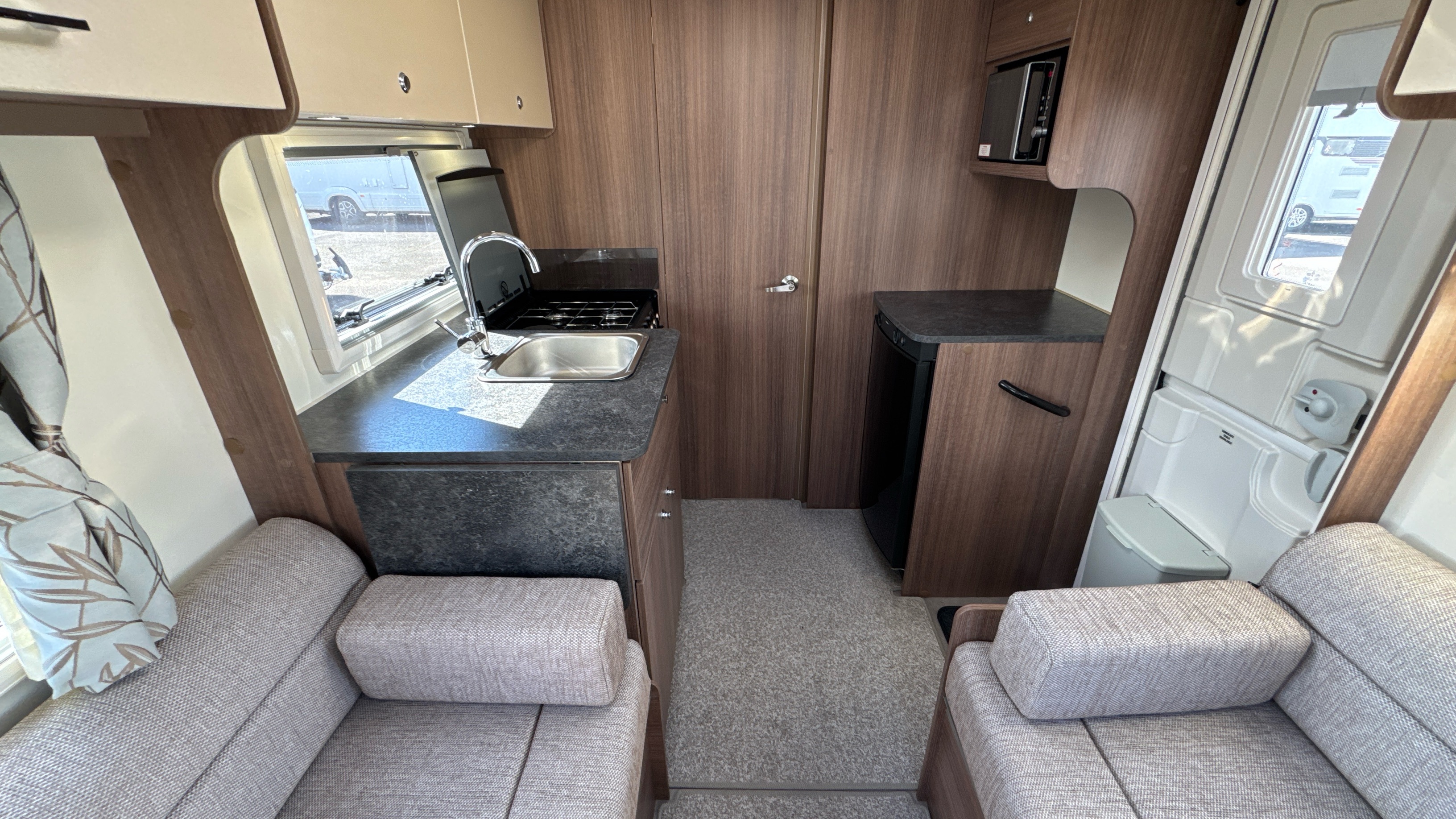 Well appointed centrally located kitchen complete with factory fitted microwave, thetford domestic style gas oven/grill/hob with folding glass lid, 2-way gloss black fronted fridge with integral freezer compartment and a recessed circular washing up sink with moden chrome hot and cold mixer tap.