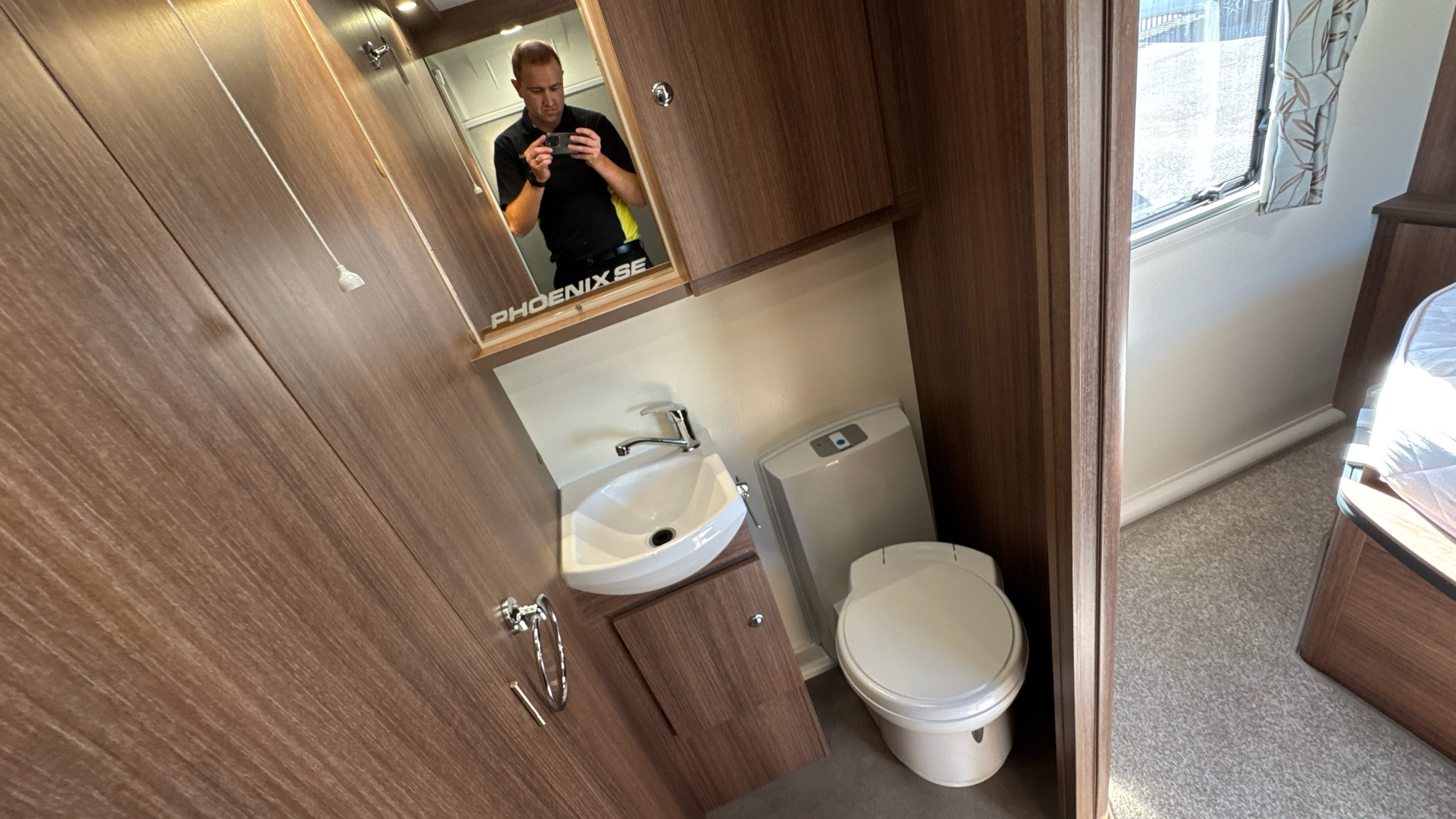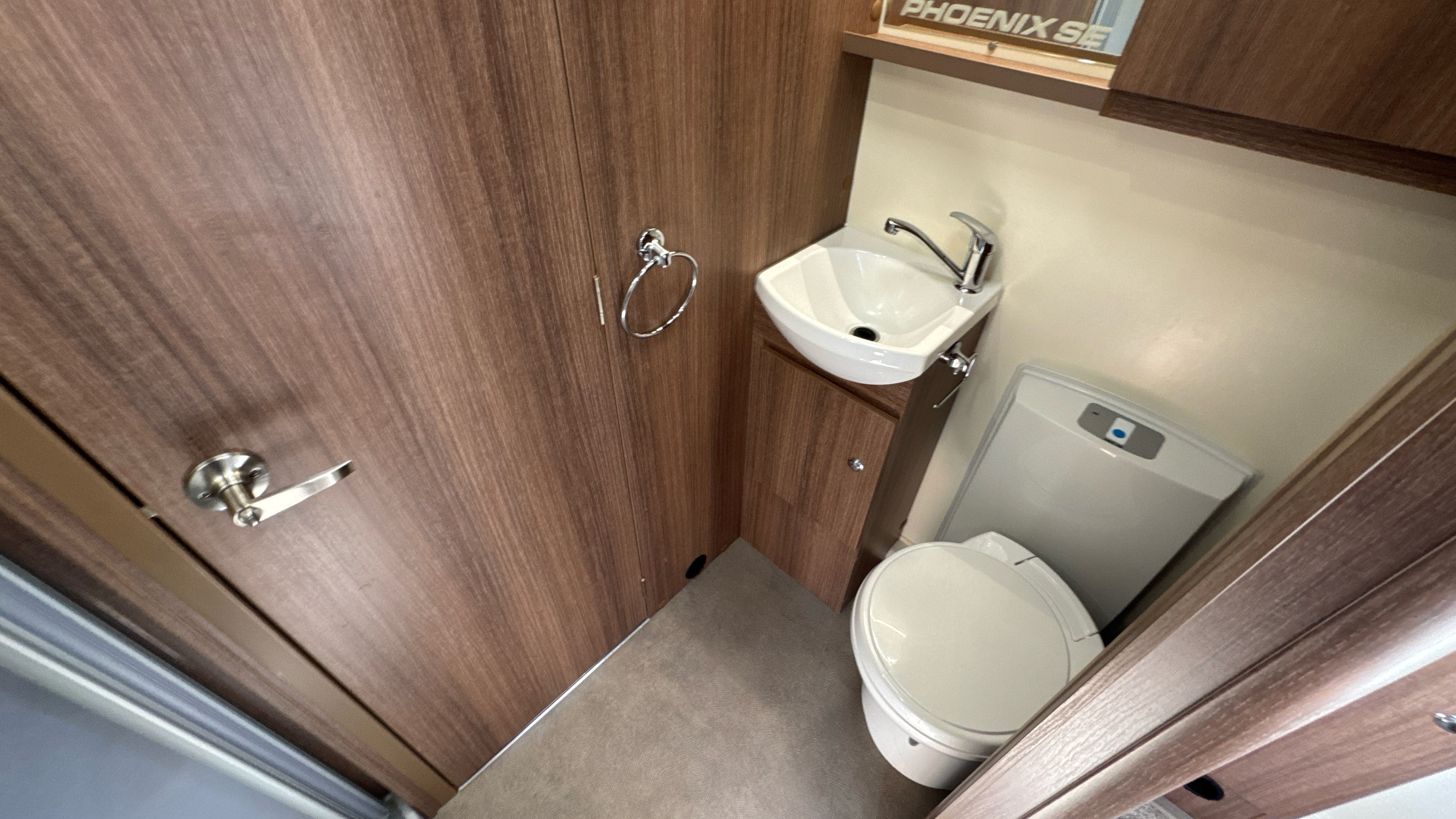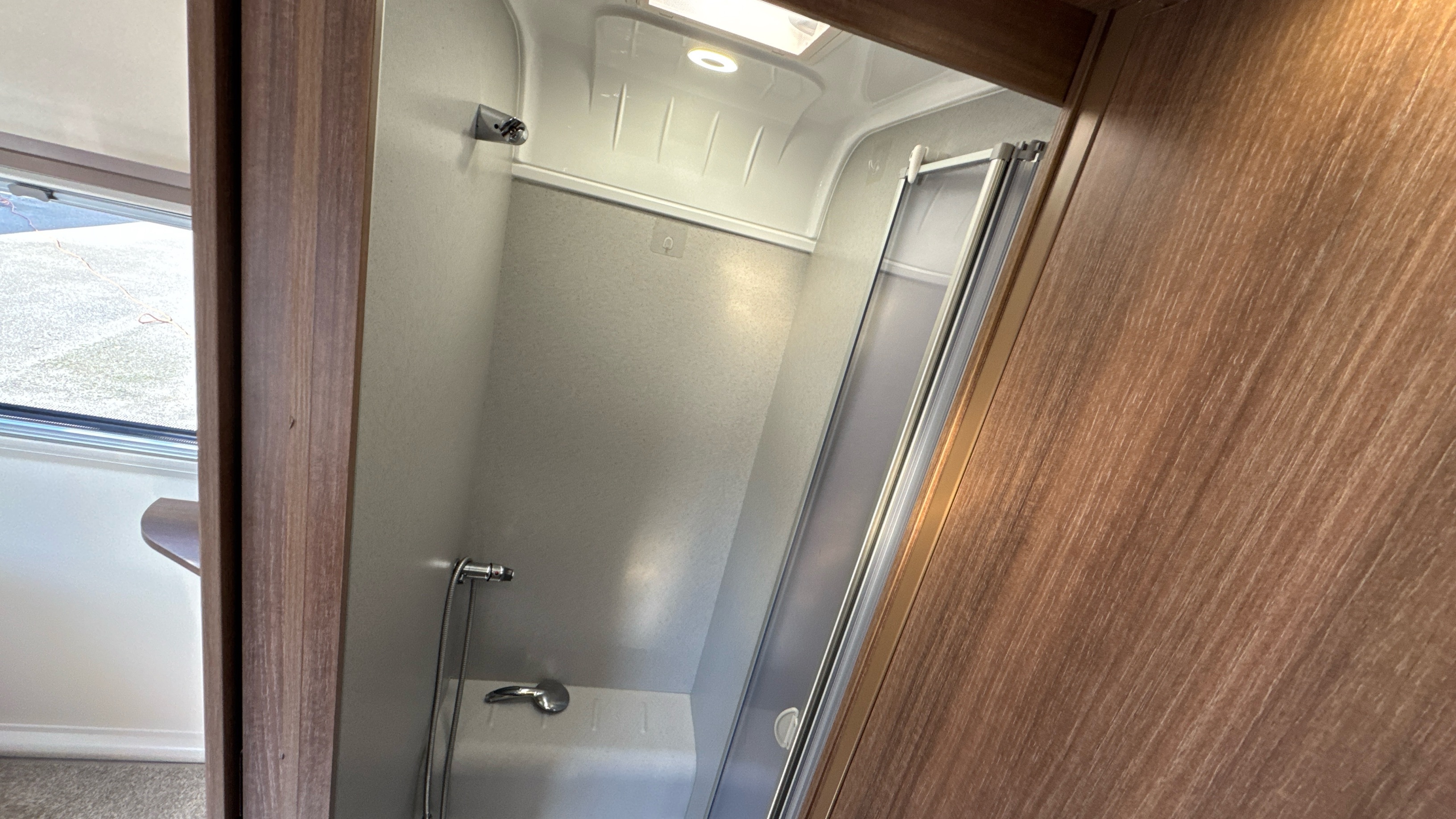 Split centre washroom with full size walk in shower cubicle on the on-side and a thetford swivel cassette toilet with electric flush operation and vanity unit with hot and cold mixer tap on the other.