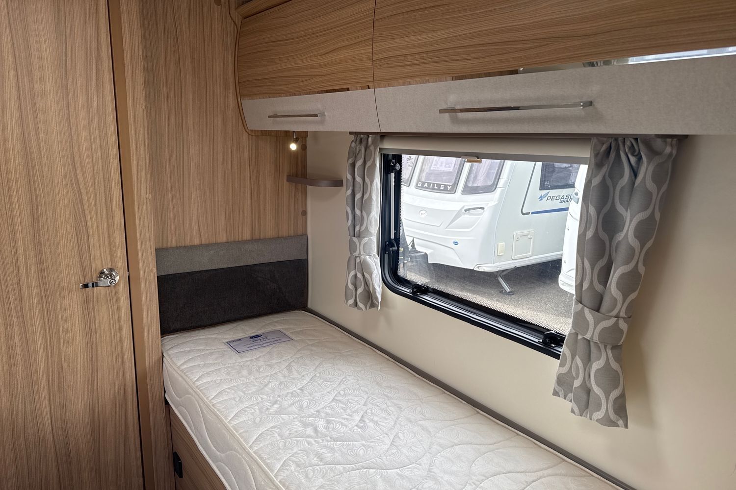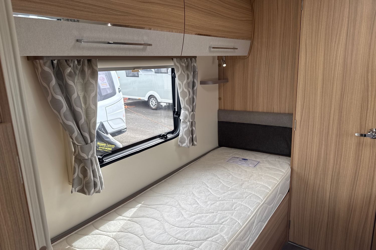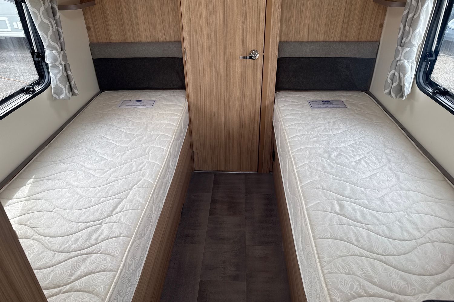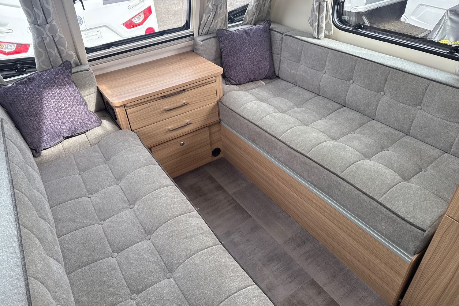 New arrival as a part exchange - first registered on the 26th April 2024 with only the one registered owner from new with a good service history record. Fantastic layout which features a dedicated full width rear washroom with large walk in shower, thetford cassette toilet and sink and vanity unit, dedicated fixed single beds with acres of storage space underneath each plus a plethora of overhead storage lockers.