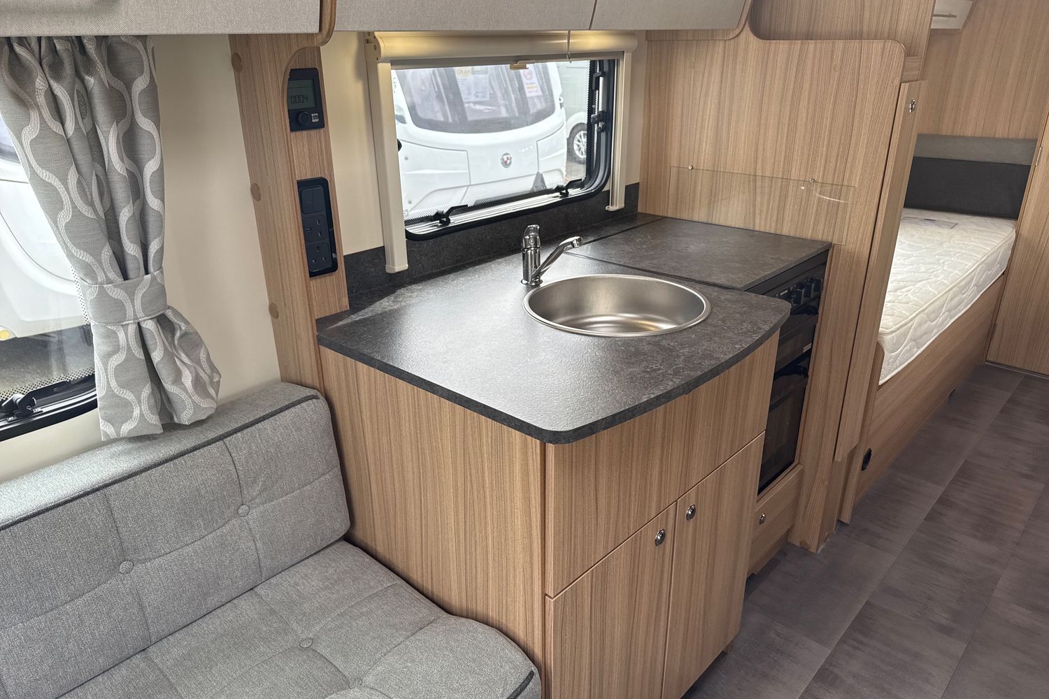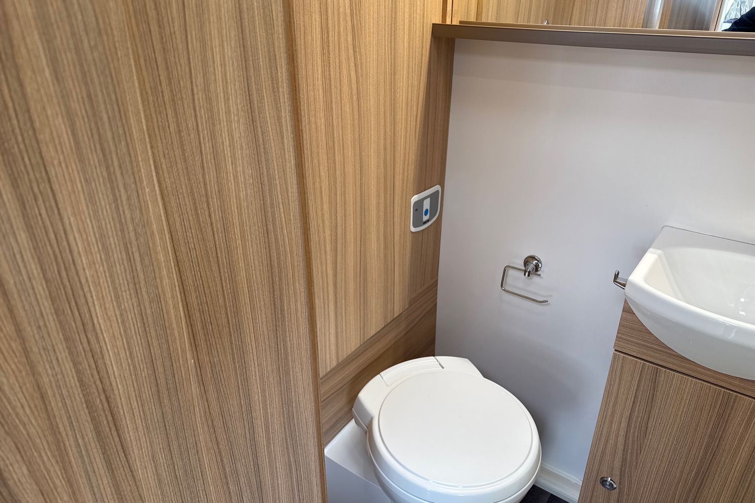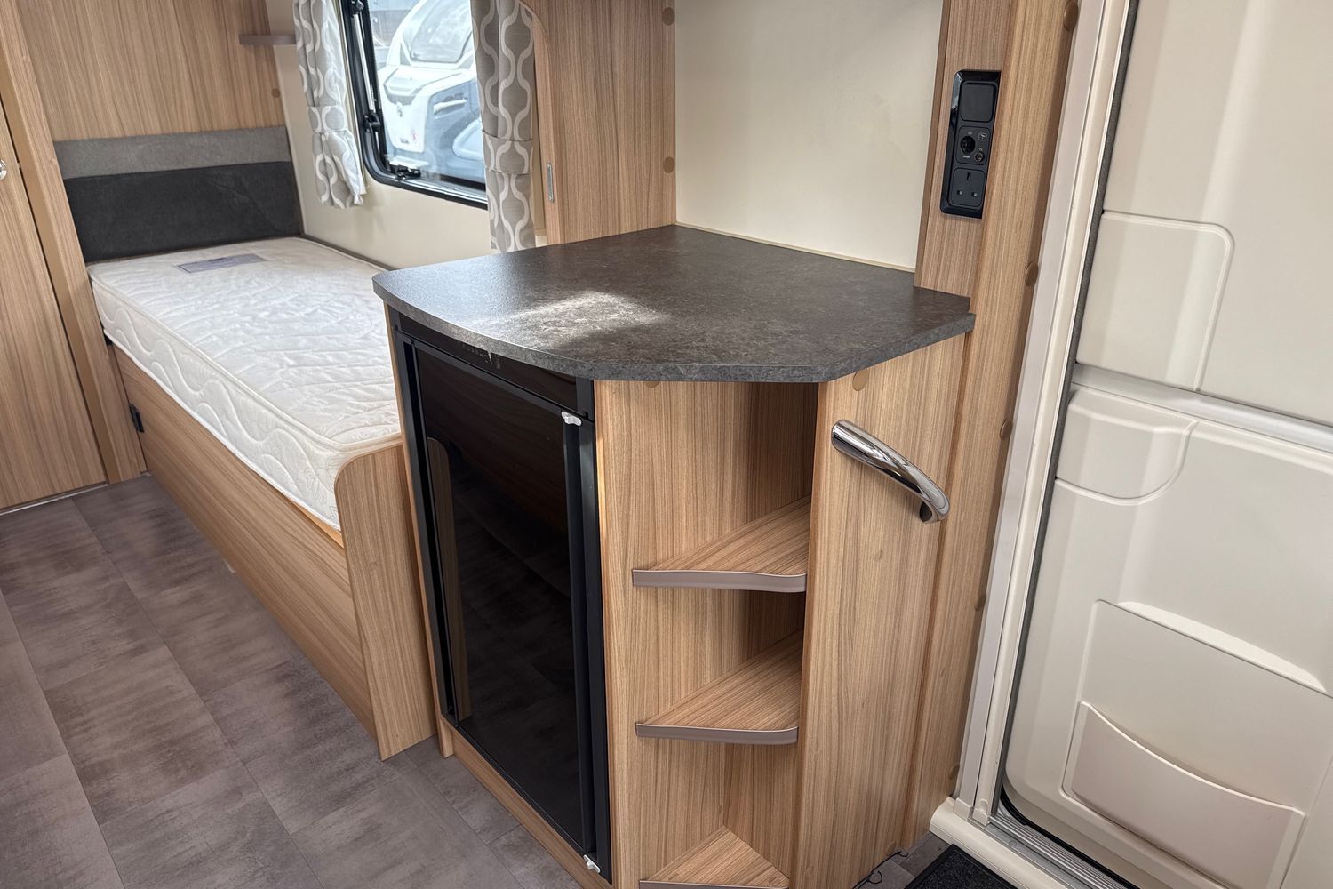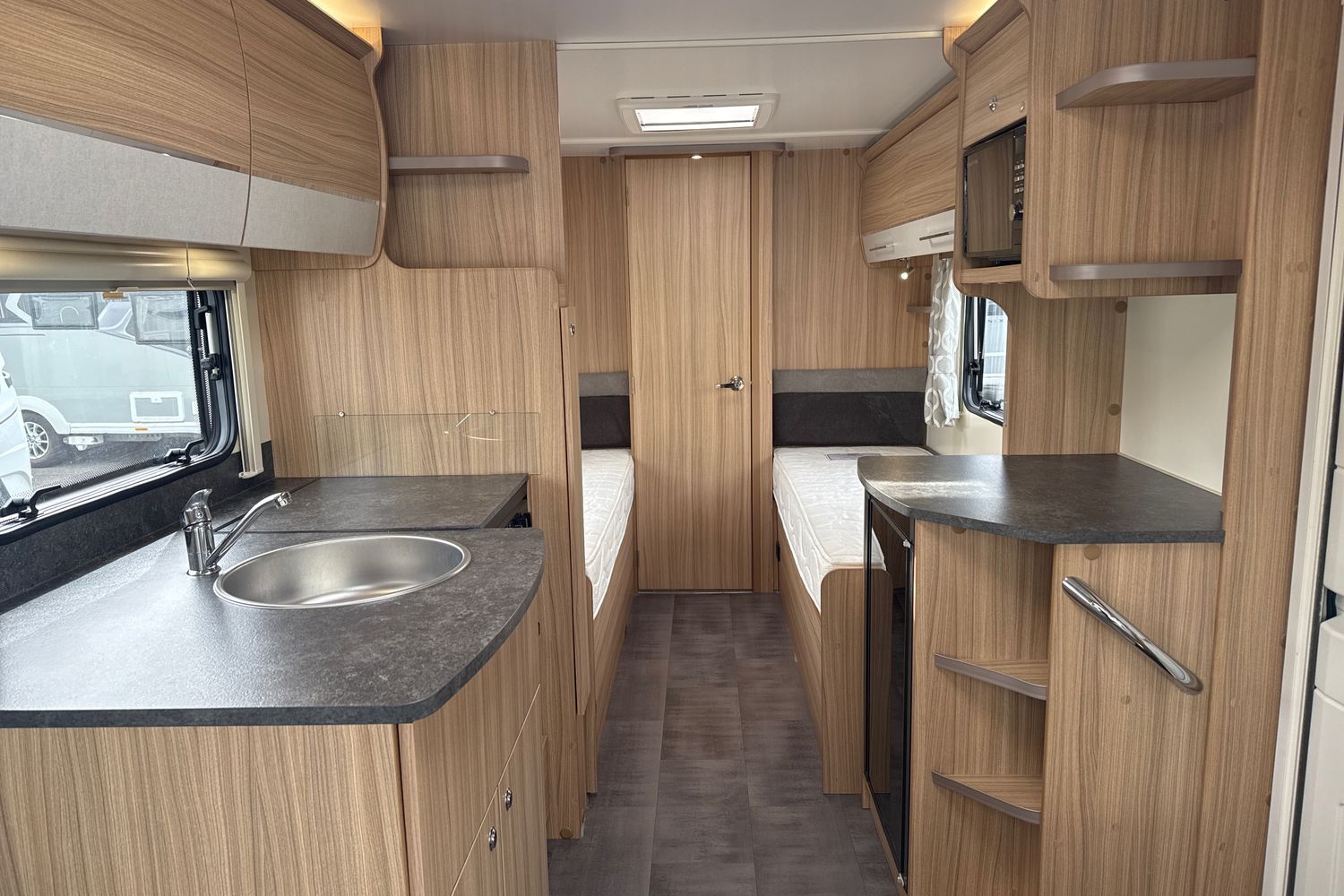 New arrival as a part exchange - first registered on the 26th April 2024 with only the one registered owner from new with a good service history record. Fantastic layout which features a dedicated full width rear washroom with large walk in shower, thetford cassette toilet and sink and vanity unit, dedicated fixed single beds with acres of storage space underneath each plus a plethora of overhead storage lockers.