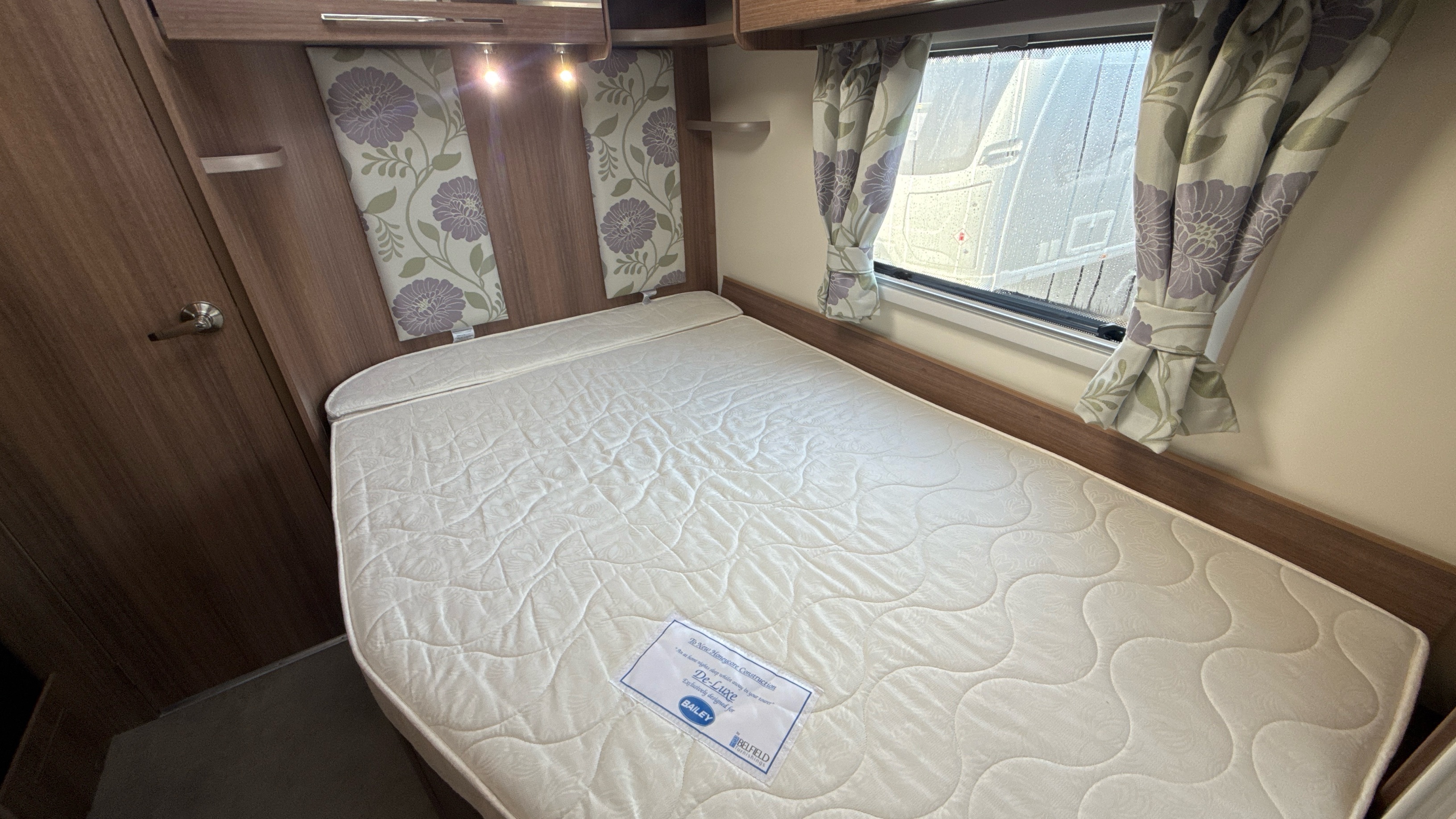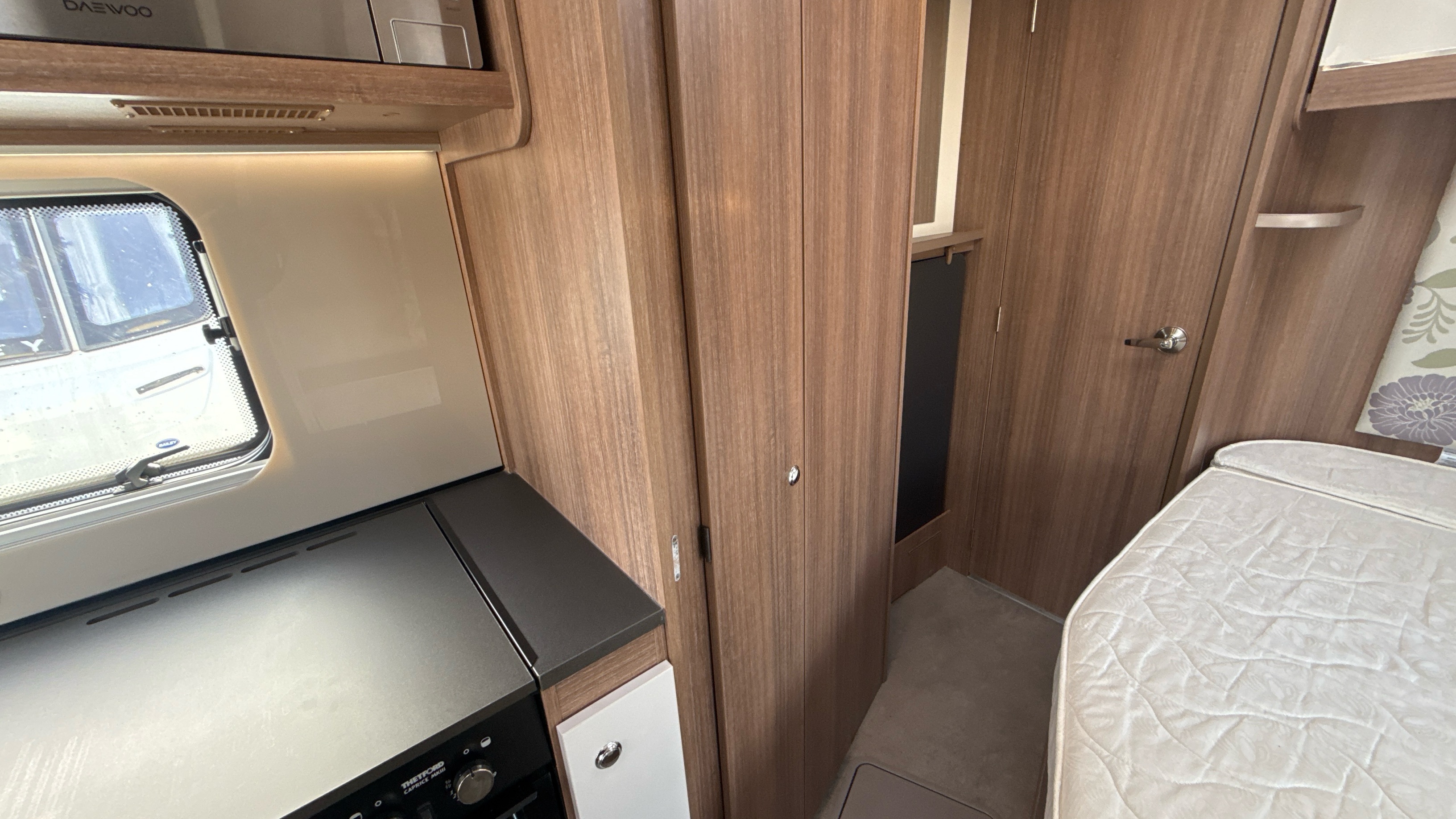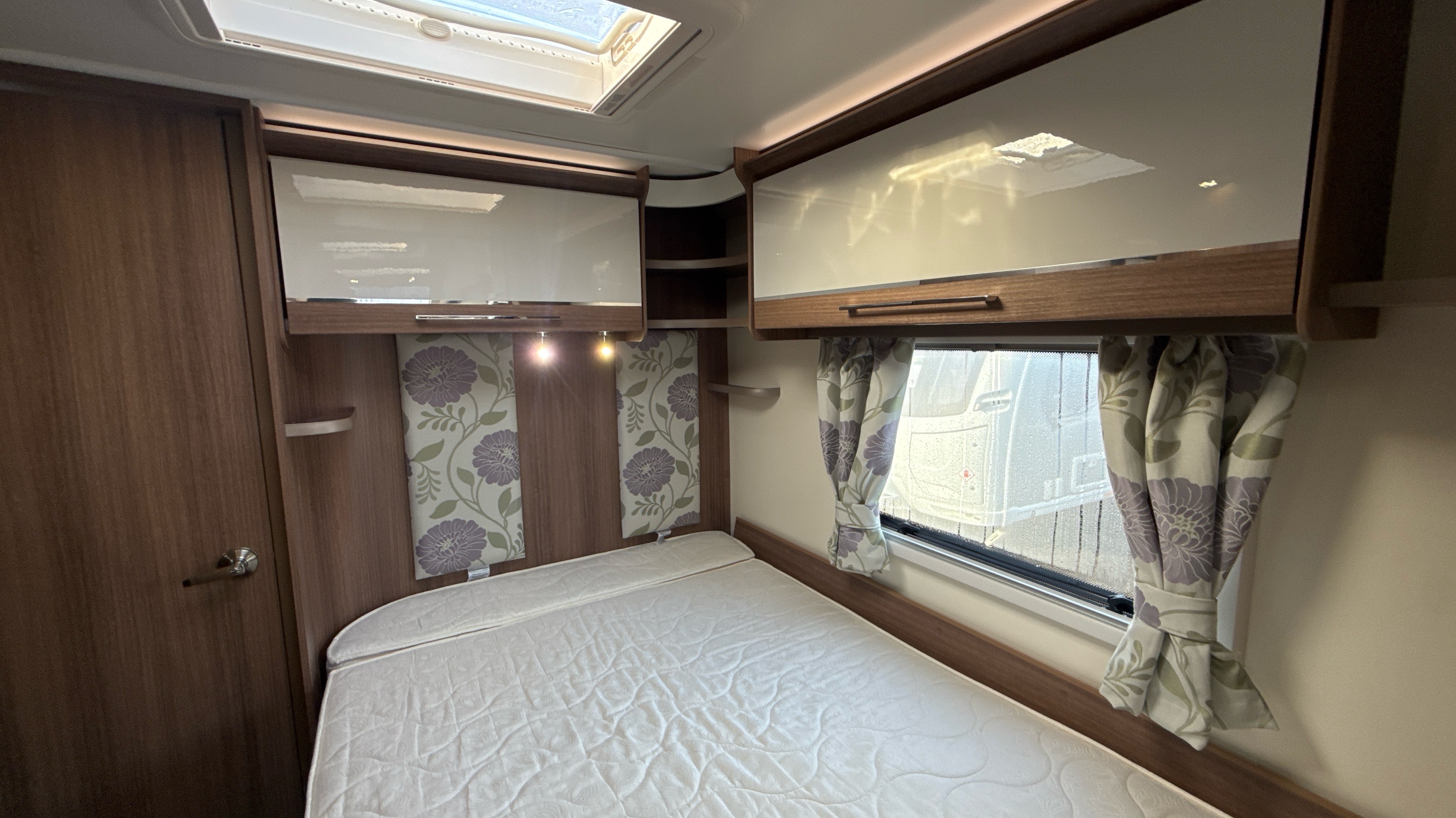 Fixed centre "side french bed" with domestic style mattress which will offer a generous nights rest, acres of underbed storage which can also be accessed via an external locker door plus aplethora of overhead locker stroage space. Large double wardrobe with hanging rails located opposite the bed.