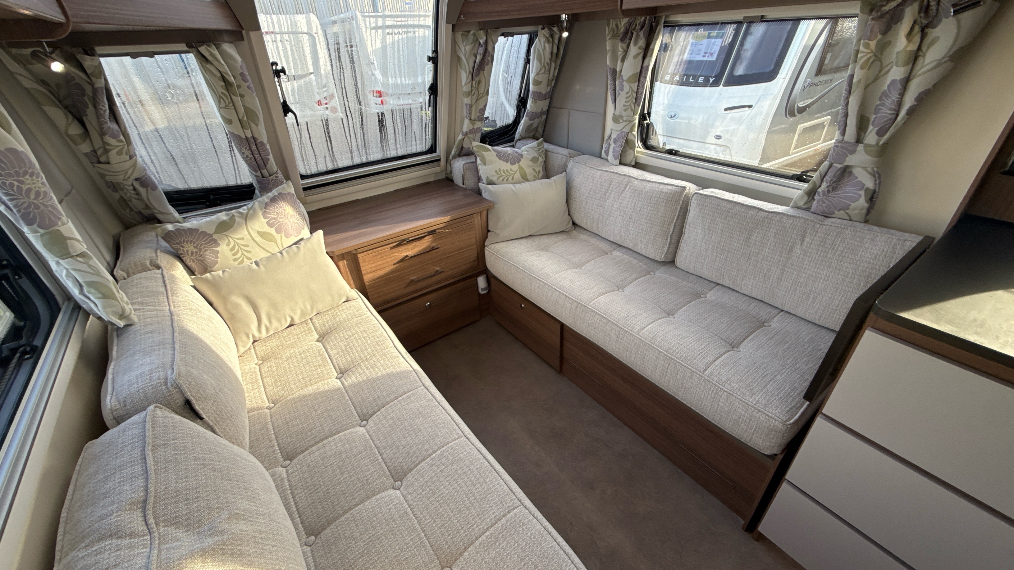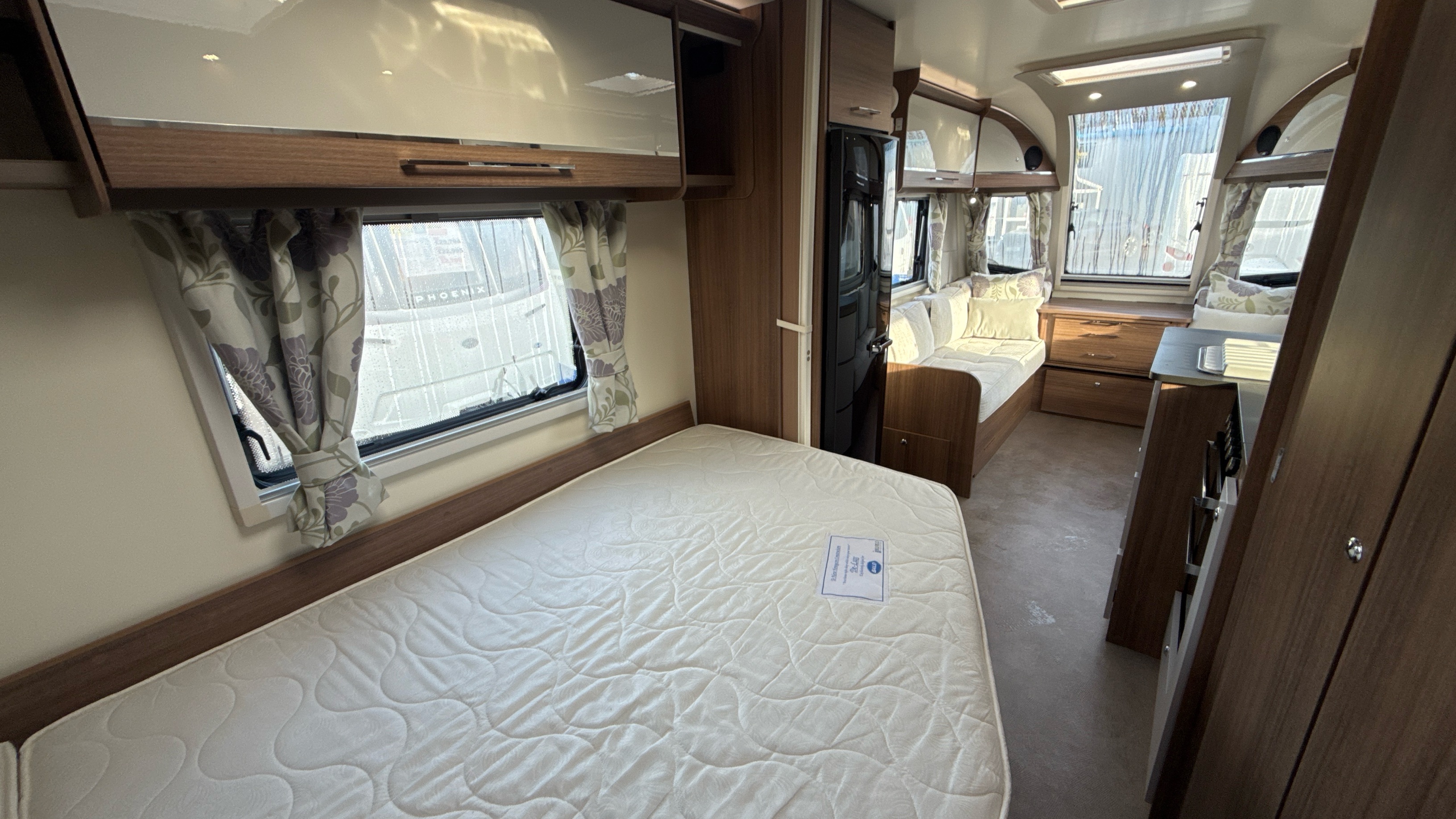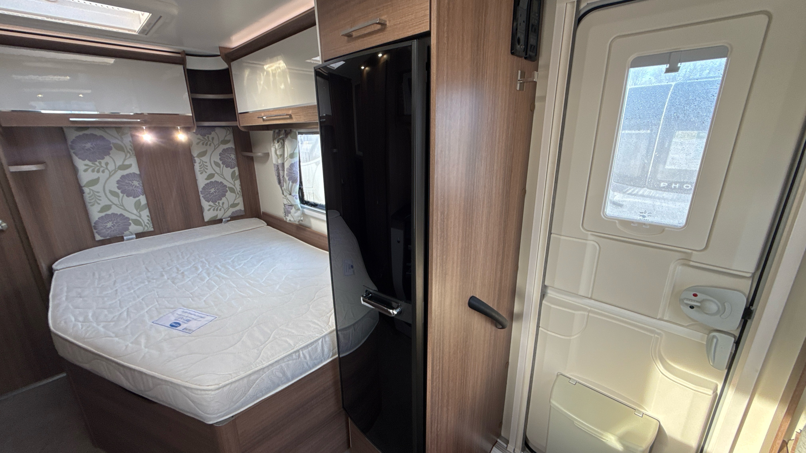 Fixed centre "side french bed" with domestic style mattress which will offer a generous nights rest, acres of underbed storage which can also be accessed via an external locker door plus aplethora of overhead locker stroage space. Large double wardrobe with hanging rails located opposite the bed.