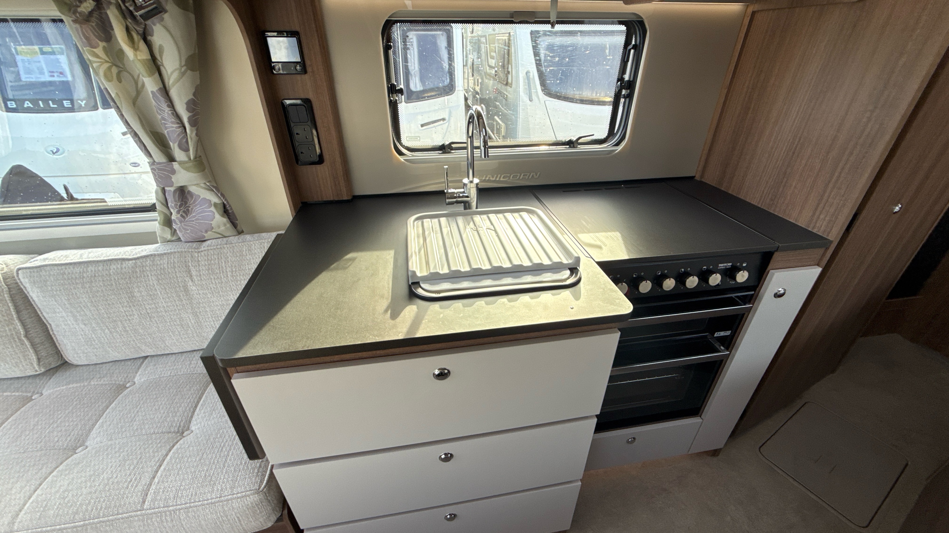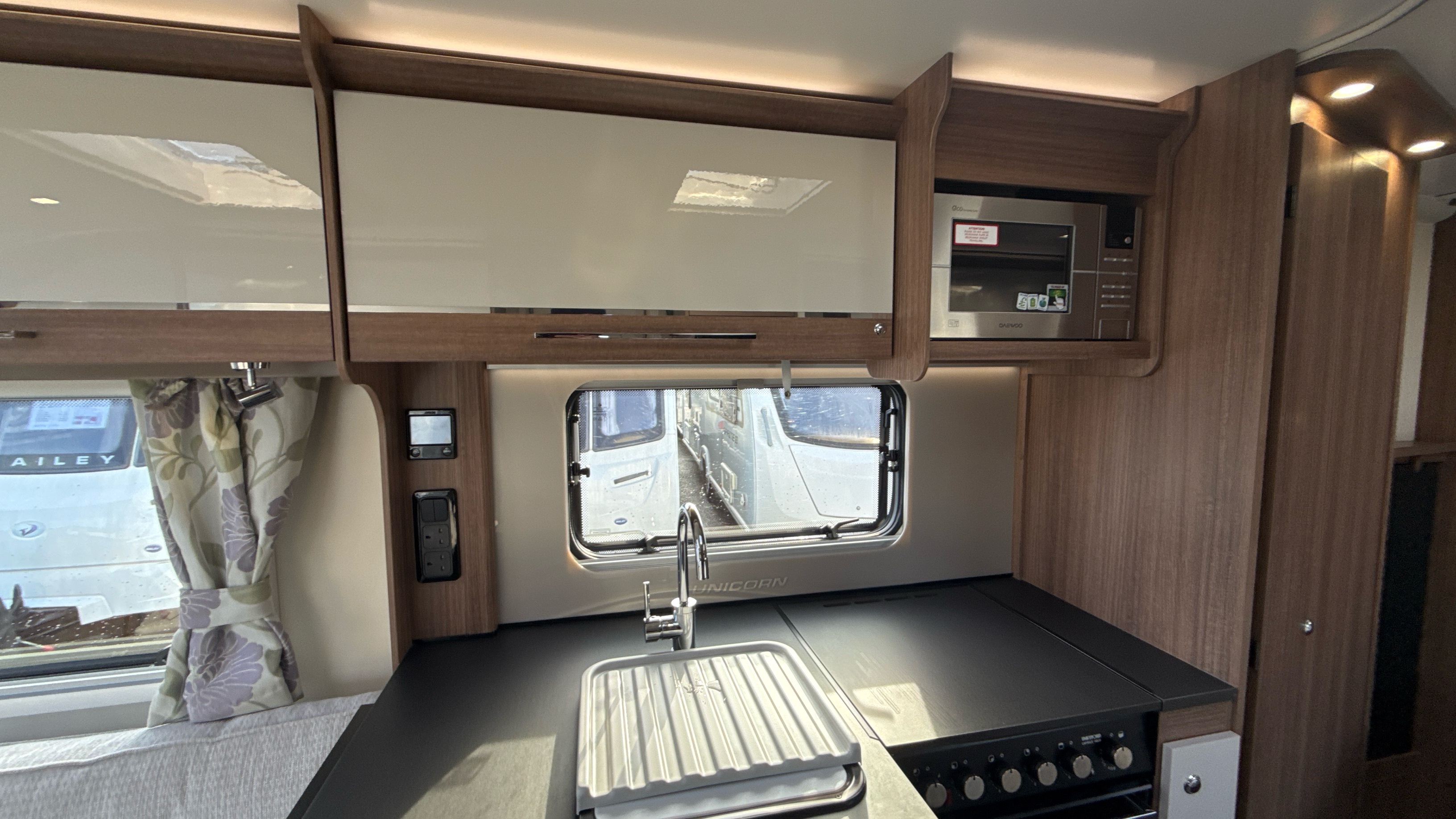 Well appointed and well proportioned centrally located kitchen complete with domestic sytle gas oven/grill/hob with additional 700w hotplate, factory fitted 800w microwave, recessed aluminium washing up sink with moden curved chrome hot and cold mixer tap and clip on plastic draining board and a gloss black fronted 3-way fridge with integral freezer compartment.