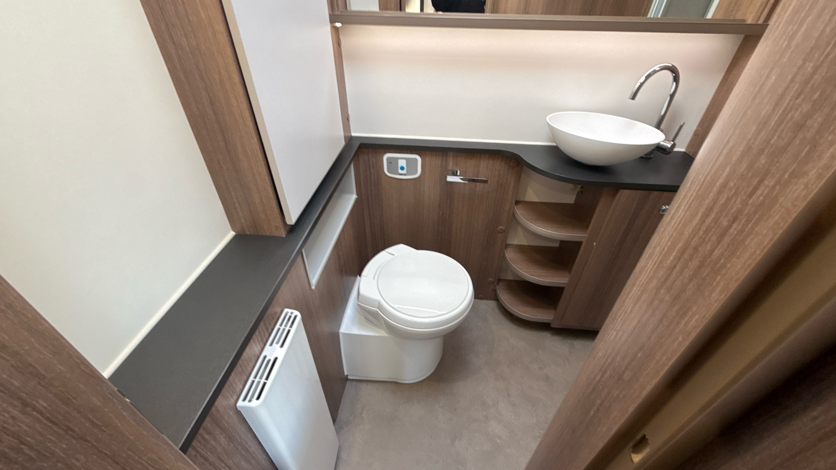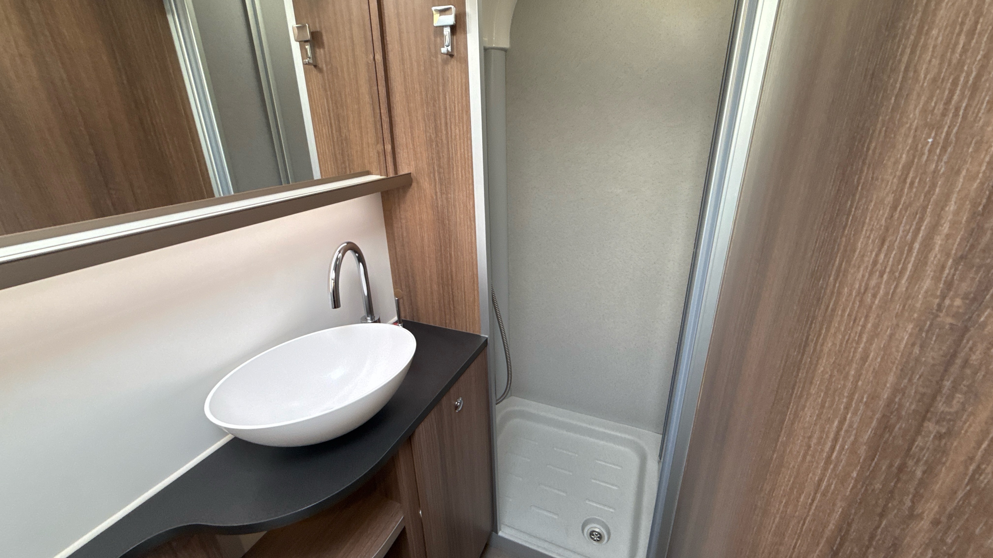 Layout consists of a dedicated full width rear washroom with a full sized walk in shower compartment with hot and cold mixer shower tap and head, sink and vanity unit with vanity mirror and thetford swivel cassette toilet with electric operated flush.