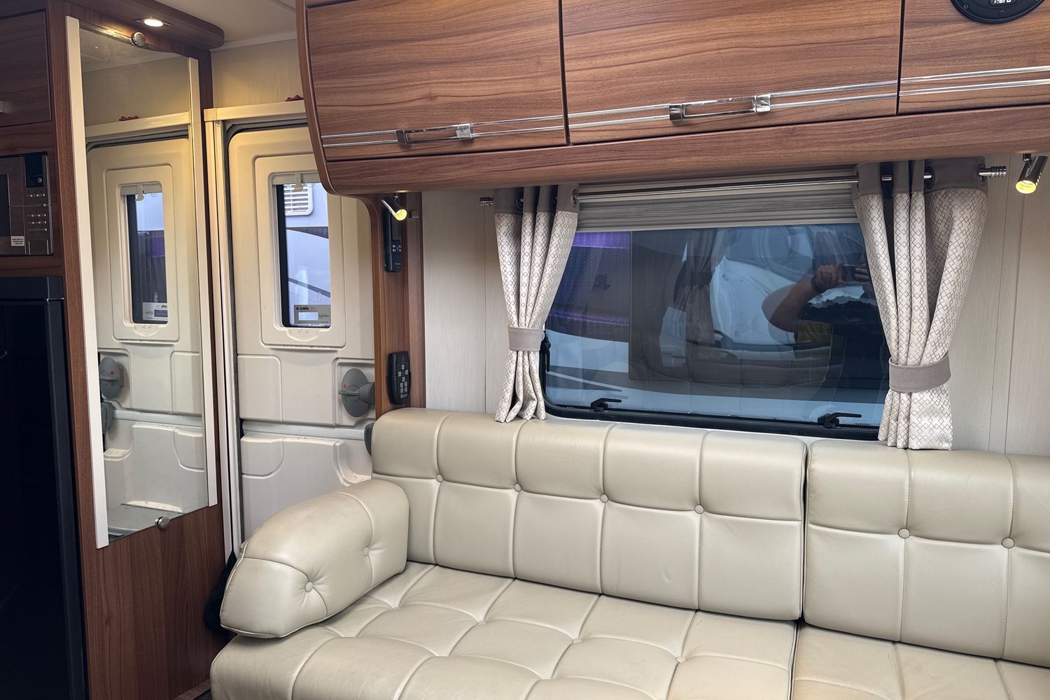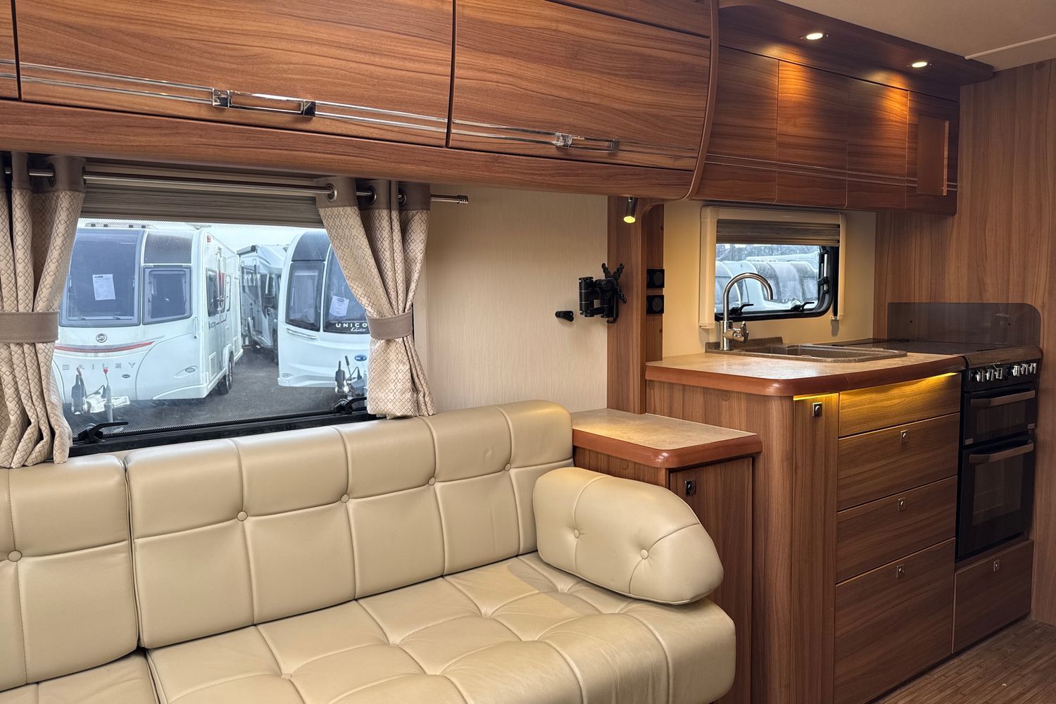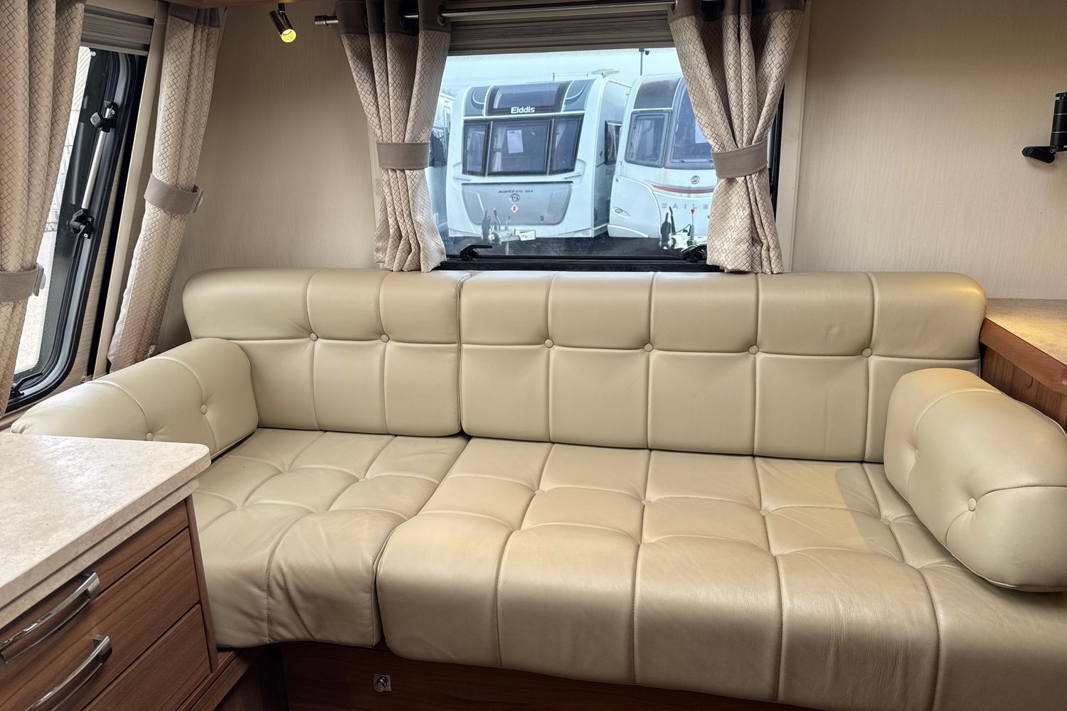 Delightful parallel front lounge arrangement finished off in upgraded cream leather upholstery - easily converts into an additional large double bed, full length 'Stargazer' opening sunroof, directional reading spotlights, ALDE luxury wet central heating, E+P self levelling system with hydraulic corner steadies.