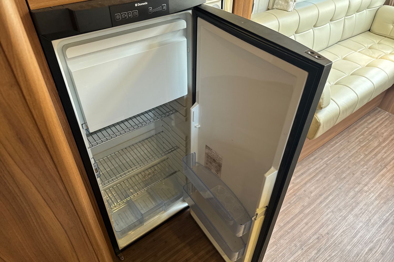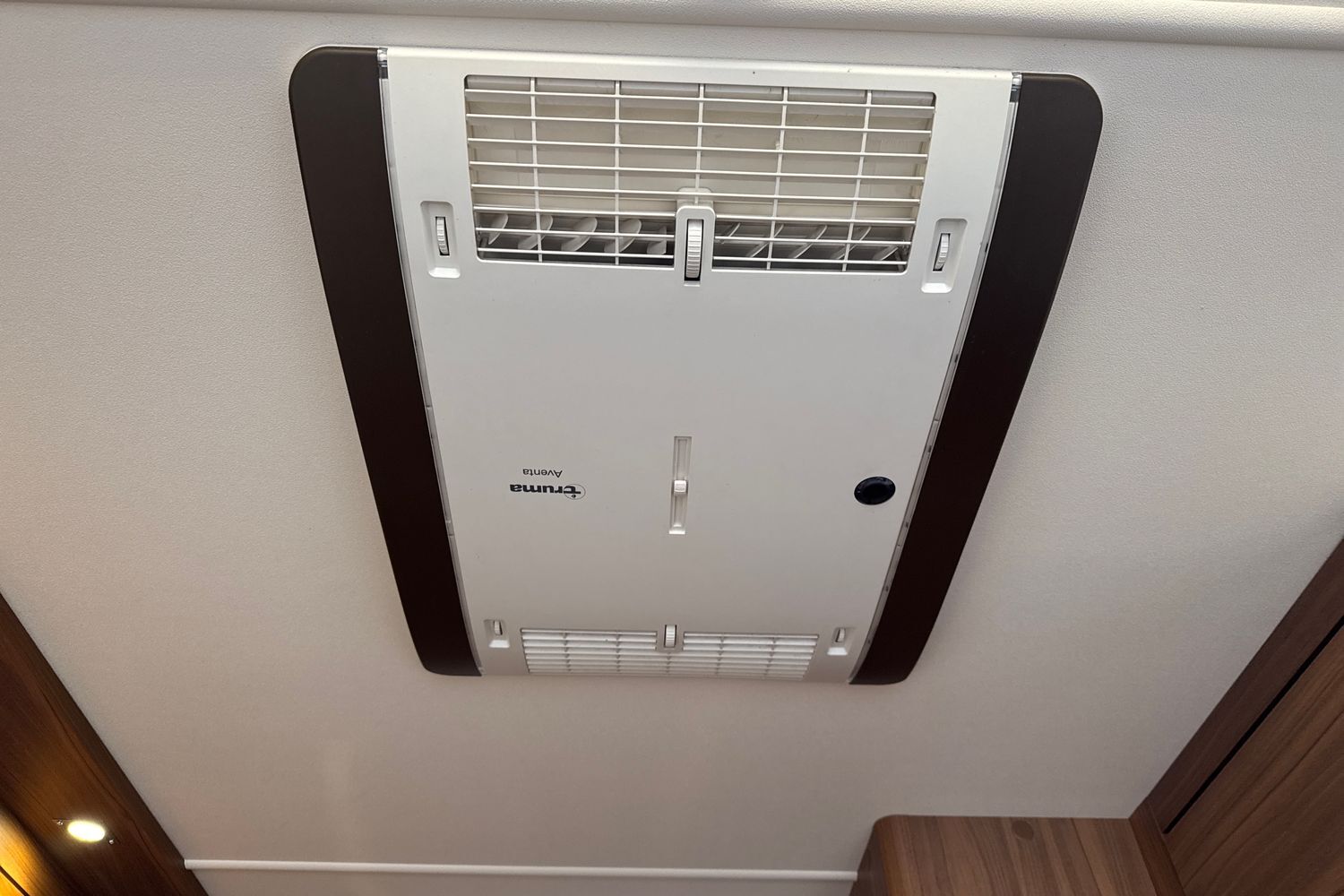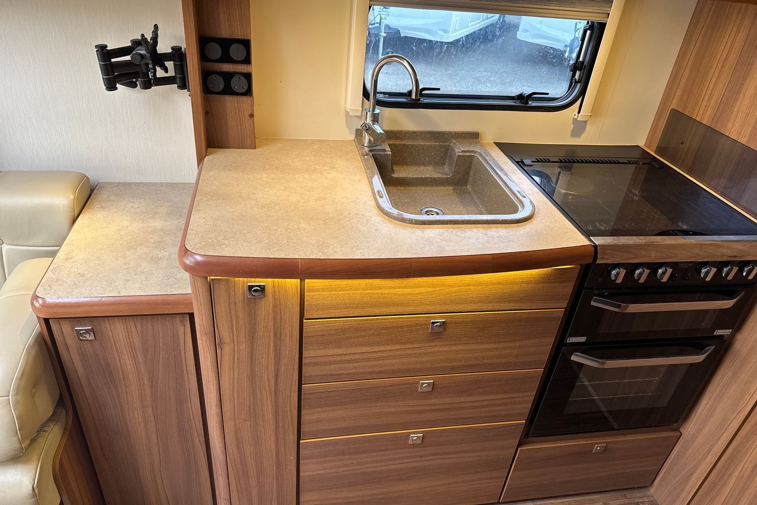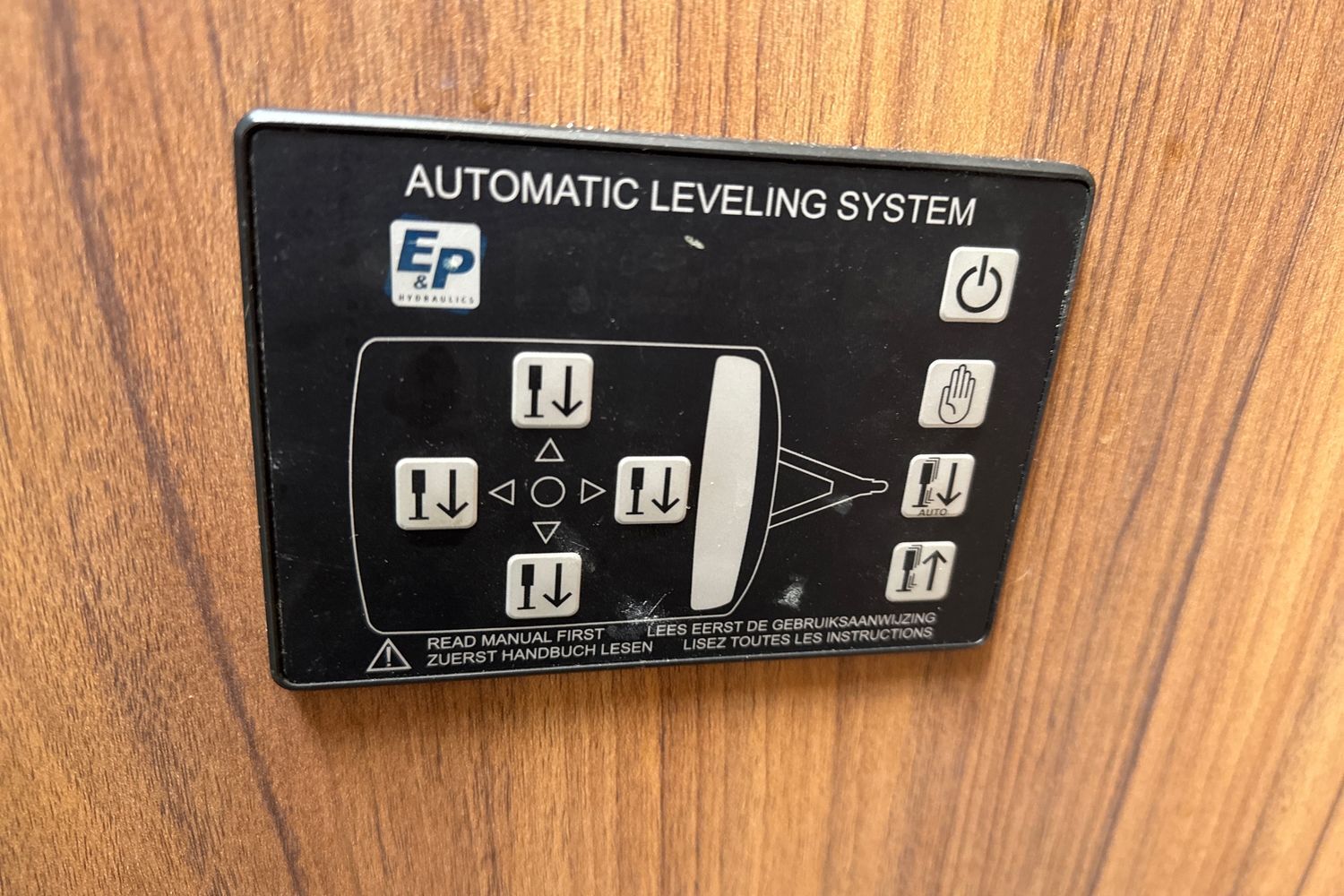 Delightful parallel front lounge arrangement finished off in upgraded cream leather upholstery - easily converts into an additional large double bed, full length 'Stargazer' opening sunroof, directional reading spotlights, ALDE luxury wet central heating, E+P self levelling system with hydraulic corner steadies.