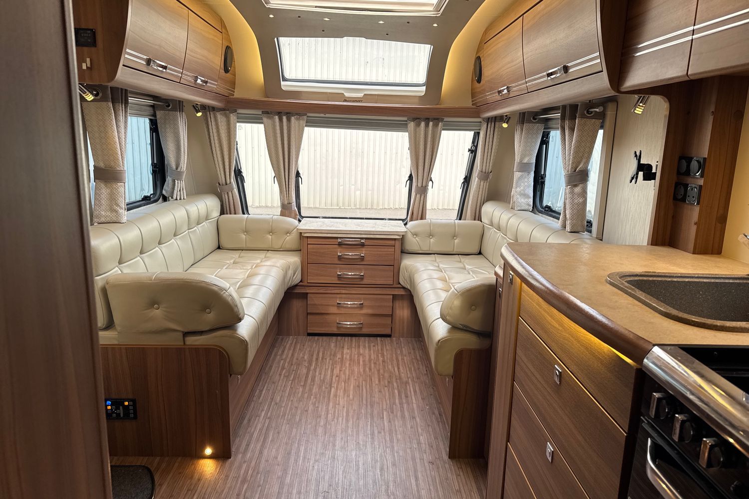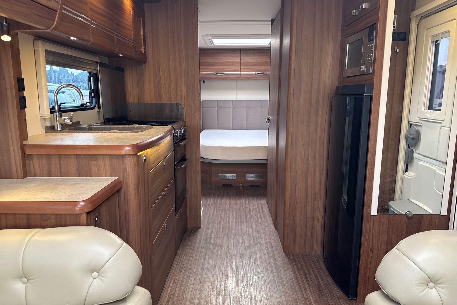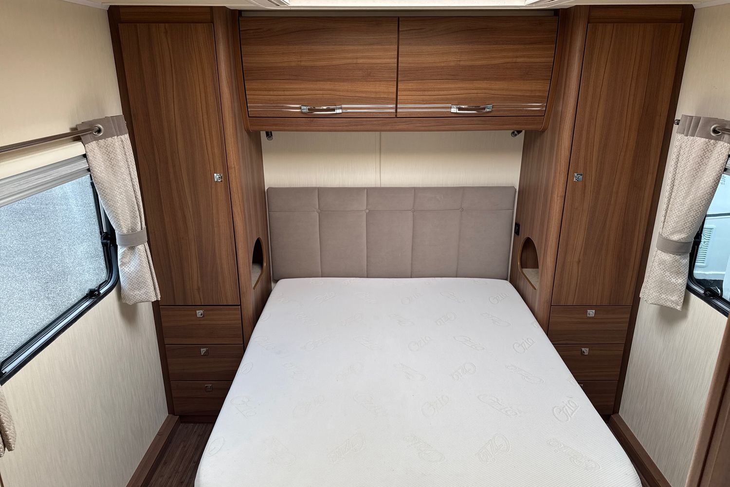 Large twin axle luxury model, 8FT wide bodyshell. Rear walk around island bed layout with domestic style mattress, acres of underbed storage, his 'n' hers wardrobes and a plethora of overhead storage lockers.