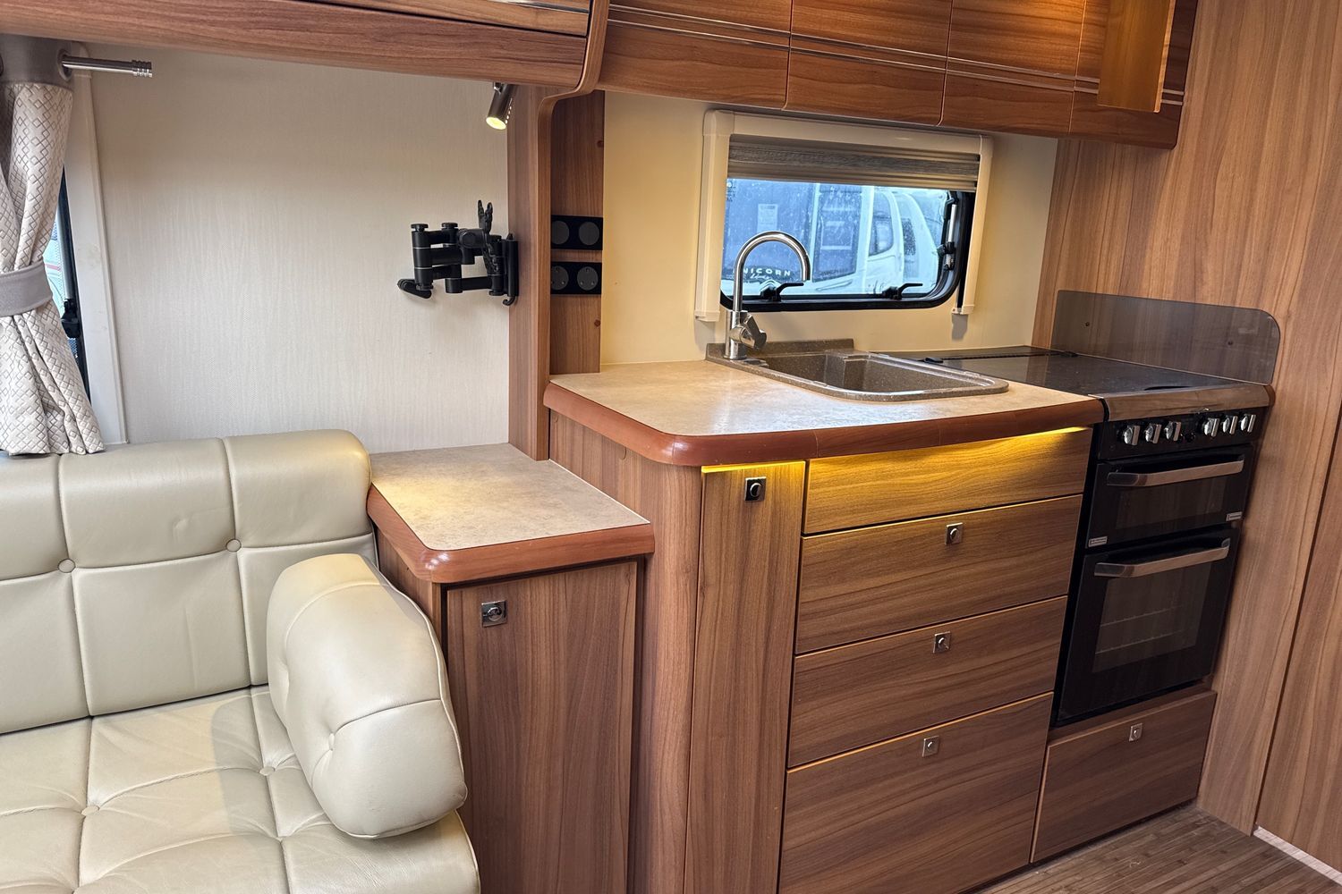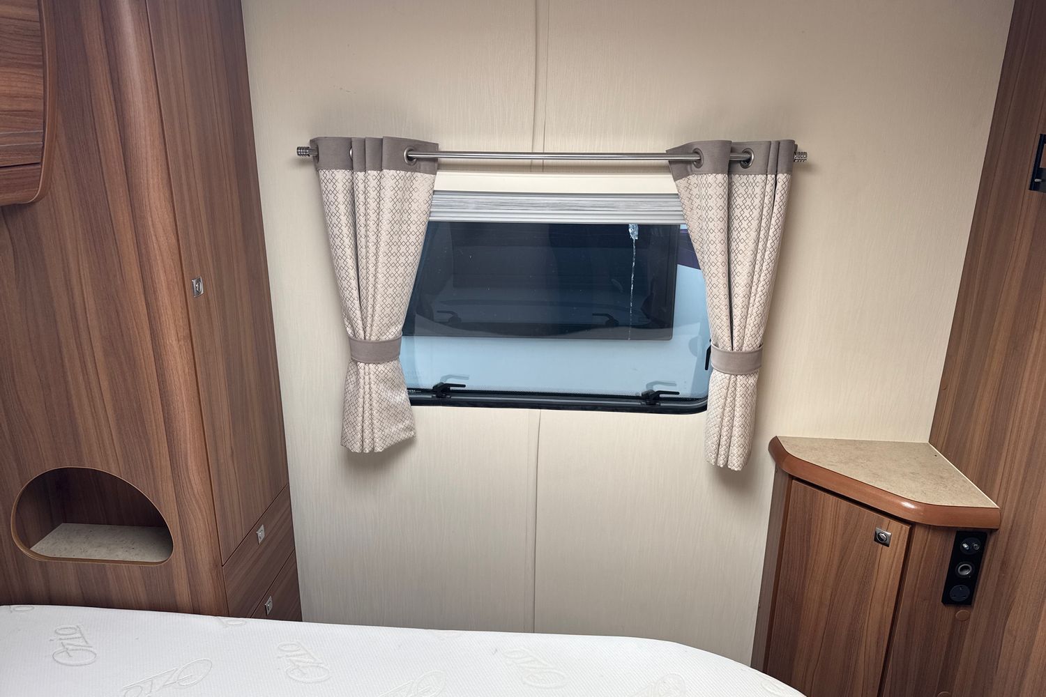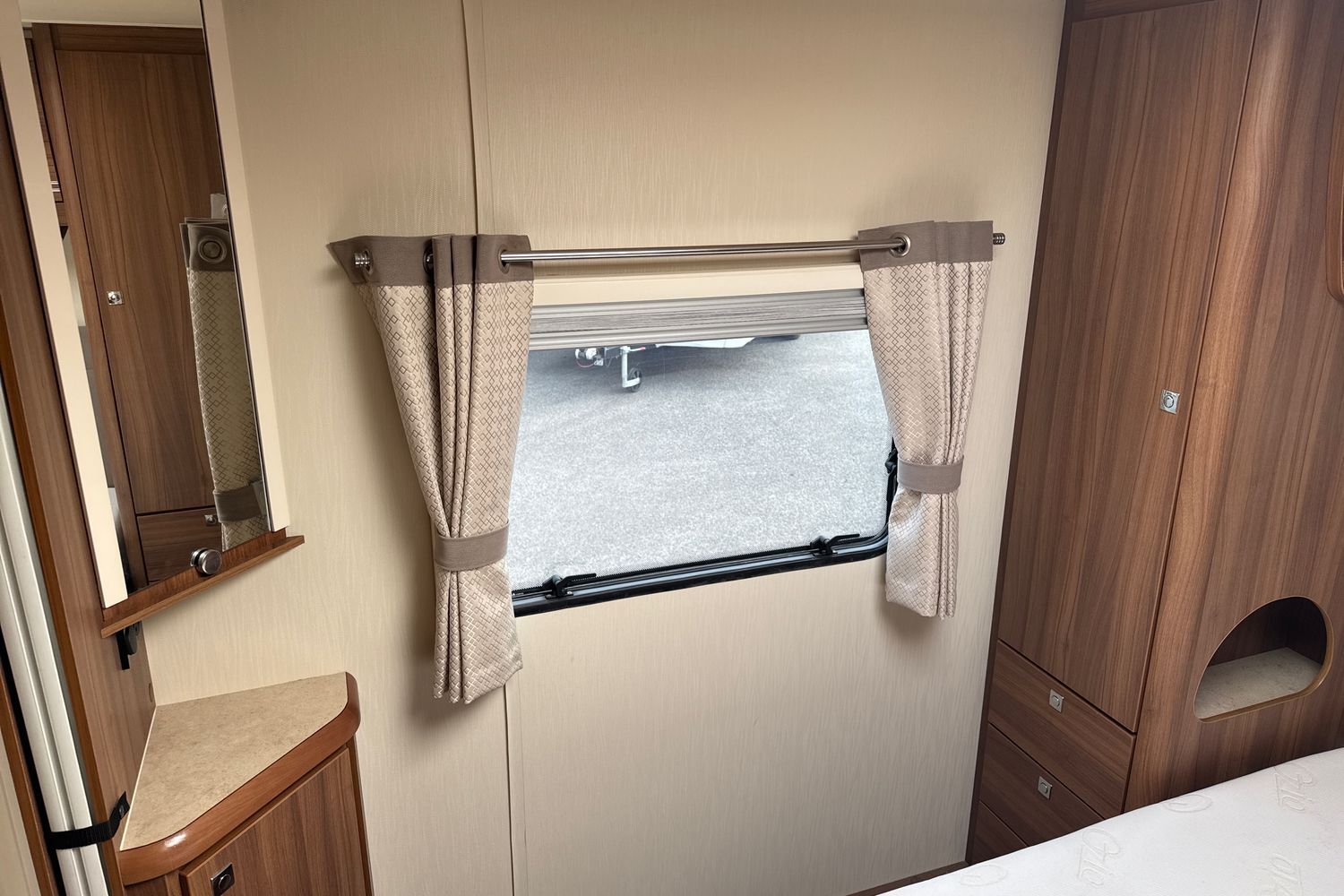 Large twin axle luxury model, 8FT wide bodyshell. Rear walk around island bed layout with domestic style mattress, acres of underbed storage, his 'n' hers wardrobes and a plethora of overhead storage lockers.