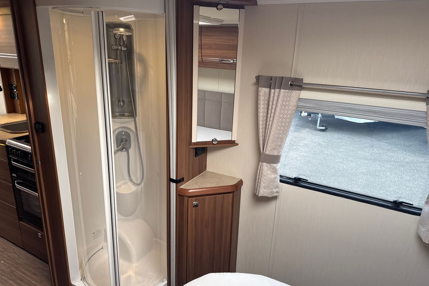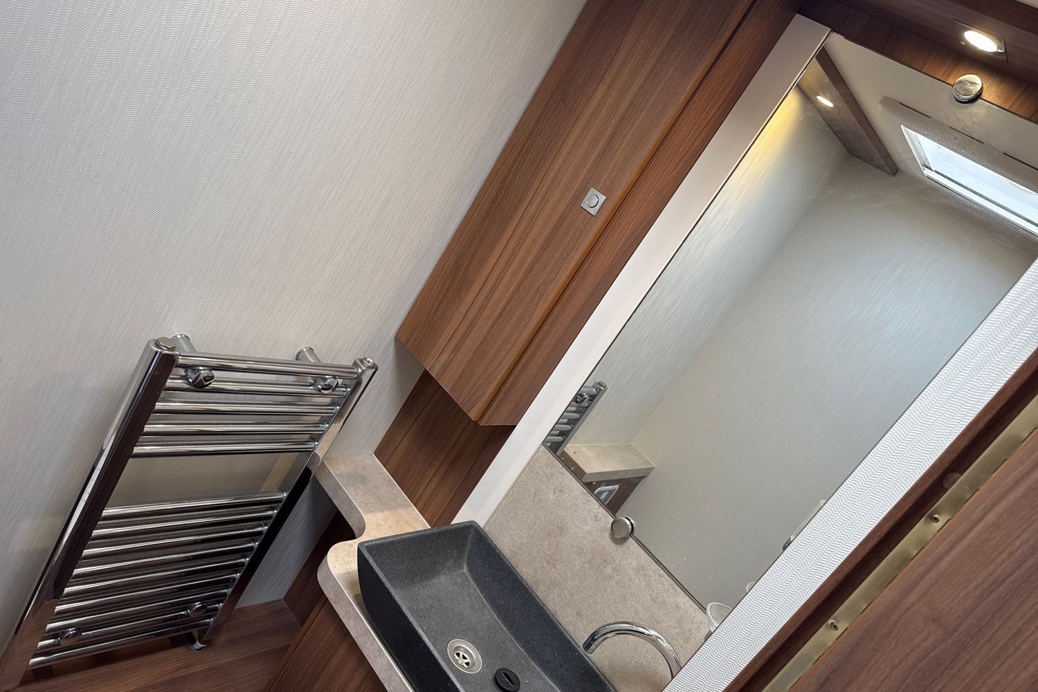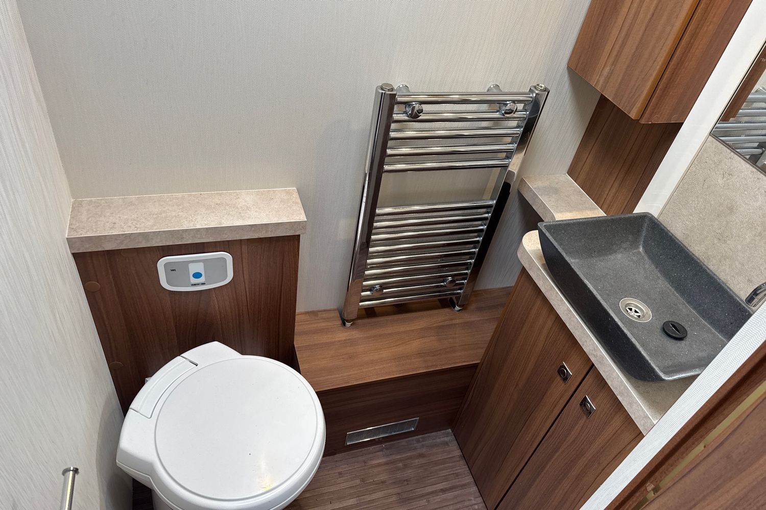 Centrally located split washroom design - seperate walk in fully lined shower cubicle on one side and a thetford swivel cassette toilet with electric flush operarion and free standing vanity sink on the other.