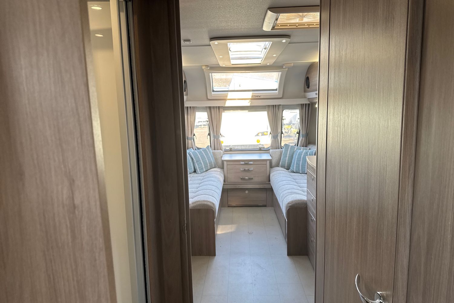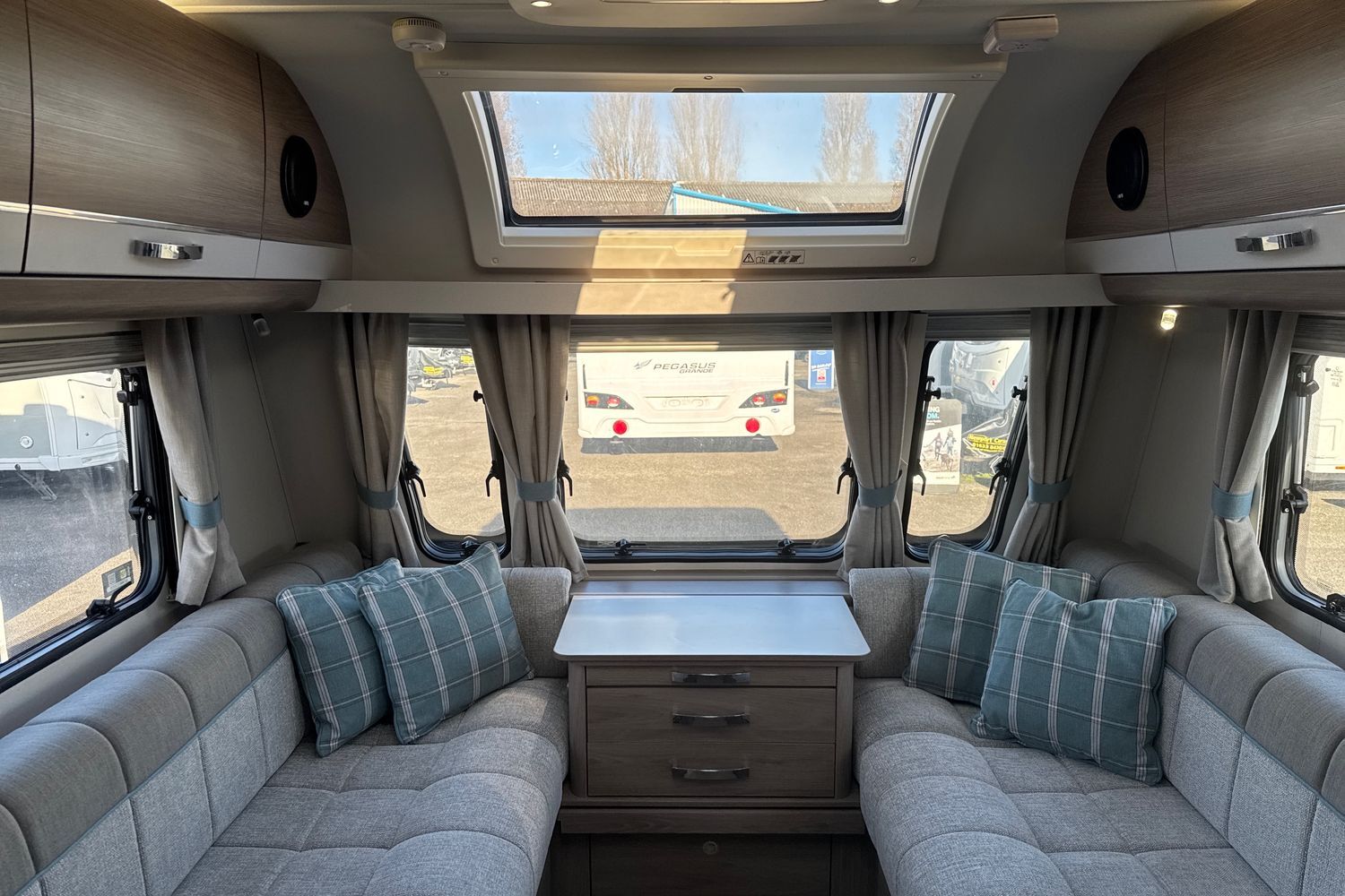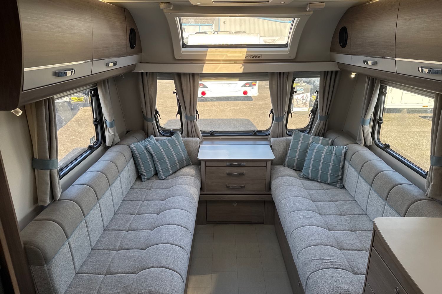 Parallel front lounge arranagement finished off in original unspoilt soft furnishings with co-ordinated scatter cushions and curtains. Seating can be used as two single beds or easily converts into a large double bed. Fly screens and night blinds all round and full length 'Stargazer' fully opening sunroof coupled with panormaic front sunroof lets in a generous amount of natural daylight.