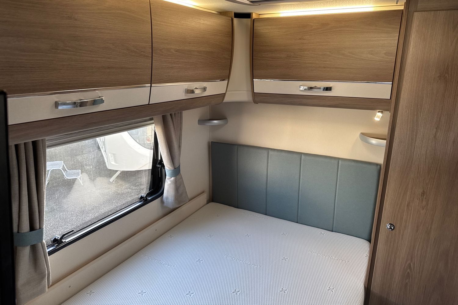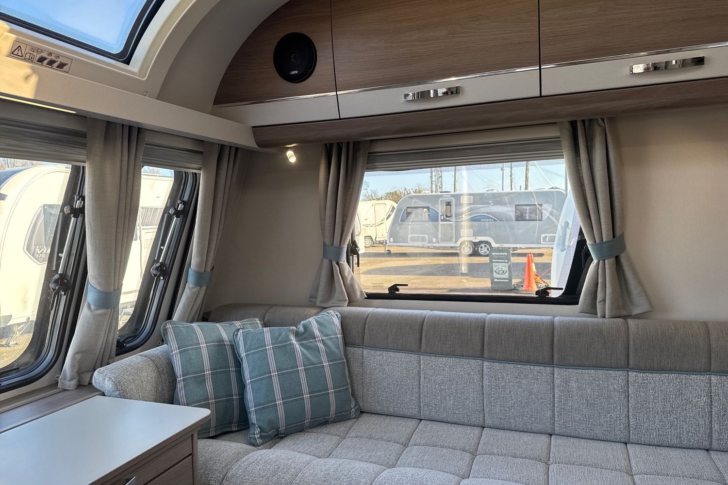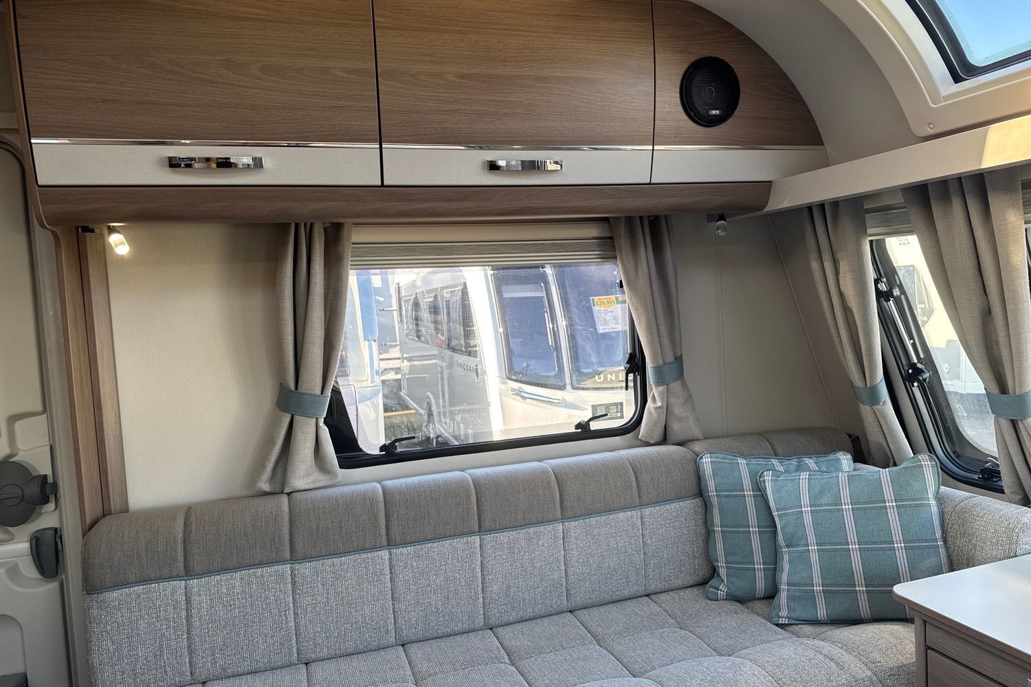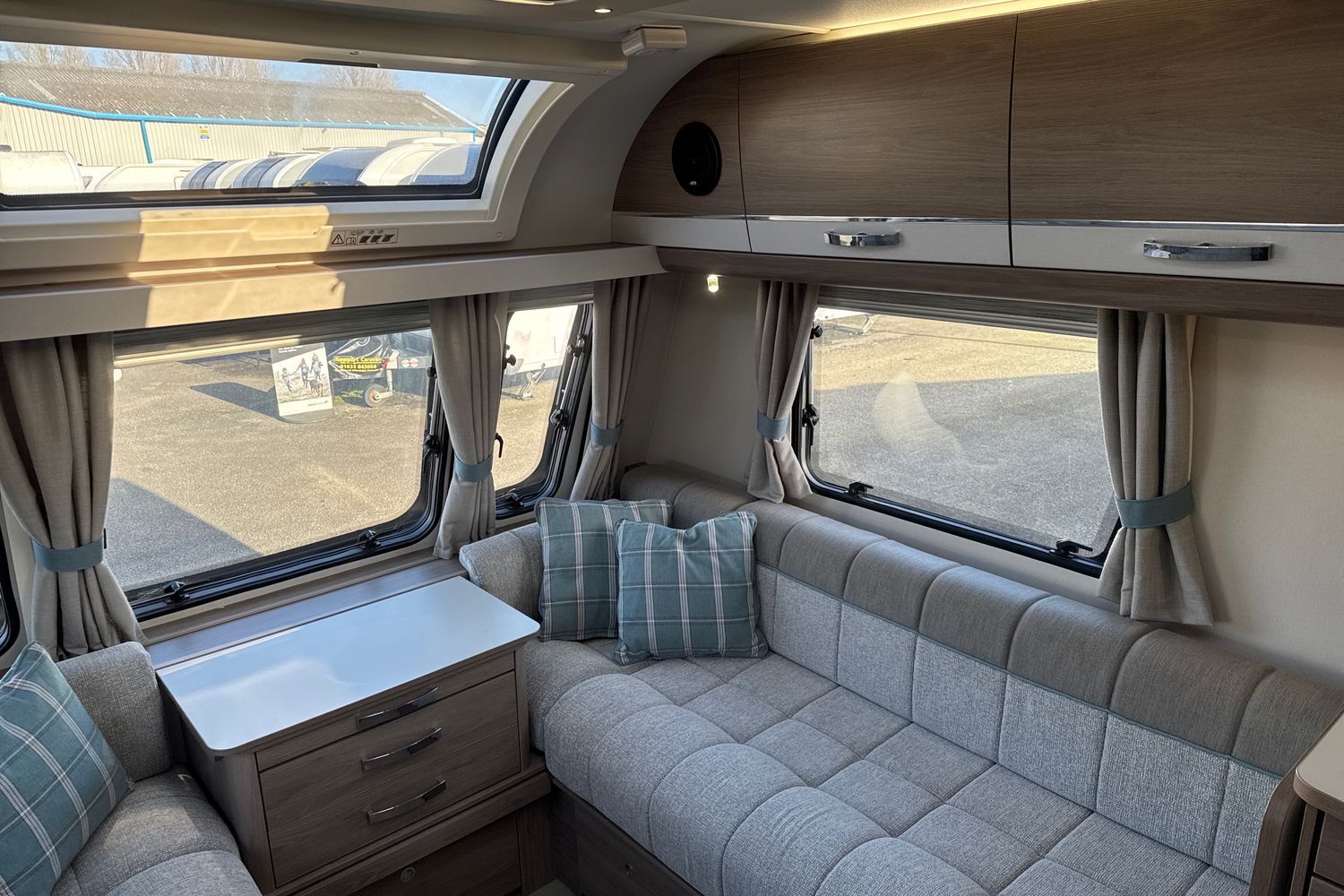 Parallel front lounge arranagement finished off in original unspoilt soft furnishings with co-ordinated scatter cushions and curtains. Seating can be used as two single beds or easily converts into a large double bed. Fly screens and night blinds all round and full length 'Stargazer' fully opening sunroof coupled with panormaic front sunroof lets in a generous amount of natural daylight.