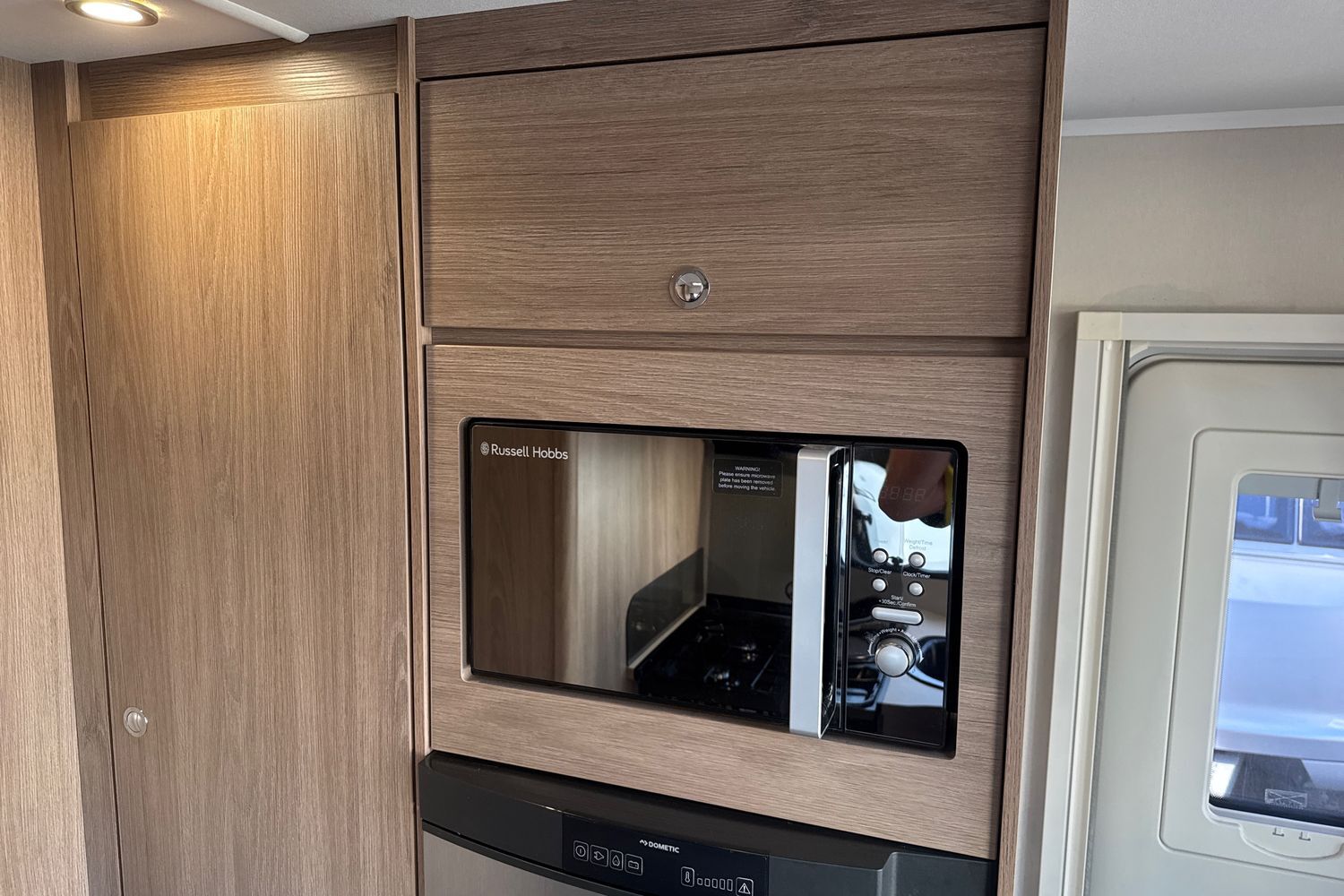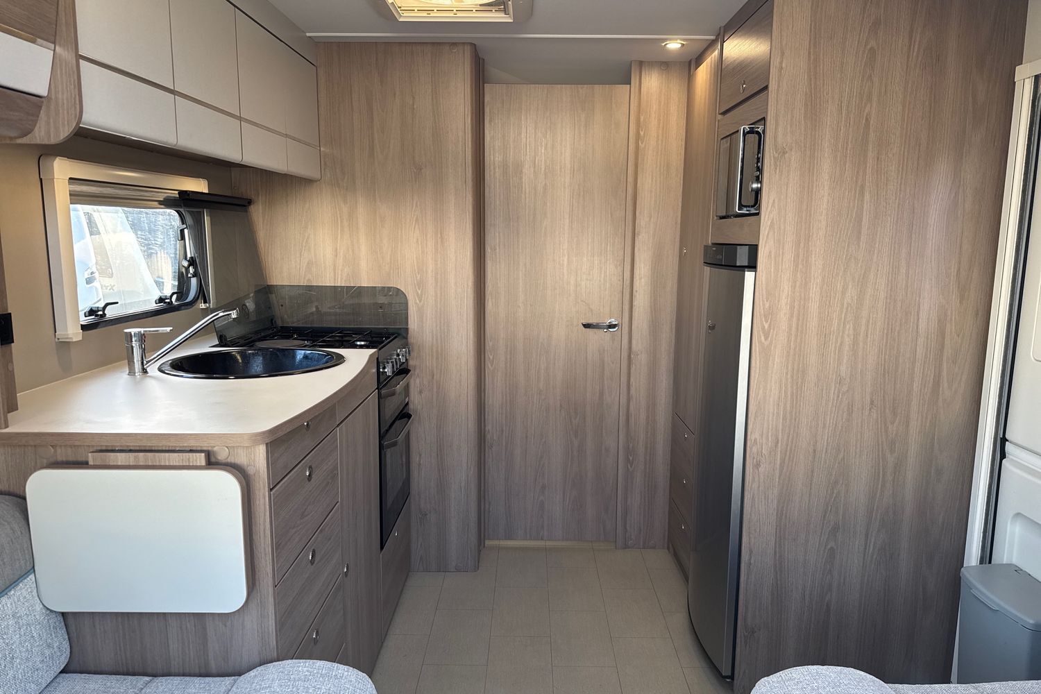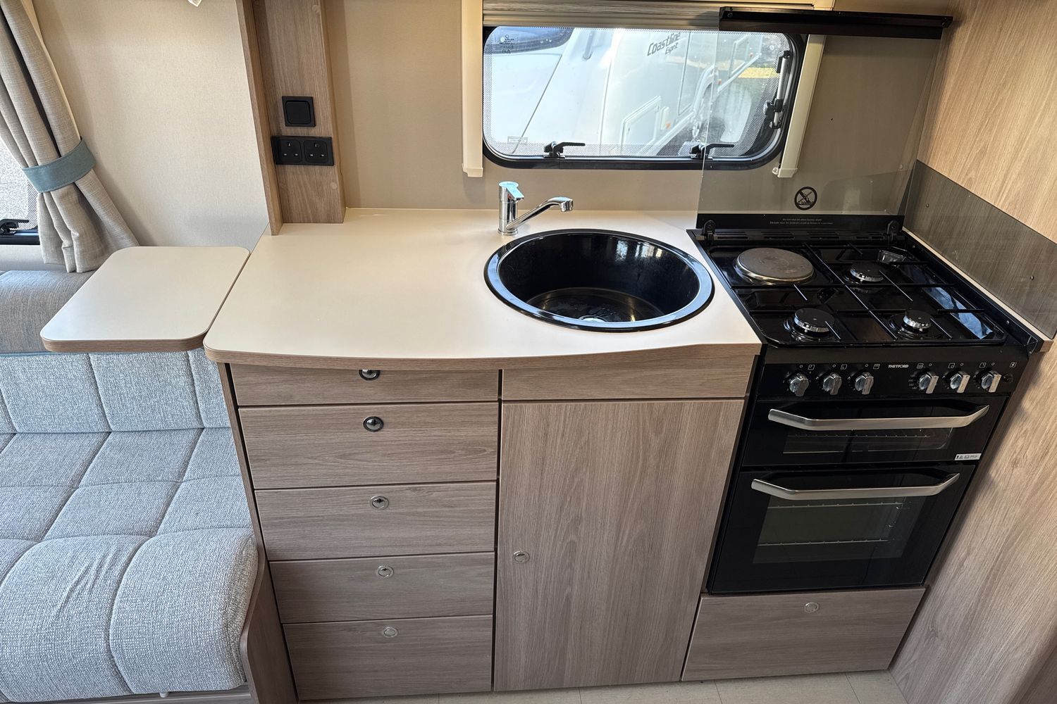 Well appointed kitchen has all the amenities the modern day caravanner requires - domestic style gas oven/grill/hob with additional electric 700w hotplate and folding safety glass lid, circular recessed black washing up sink with chrome mixer tap and clip on plastic draining board, 800w factory fitted microwave and thetfrod tall full size fridge freezer (3-way).