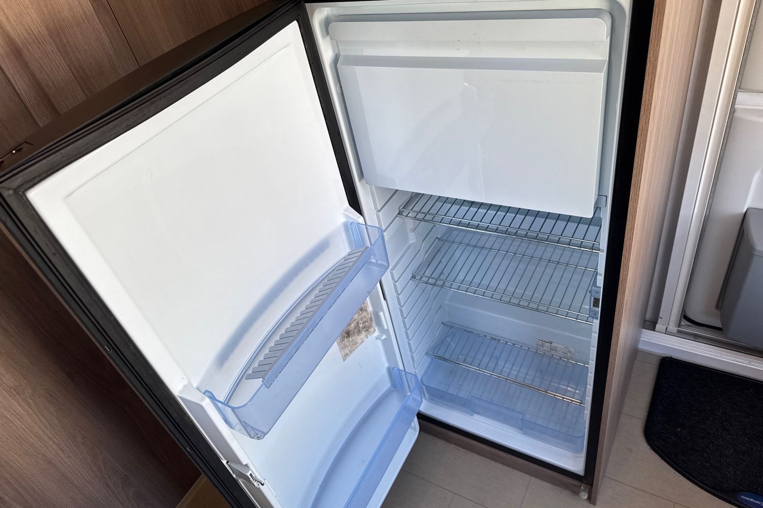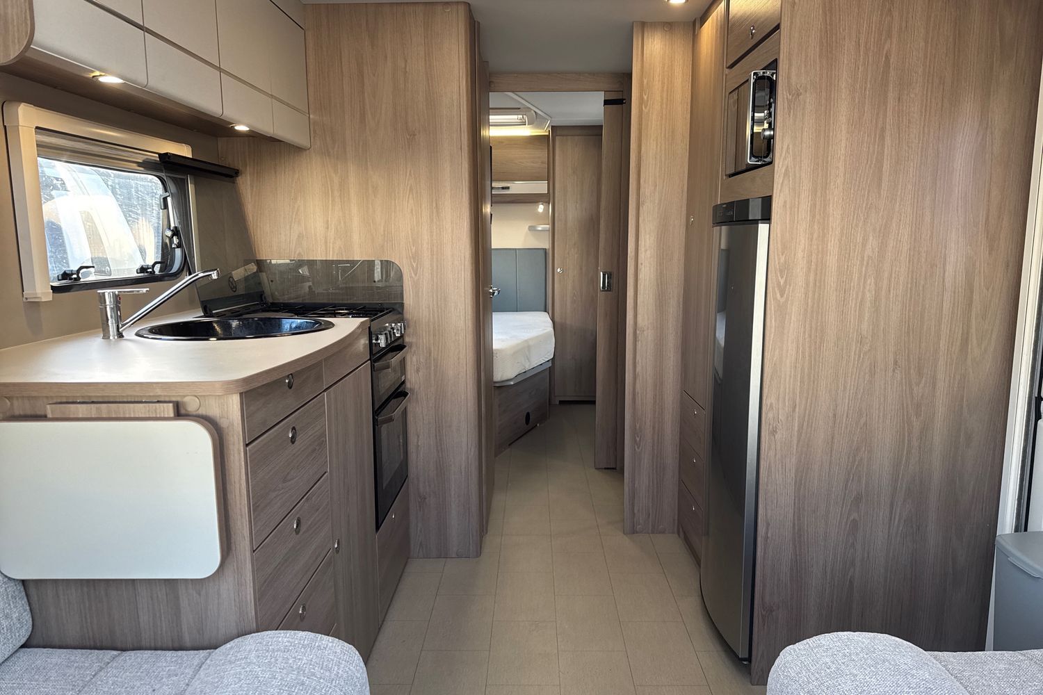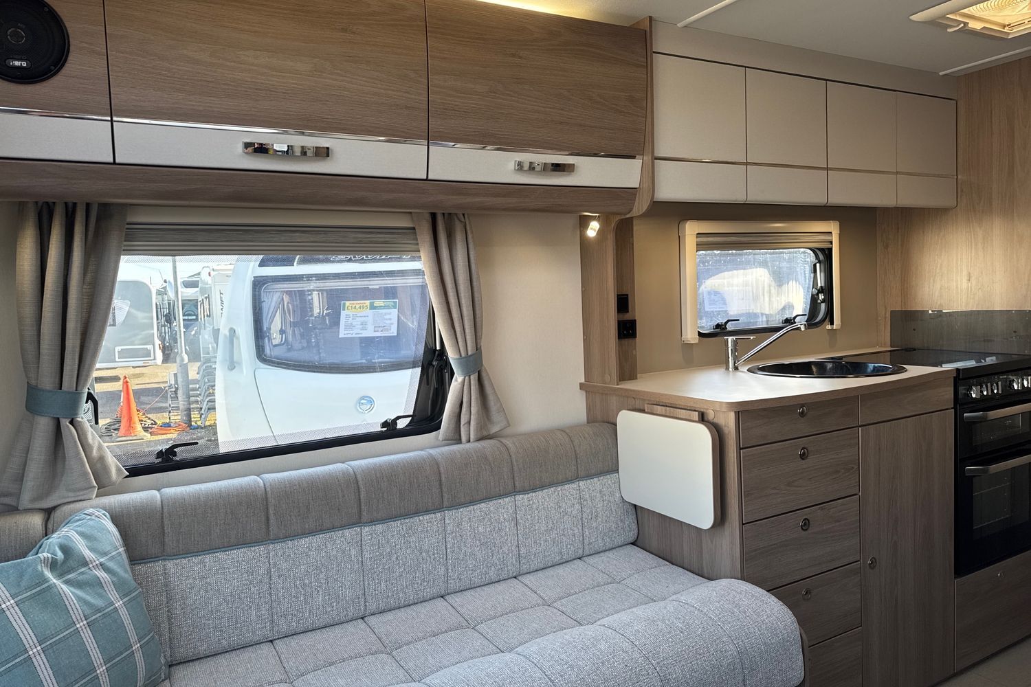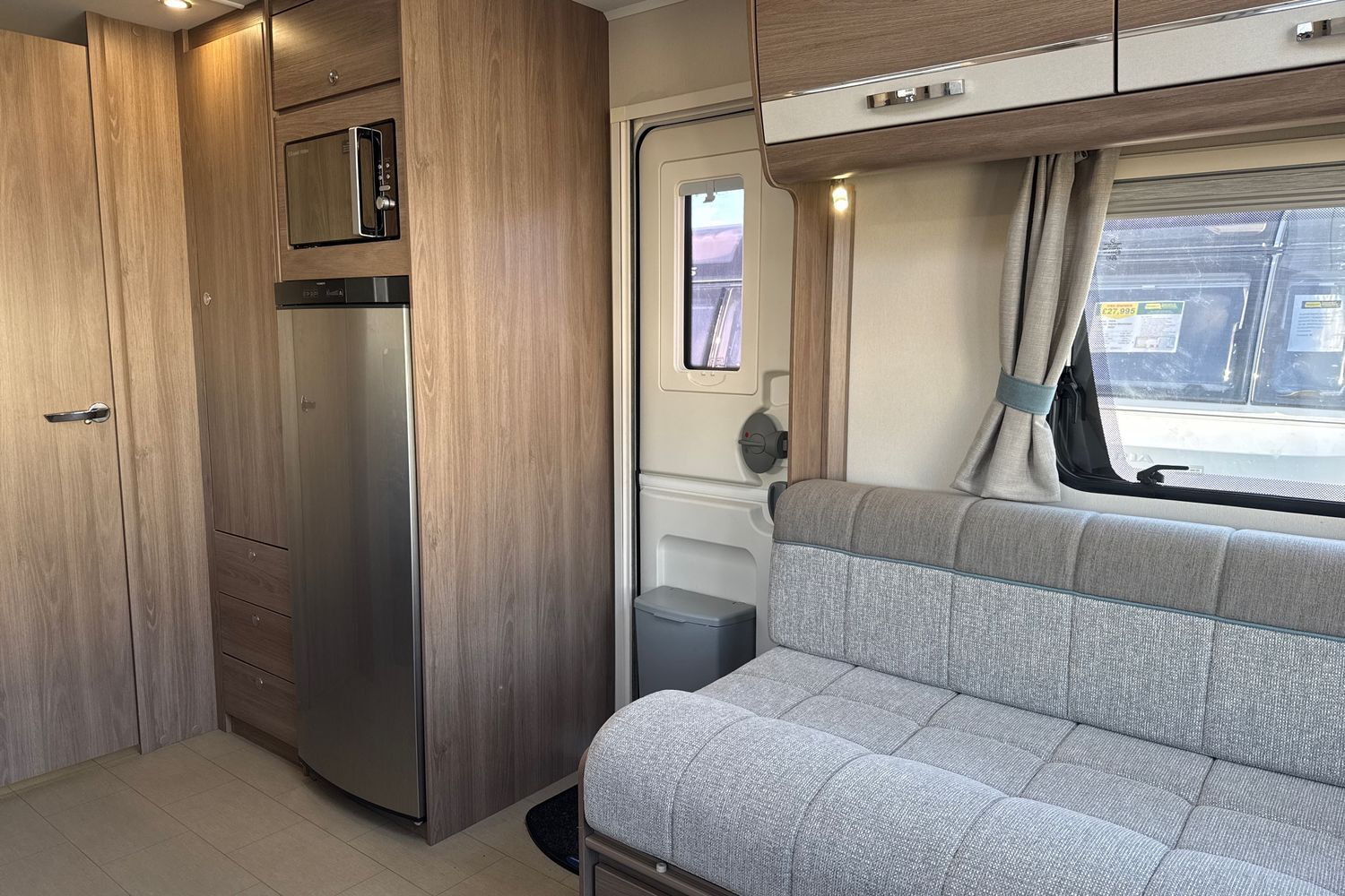 Well appointed kitchen has all the amenities the modern day caravanner requires - domestic style gas oven/grill/hob with additional electric 700w hotplate and folding safety glass lid, circular recessed black washing up sink with chrome mixer tap and clip on plastic draining board, 800w factory fitted microwave and thetfrod tall full size fridge freezer (3-way).