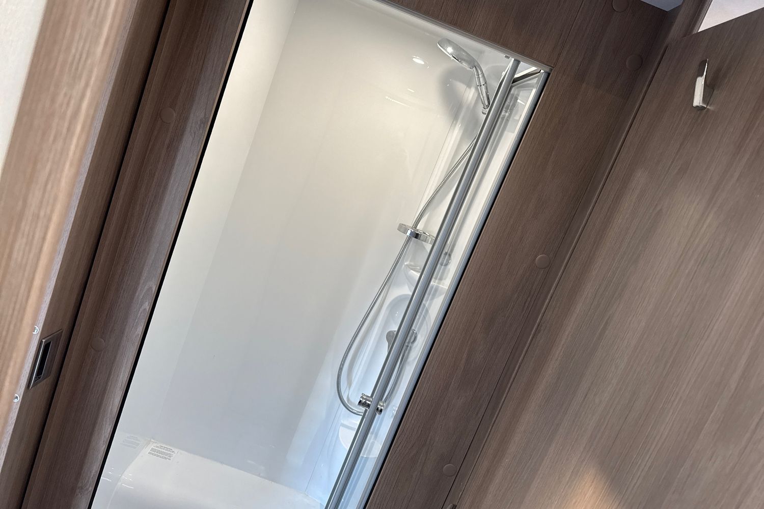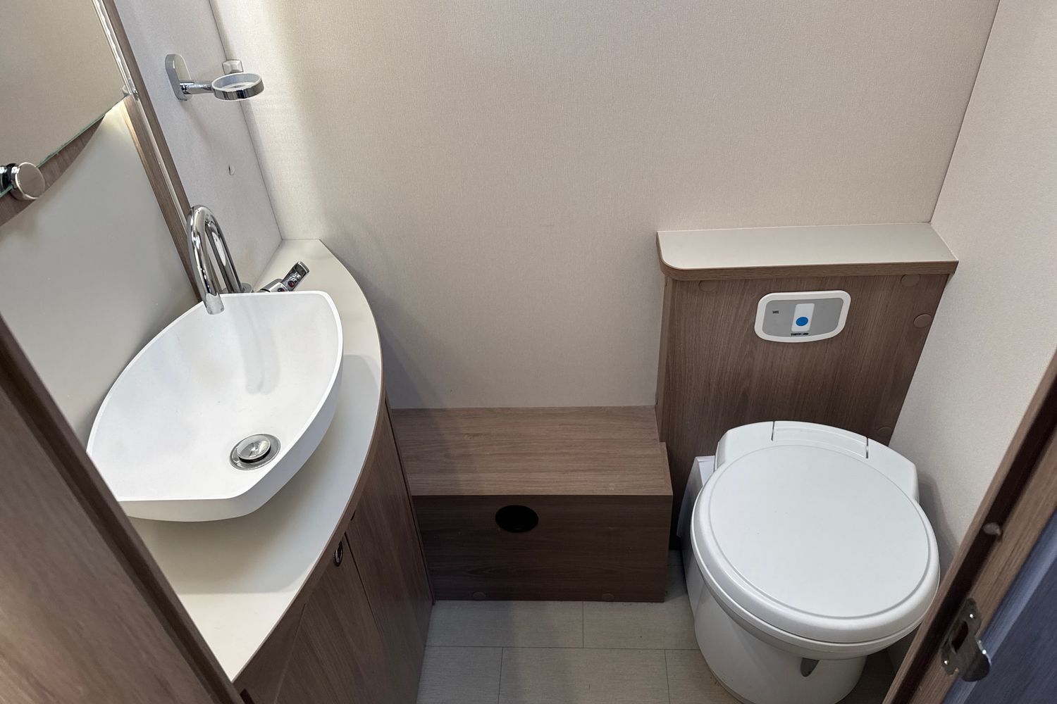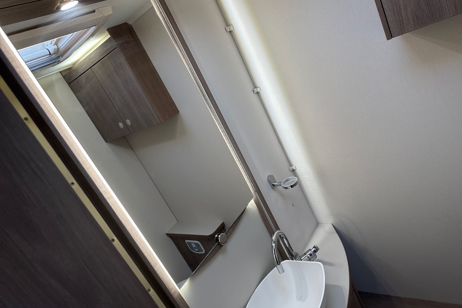 Centre ample sized washroom with seperate walk in fully lined shower cubicle and hot and cold shower mixer tap, thetford swivel chemical cassette toilet with electric flush operation and boutique style handbasin and vanity unit with chrome hot and cold mixer tap.
