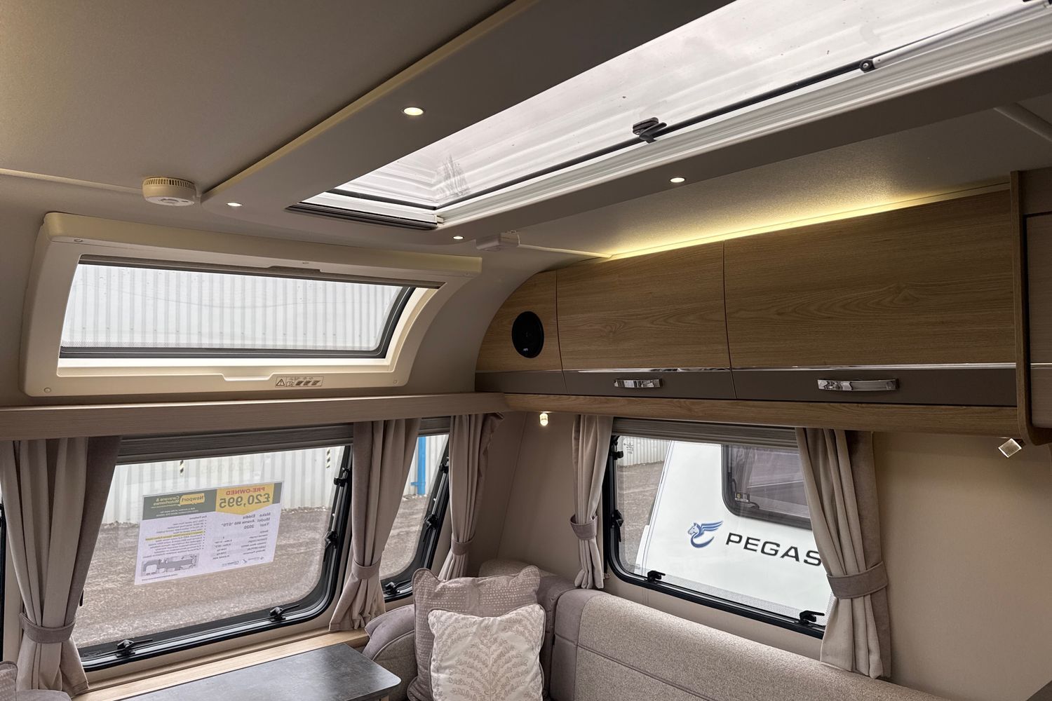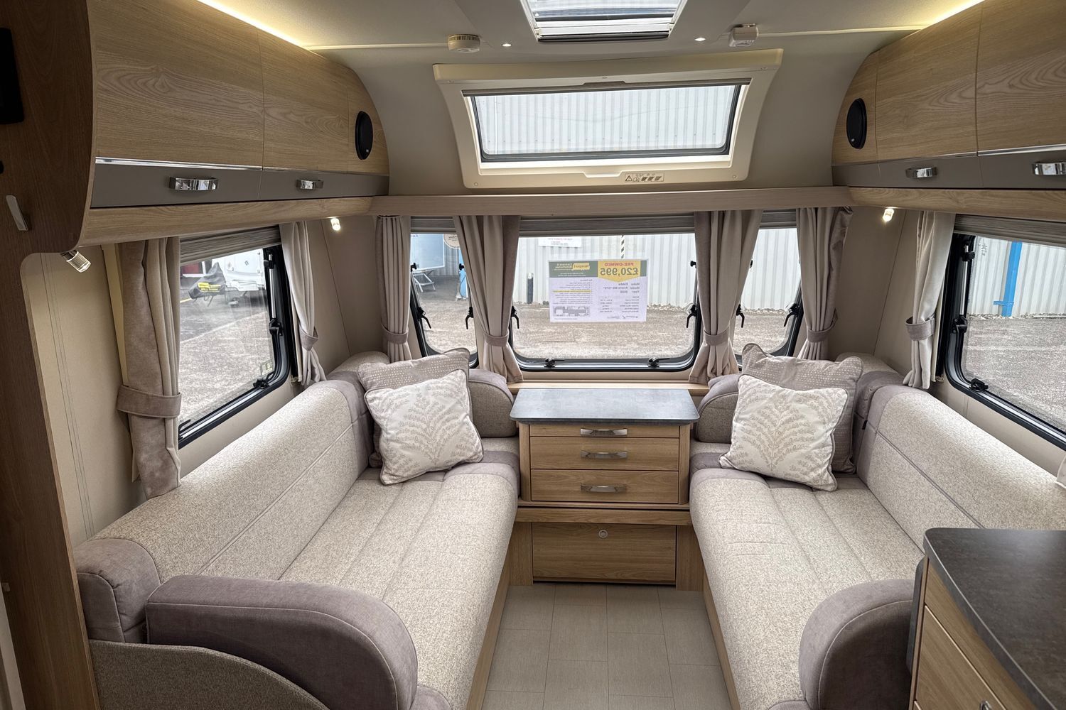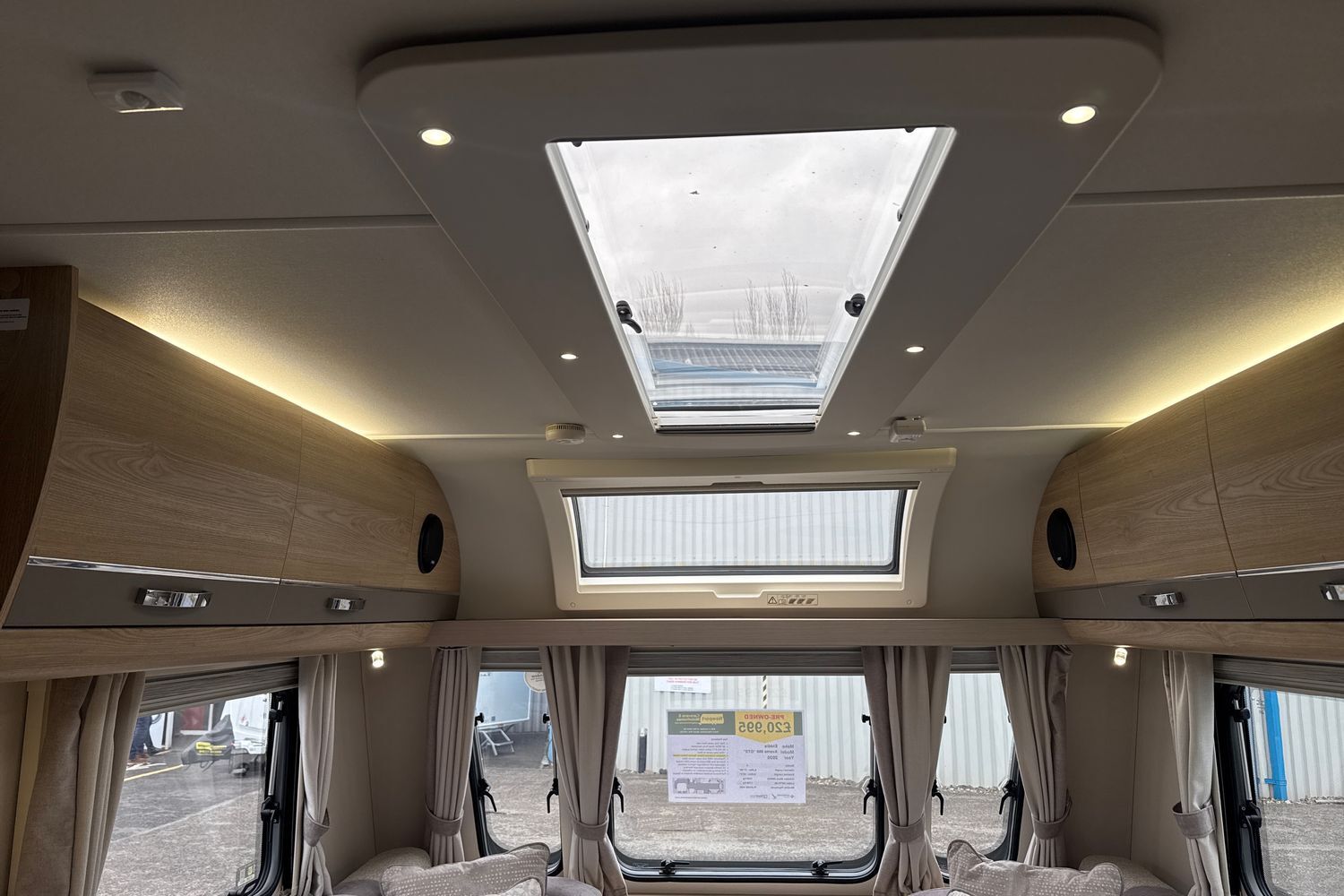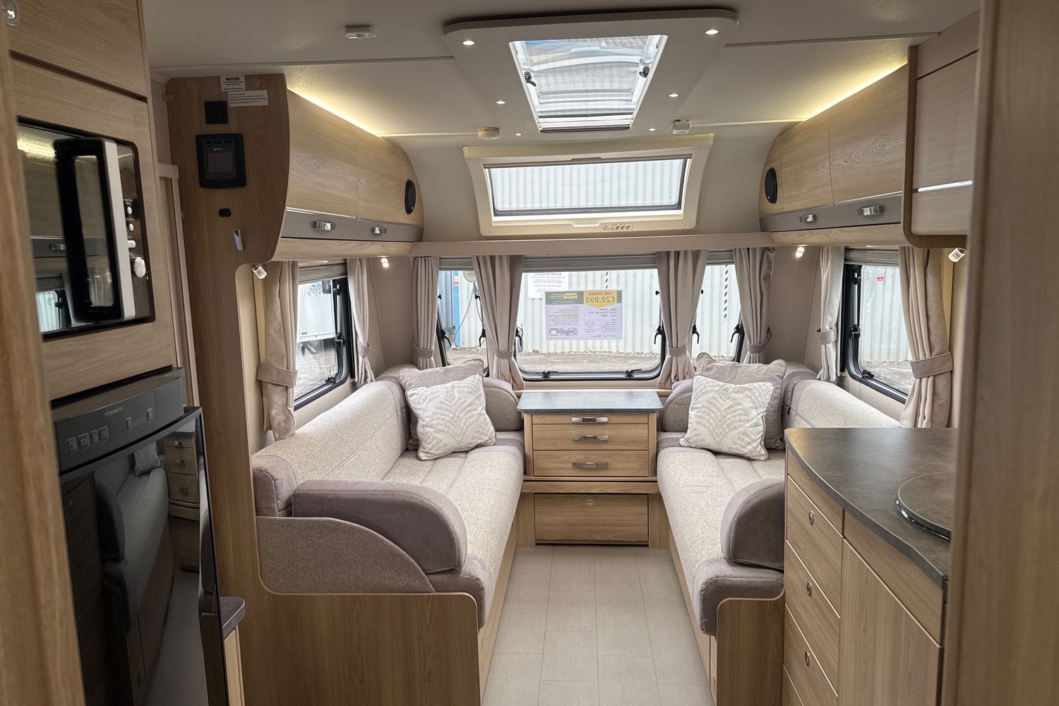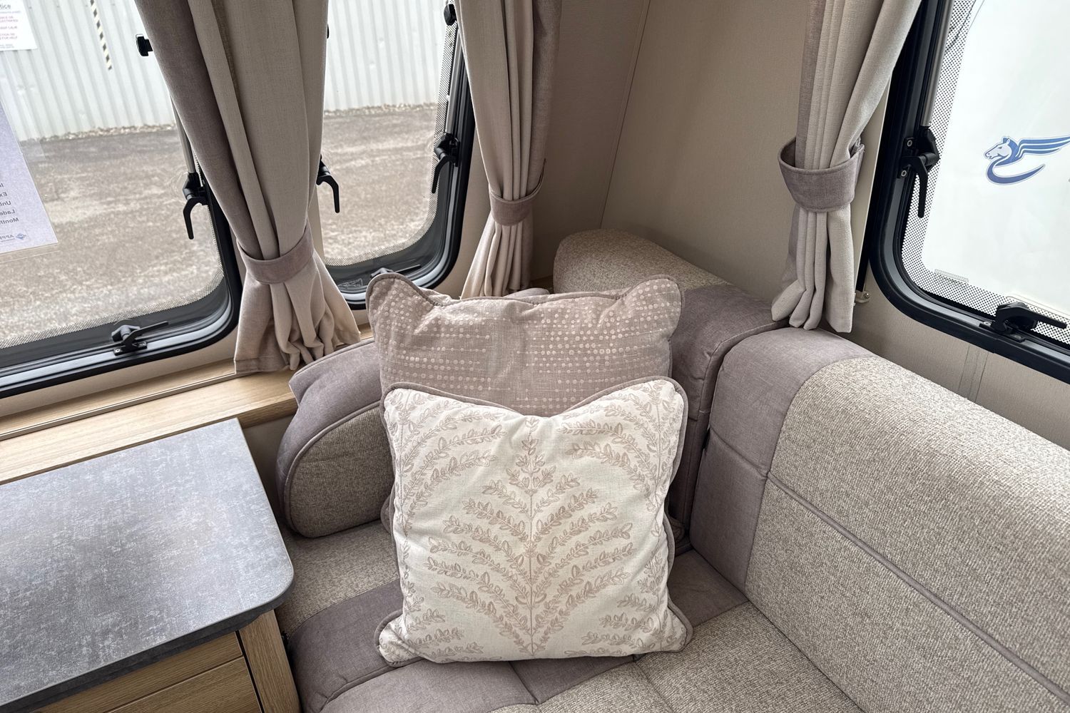 Parallel front lounge arrangement finished off in upgraded GTS soft furnishings, co-ordinated scatter cushions, curtains and tie backs and fully removeable bound edge 'drop-in' carpet set. Front seating can be used as two single beds or easily converts into an additional large double bed. Other features of note include a full length/fully opening stargazer sunroof, remote alarm system with x2 fobs, dual fuel heating and hot water system.