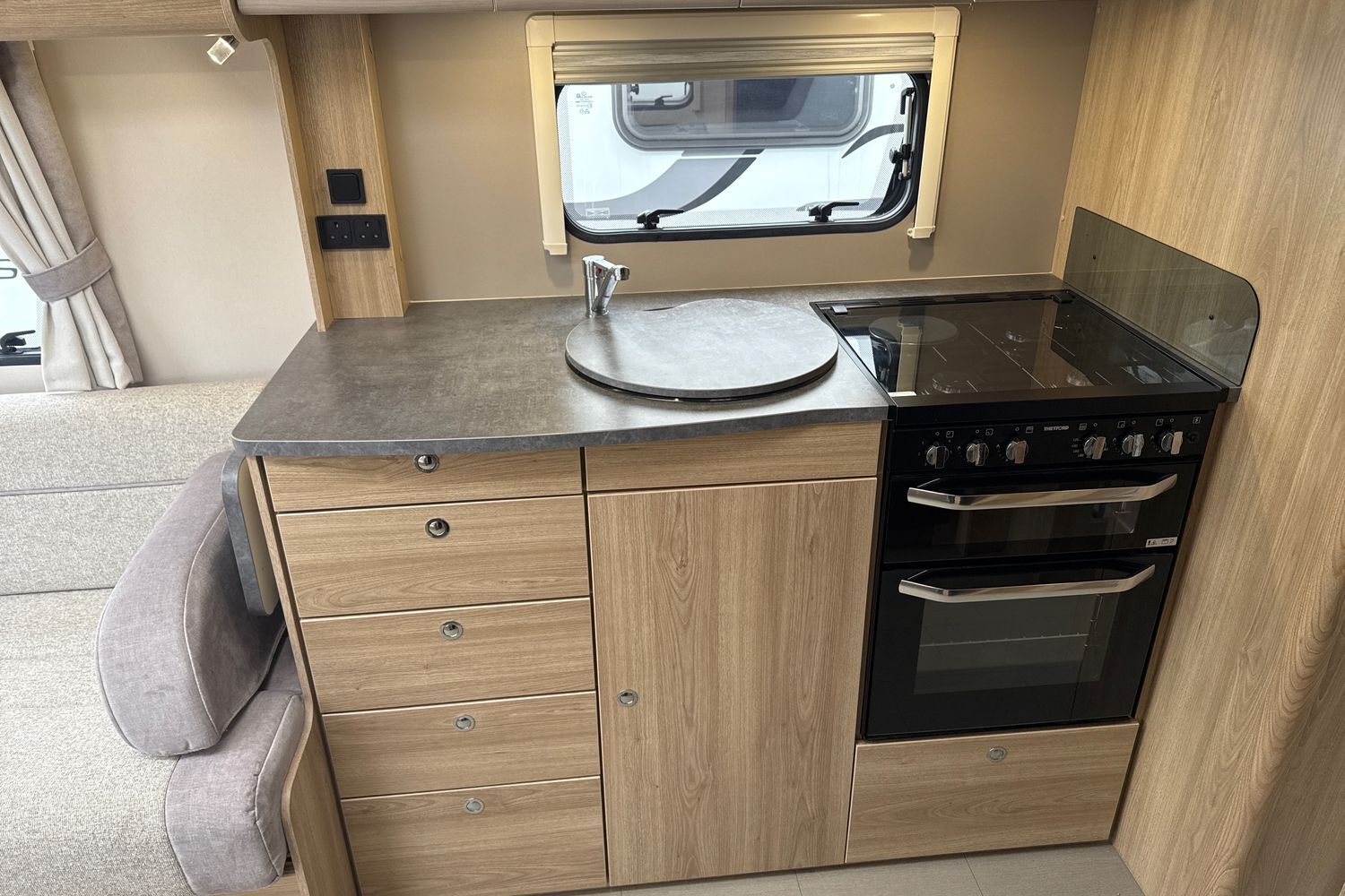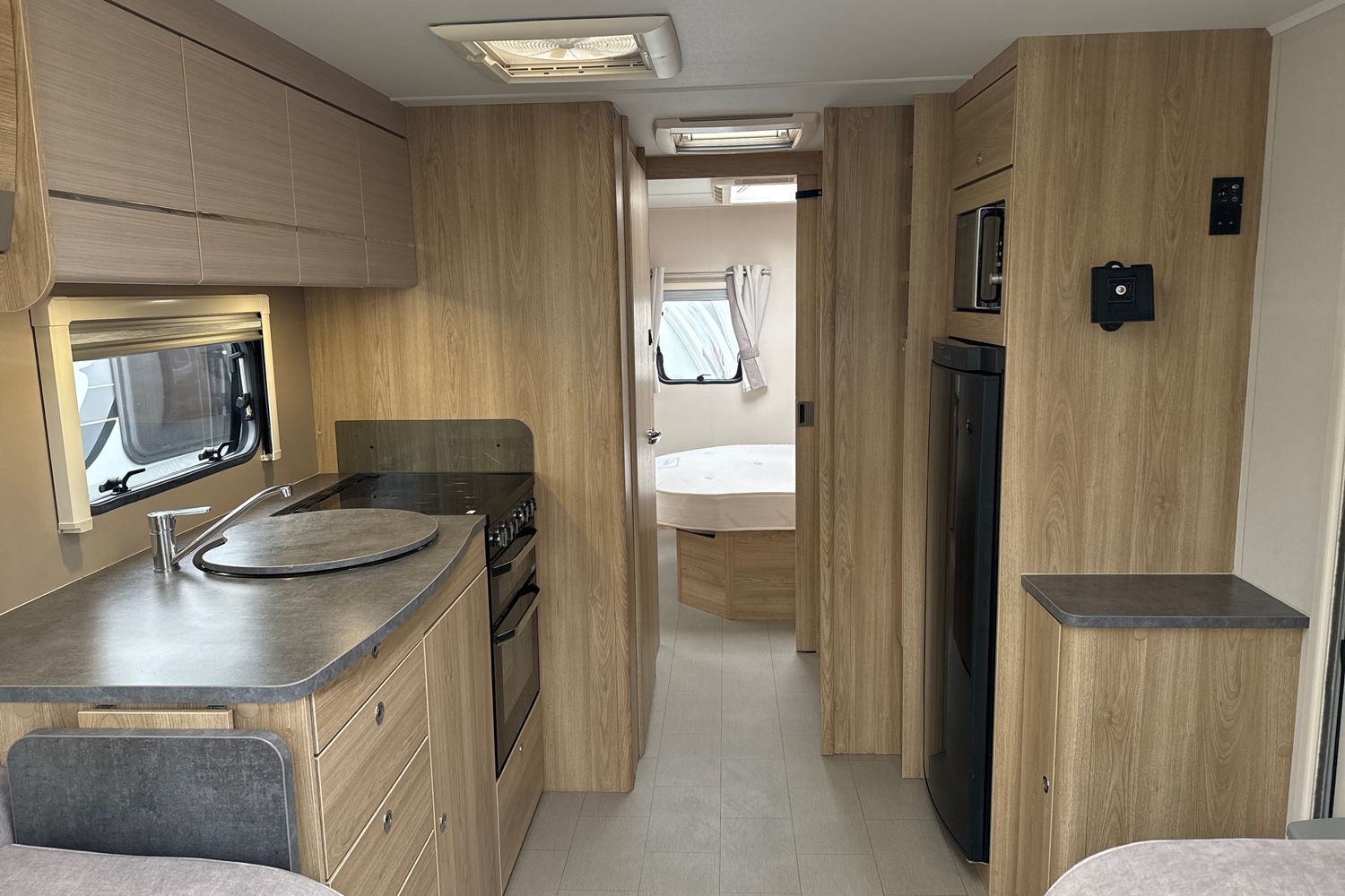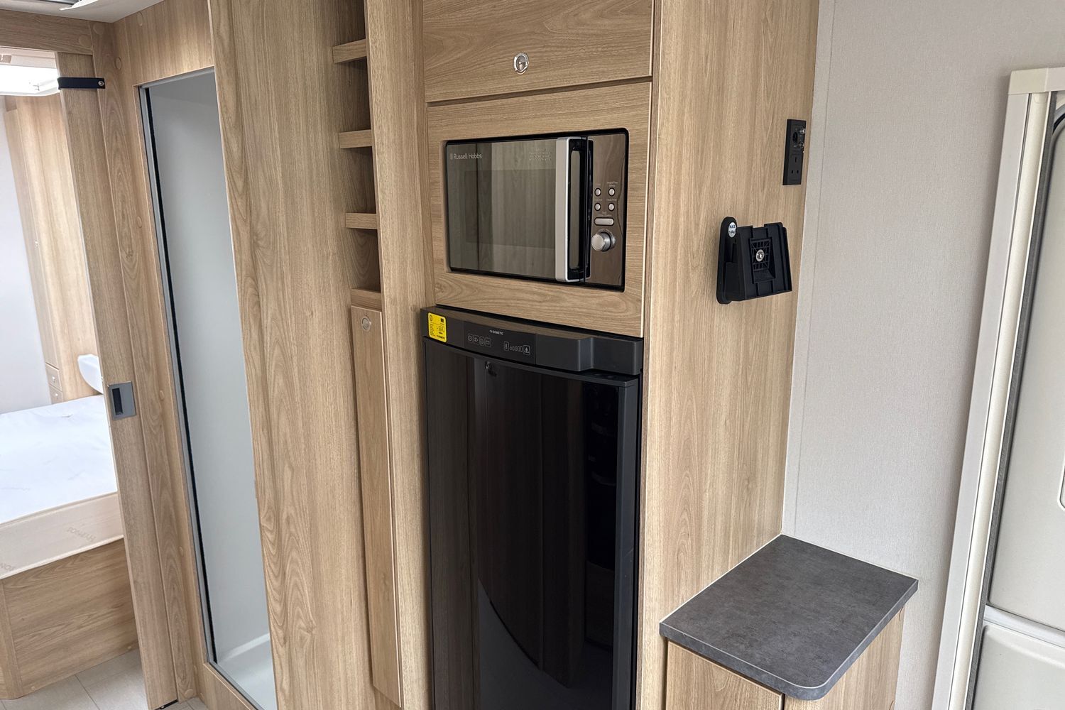 Centrally located well appointed kitchen area comlete with all the amenities the modern day caravanner requires, domestic style gas oven/gill/hob with additional electric hotplate and folding glass lid, branded factorty fitted microwave, gloss black circular washing up sink with modern hot and cold chrome mixer tap with grey plastic clip on draining board and large/tall 3-way gloss black fronted fridge with integral freezer compartment.
