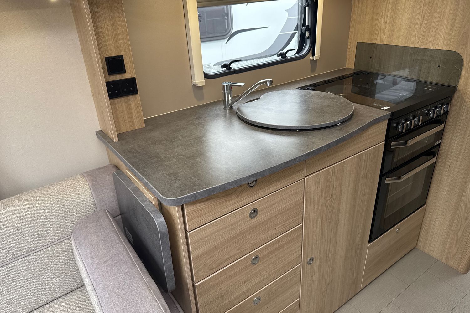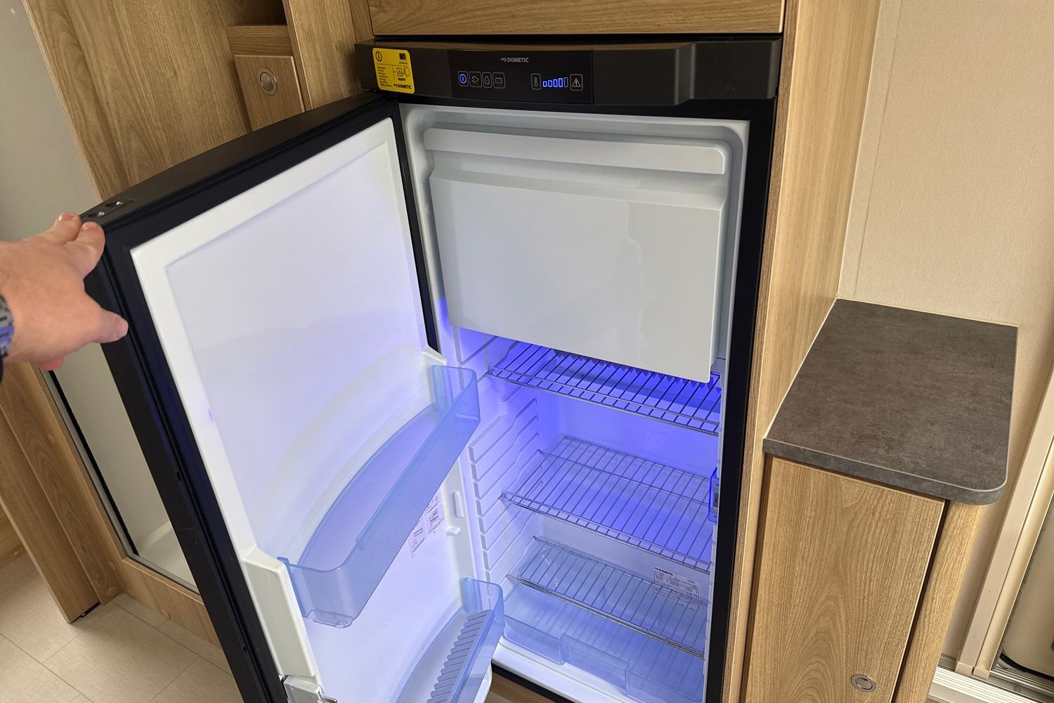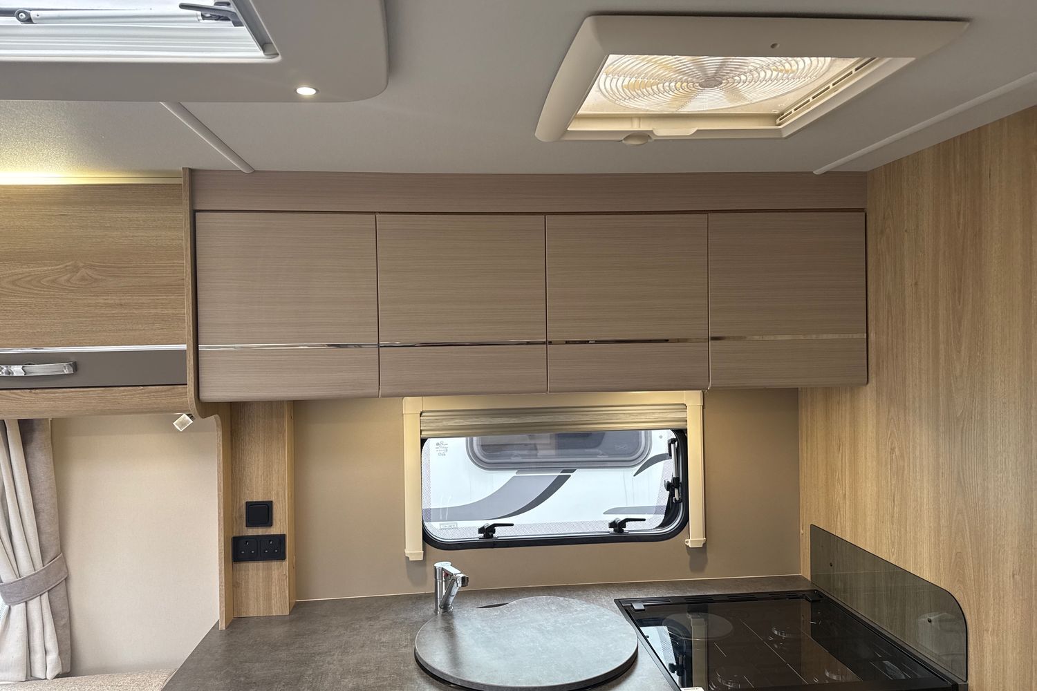 Centrally located well appointed kitchen area comlete with all the amenities the modern day caravanner requires, domestic style gas oven/gill/hob with additional electric hotplate and folding glass lid, branded factorty fitted microwave, gloss black circular washing up sink with modern hot and cold chrome mixer tap with grey plastic clip on draining board and large/tall 3-way gloss black fronted fridge with integral freezer compartment.