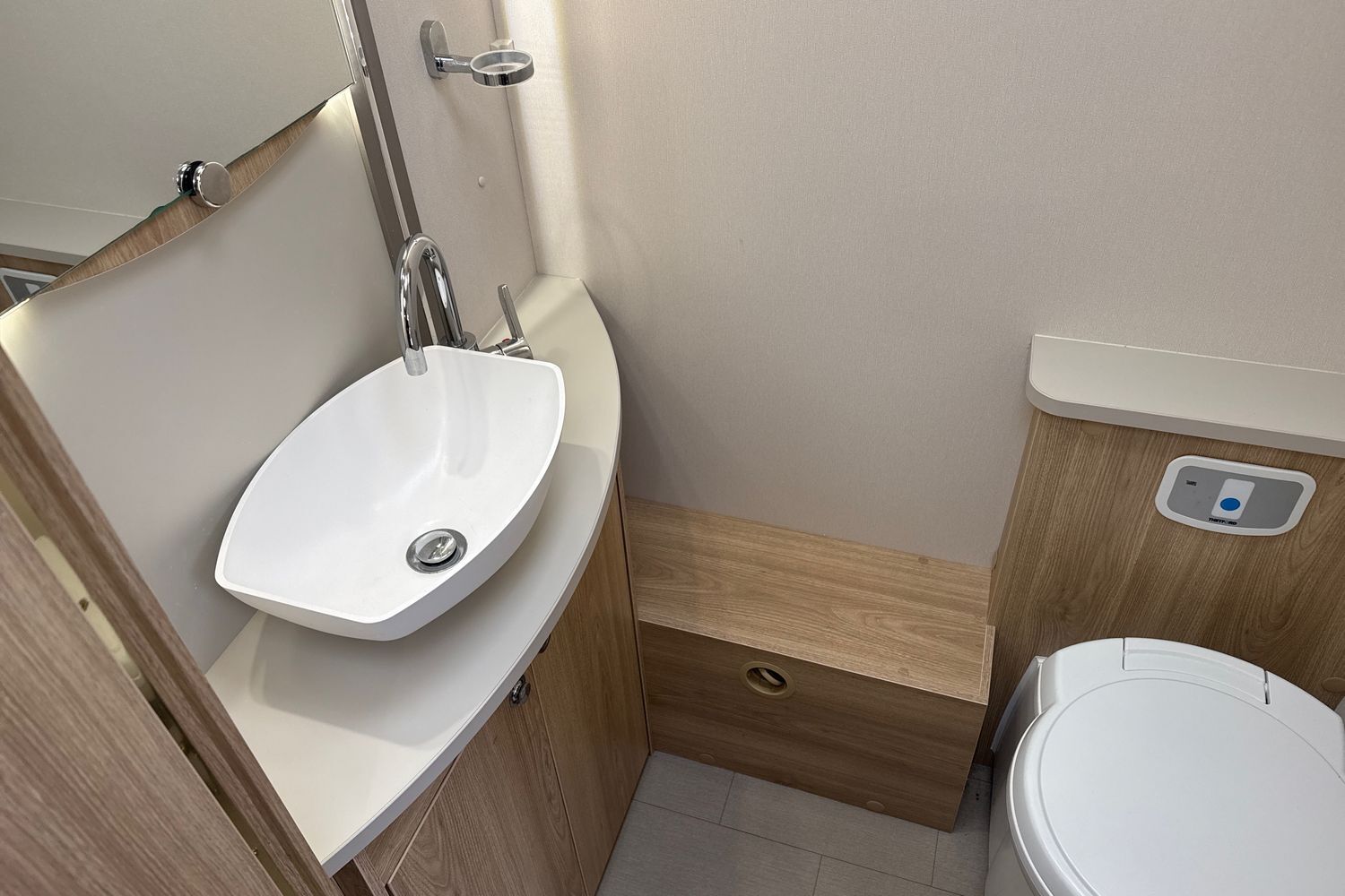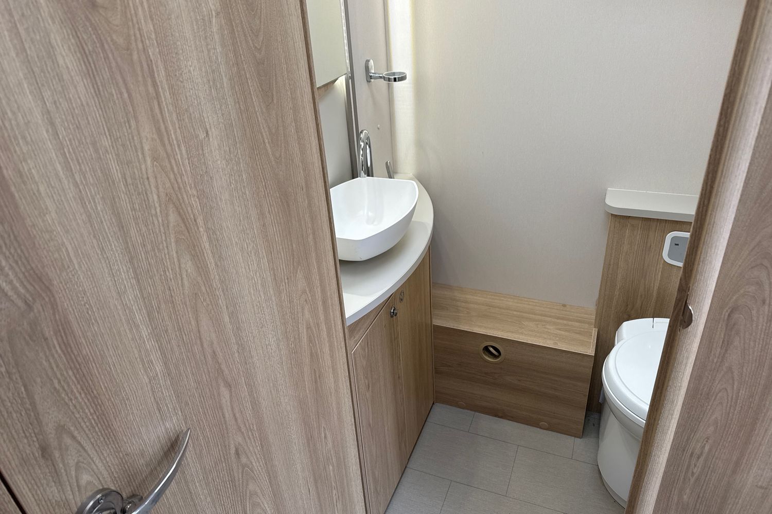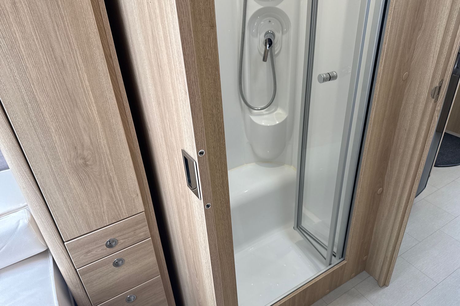 Centre split washroom design with a full sized fully lined walk in shower compartment with hot and cold shower mixer head on the one side and a thetford swivel electric flush operation toilet and sink and vanity unit on the other which maximises an efficient use of space. Bedroom and bedroom/washroom facilities can both be independantly closed off from the rest of the caravan.