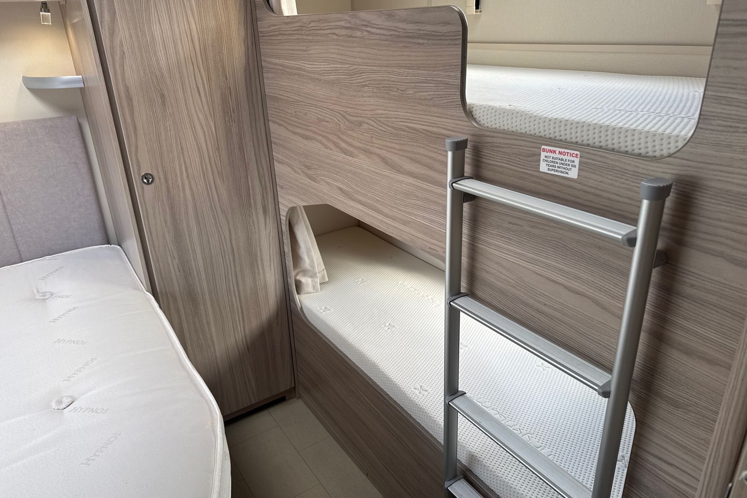 A very popular 8ft WIDE bodyshell twin axle caravan that offers the perfect family layout that combines acres of useable lounge space plus a fixed double bed plus dedicated fixed bunk beds. Extremely hard to find on the pre-owned market and always sells out early when new so please register your interest early to avoid dissappointment.
