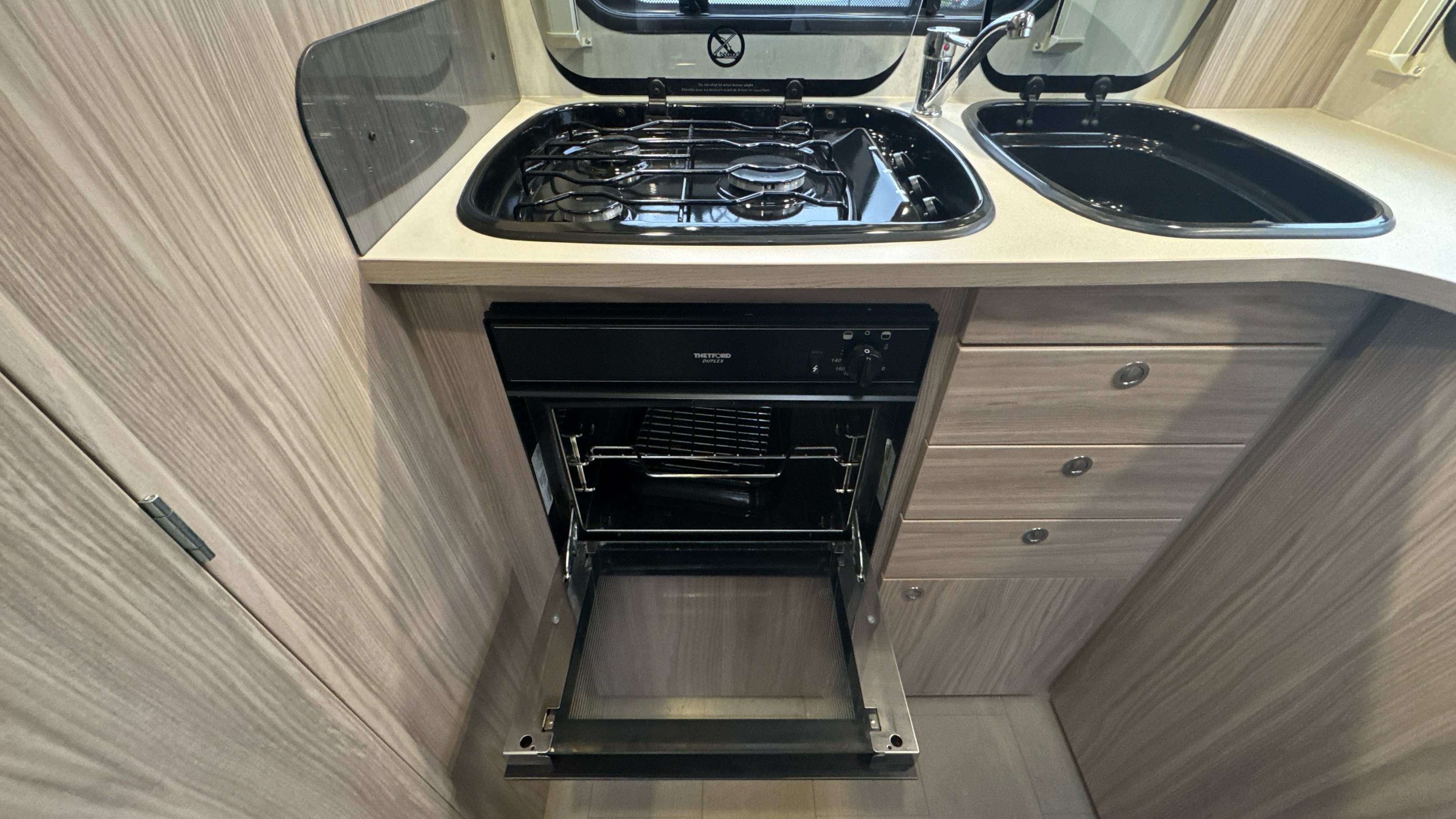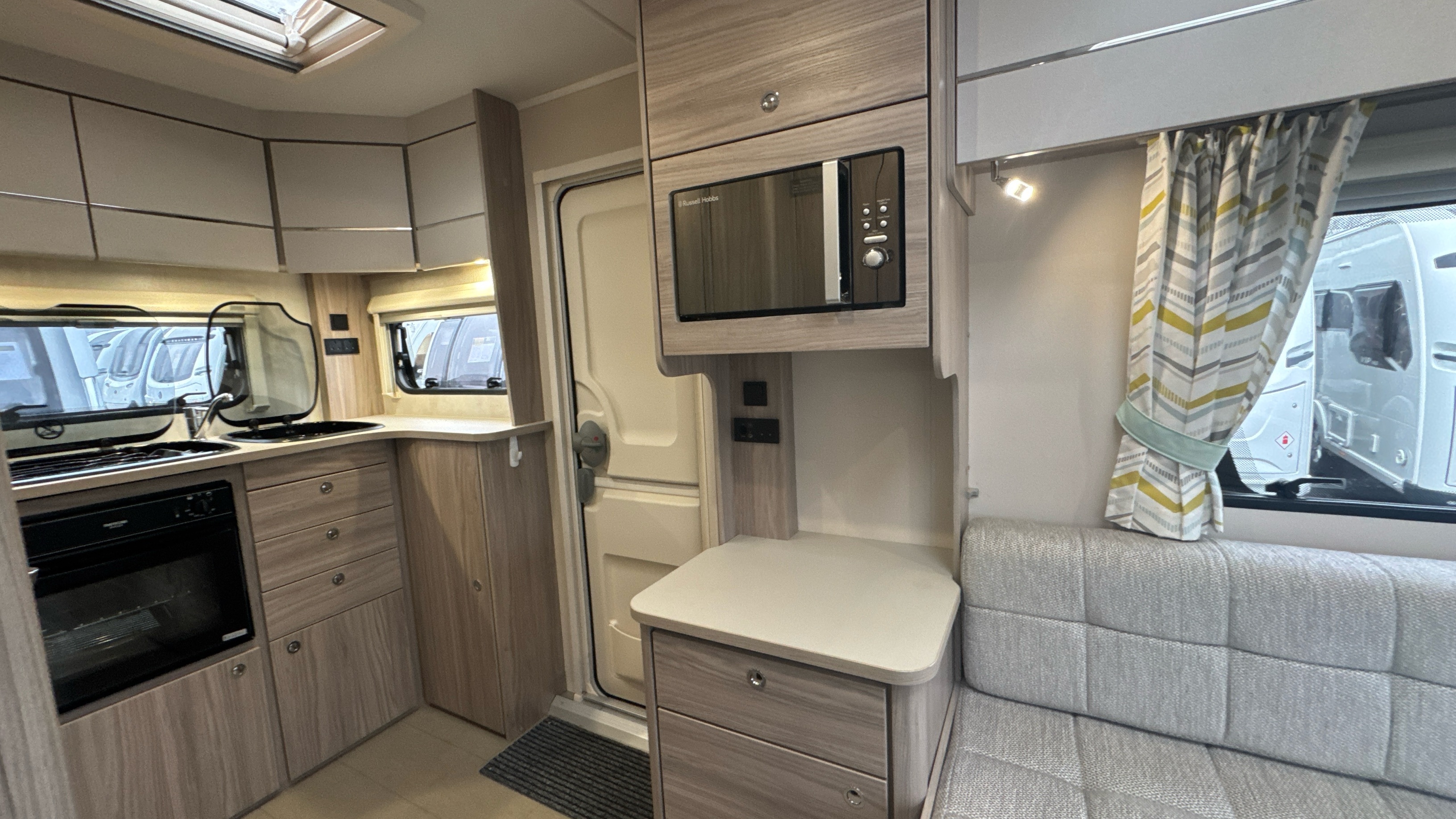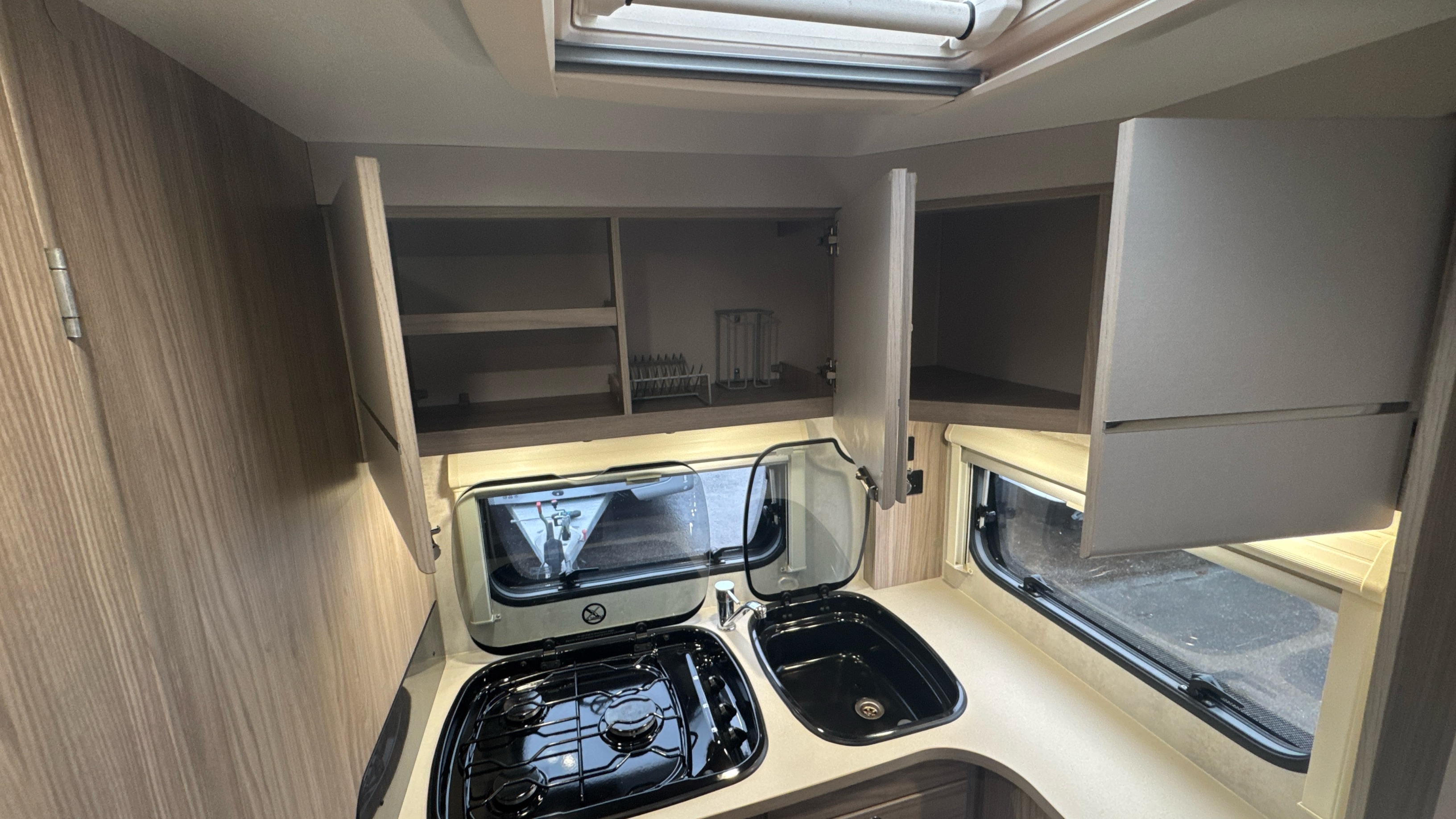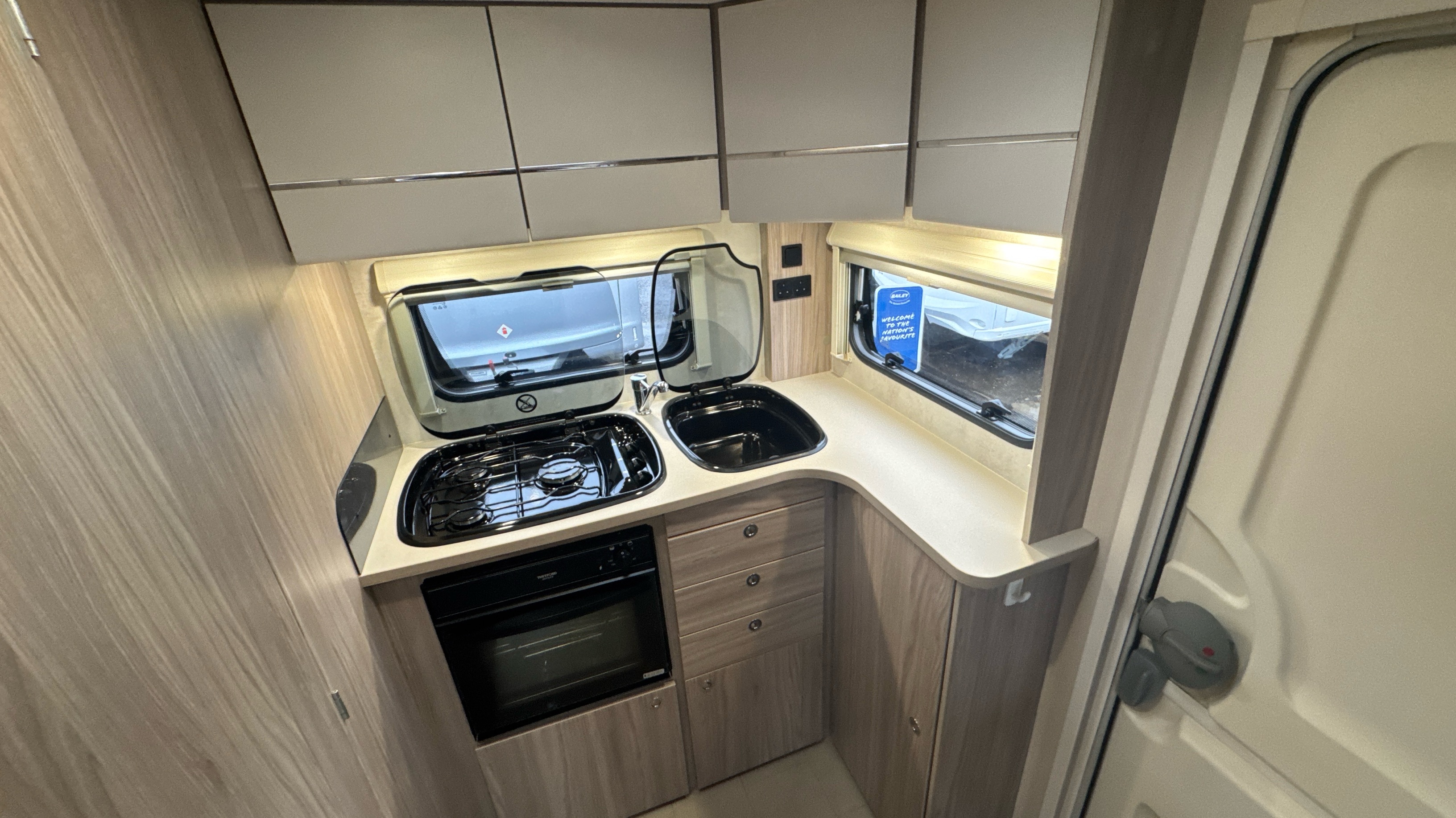 SoLiD bonded construction bodyshell from Elddis, this extremely lightweight two berth tourer features an ample size L-shape rear kitchen configuration with 3-way dometic fridge with integral freezer compartment, thetford Duplex gas oven/grill combo with 3-burner gas gob and folding glass lid, recessed washing up sink with clip on draining board and modern chrome hot and cold mixer tap and acres of useable upper and lower storage solutions.