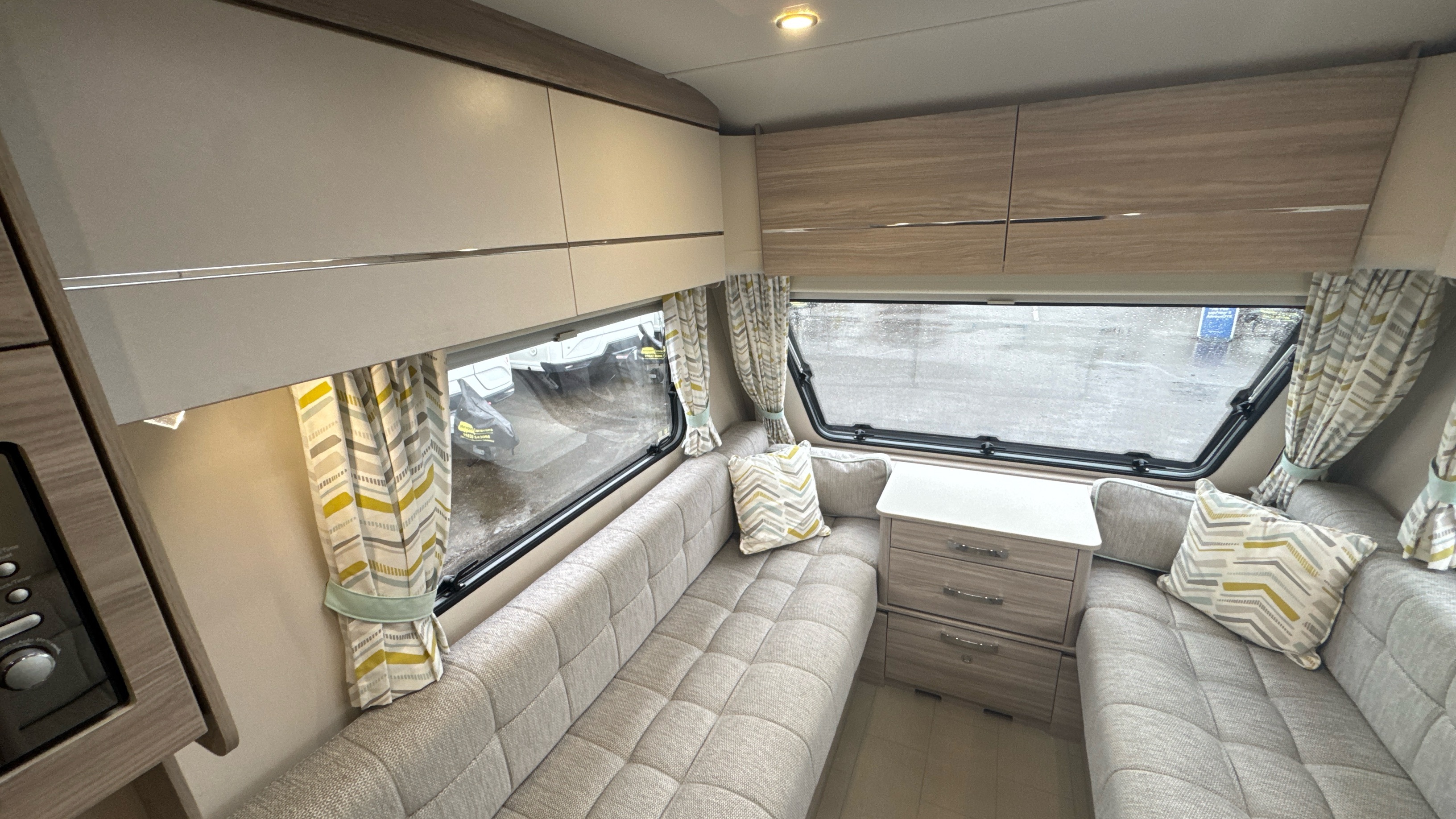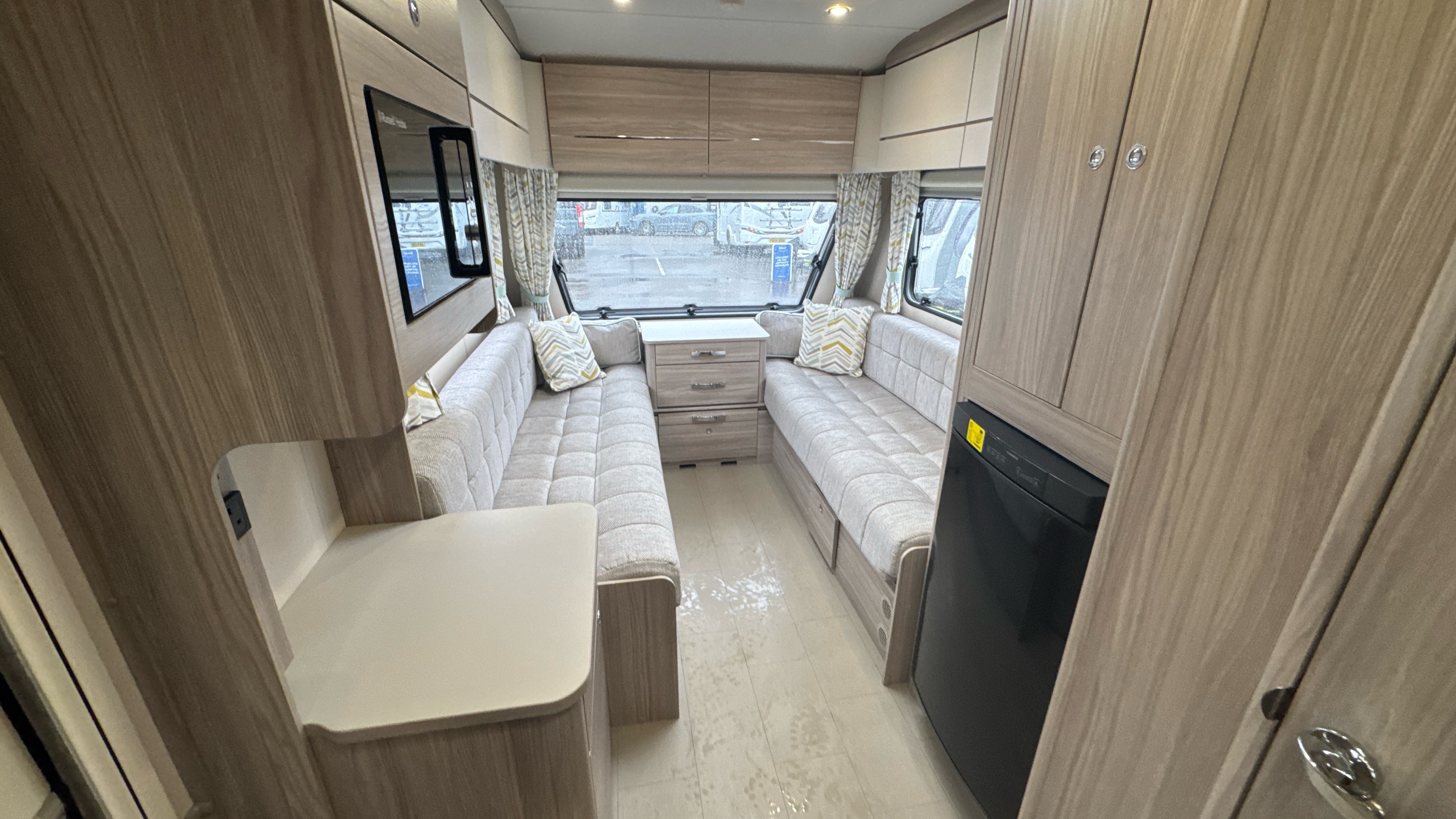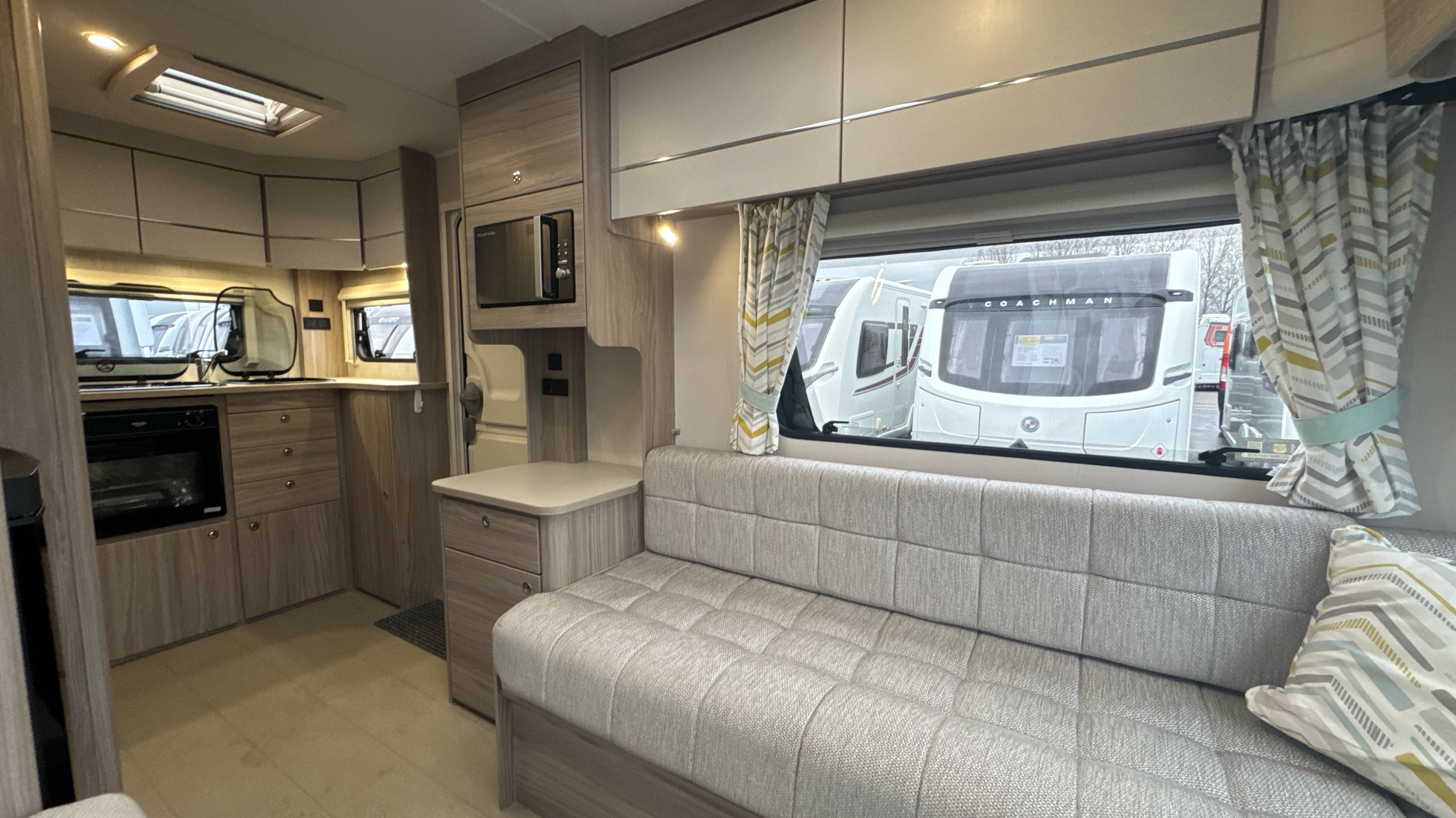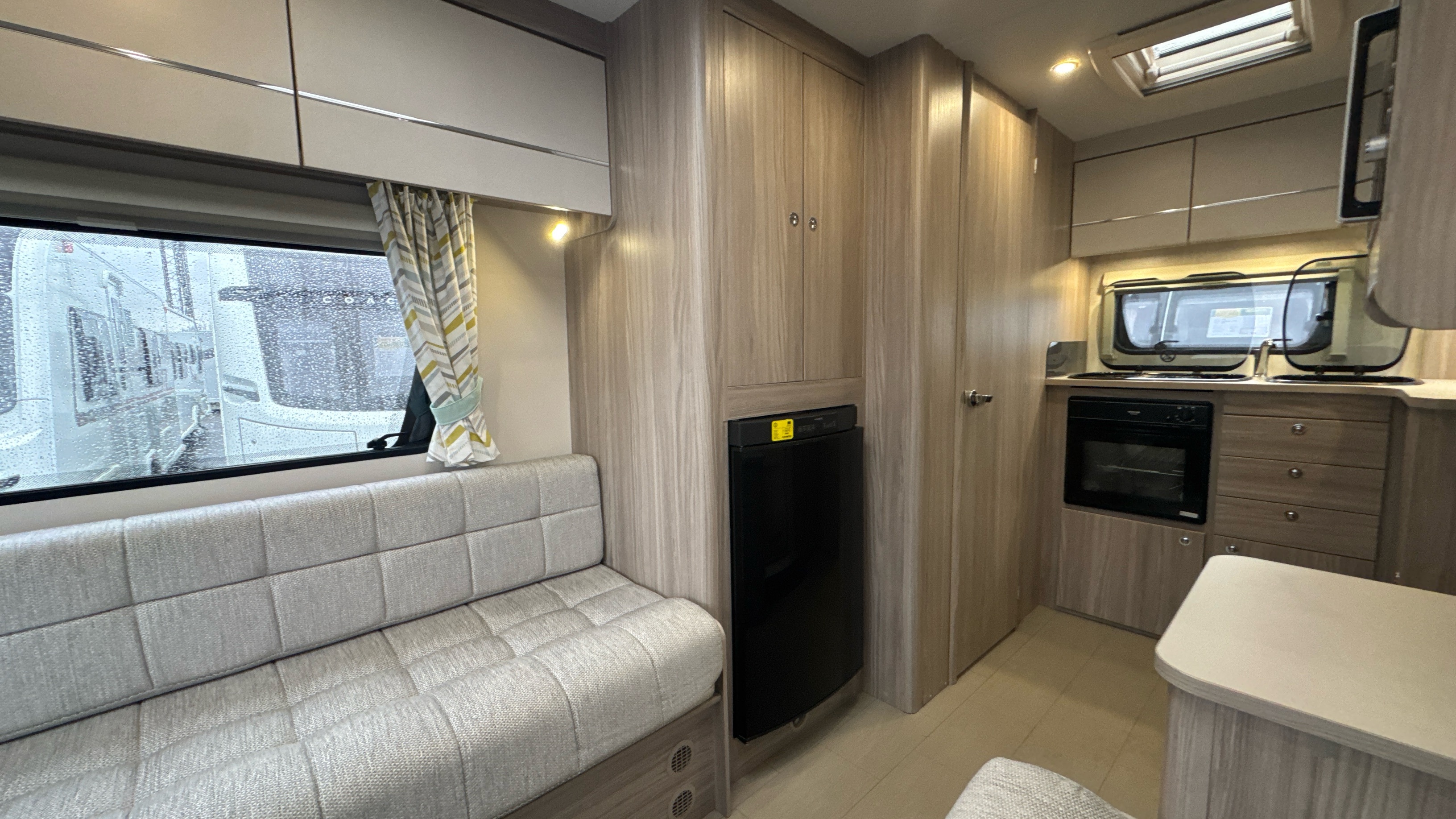 SoLiD bonded construction bodyshell from Elddis, this extremely lightweight two berth tourer features an ample size L-shape rear kitchen configuration with 3-way dometic fridge with integral freezer compartment, thetford Duplex gas oven/grill combo with 3-burner gas gob and folding glass lid, recessed washing up sink with clip on draining board and modern chrome hot and cold mixer tap and acres of useable upper and lower storage solutions.