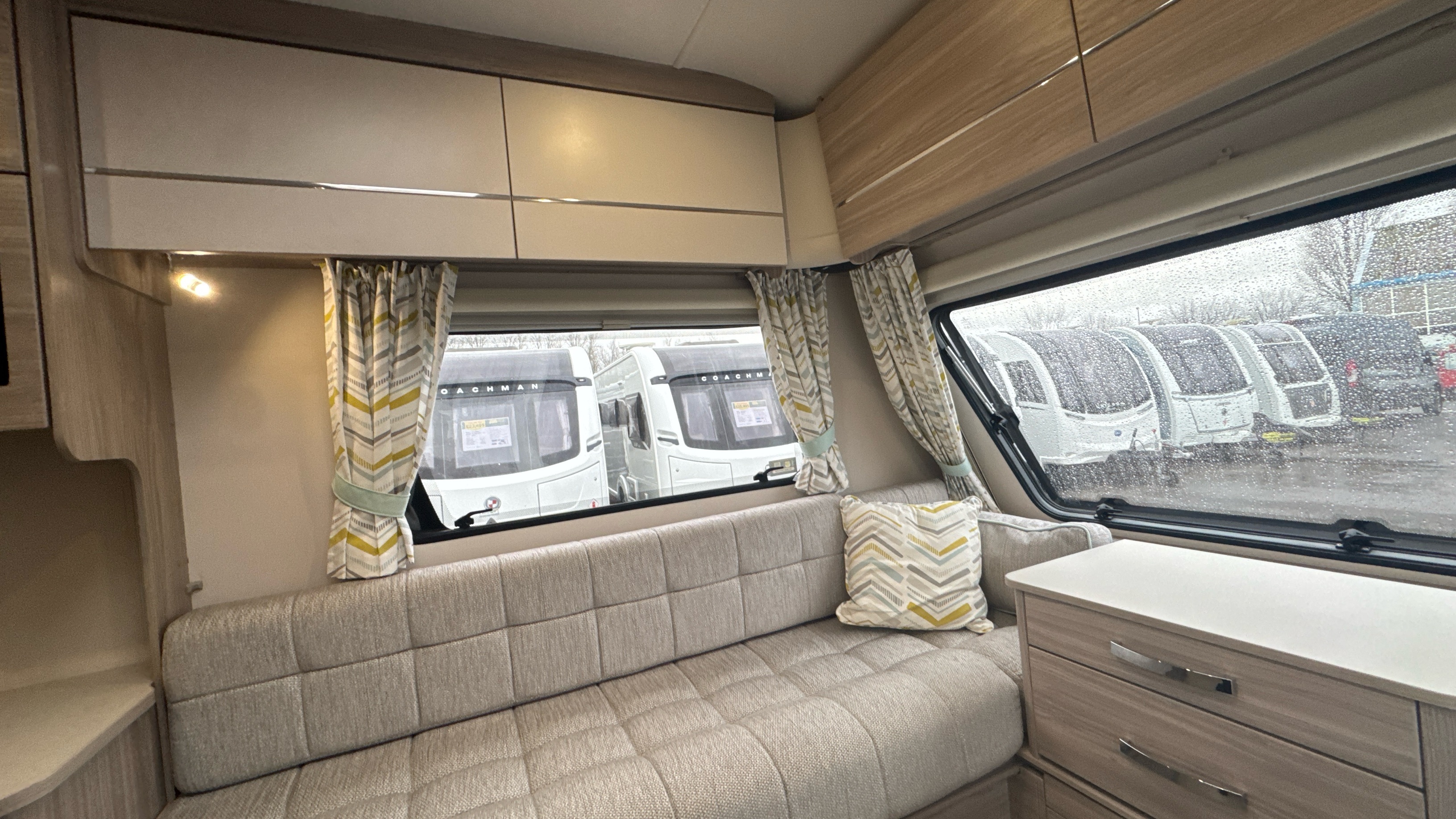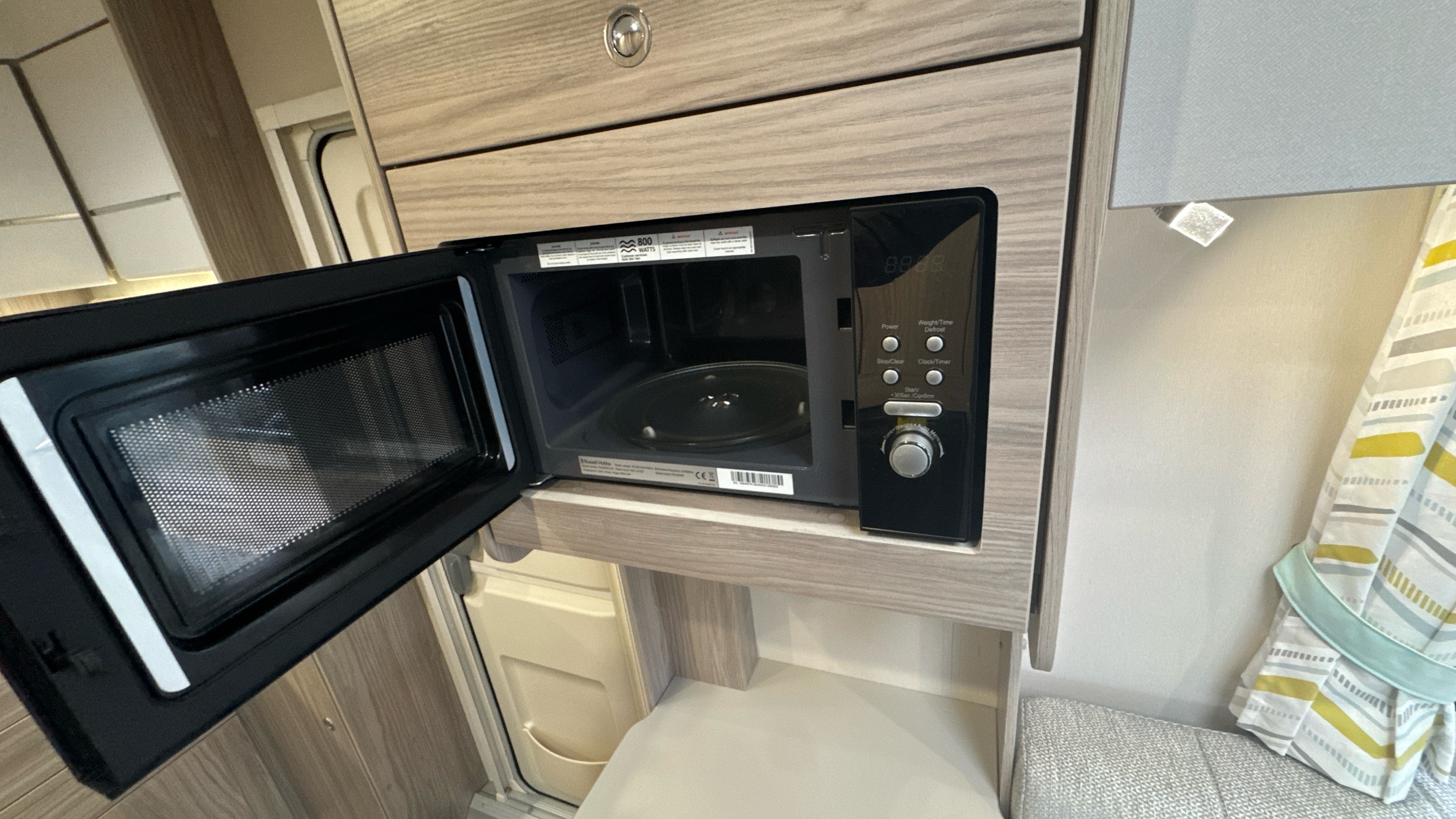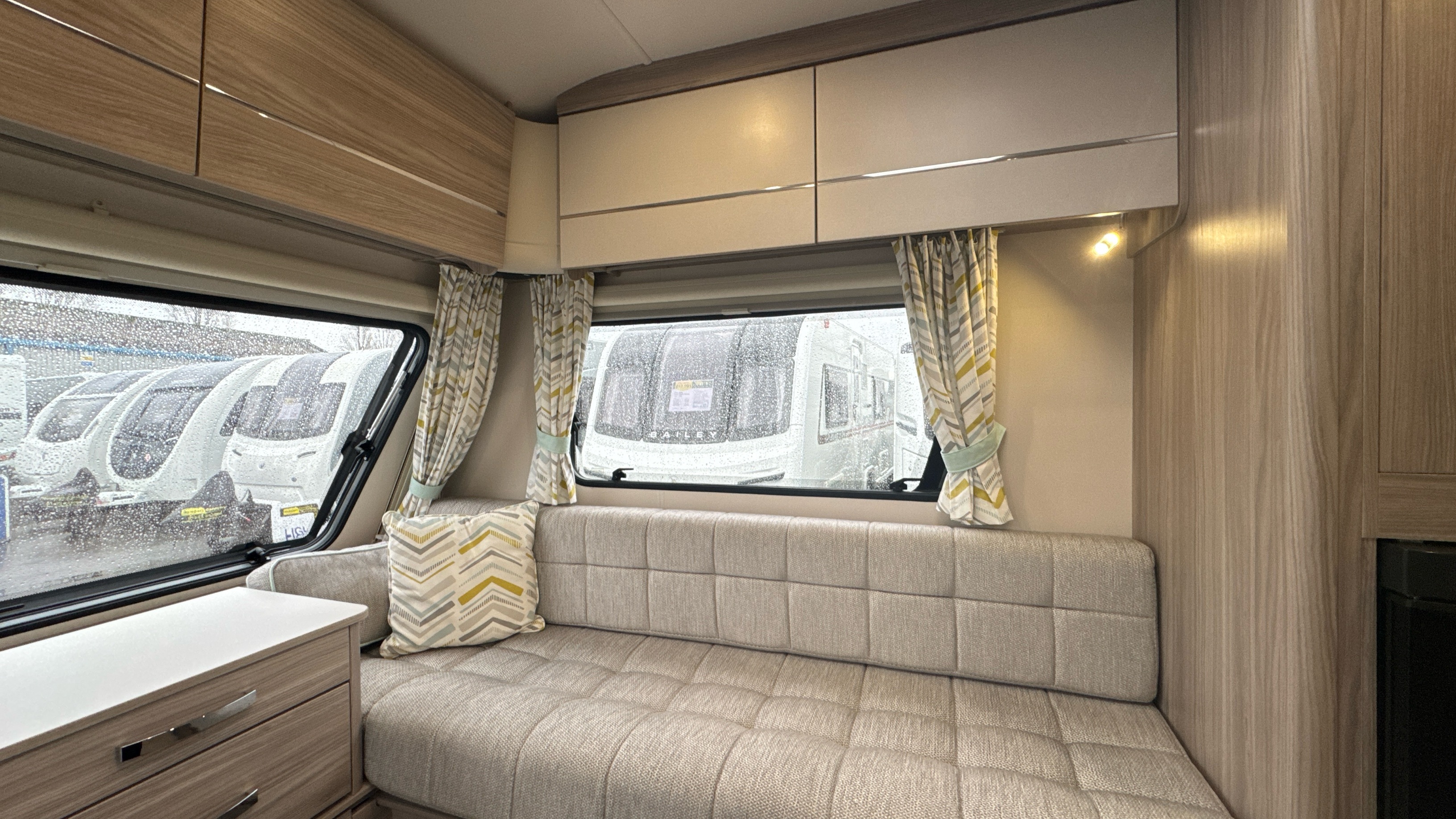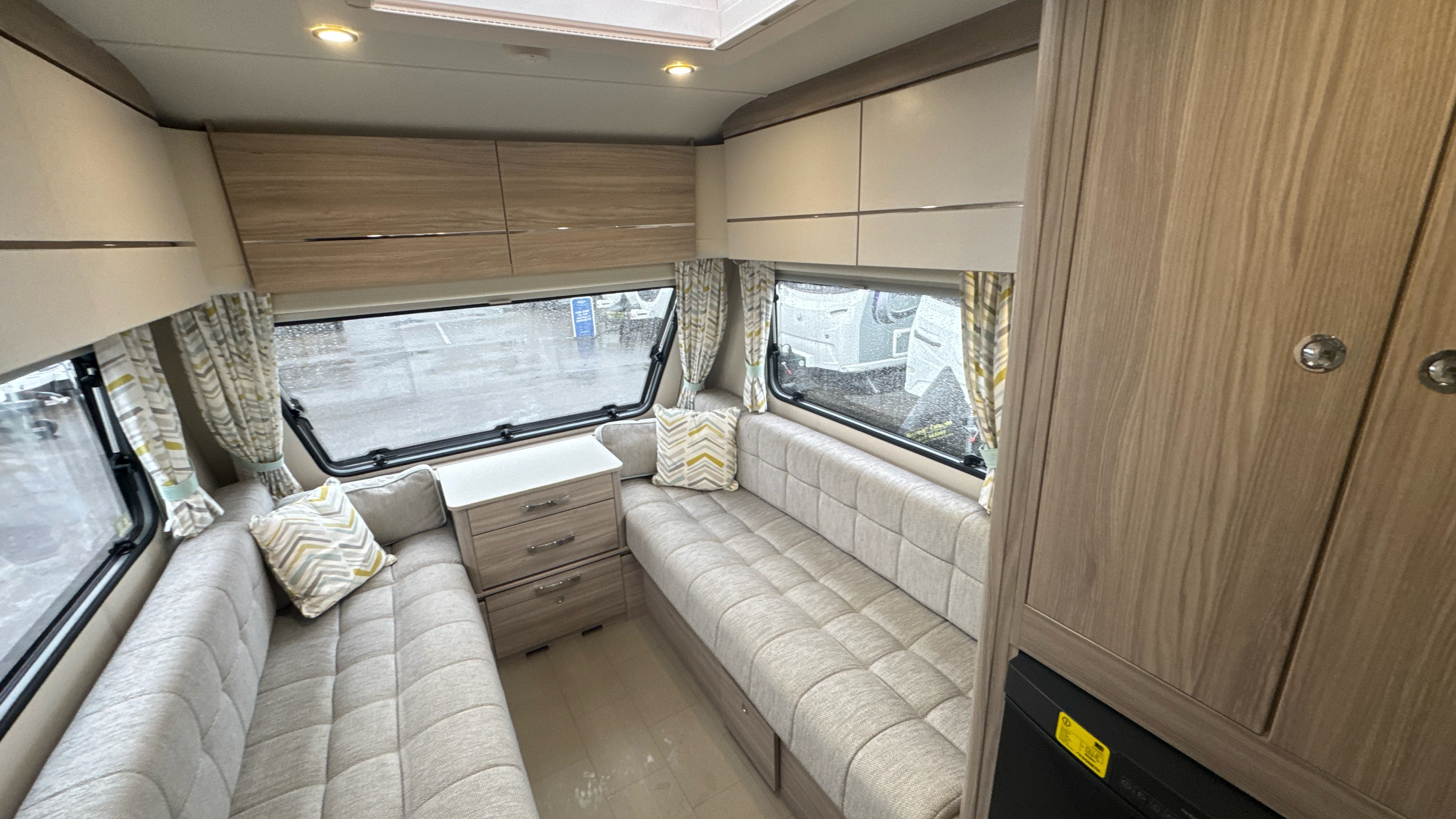 SoLiD bonded construction bodyshell from Elddis, this extremely lightweight two berth tourer features an ample size L-shape rear kitchen configuration with 3-way dometic fridge with integral freezer compartment, thetford Duplex gas oven/grill combo with 3-burner gas gob and folding glass lid, recessed washing up sink with clip on draining board and modern chrome hot and cold mixer tap and acres of useable upper and lower storage solutions.