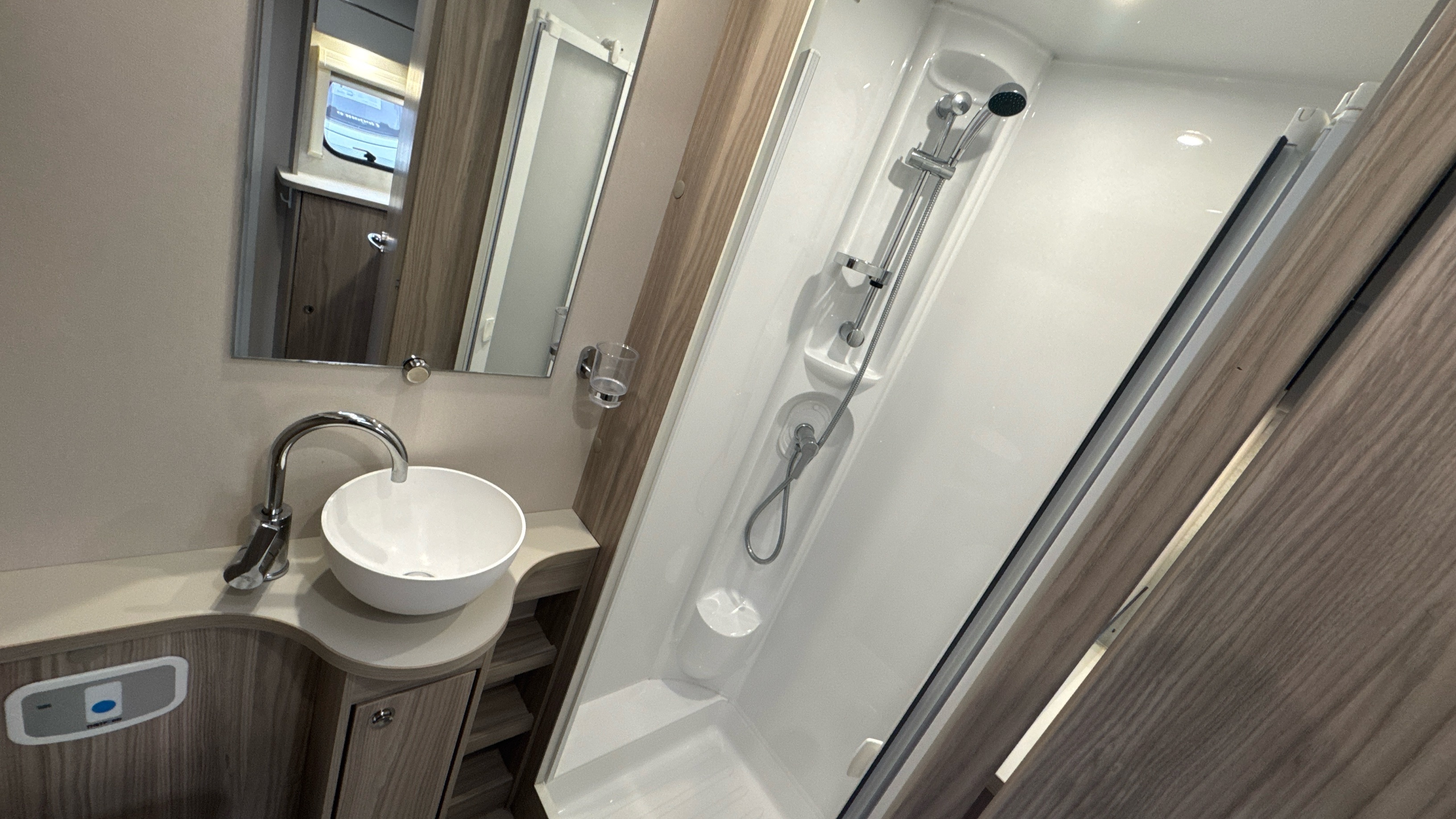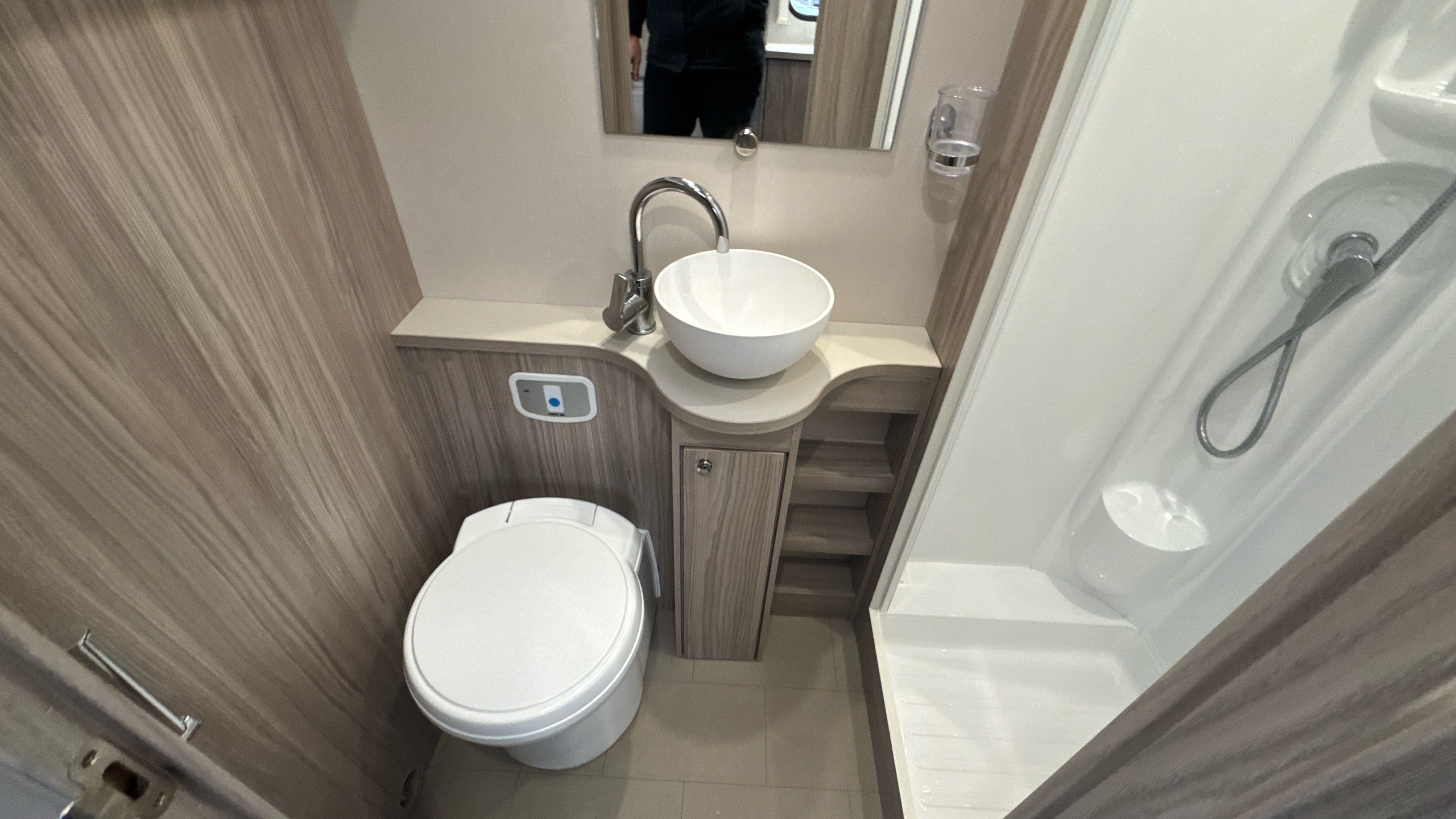 Rear corner bathroom which features a walk in - fully lined seperate shower compartment with hot and cold shower mixer head, thetford swivel cassette chemical toilet and dedicated sink and vanity uit with chrome hot and cold mixer tap.