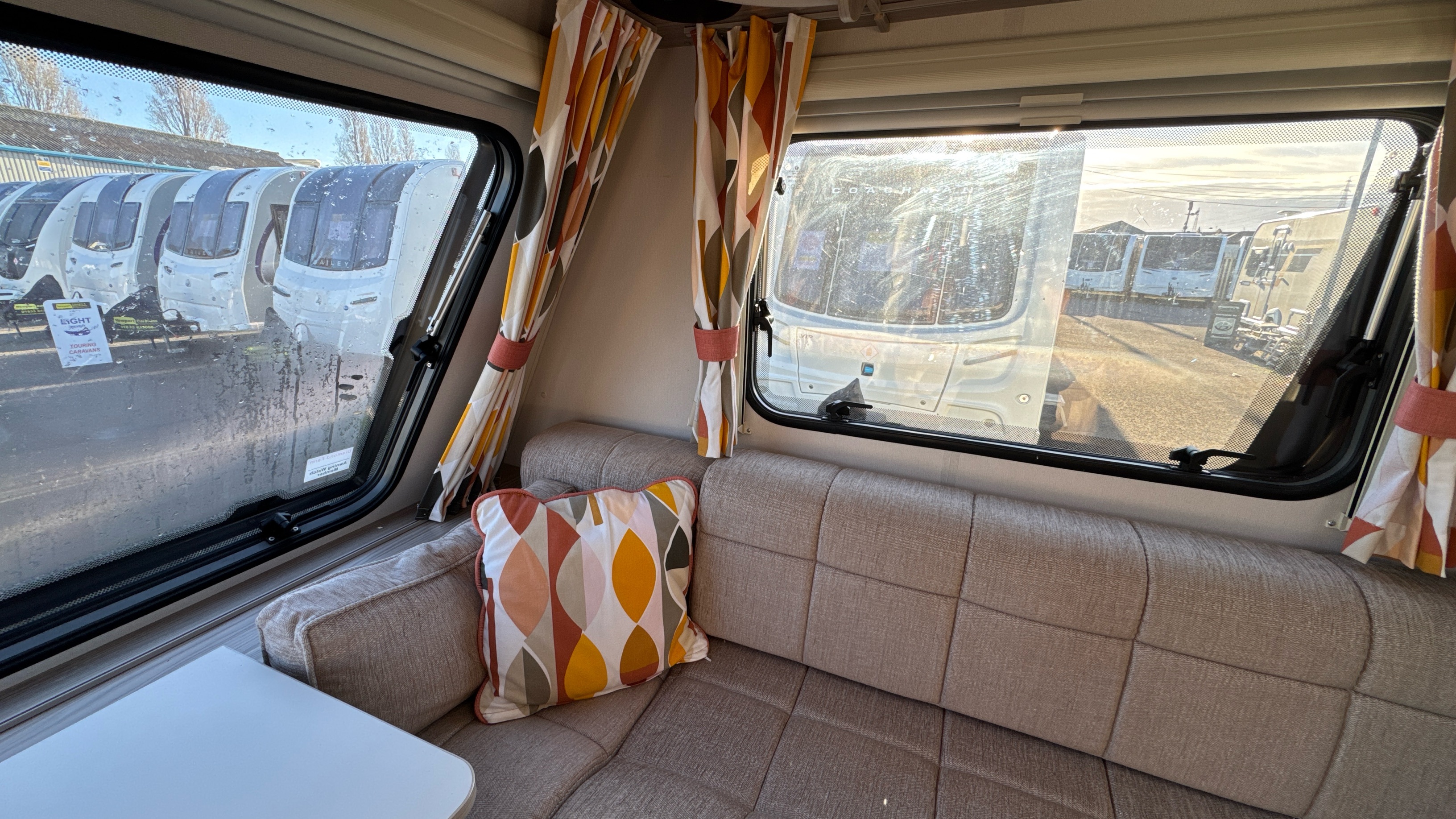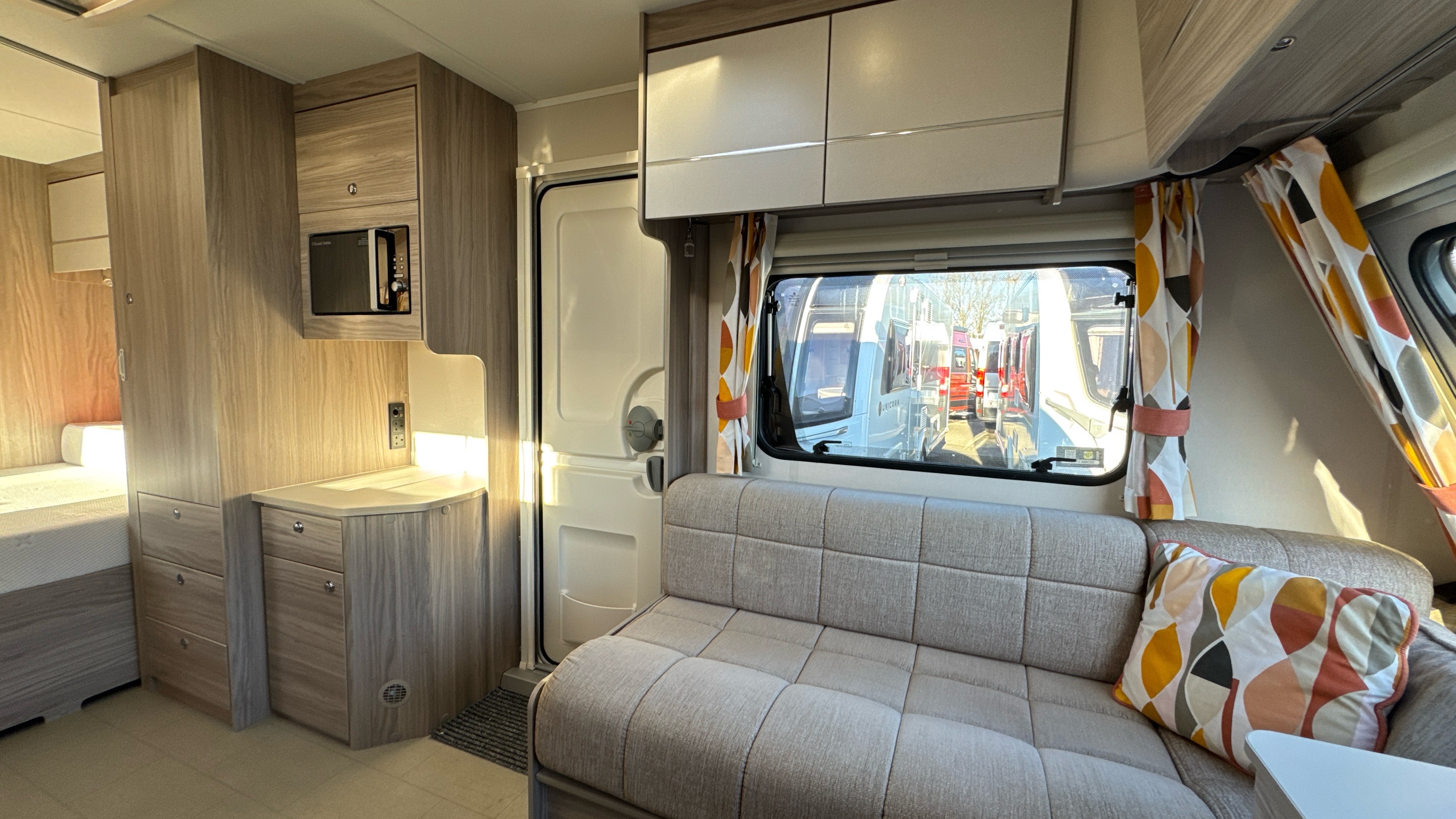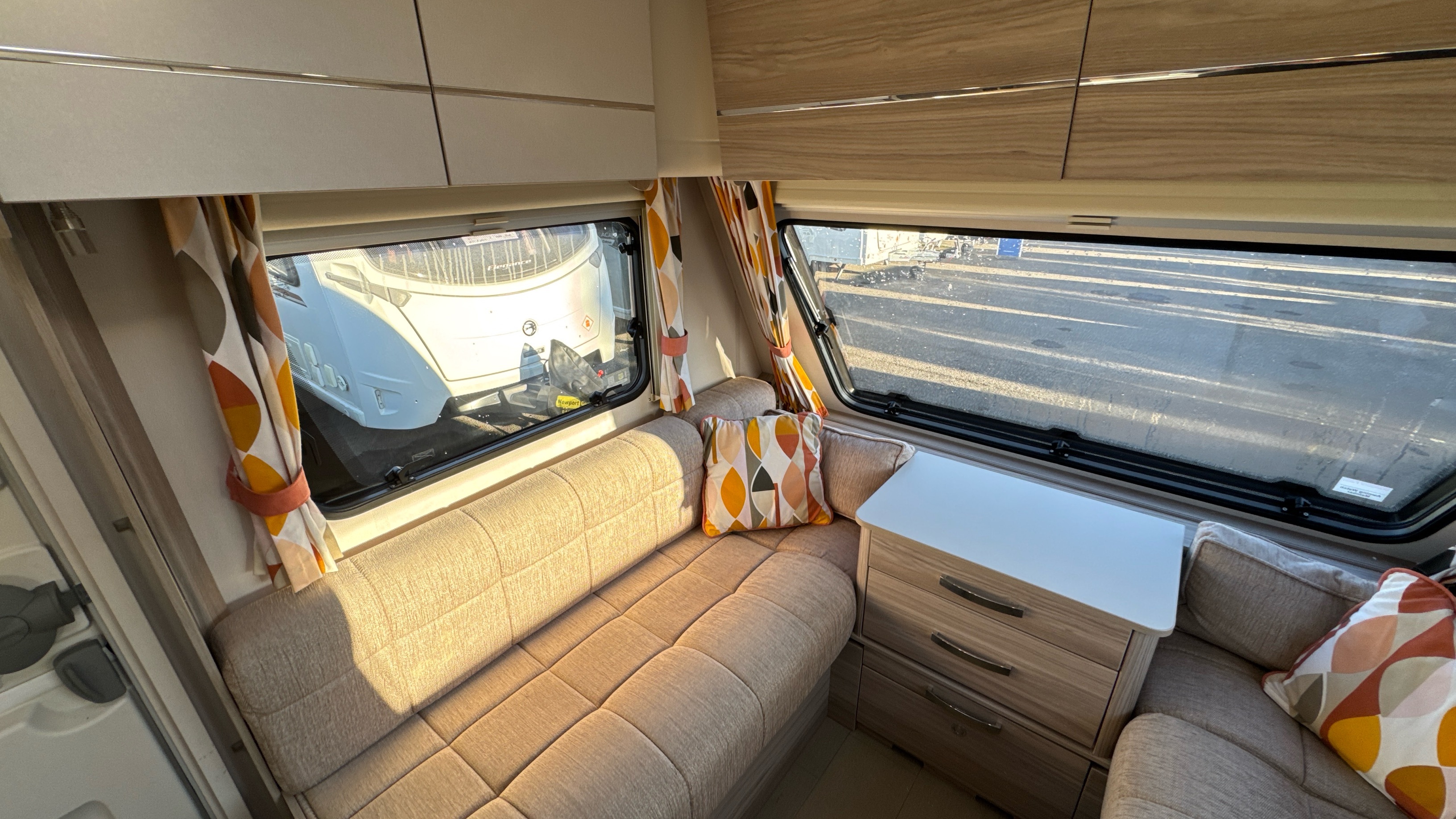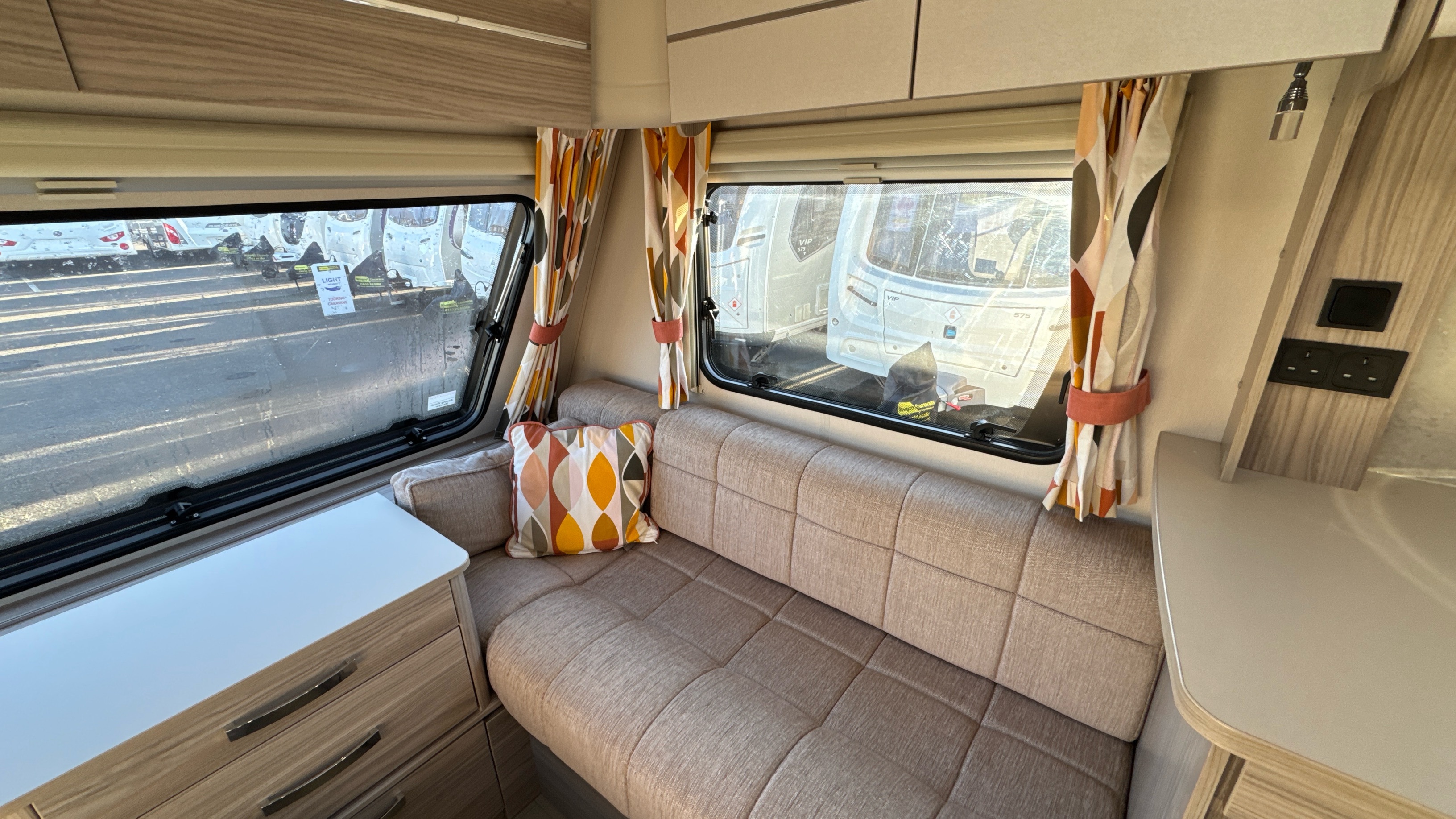 Parallel front lounge arrangement finished off in original and unspoilt soft furnishings with co-ordinated curtains & tie-backs. Front lounge easily converts into a large additional double bed and features a one-piece large landscape window.