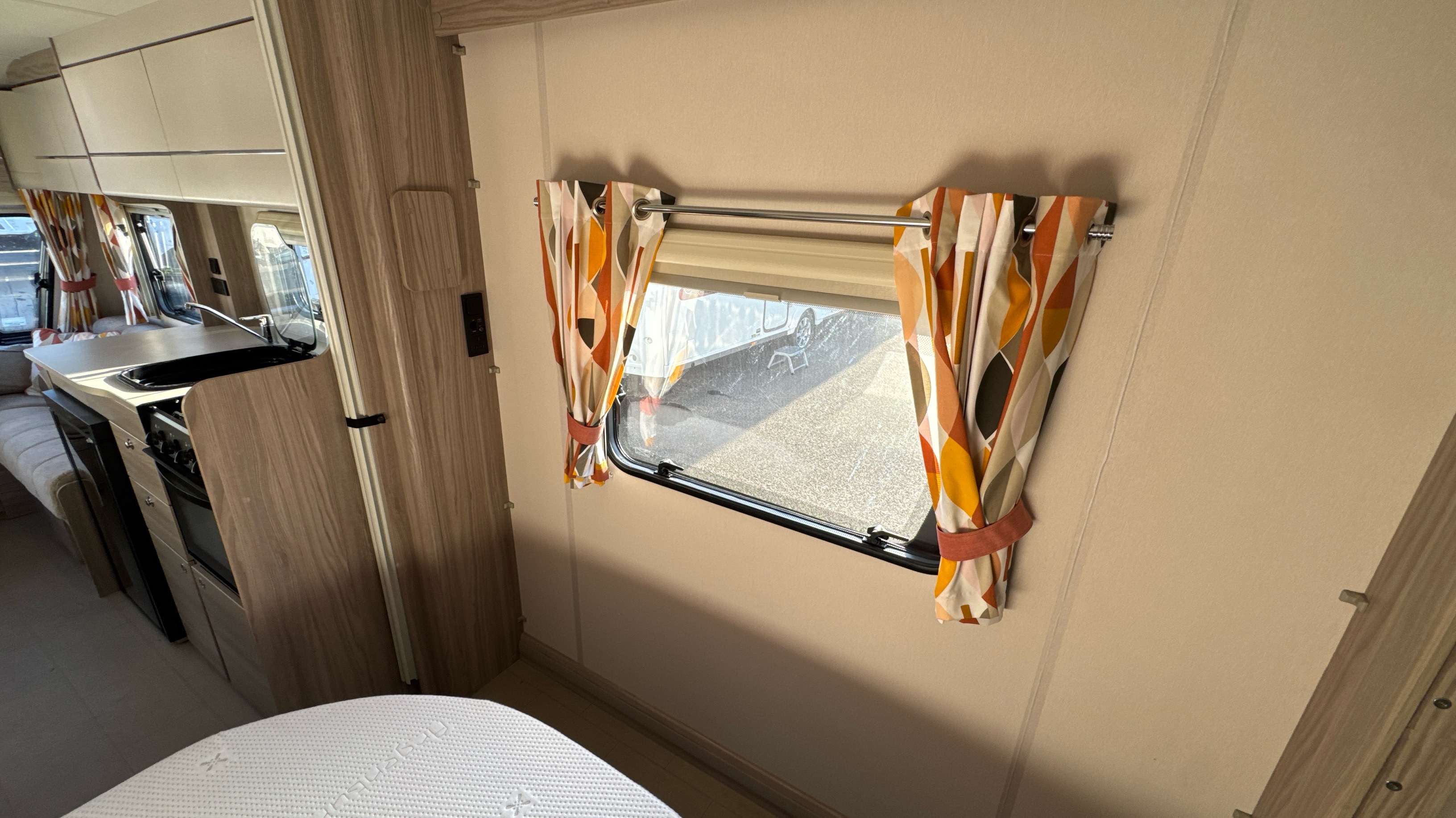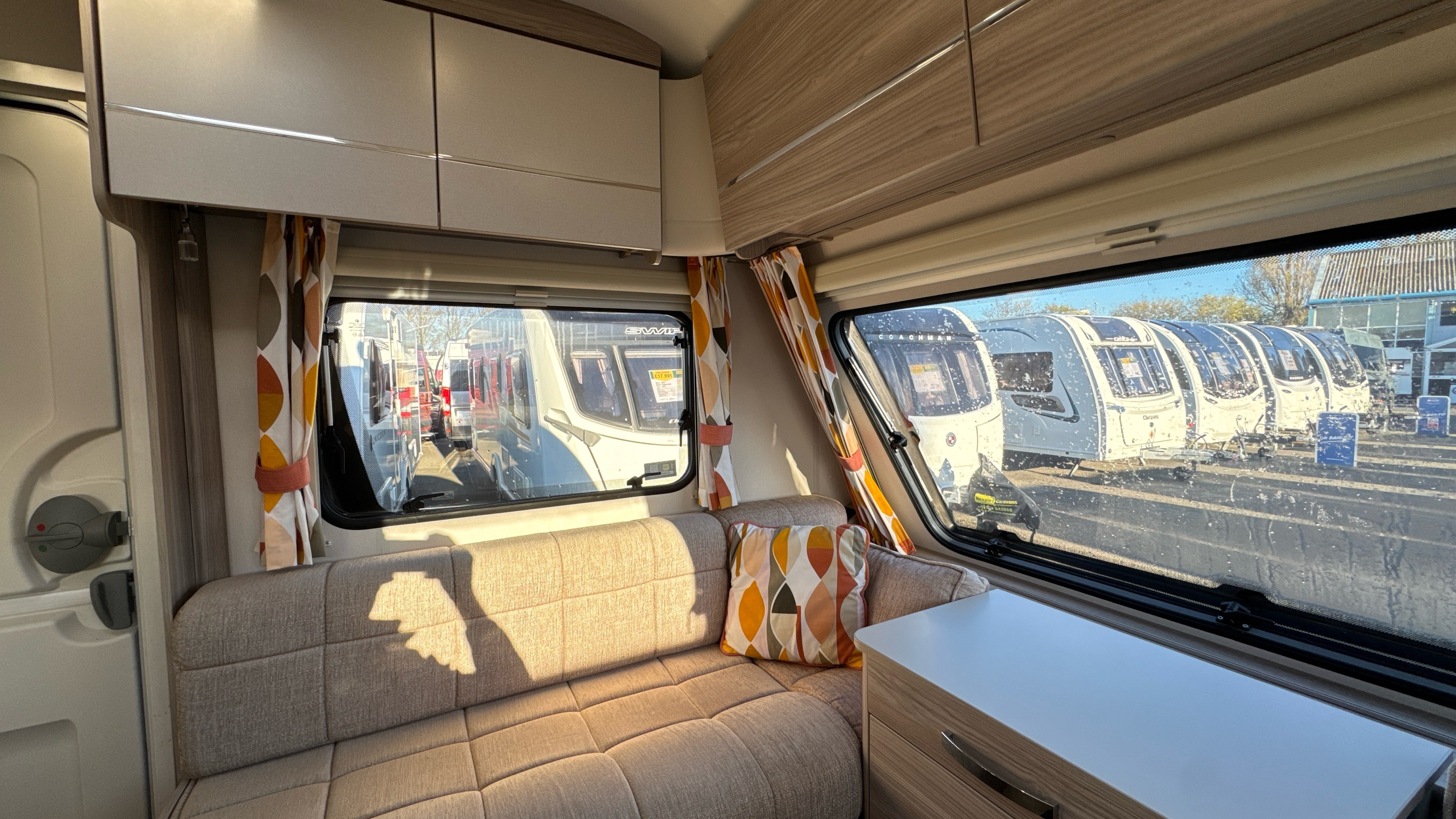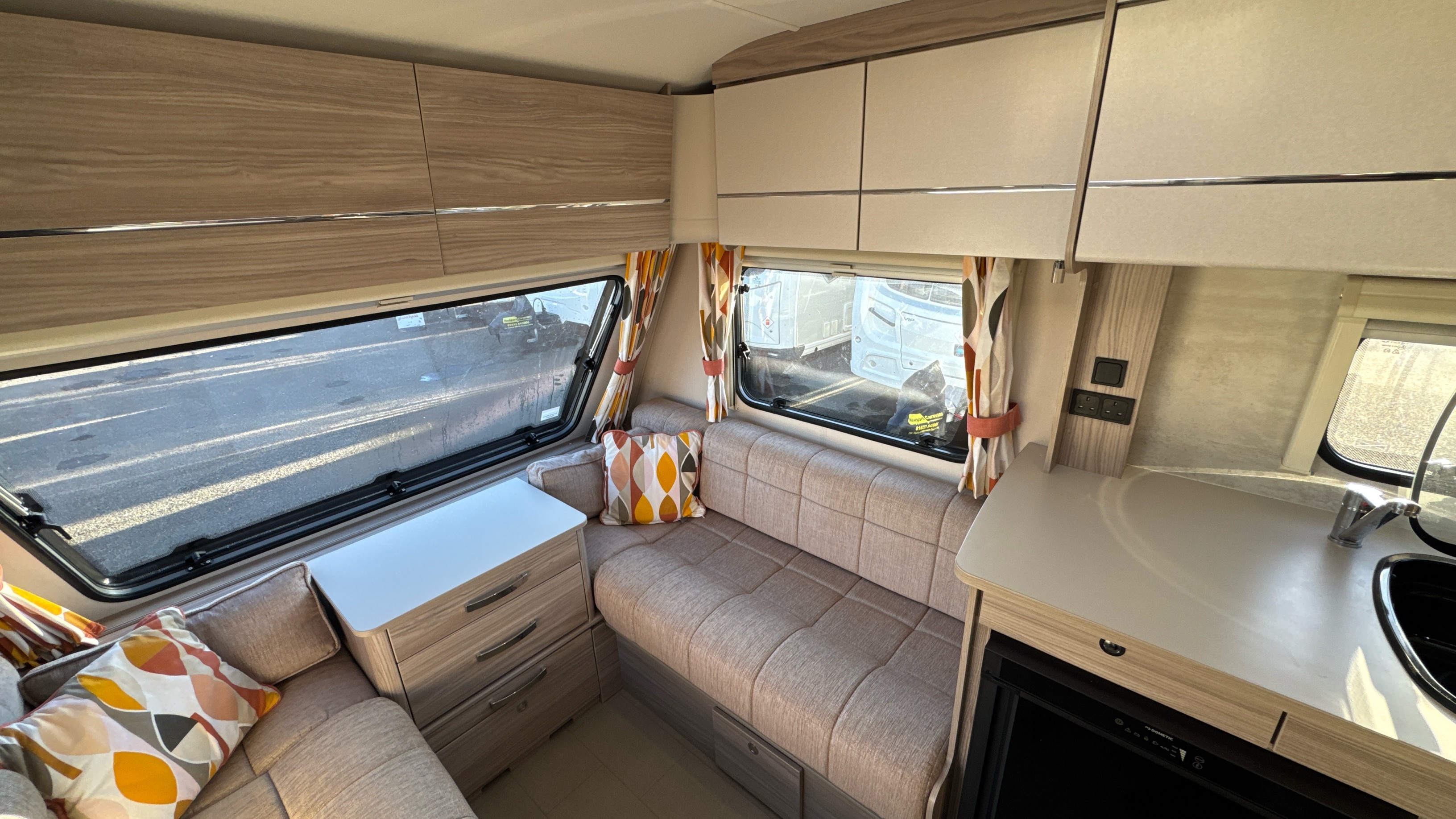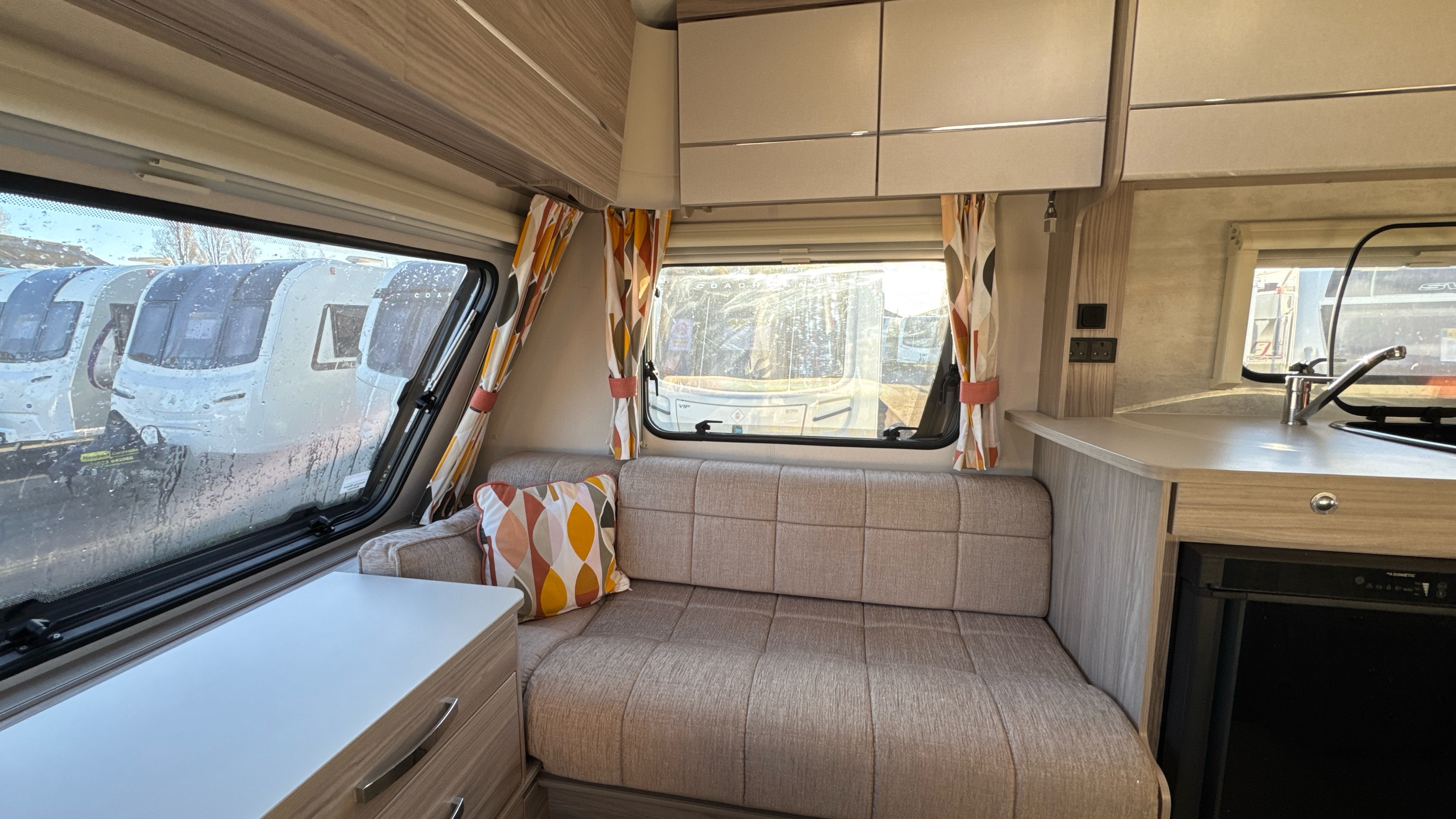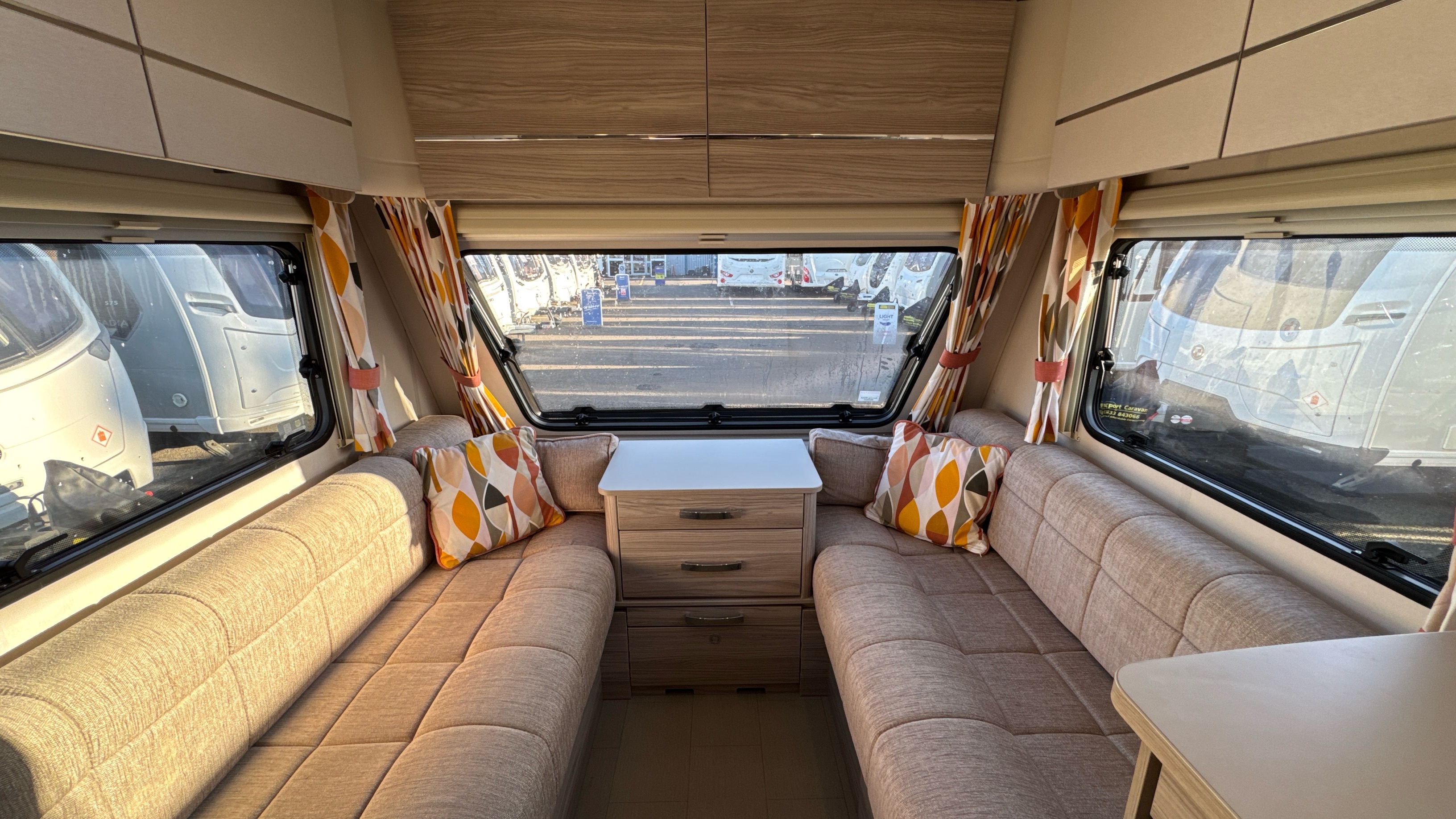 Parallel front lounge arrangement finished off in original and unspoilt soft furnishings with co-ordinated curtains & tie-backs. Front lounge easily converts into a large additional double bed and features a one-piece large landscape window.