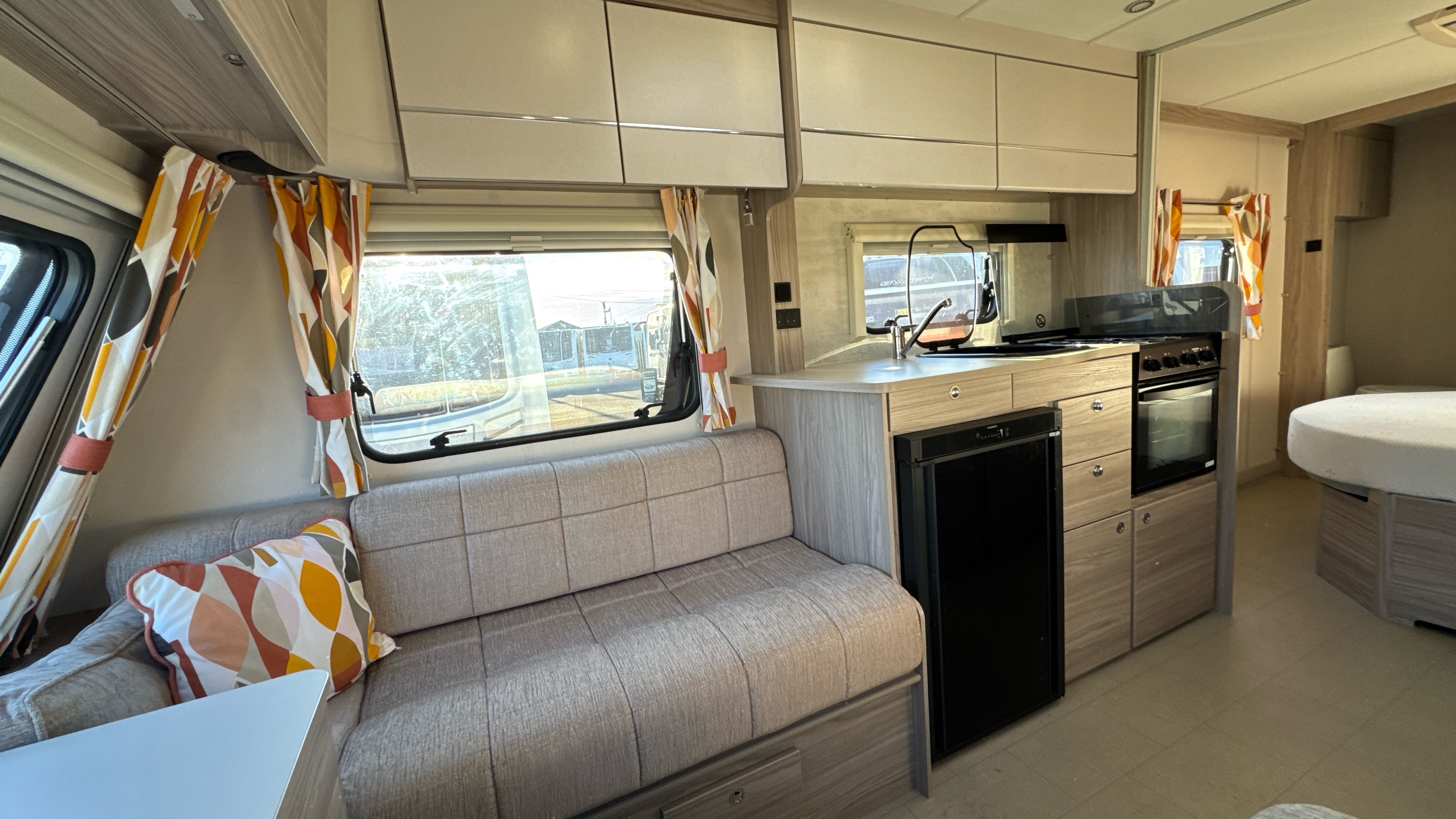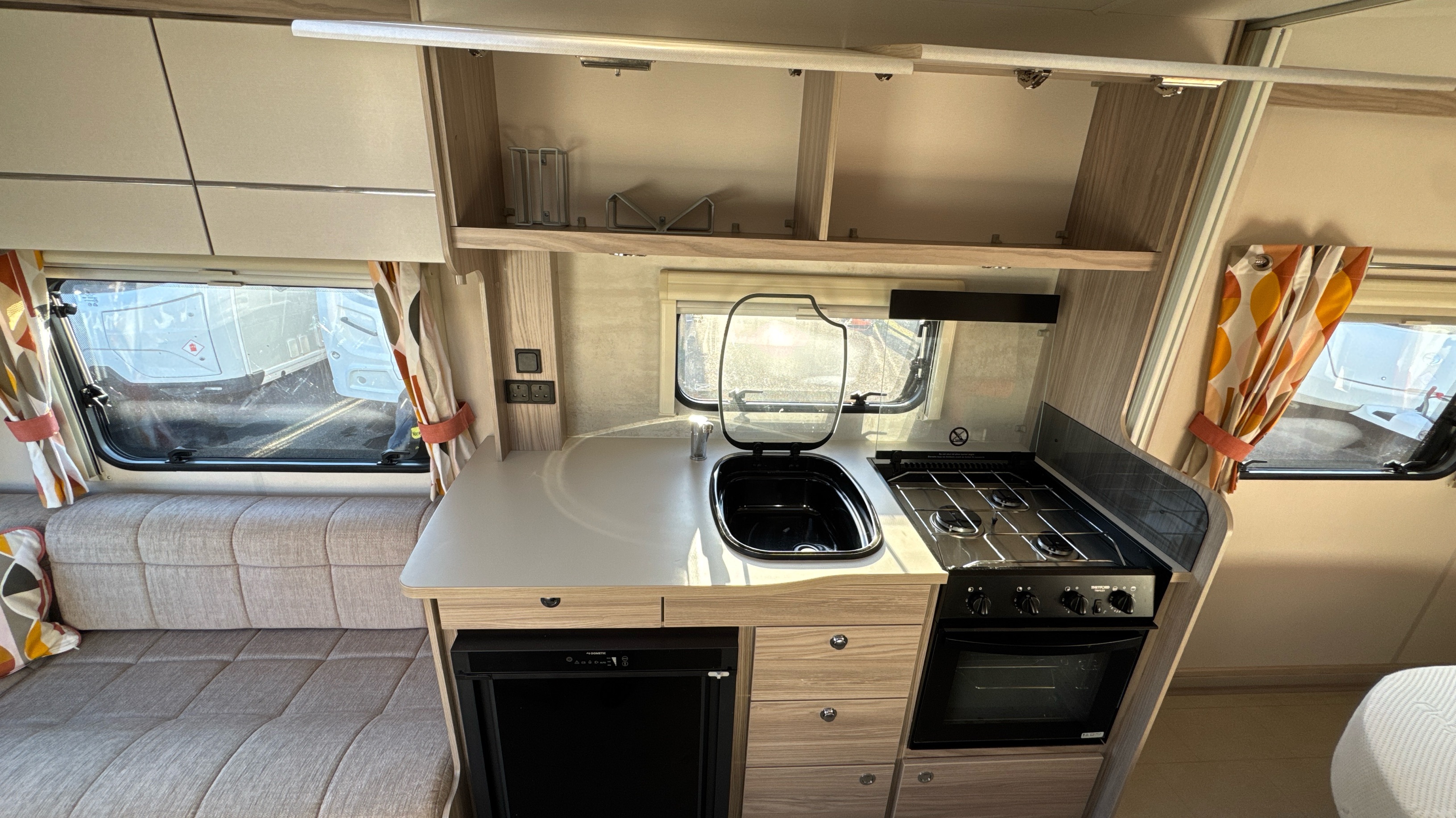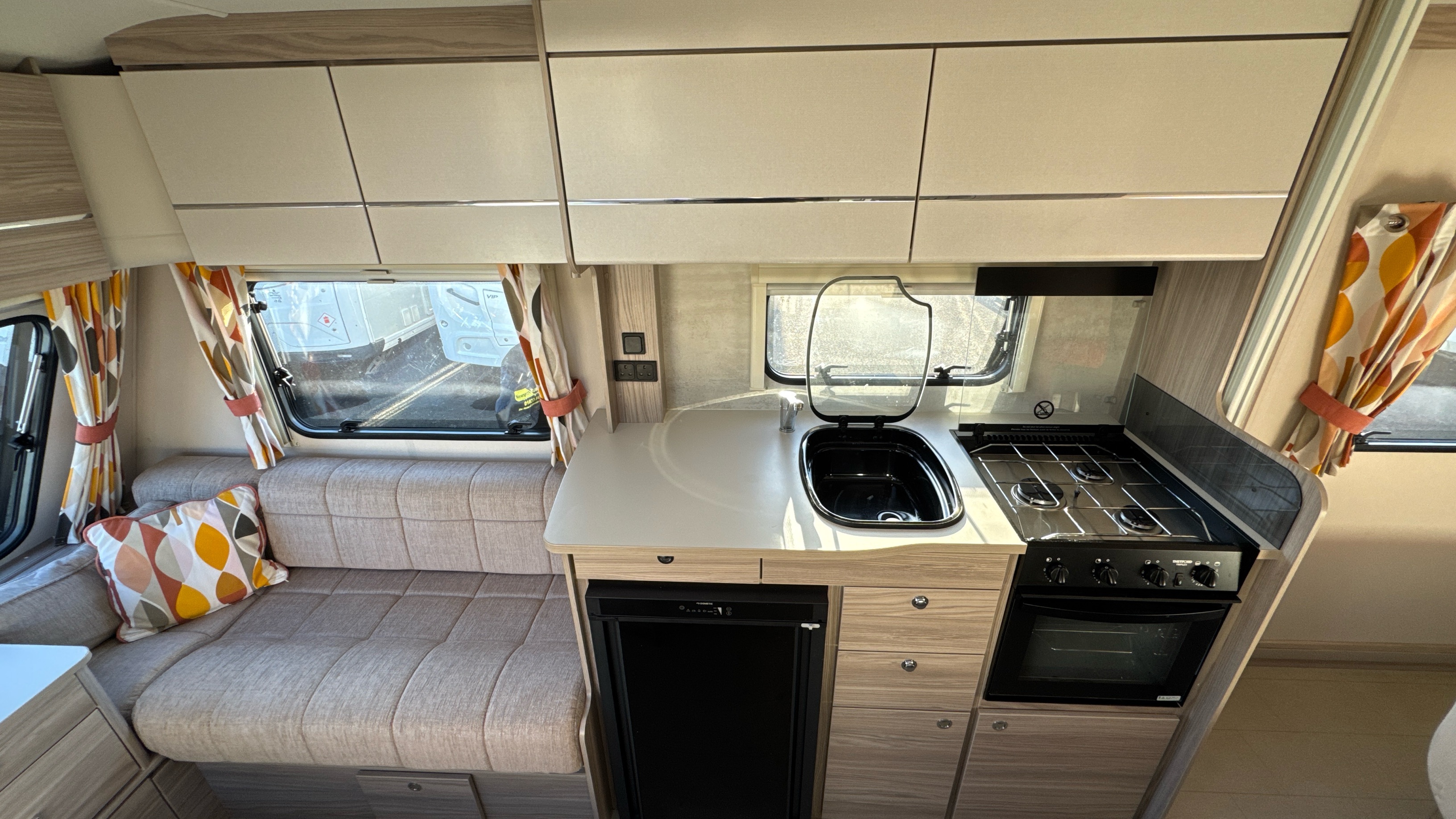 Well appointed centrally located kitchen complete with gas operated Thetford Duplex combi grill/ovena nd 3-burner gas hob with folding glass lid, recessed black washing up sink with modern chrome hot and cold mixer tap, Dometic gloss black fronted 3-way fridge with intgral freezer compartment and facotry fitted microwave(which was an additional cost option from the factory when new).