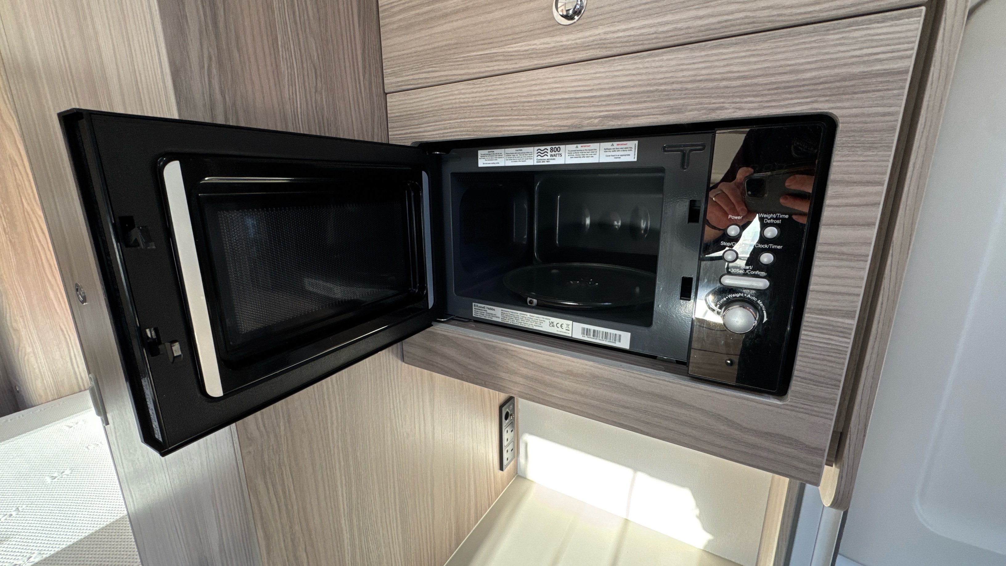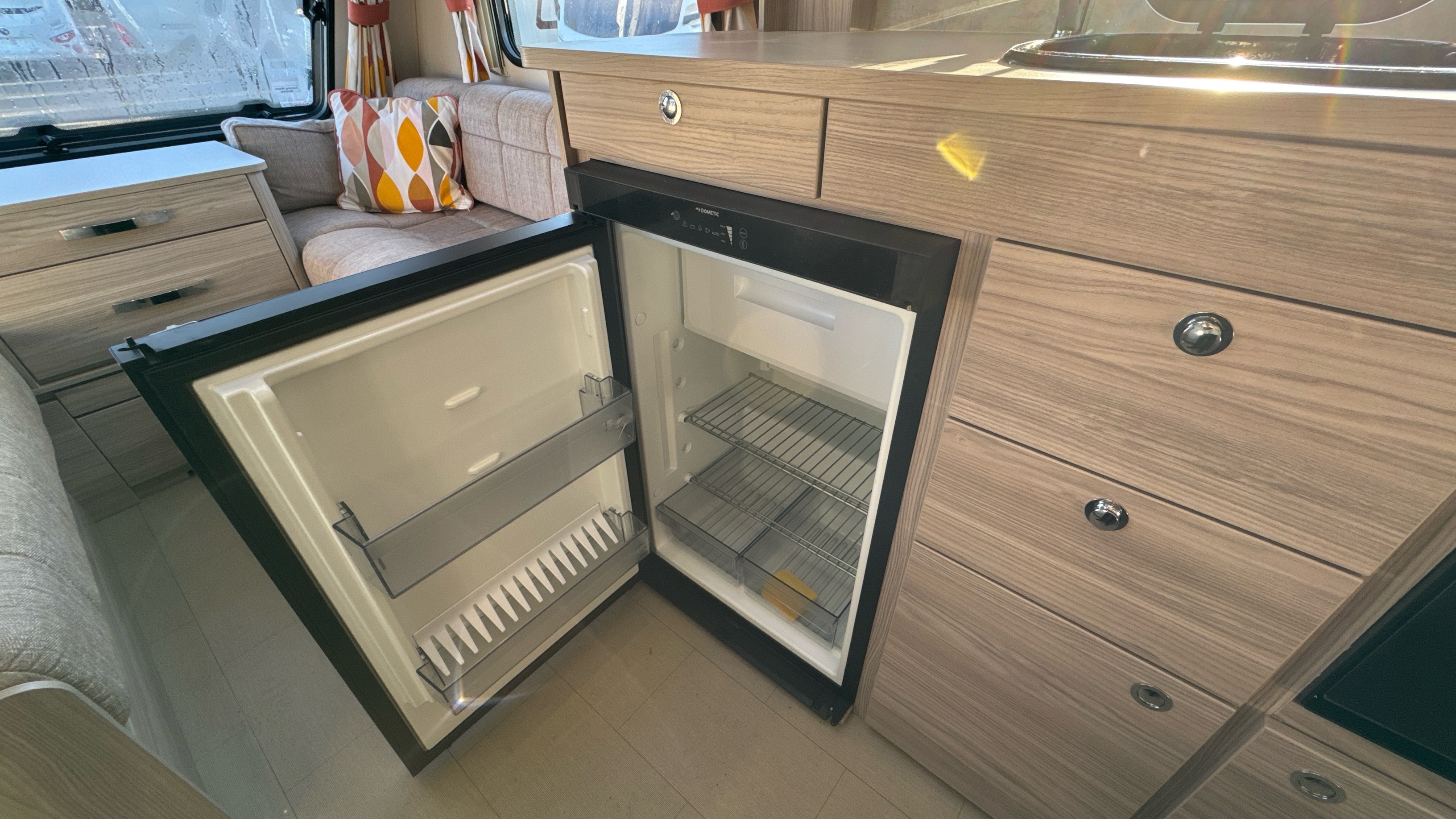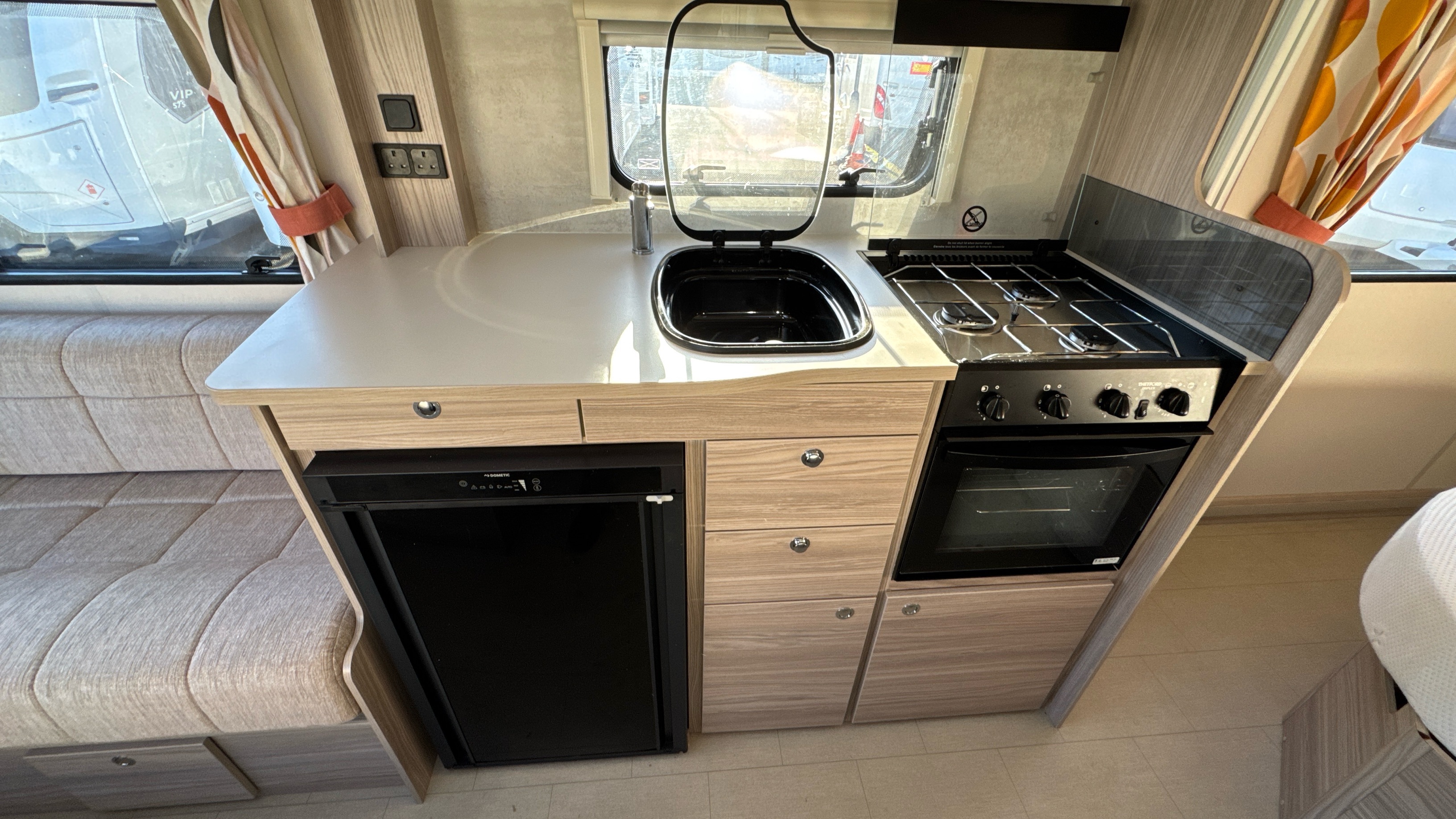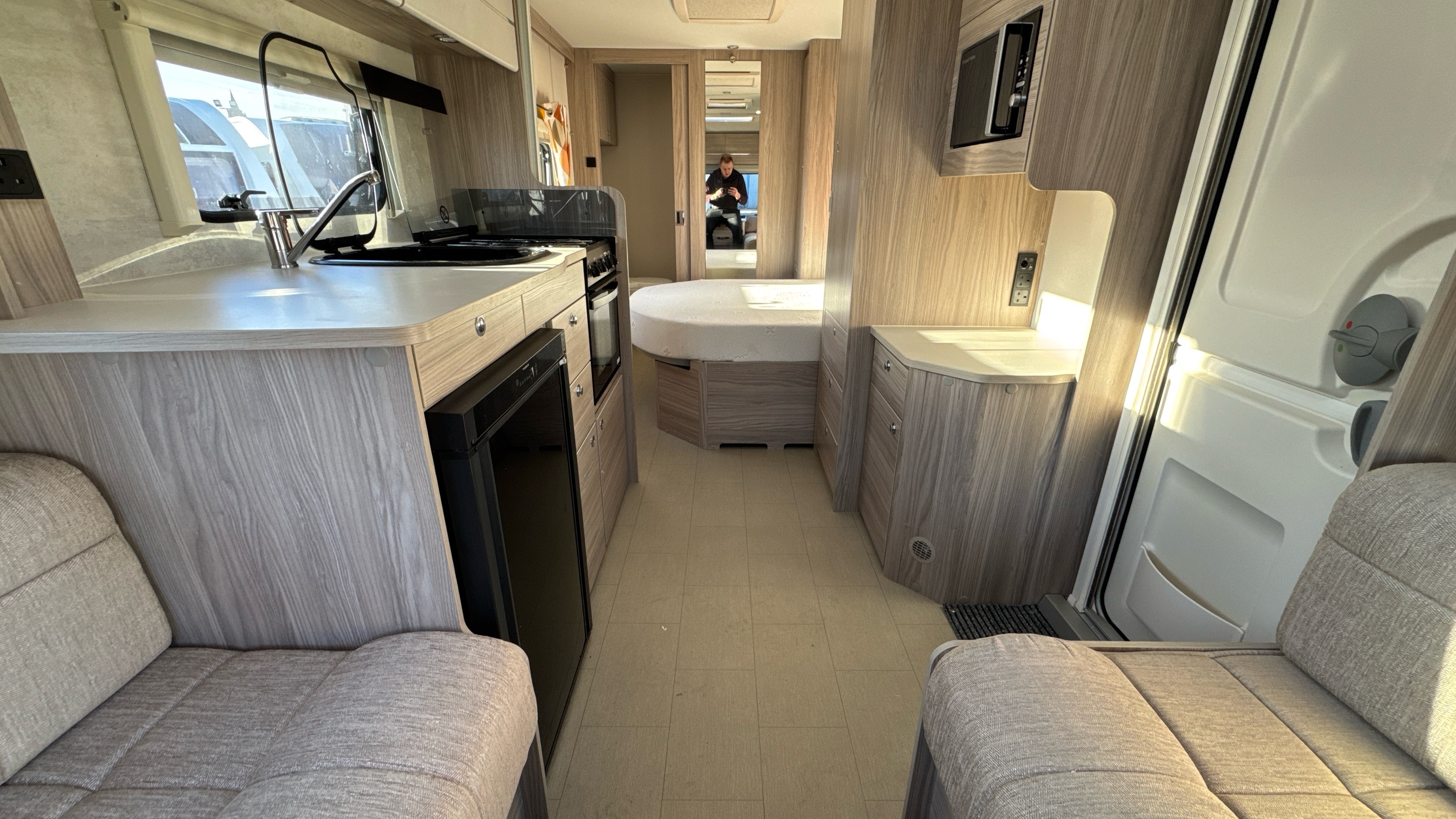 Well appointed centrally located kitchen complete with gas operated Thetford Duplex combi grill/ovena nd 3-burner gas hob with folding glass lid, recessed black washing up sink with modern chrome hot and cold mixer tap, Dometic gloss black fronted 3-way fridge with intgral freezer compartment and facotry fitted microwave(which was an additional cost option from the factory when new).
