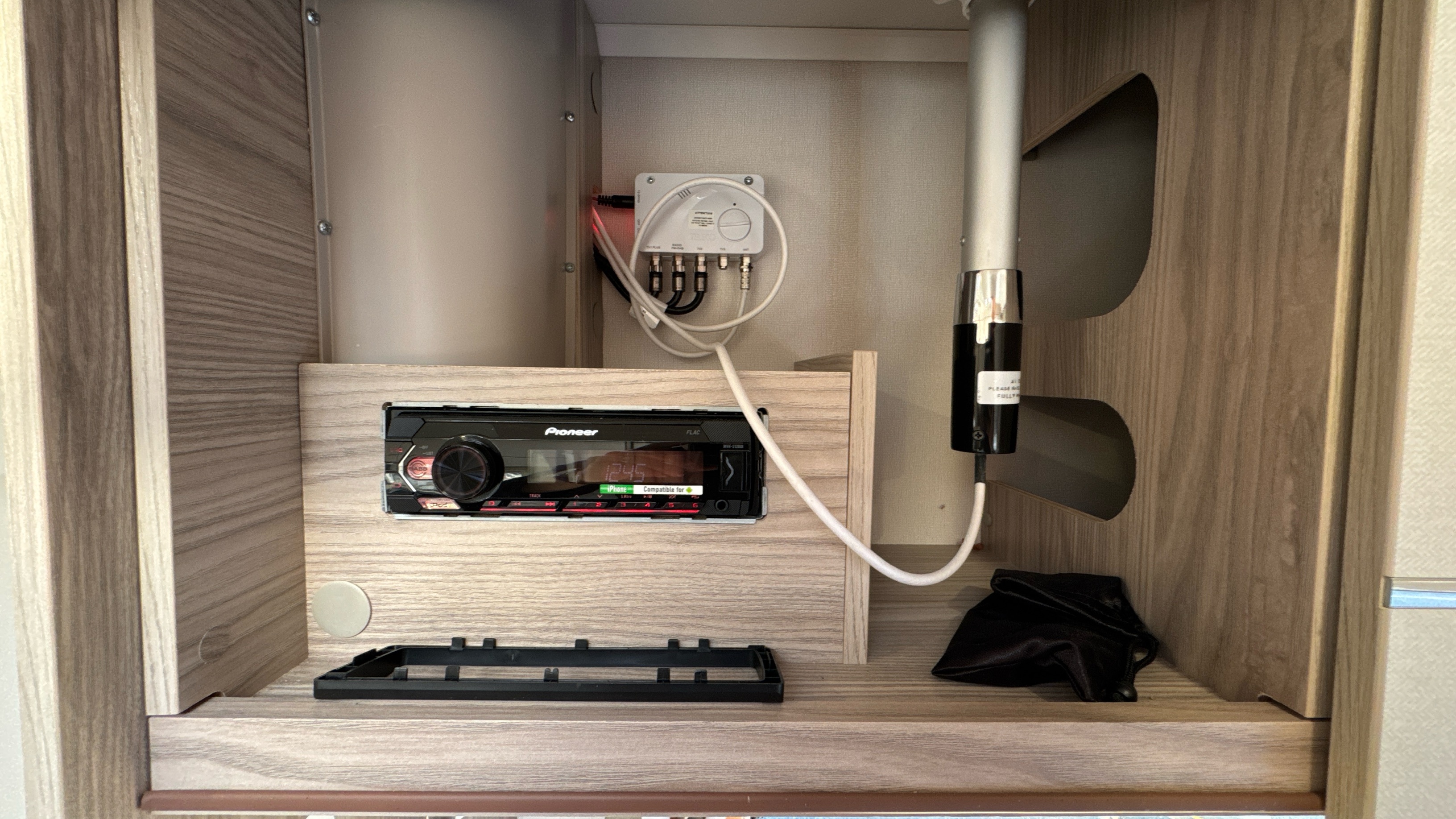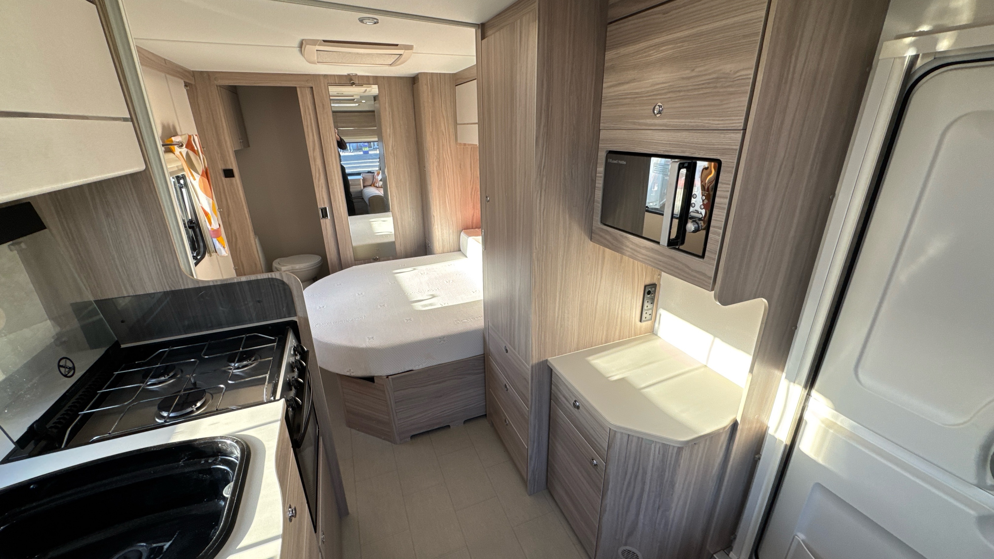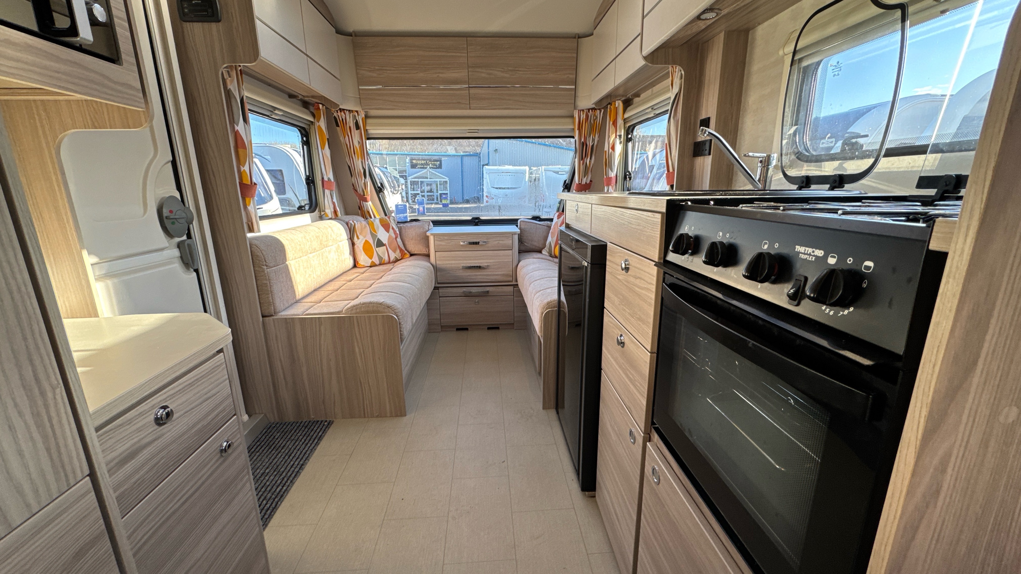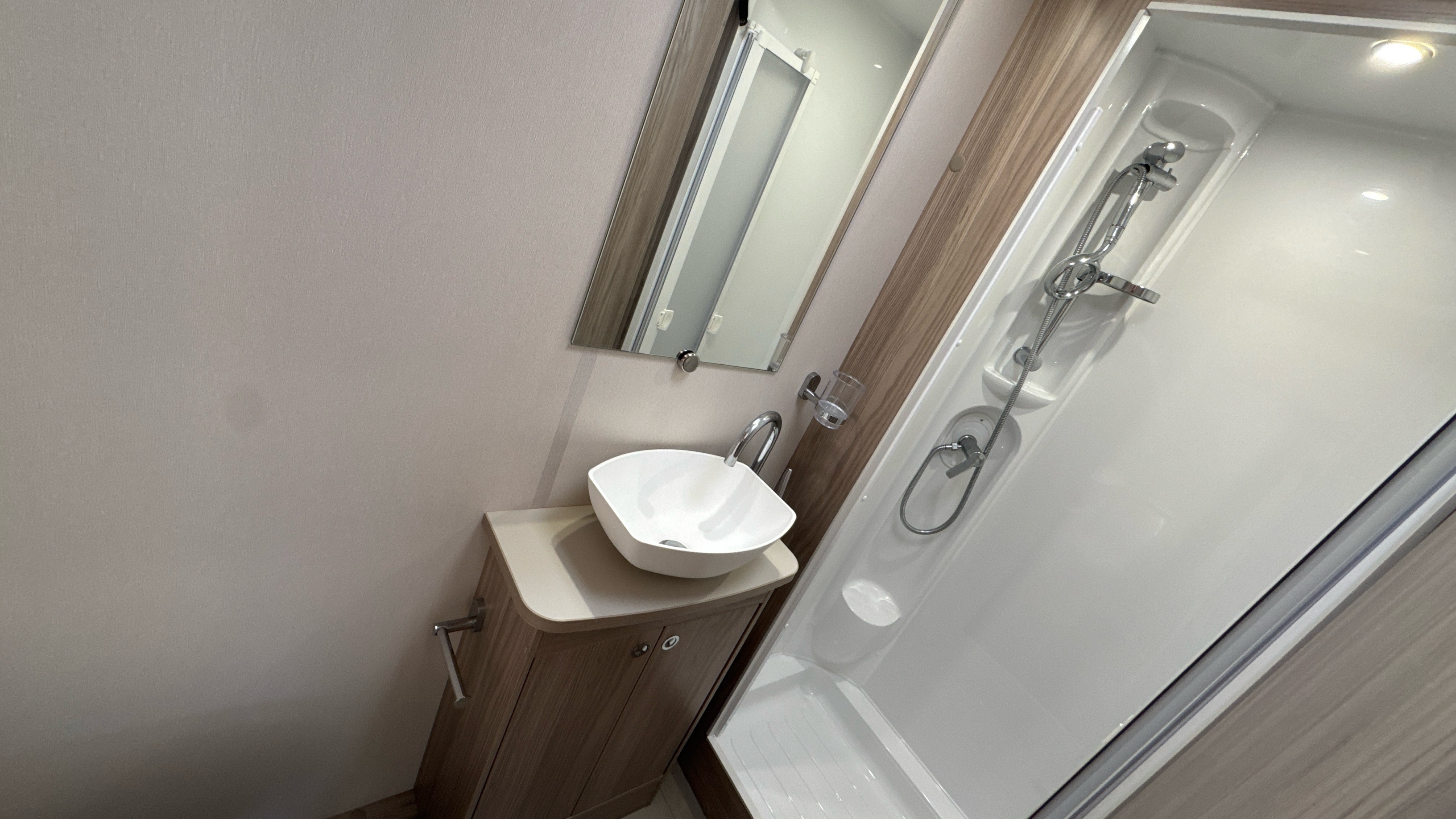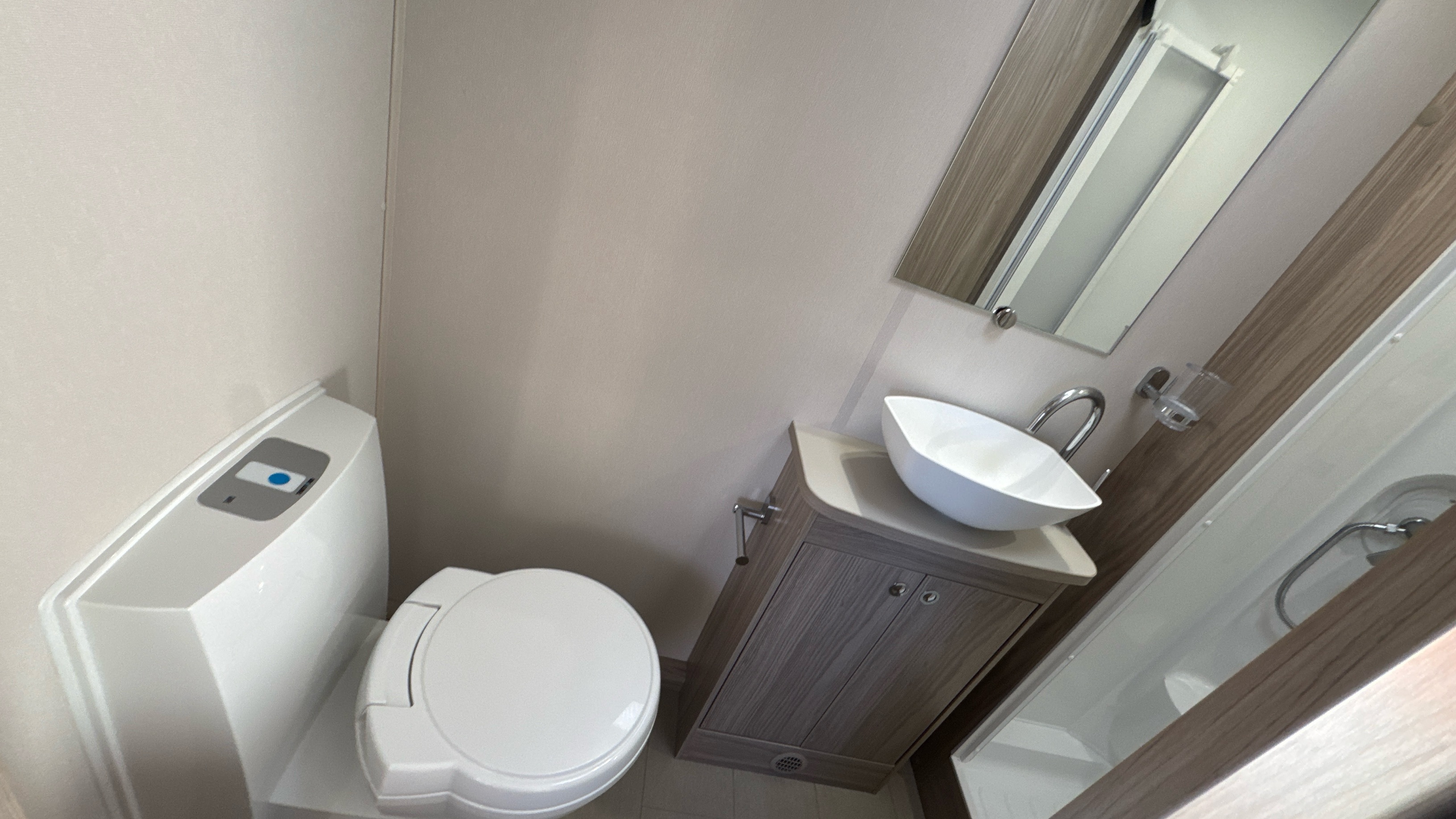 Popular layout which features a full width rear washroom with seperate walk-in shower unit with hot and cold shower mixer head, sink and vanity unit and thetford swivel cassette chemical toilet with electric flush operation.