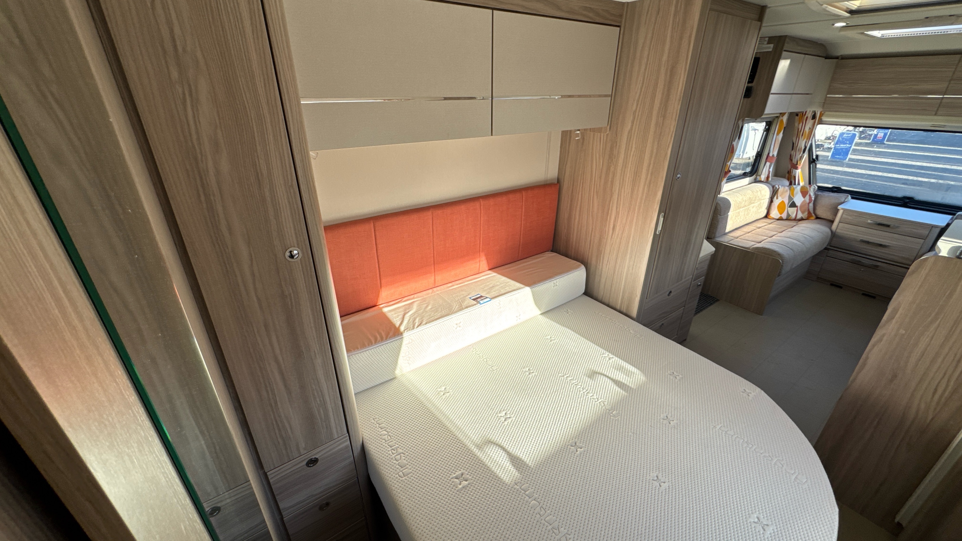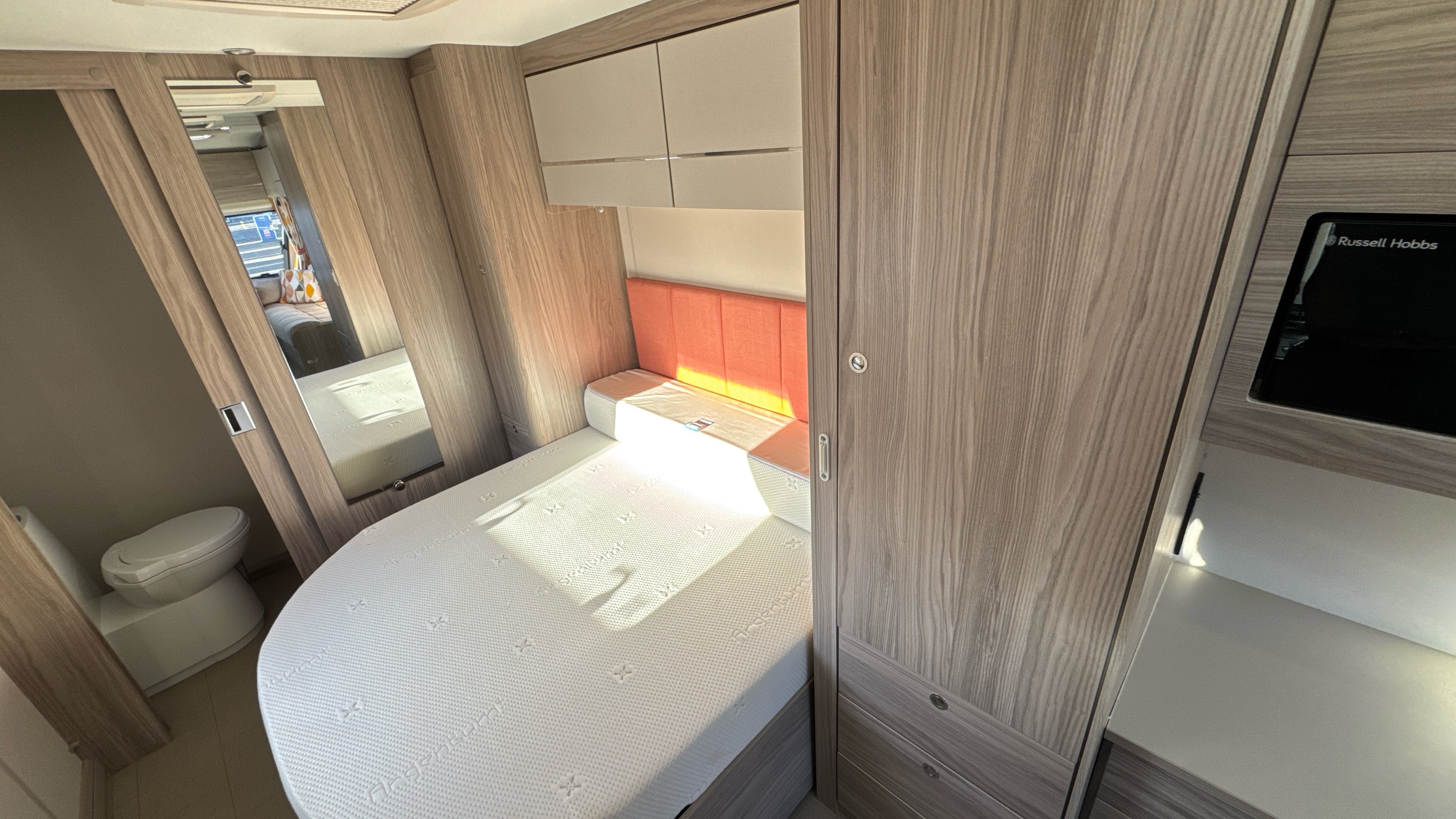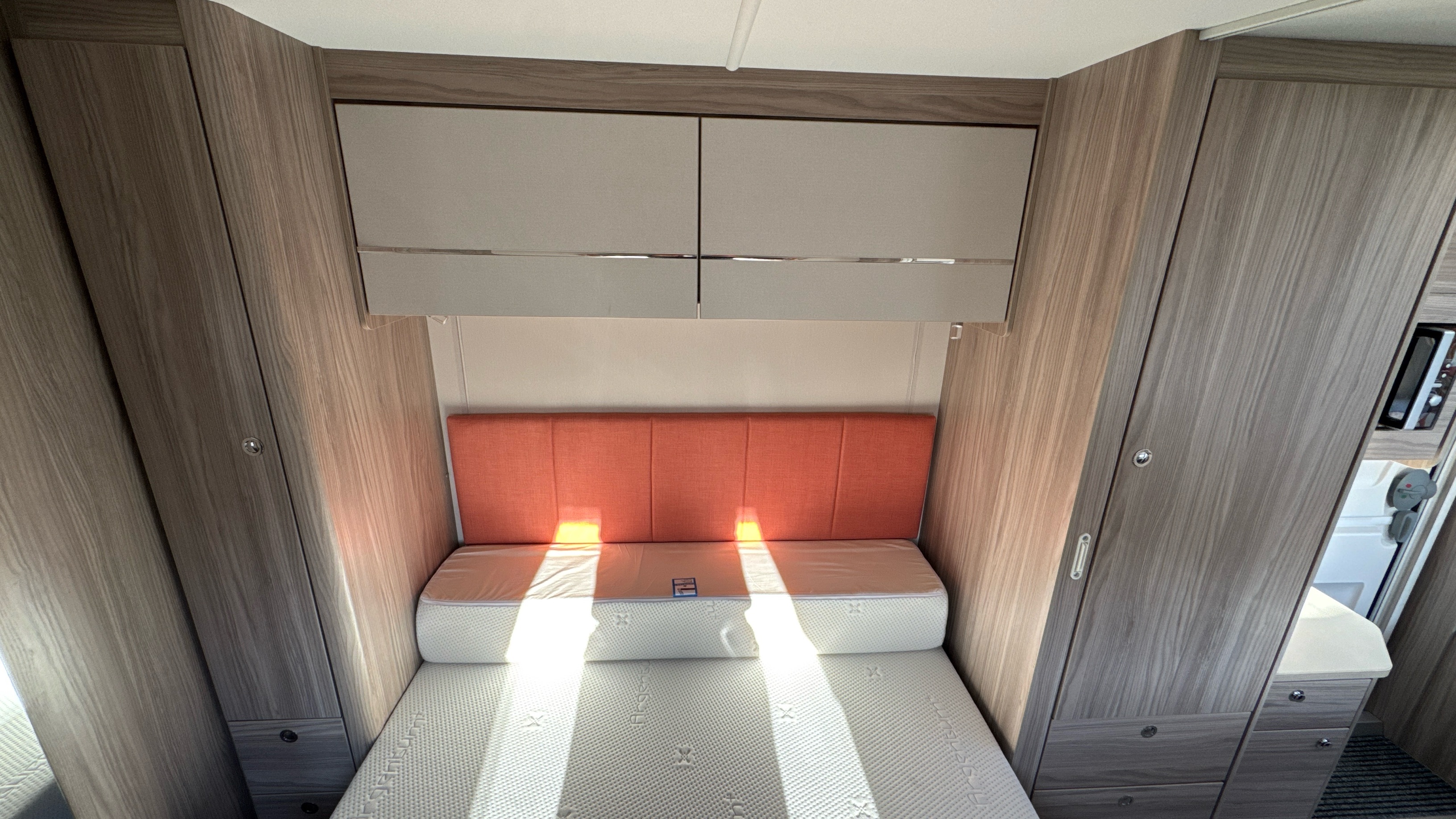 Transverse fixed island walk around bed with domestic style wuality mattress which will offer a peaceful nights rest, acres of underbed storage, his 'n' hers wardrobes plus an array of overhead aircraft style storage lockers.