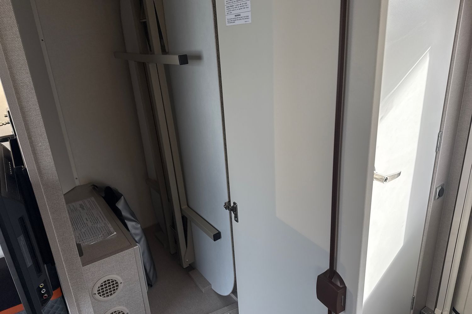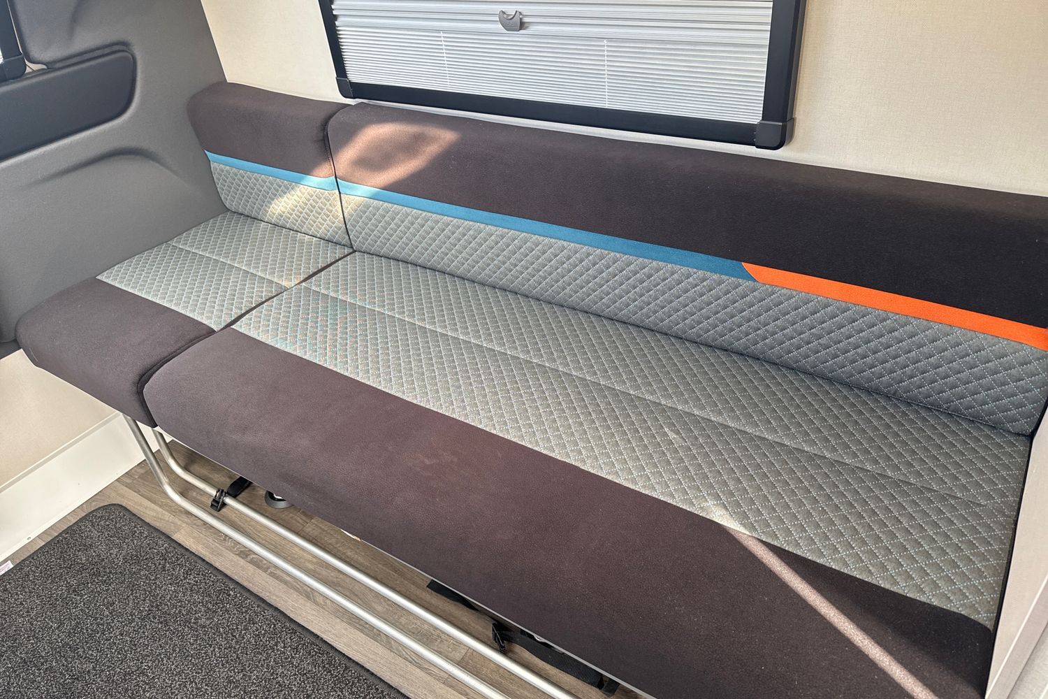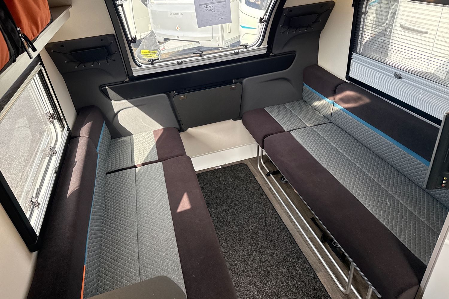 Layout consists off two bench style seats in the front lounge area finished off in hard wearing fabrics which easily converts into a alrge double bed, each side folds up to enable the safe storage and transportation of bikes with eyelets from safety strapping in the floor.