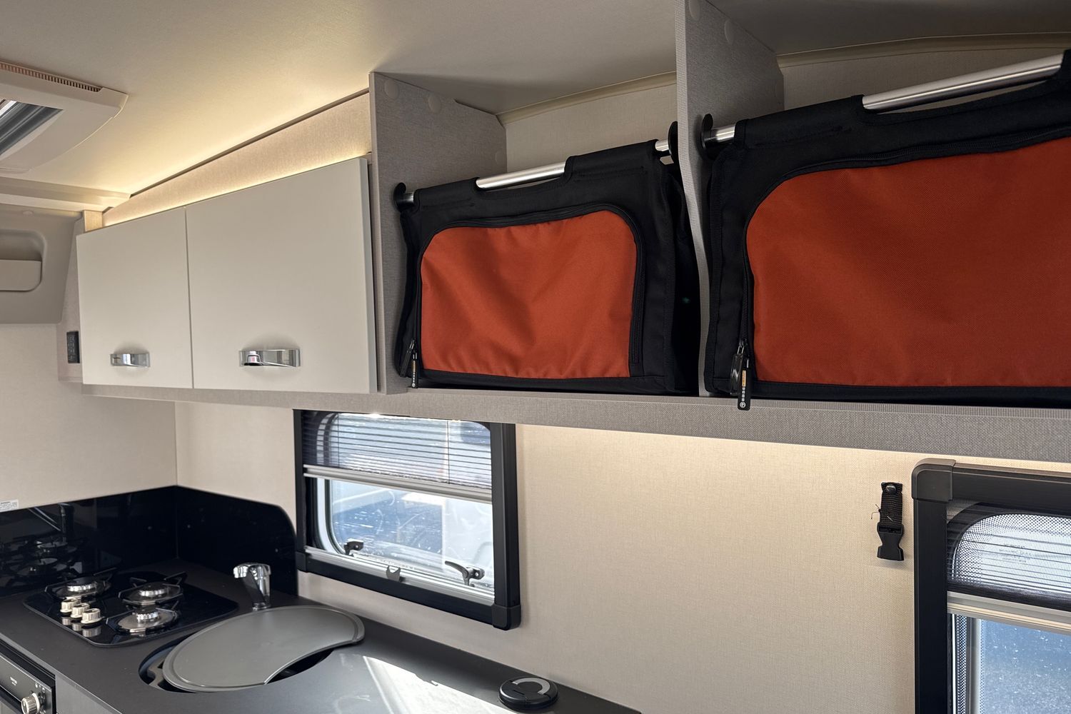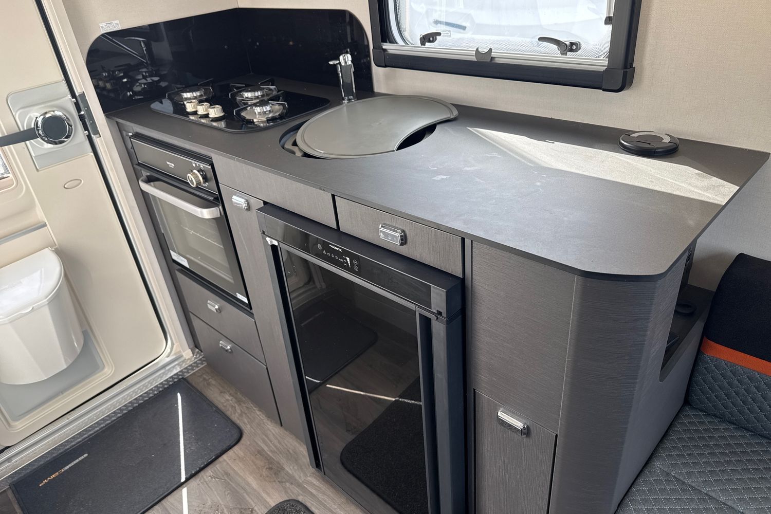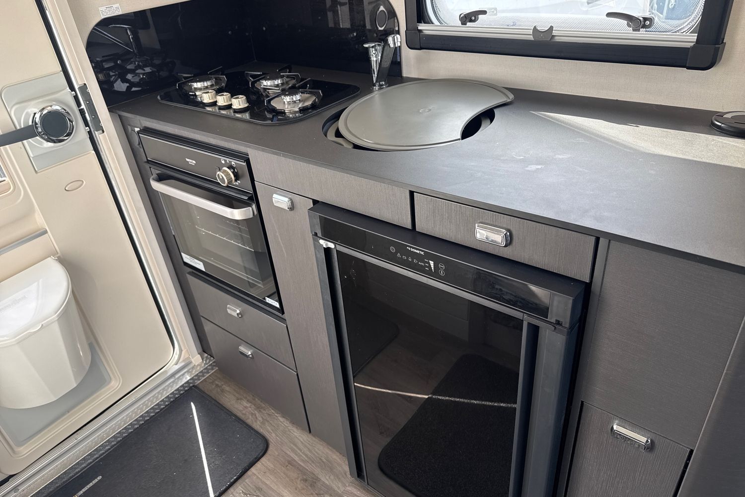 Well appointed kitchen complete with pull up tower style 230v mains sockets and side USB charging points, overhead removeable storage baskets, recessed aluminium sink with hot and cold mixer tap, self repairing slate effect Fenix worktops, and a thetford 3-way gloss black fronted fridge with integral freezer compartment.