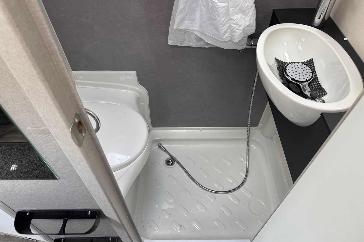 Well proportioned washroom with sink and handbasin with vanity mirror, hot and cold shower mixer tap, LED striplight and thetford cassette chemical toilet.