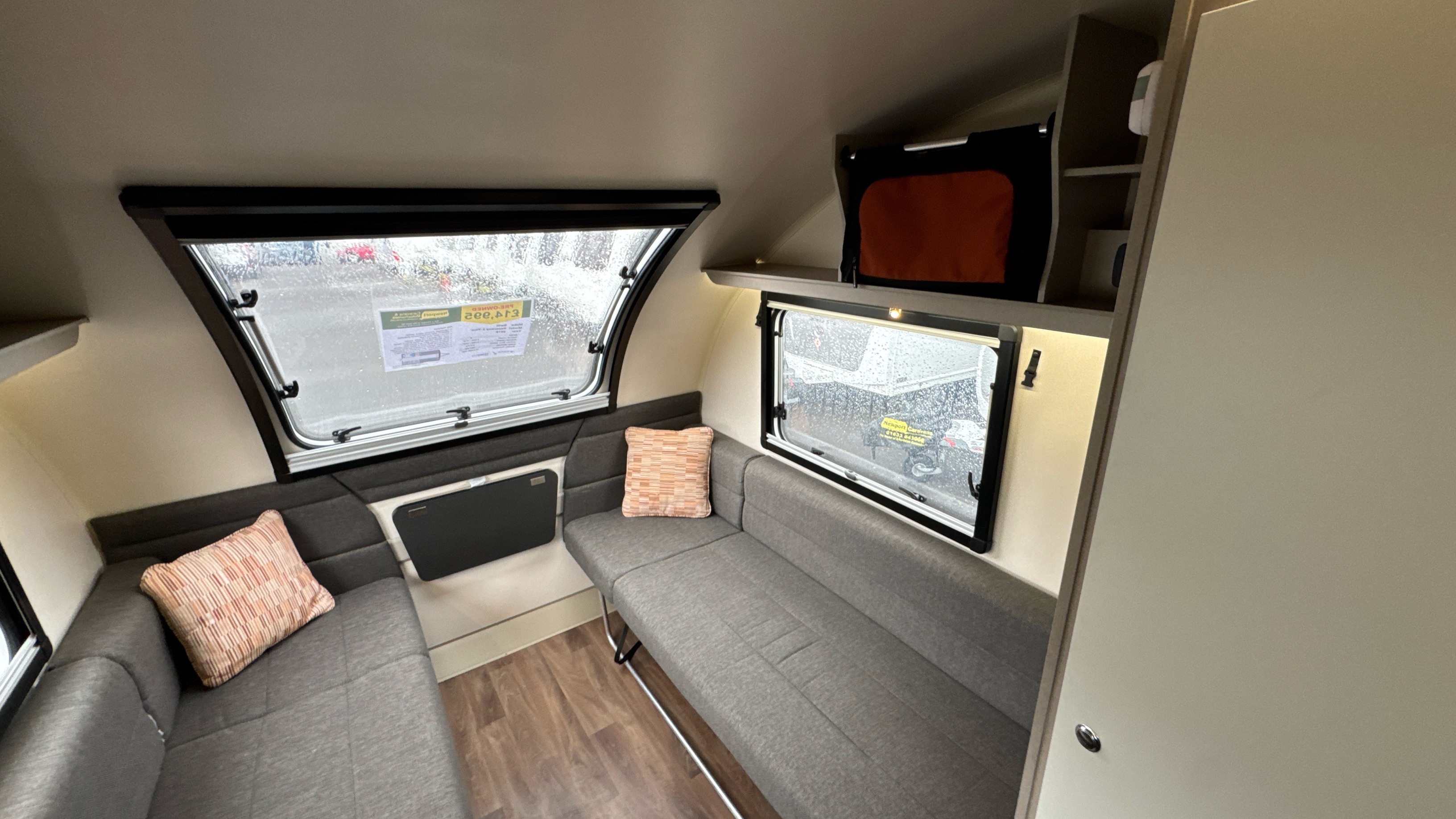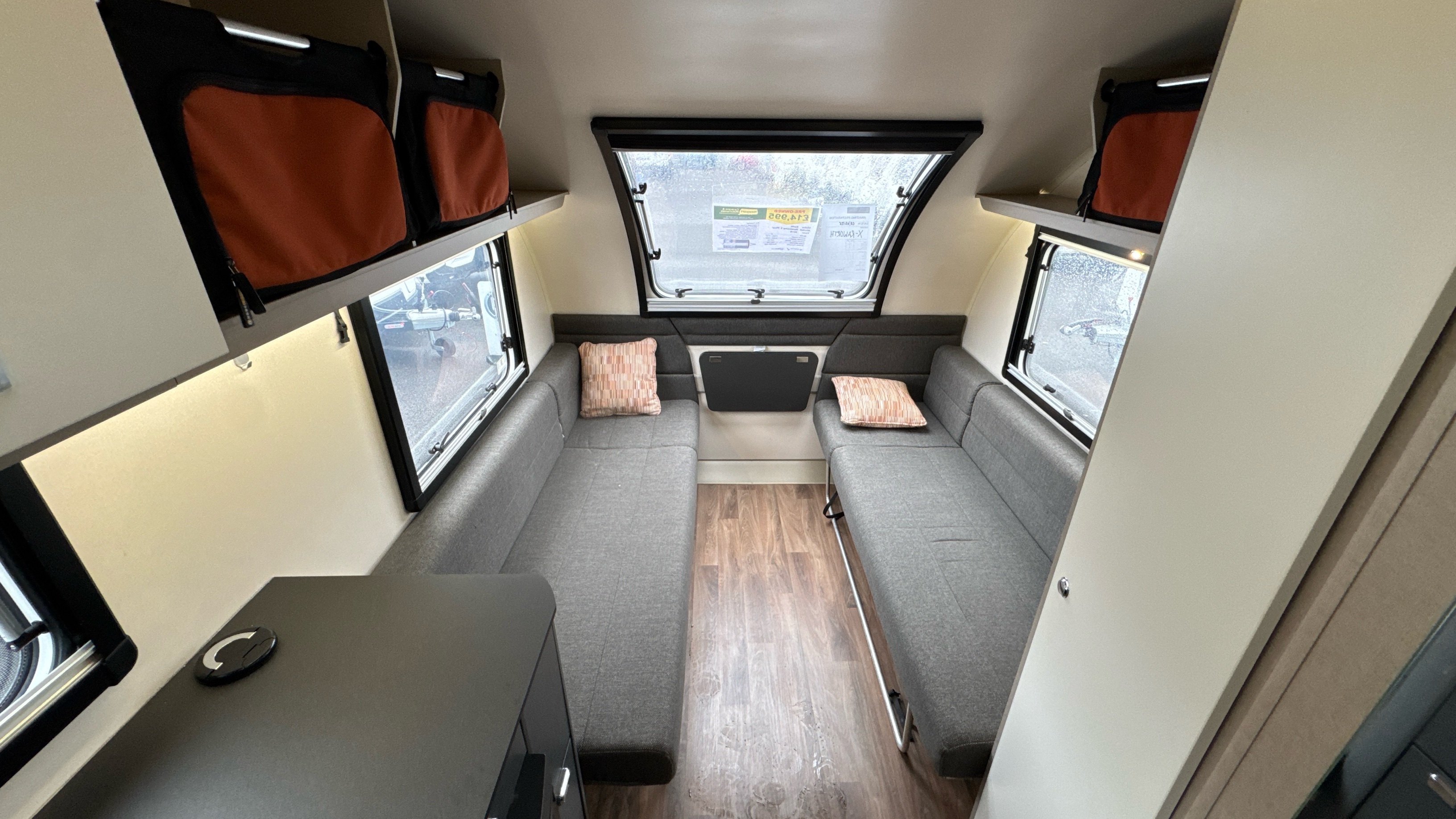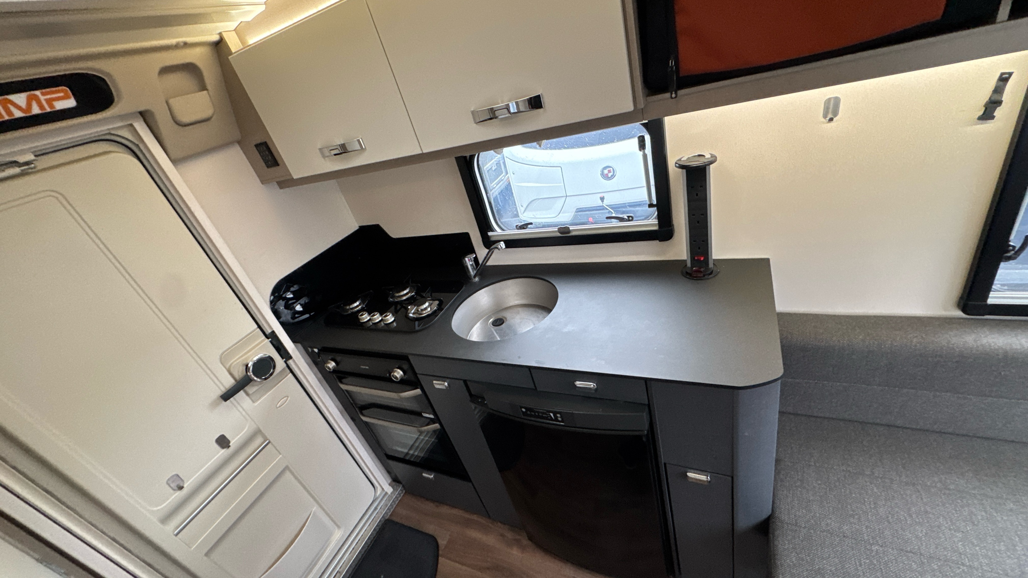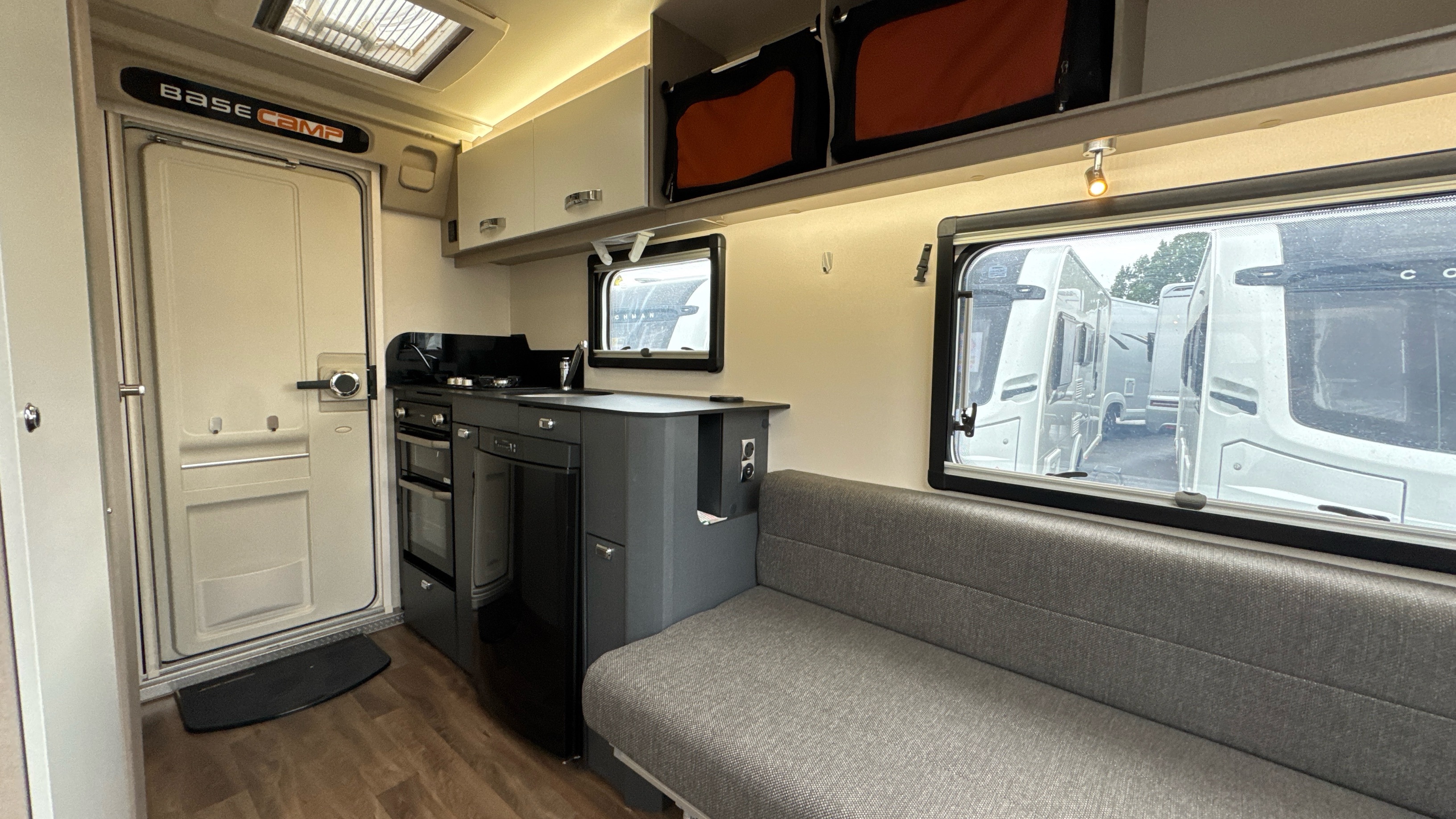 Parallel front lounge (which lifts up for bicycle storage) easily converts into a large double bed, handy and removable overhead storage bags/baskets, Multi-directional TV bracket, dual fuel heating and hot water system, self repairing slate look Hi-max worktops, domestic style oven/grill and hob, 3-way dometic fridge with freezer compartment and an adequately proportioned washroom with integral shower and sink/vanity unit makes this little delight a real attractive proposition.