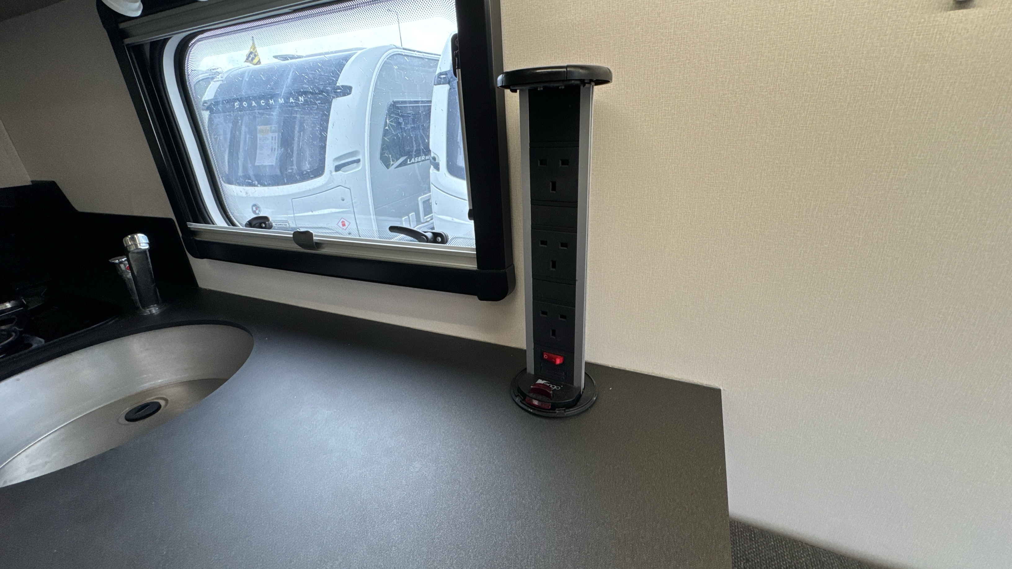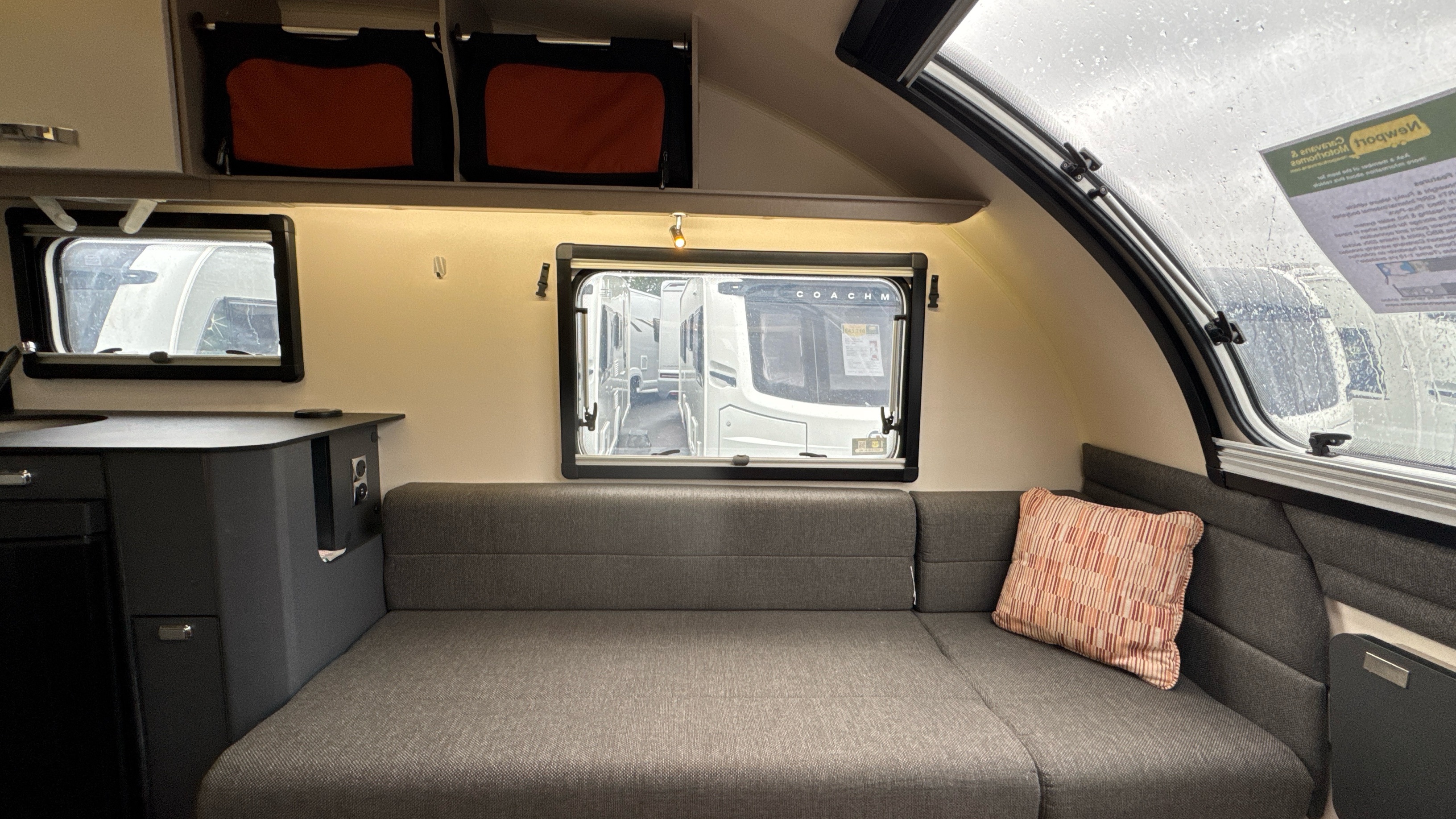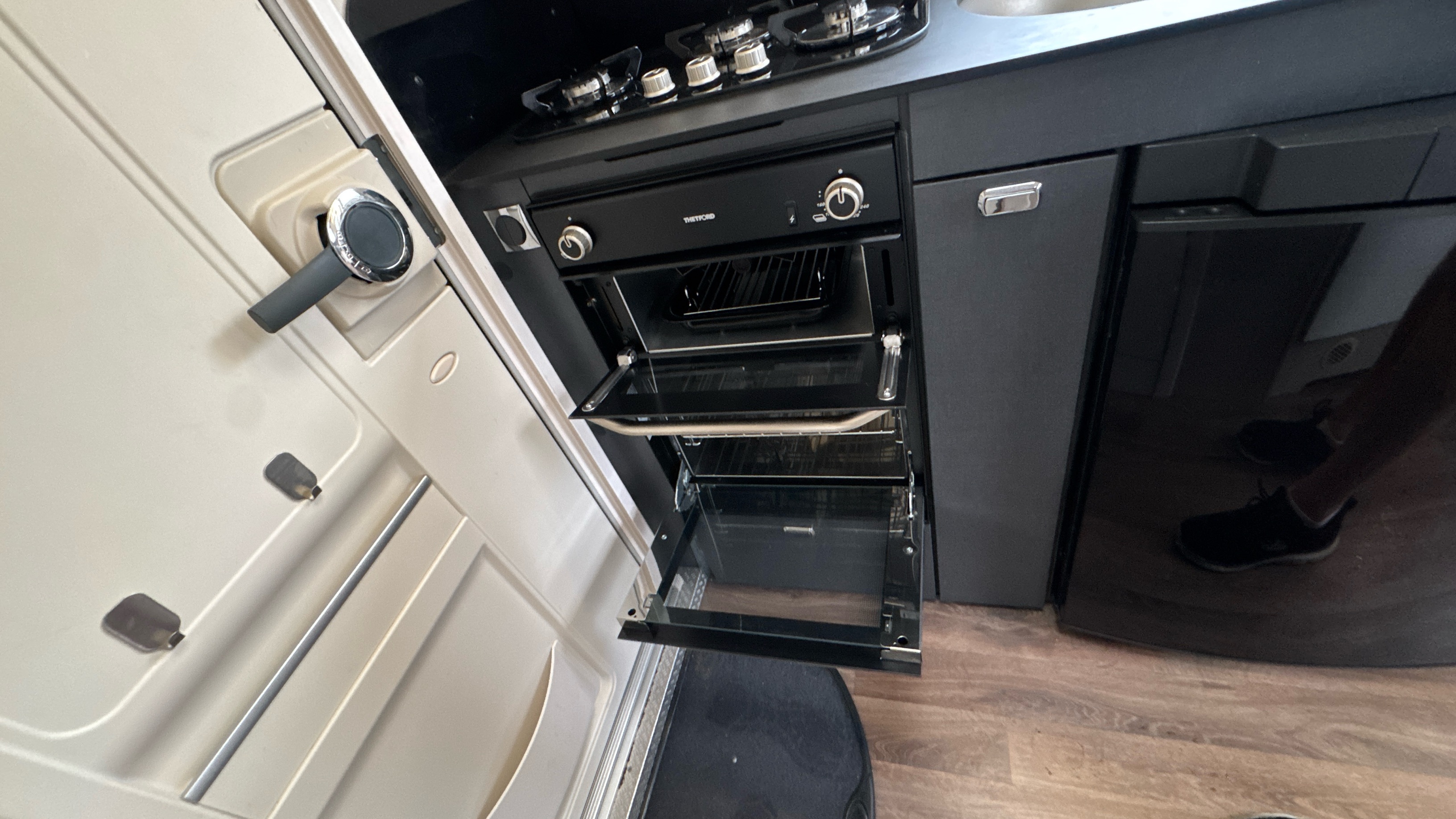 Parallel front lounge (which lifts up for bicycle storage) easily converts into a large double bed, handy and removable overhead storage bags/baskets, Multi-directional TV bracket, dual fuel heating and hot water system, self repairing slate look Hi-max worktops, domestic style oven/grill and hob, 3-way dometic fridge with freezer compartment and an adequately proportioned washroom with integral shower and sink/vanity unit makes this little delight a real attractive proposition.