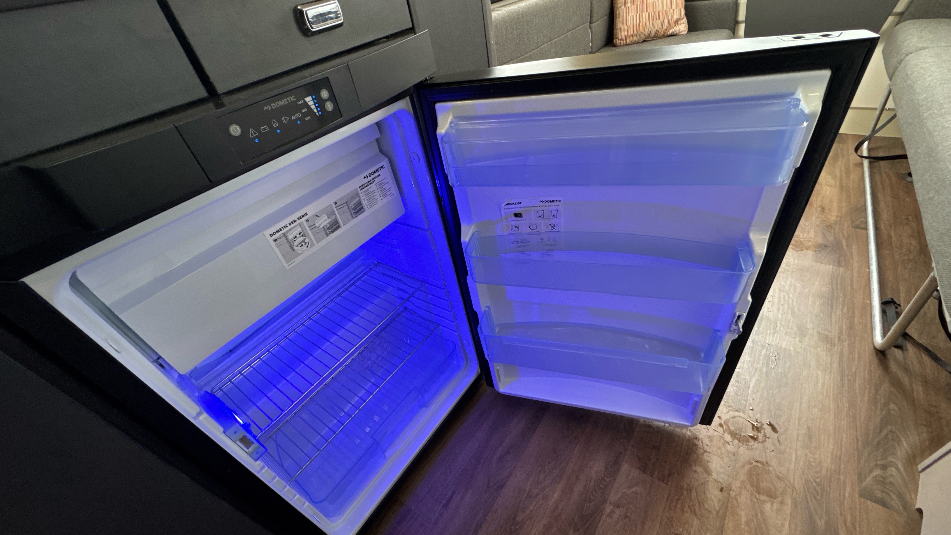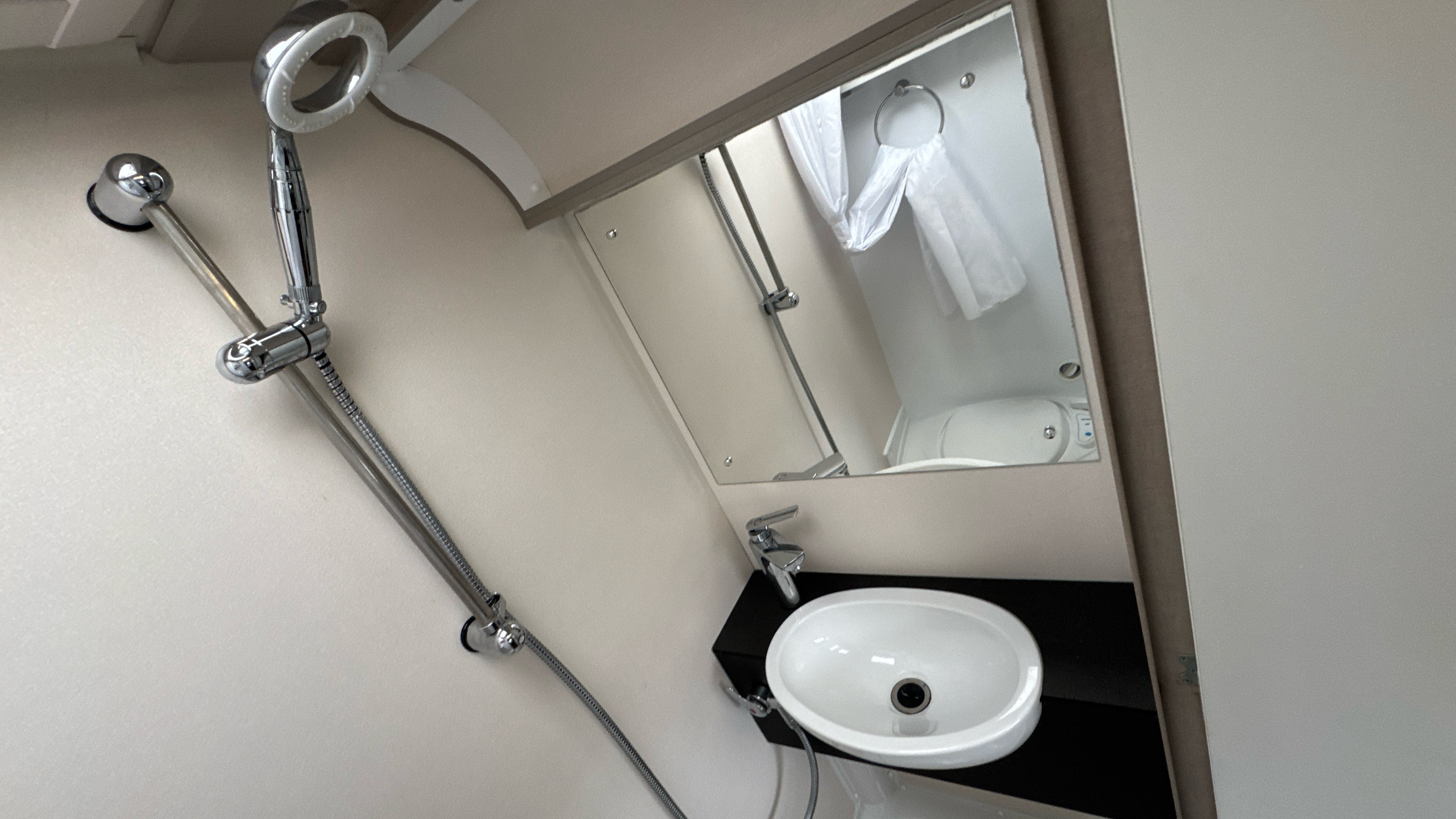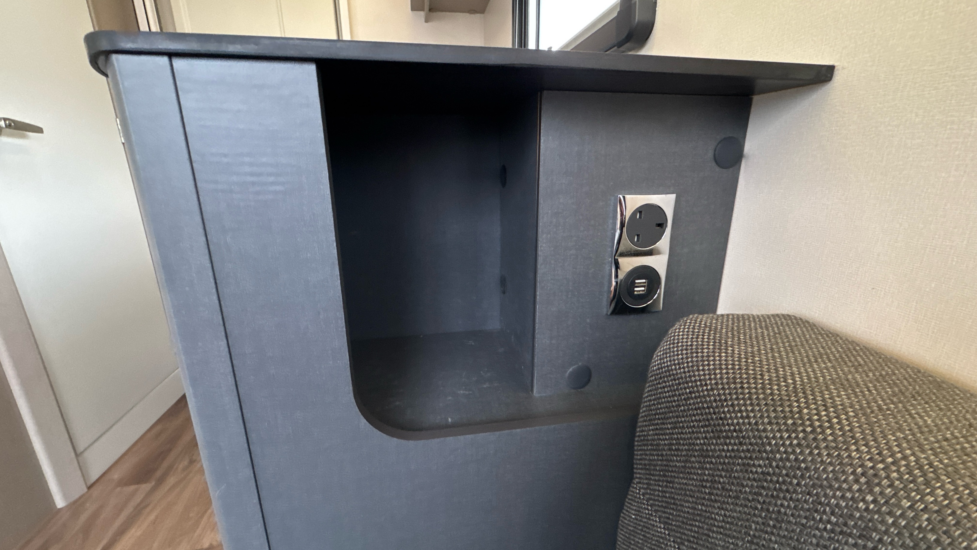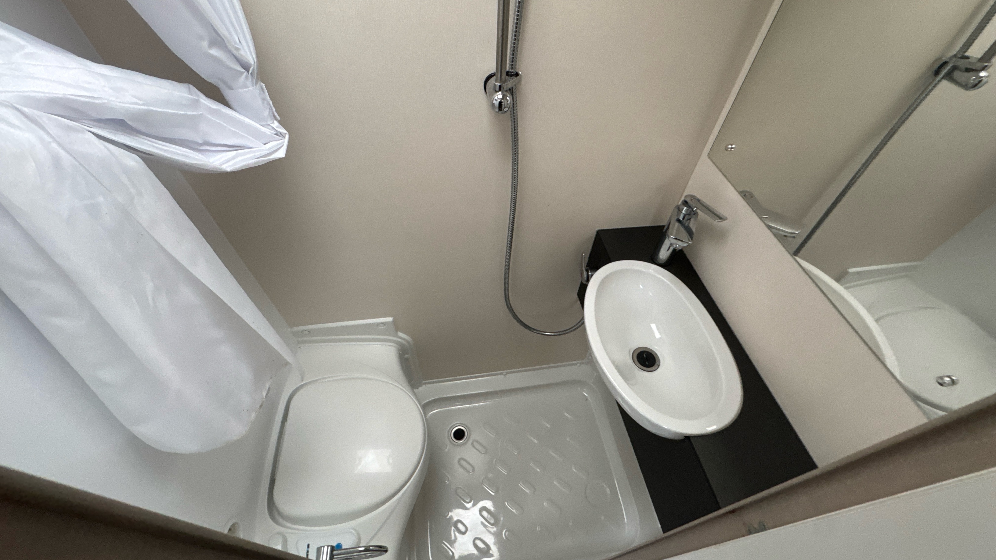 Parallel front lounge (which lifts up for bicycle storage) easily converts into a large double bed, handy and removable overhead storage bags/baskets, Multi-directional TV bracket, dual fuel heating and hot water system, self repairing slate look Hi-max worktops, domestic style oven/grill and hob, 3-way dometic fridge with freezer compartment and an adequately proportioned washroom with integral shower and sink/vanity unit makes this little delight a real attractive proposition.