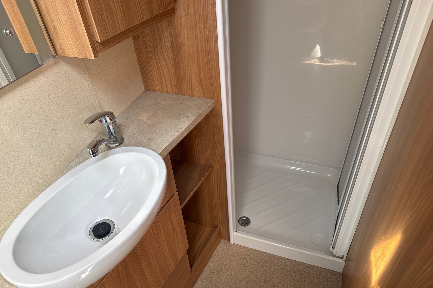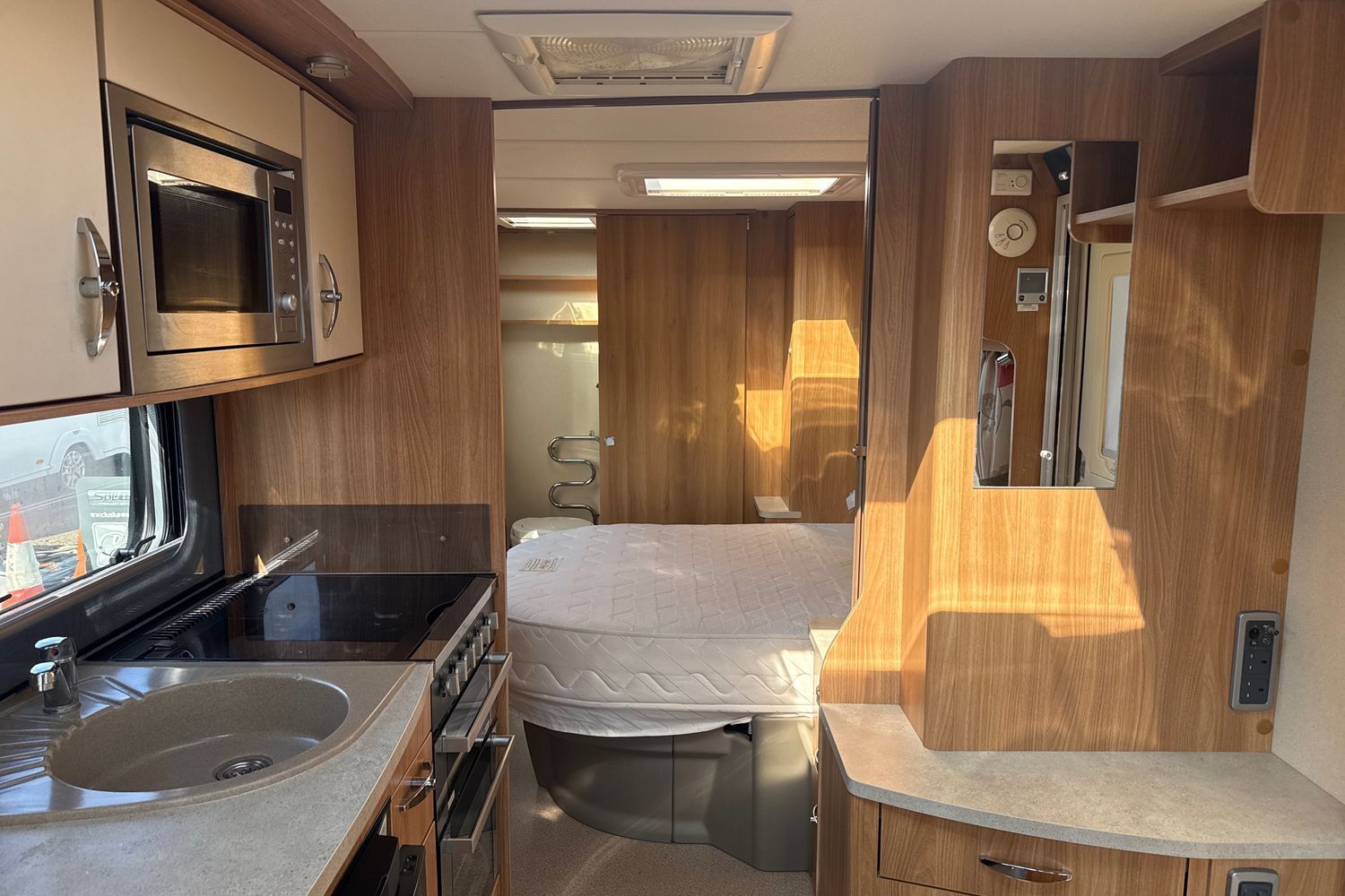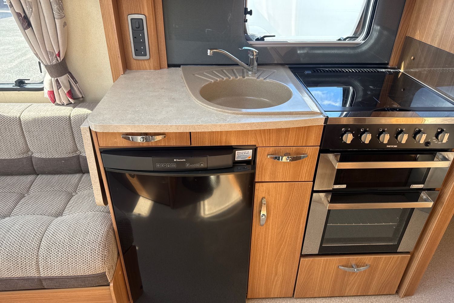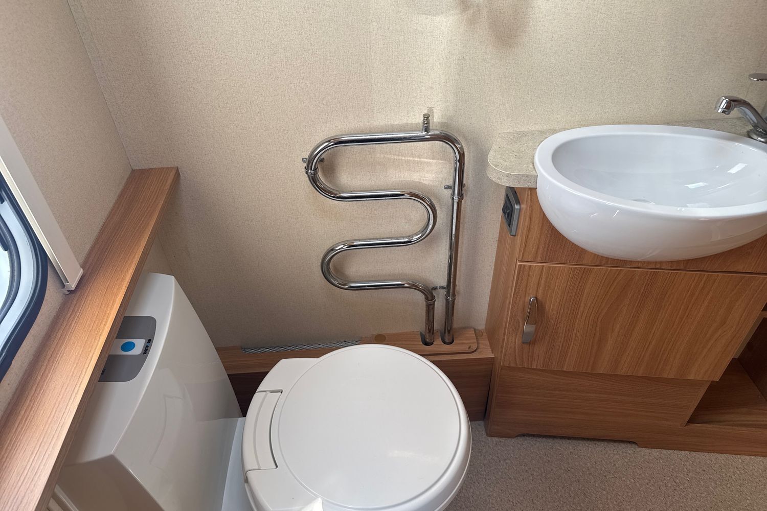 Popular single axle model which features a dedicated full width rear washroom with seperate walk in fully lined shower compartment, sink and vanity unit with back-lit vanity mirror and thetford swivel cassette toilet with electric flush operation.